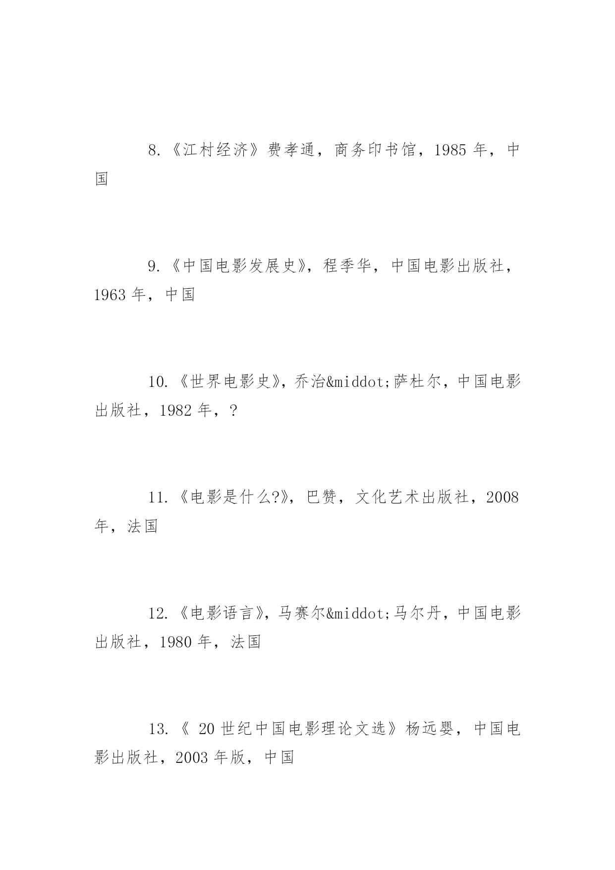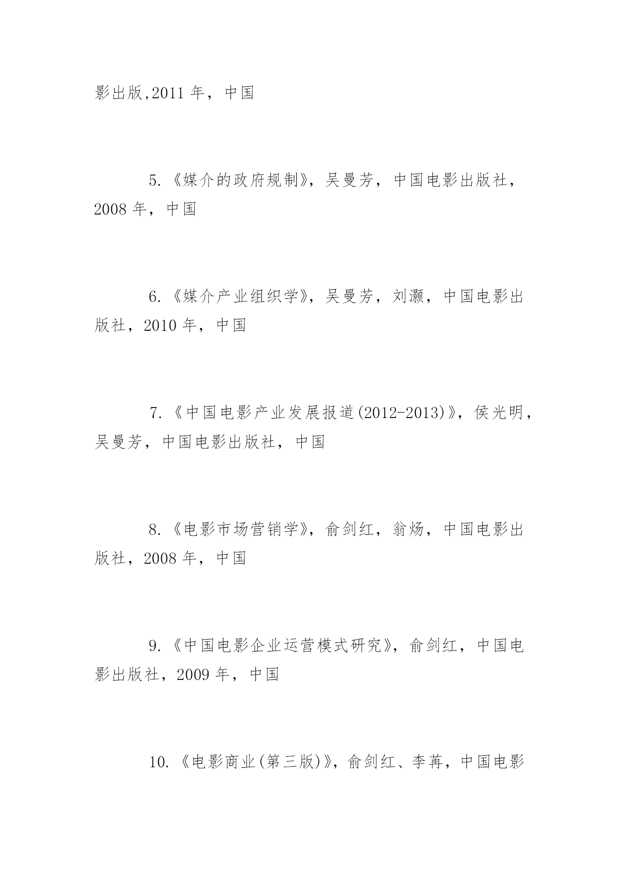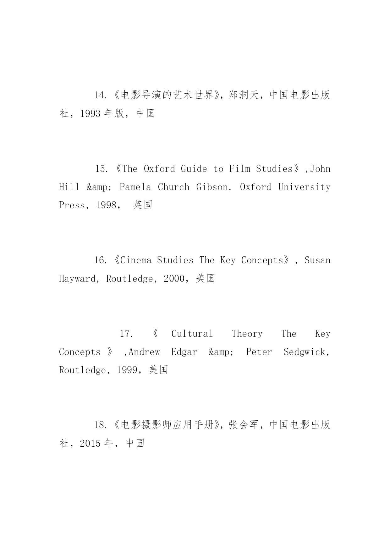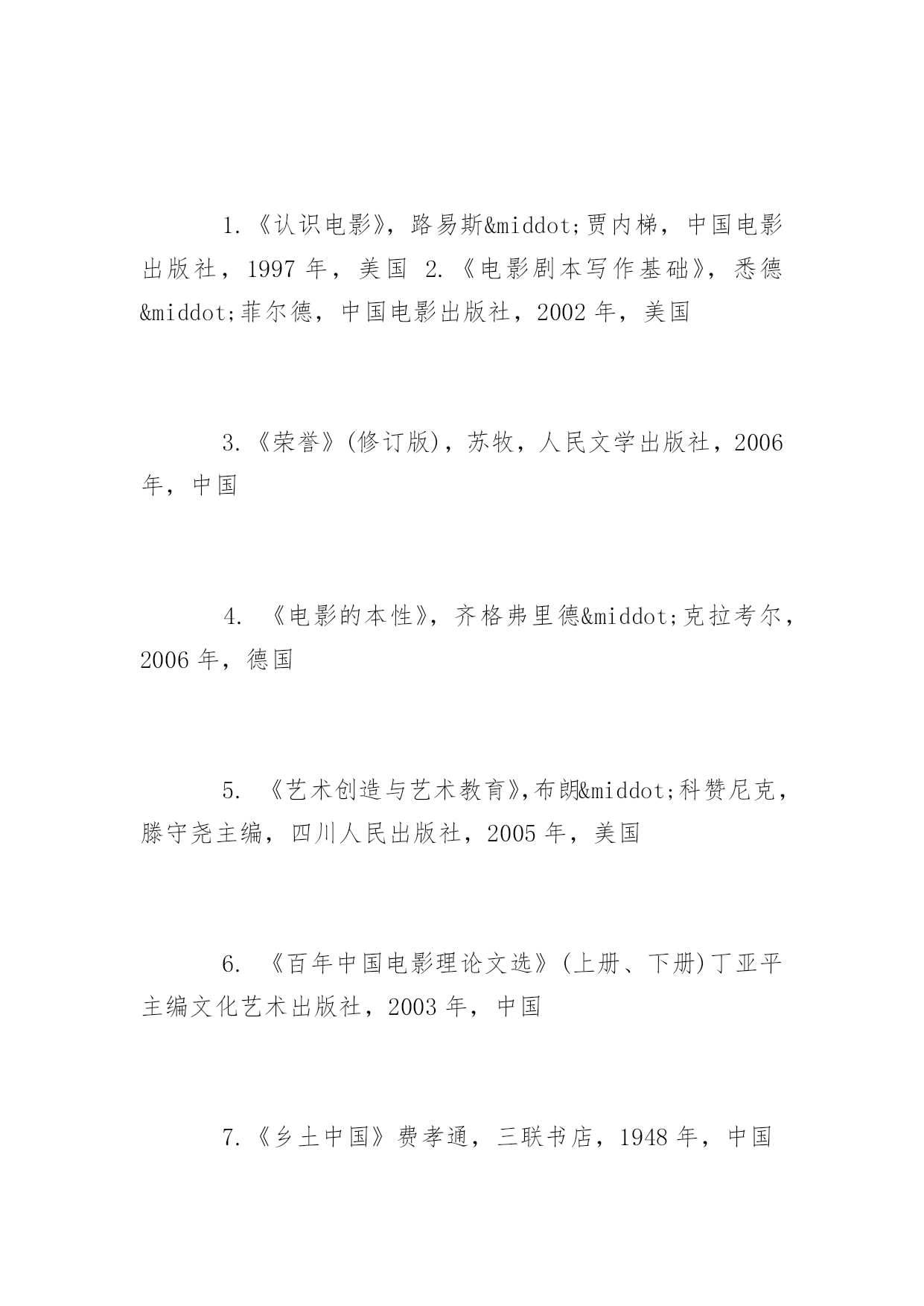 博士研究生入学考试书目2017年博士研究生入学考试推荐书目北京电影学院博士研究生考试需要什么书呢?下面yjbys小编为大家推荐如下:艺术学理论:1.《导演思维》,肯·丹西格,世界图书出版社,2014年,美国,2.《故事片电影摄影创作》穆德远,中国电影出版社,2010年,中国3.《中国电影理论文选》(上、下册),罗艺军主编,文化艺术出版社,1992年,中国4.《中国历代文论精品》,张少康主编,时代文艺出版社,1995年,中国5.《西方文论讲稿——从胡塞尔到德里达》,赵一凡著,三联书店,2007年,中国美术学:1.《理解媒介:论人的延伸》,马歇尔·麦克卢汉(加拿大)(增订评注本),译林出版社,2011年7月1日2.《理解媒介:延伸麦克卢汉》,罗伯特·洛根(加拿大),复旦大学出版社,2012年9月1日3.《中国视听新媒体发展报告(2015)》,袁同楠,社会科学文献出版社,2015年7月,中国戏剧与影视学(电影学):1.《认识电影》,路易斯·贾内梯,中国电影出版社,1997年,美国2.《电影剧本写作基础》,悉德·菲尔德,中国电影出版社,2002年,美国3.《荣誉》(修订版),苏牧,人民文学出版社,2006年,中国4.《电影的本性》,齐格弗里德·克拉考尔,2006年,德国5.《艺术创造与艺术教育》,布朗·科赞尼克,滕守尧主编,四川人民出版社,2005年,美国6.《百年中国电影理论文选》(上册、下册)丁亚平主编文化艺术出版社,2003年,中国7.《乡土中国》费孝通,三联书店,1948年,中国8.《江村经济》费孝通,商务印书馆,1985年,中国9.《中国电影发展史》,程季华,中国电影出版社,1963年,中国10.《世界电影史》,乔治·萨杜尔,中国电影出版社,1982年,?11.《电影是什么?》,巴赞,文化艺术出版社,2008年,法国12.《电影语言》,马赛尔·马尔丹,中国电影出版社,1980年,法国13.《20世纪中国电影理论文选》杨远婴,中国电影出版社,2003年版,中国14.《电影导演的艺术世界》,郑洞天,中国电影出版社,1993年版,中国15.《TheOxfordGuidetoFilmStudies》,JohnHill&PamelaChurchGibson,OxfordUniversityPress,1998,英国16.《CinemaStudiesTheKeyConcepts》,SusanHayward,Routledge,2000,美国17.《CulturalTheoryTheKeyConcepts》,AndrewEdgar&PeterSedgwick,Routledge,1999,美国18.《电影摄影师应用手册》,张会军,中国电影出版社,2015年,中国19.《欧洲电影摄影与新好莱坞的影响变革》,张燕菊,中国电影出版社,2010年,中国20.《电影的创作过程》,约翰·霍华德·劳逊,中国电影出版社,美国21.《动画艺术辞典》,孙立军主编,中国电影出版社,2016年,中国22.《中国动画史》,孙立军主编,商务印书馆,2011年,中国戏剧与影视学(表演学):1.《美国电影表演艺术-斯坦尼斯拉夫斯基遗产的继承》,(美)理查德·A·布鲁姆著,王浩译,北岳文艺出版社2.《电影表演-导演必修课》,(美)朱迪丝·卫斯顿著,何平译,书林出版有限公司3.《电影表演美学研究》,张辉著,中国电影出版社,中国戏剧与影视学(影视管理学):1.《电影市场营销》,于丽,中国电影出版社,2015年,中国2.《中国电影产业年报(2011-2014)》,中国电影出版社,中国3.《中国电影市场报告(2011-2014)》,中国电影发行放映协会,中国4.《电影产业经济学》,于丽,刘杨,王煊,中国电影出版,2011年,中国5.《媒介的政府规制》,吴曼芳,中国电影出版社,2008年,中国6.《媒介产业组织学》,吴曼芳,刘灏,中国电影出版社,2010年,中国7.《中国电影产业发展报道(2012-2013)》,侯光明,吴曼芳,中国电影出版社,中国8.《电影市场营销学》,俞剑红,翁炀,中国电影出版社,2008年,中国9.《中国电影企业运营模式研究》,俞剑红,中国电影出版社,2009年,中国10.《电影商业(第三版)》,俞剑红、李苒,中国电影出版社,2011年,中国