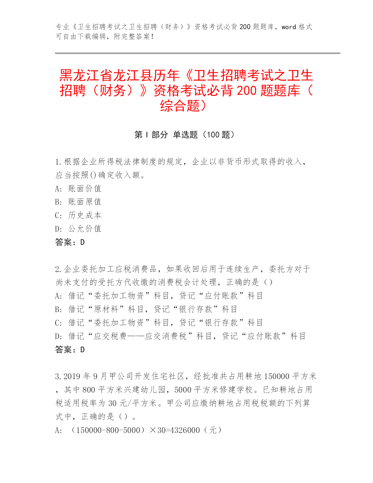 黑龙江省龙江县历年《卫生招聘考试之卫生招聘(财务)》资格考试必背200题题库(综合题)