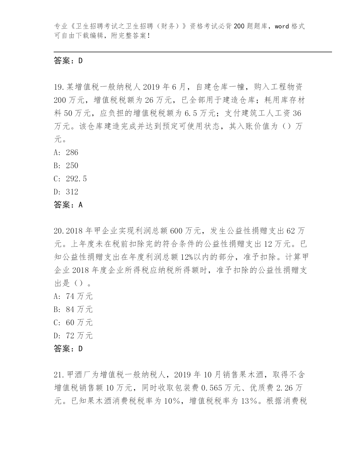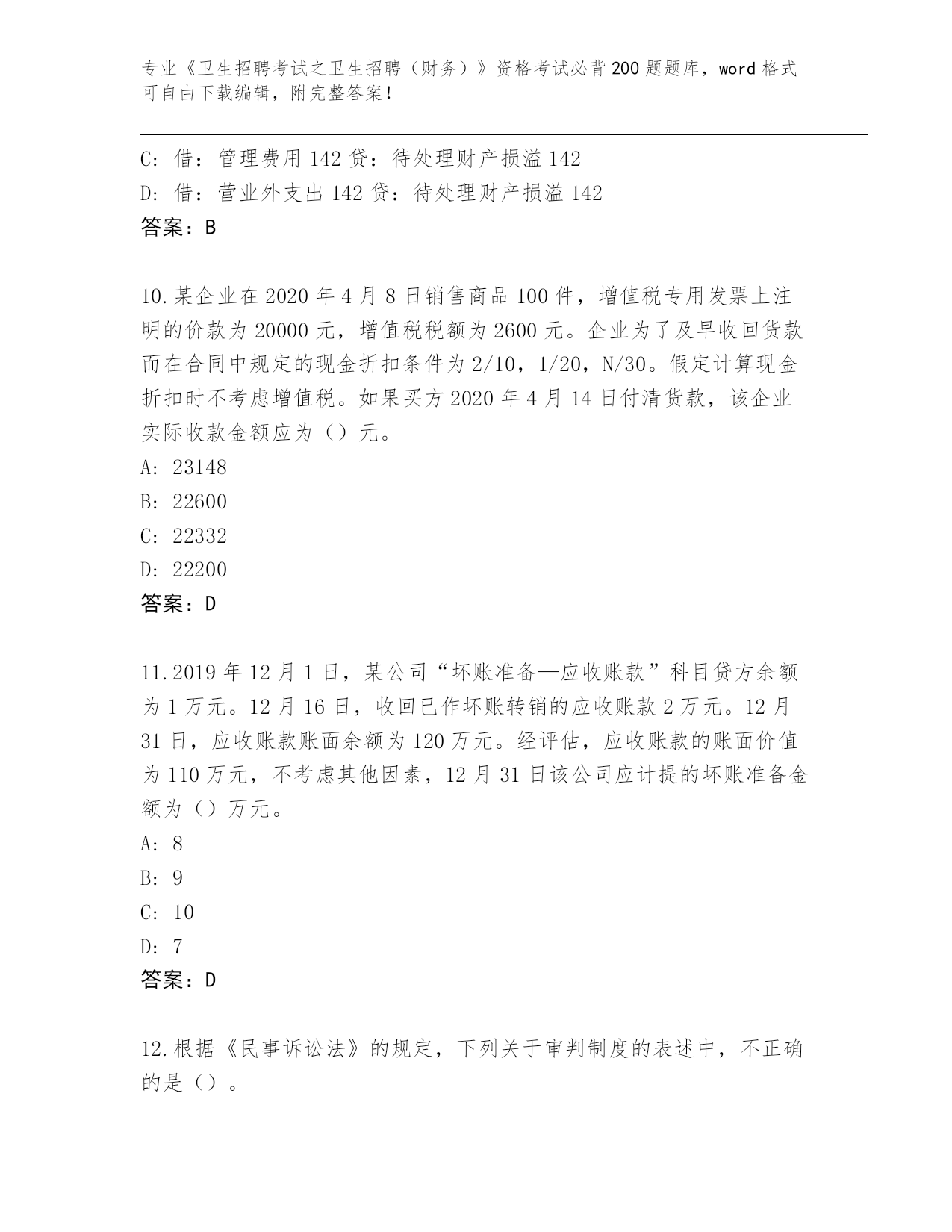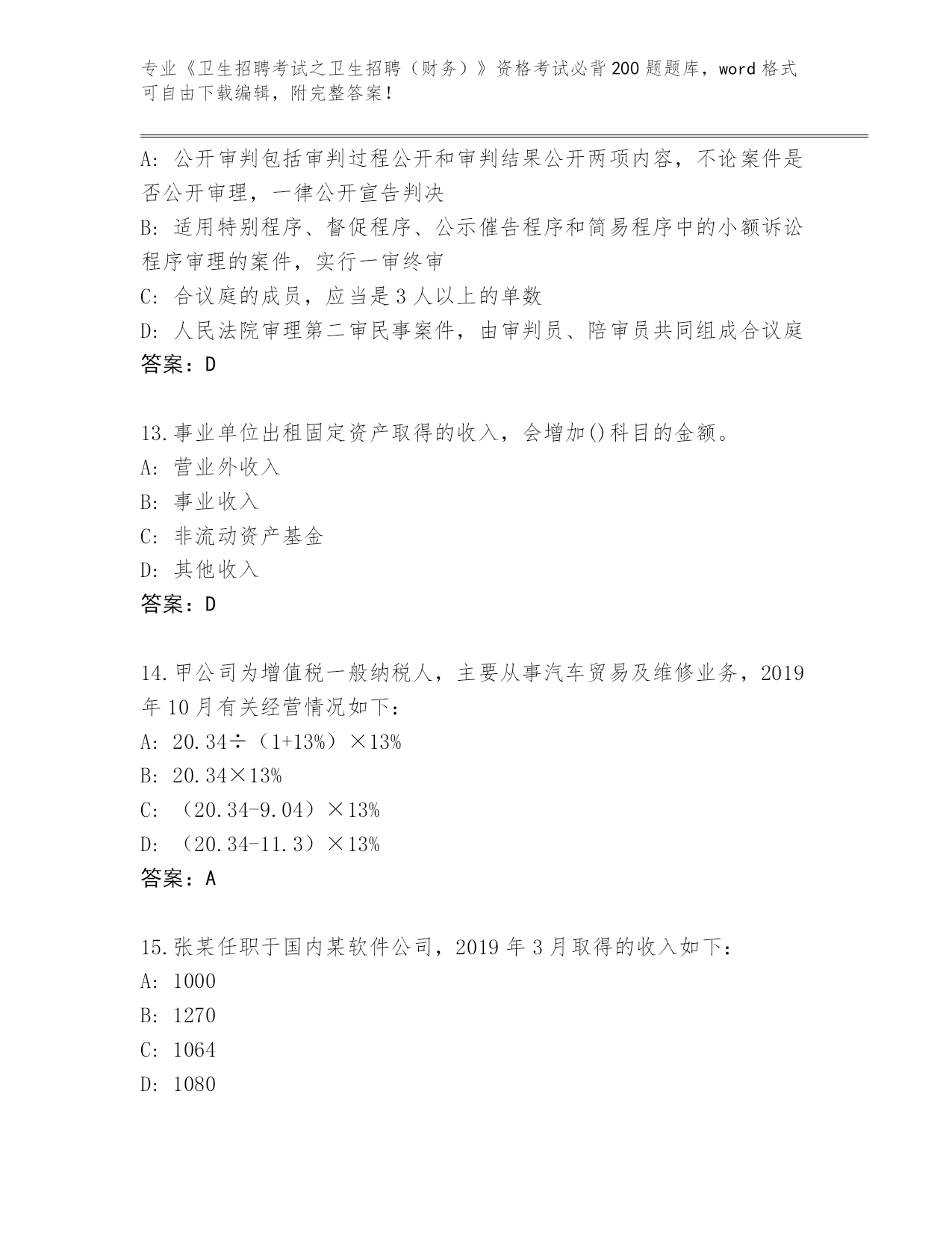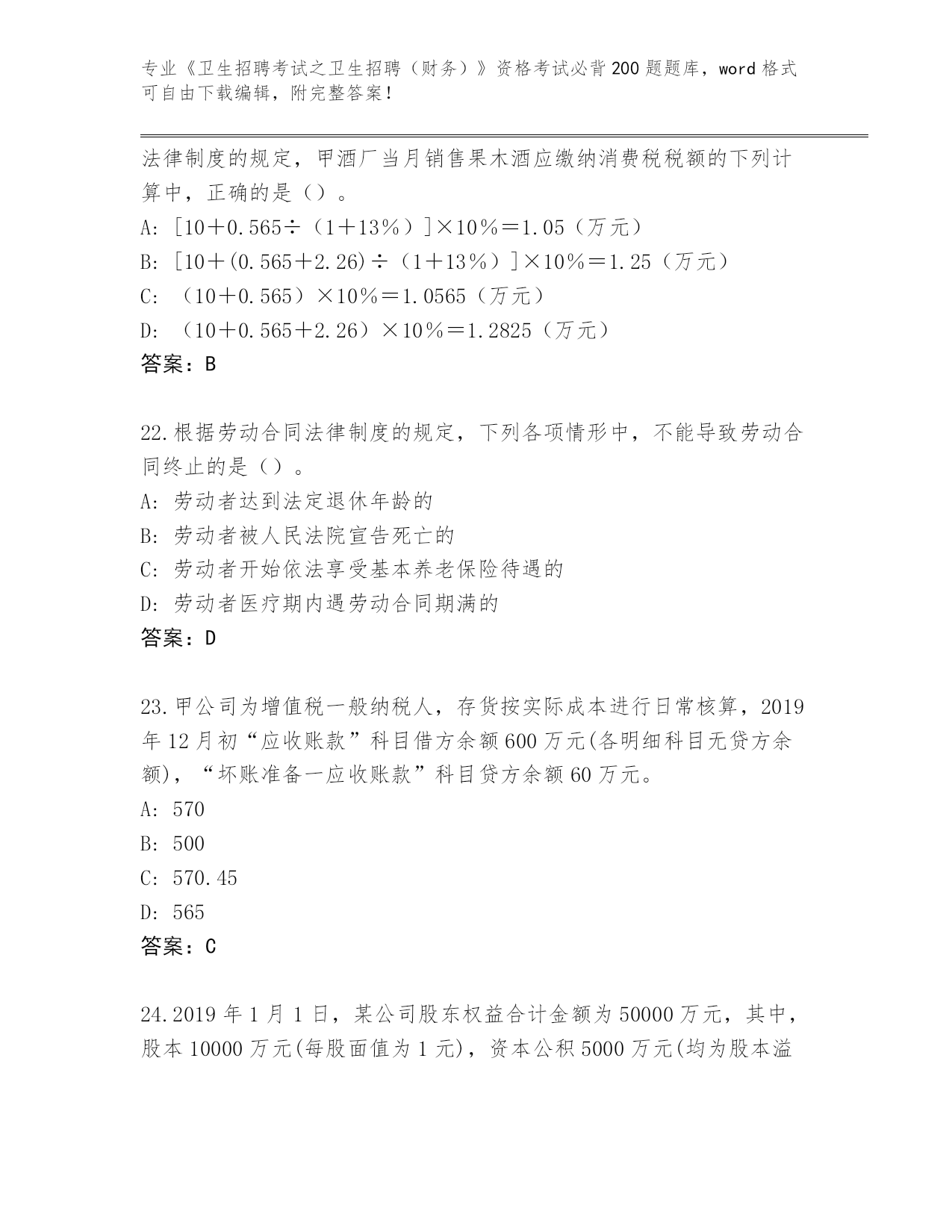 历年黑龙江省《卫生招聘考试之卫生招聘(财务)》资格考试必背200题题库可打印