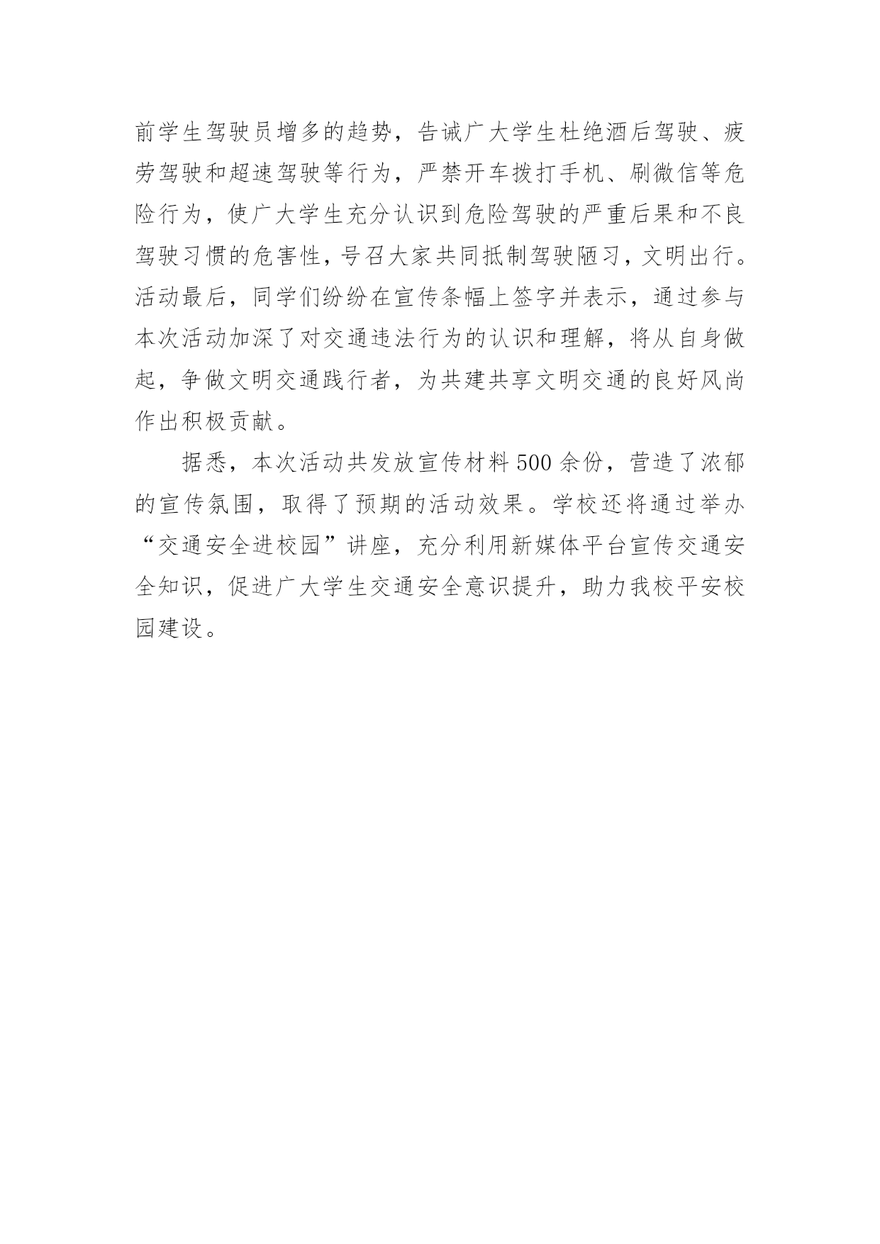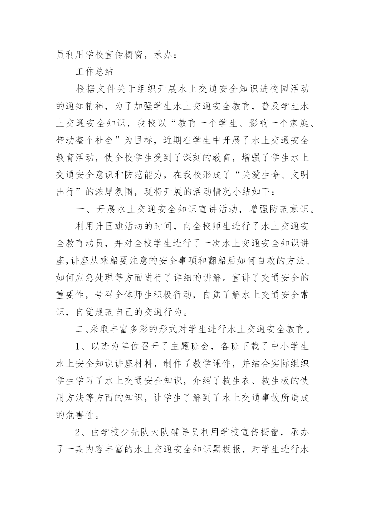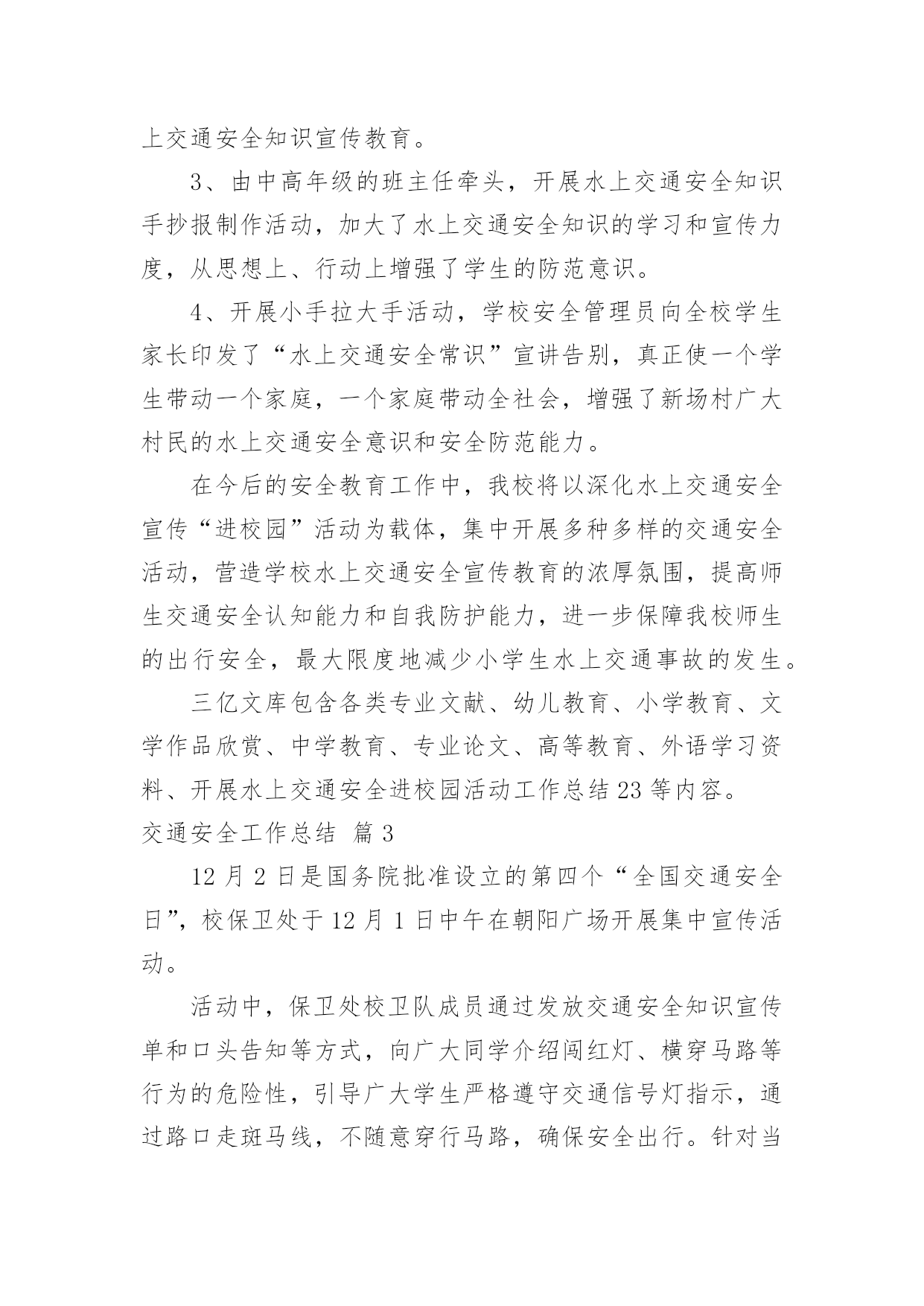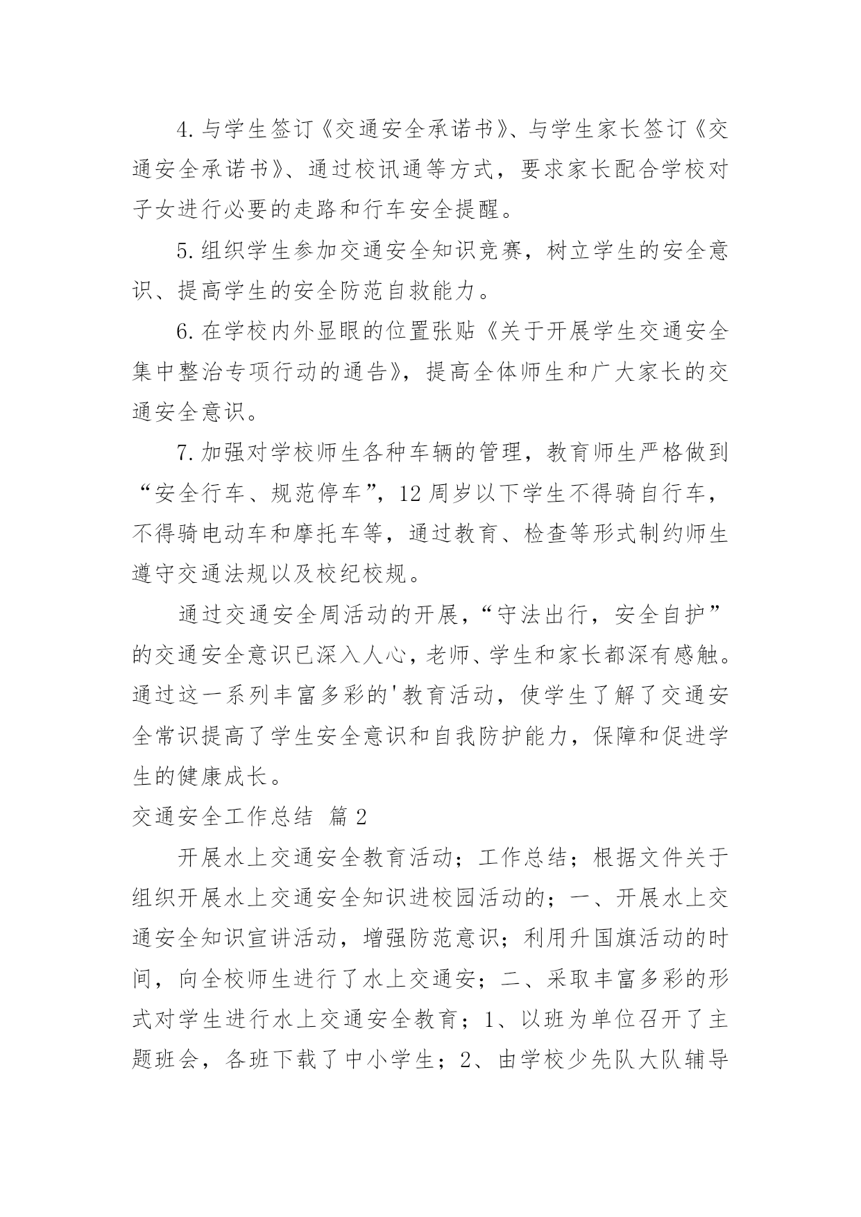 交通安全工作总结关于交通安全工作总结3篇总结是事后对某一阶段的学习或工作情况作加以回顾检查并分析评价的书面材料,它在我们的学习、工作中起到呈上启下的作用,因此,让我们写一份总结吧。那么总结有什么格式呢?以下是小编精心整理的交通安全工作总结3篇,欢迎大家借鉴与参考,希望对大家有所帮助。交通安全工作总结篇120xx年12月2日是第x个“全国交通安全日”。为深入推进“守法出行,安全自护”,组织开展好今年第五个122“全国交通安全日”主题活动,形成严格遵守交通法规、自觉维护交通秩序、携手共治交通环境、提升文明交通水平的校园氛围,现总结如下:1.利用班会课,对学生普及交通安全知识,实现了交通安全教育进学校的目的。2.利用各种载体,广泛开展“文通安全日”活动。进行国旗下讲话,在学校电子屏上滚动播放宣传交通安全标语,开展学校交通宣传专栏,校园小龙人广播室开展“守法出行,安全自护”为主题的交通安全宣传活动,利用每日安全一句话加大对交通安全的教育,利用网络观看《关注学生出行》交通警示教育片等。3.邀请安海交警支队尤永宁警官莅校进行交通安全专题讲座,提高全体师生的交通安全意识。4.与学生签订《交通安全承诺书》、与学生家长签订《交通安全承诺书》、通过校讯通等方式,要求家长配合学校对子女进行必要的走路和行车安全提醒。5.组织学生参加交通安全知识竞赛,树立学生的安全意识、提高学生的安全防范自救能力。6.在学校内外显眼的位置张贴《关于开展学生交通安全集中整治专项行动的通告》,提高全体师生和广大家长的交通安全意识。7.加强对学校师生各种车辆的管理,教育师生严格做到“安全行车、规范停车”,12周岁以下学生不得骑自行车,不得骑电动车和摩托车等,通过教育、检查等形式制约师生遵守交通法规以及校纪校规。通过交通安全周活动的开展,“守法出行,安全自护”的交通安全意识已深入人心,老师、学生和家长都深有感触。通过这一系列丰富多彩的'教育活动,使学生了解了交通安全常识提高了学生安全意识和自我防护能力,保障和促进学生的健康成长。交通安全工作总结篇2开展水上交通安全教育活动;工作总结;根据文件关于组织开展水上交通安全知识进校园活动的;一、开展水上交通安全知识宣讲活动,增强防范意识;利用升国旗活动的时间,向全校师生进行了水上交通安;二、采取丰富多彩的形式对学生进行水上交通安全教育;1、以班为单位召开了主题班会,各班下载了中小学生;2、由学校少先队大队辅导员利用学校宣传橱窗,承办;工作总结根据文件关于组织开展水上交通安全知识进校园活动的通知精神,为了加强学生水上交通安全教育,普及学生水上交通安全知识,我校以“教育一个学生、影响一个家庭、带动整个社会”为目标,近期在学生中开展了水上交通安全教育活动,使全校学生受到了深刻的教育,增强了学生水上交通安全意识和防范能力,在我校形成了“关爱生命、文明出行”的浓厚氛围,现将开展的活动情况小结如下:一、开展水上交通安全知识宣讲活动,增强防范意识。利用升国旗活动的时间,向全校师生进行了水上交通安全教育动员,并对全校学生进行了一次水上交通安全知识讲座,讲座从乘船要注意的安全事项和翻船后如何自救的方法、如何应急处理等方面进行了详细的讲解。宣讲了交通安全的重要性,号召全体师生积极行动,自觉了解水上交通安全常识,自觉规范自己的交通行为。二、采取丰富多彩的形式对学生进行水上交通安全教育。1、以班为单位召开了主题班会,各班下载了中小学生水上安全知识讲座材料,制作了教学课件,并结合实际组织学生学习了水上交通安全知识,介绍了救生衣、救生板的使用方法等方面的知识,让学生了解到了水上交通事故所造成的危害性。2、由学校少先队大队辅导员利用学校宣传橱窗,承办了一期内容丰富的水上交通安全知识黑板报,对学生进行水上交通安全知识宣传教育。3、由中高年级的班主任牵头,开展水上交通安全知识手抄报制作活动,加大了水上交通安全知识的学习和宣传力度,从思想上、行动上增强了学生的防范意识。4、开展小手拉大手活动,学校安全管理员向全校学生家长印发了“水上交通安全常识”宣讲告别,真正使一个学生带动一个家庭,一个家庭带动全社会,增强了新场村广大村民的水上交通安全意识和安全防范能力。在今后的安全教育工作中,我校将以深化水上交通安全宣传“进校园”活动为载体,集中开展多种多样的交通安全活动,营造学校水上交通安全宣传教育的浓厚氛围,提高师生交通安全认知能力和自我防护能力,进一步保障我校师生的出行安全,最大限度地减少小学生水上交通事故的发生。三亿文库包含各类专业文献、幼儿教育、小学教育、文学作品欣赏、中学教育、专业论文、高等教育、外语学习资料、开展水上交通安全进校园活动工作总结23等内容。交通安全工作总结篇312月2日是国务院批准设立的第四个“全国交通安全日”,校保卫处于12月1日中午在朝阳广场开展集