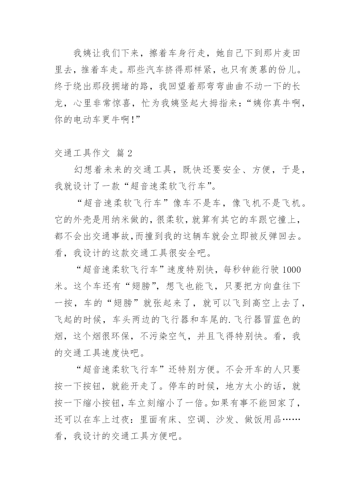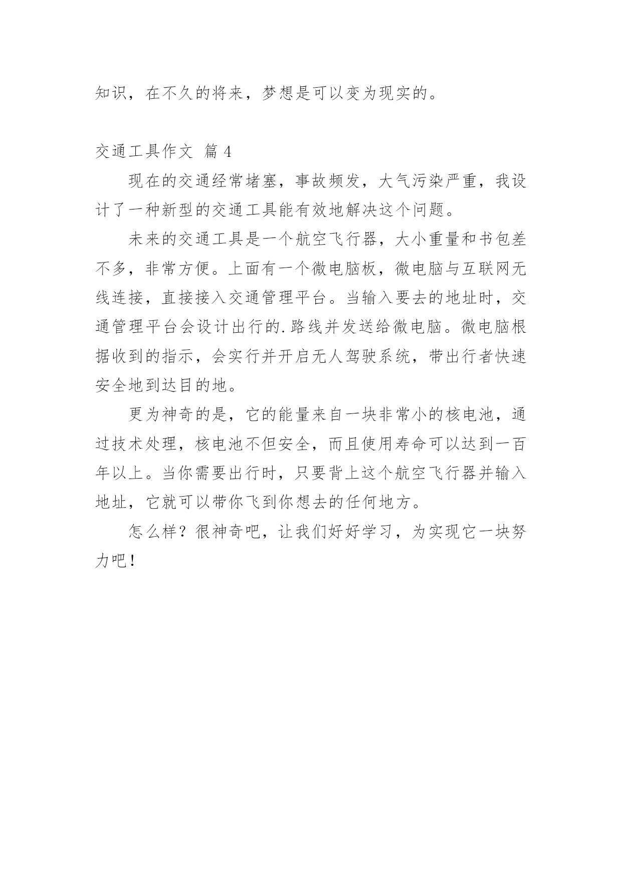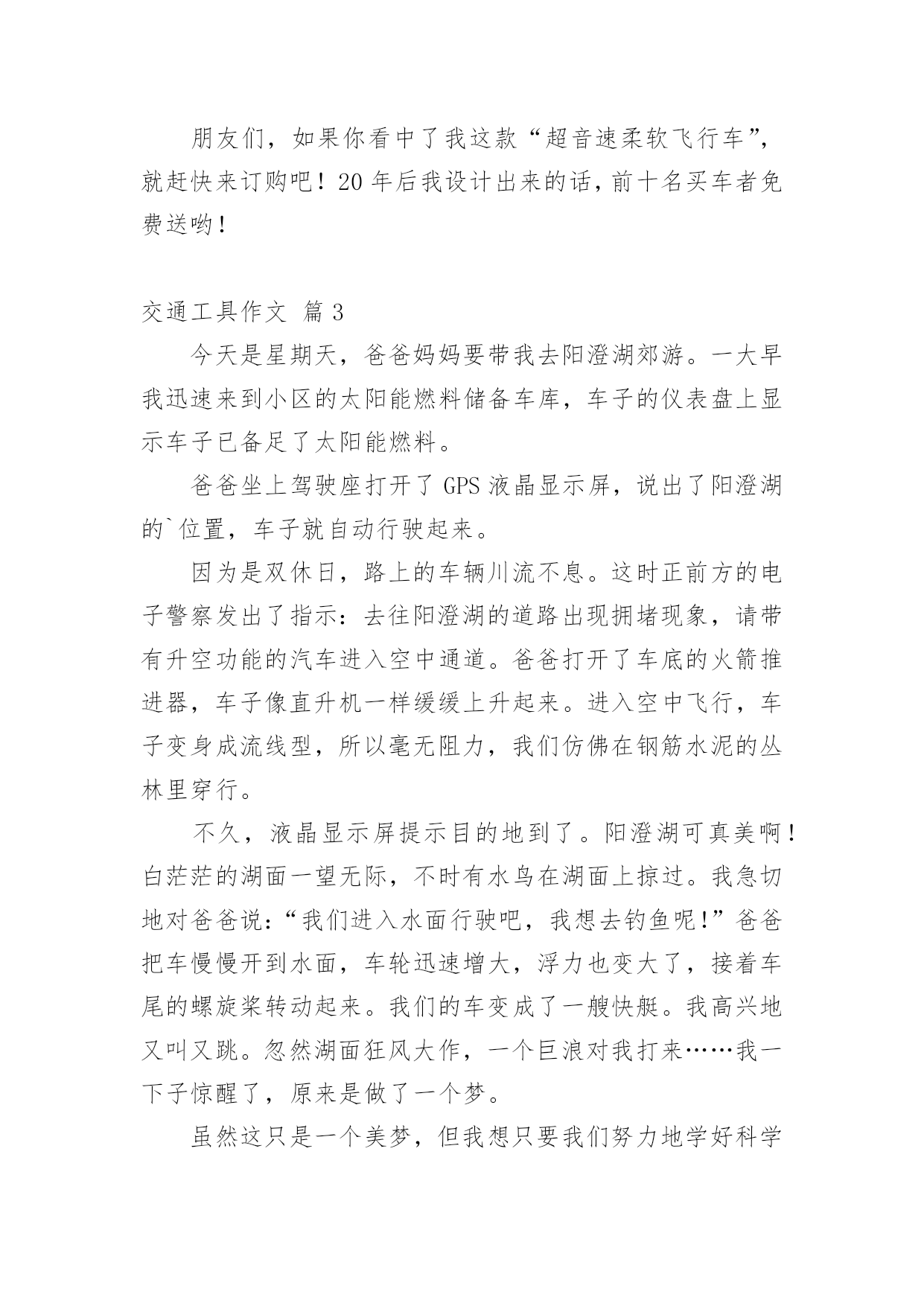 交通工具作文(优秀)交通工具作文在平凡的学习、工作、生活中,大家都写过作文吧,作文根据体裁的不同可以分为记叙文、说明文、应用文、议论文。还是对作文一筹莫展吗?以下是小编帮大家整理的交通工具作文4篇,欢迎大家分享。交通工具作文篇1唉!昨天刚来姥姥家,今天就要走,好伤心呀。下午三点多的车票,我和老妈一直坚持着“宁愿等车,也不要赶不上车”的原则,所以,我们两点就从姥姥家出来了,姨送我们到马路边。可等呀等,等得我快睡着了,还是像昨天一样没有车,眼看着时间在自己的眼皮子底下溜走了。真没办法,看着堵成长龙的路,真是太糟糕了。姨也开始为我们着急,她说:“还是我骑着电动车送你们到公交站,你们坐公交车去车站吧。”老妈说:“前边堵着呢,你也过不去呀。”姨说:“我知道从哪里走,给一诺送饭,我哪条路没走过。”(姨的女儿一诺在城里上学,她吃不惯学校的饭,我姨经常给她送饭。)只有这个办法了。我姨用电动车带着我们,在村子里的小路穿行,四周是青灰的'麦田。不好,看前面,小路也堵住了,又是一条长龙。人们都从车窗里探着头,着急地向外望着,没有一点办法。我姨让我们下来,擦着车身行走,她自己下到那片麦田里去,推着车走。那些汽车挤得那样紧,也只有羡慕的份儿。终于绕出那段拥堵的路,我回望着那弯弯曲曲不动一下的长龙,心里非常惊喜,忙为我姨竖起大拇指来:“姨你真牛啊,你的电动车更牛啊!”交通工具作文篇2幻想着未来的交通工具,既快还要安全、方便,于是,我就设计了一款“超音速柔软飞行车”。“超音速柔软飞行车”像车不是车,像飞机不是飞机。它的外壳是用纳米做的,很柔软,就算有其它的车跟它撞上,都不会出交通事故,而撞到我的这辆车就会立即被反弹回去。看,我设计的这款交通工具很安全吧。“超音速柔软飞行车”速度特别快,每秒钟能行驶1000米。这个车还有“翅膀”,想飞也能飞,只要把方向盘往下一按,车的“翅膀”就张起来了,就可以飞到高空上去了,飞起的时候,车头两边的飞行器和车尾的.飞行器冒蓝色的烟,这个烟很环保,不污染空气,并且飞得特别快。看,我的交通工具速度快吧。“超音速柔软飞行车”还特别方便。不会开车的人只要按一下按钮,就能开走了。停车的时候,地方太小的话,就按一下缩小按钮,车立刻缩小了一倍。如果有事不能回家了,还可以在车上过夜:里面有床、空调、沙发、做饭用品……看,我设计的交通工具方便吧。朋友们,如果你看中了我这款“超音速柔软飞行车”,就赶快来订购吧!20年后我设计出来的话,前十名买车者免费送哟!交通工具作文篇3今天是星期天,爸爸妈妈要带我去阳澄湖郊游。一大早我迅速来到小区的太阳能燃料储备车库,车子的仪表盘上显示车子已备足了太阳能燃料。爸爸坐上驾驶座打开了GPS液晶显示屏,说出了阳澄湖的`位置,车子就自动行驶起来。因为是双休日,路上的车辆川流不息。这时正前方的电子警察发出了指示:去往阳澄湖的道路出现拥堵现象,请带有升空功能的汽车进入空中通道。爸爸打开了车底的火箭推进器,车子像直升机一样缓缓上升起来。进入空中飞行,车子变身成流线型,所以毫无阻力,我们仿佛在钢筋水泥的丛林里穿行。不久,液晶显示屏提示目的地到了。阳澄湖可真美啊!白茫茫的湖面一望无际,不时有水鸟在湖面上掠过。我急切地对爸爸说:“我们进入水面行驶吧,我想去钓鱼呢!”爸爸把车慢慢开到水面,车轮迅速增大,浮力也变大了,接着车尾的螺旋桨转动起来。我们的车变成了一艘快艇。我高兴地又叫又跳。忽然湖面狂风大作,一个巨浪对我打来……我一下子惊醒了,原来是做了一个梦。虽然这只是一个美梦,但我想只要我们努力地学好科学知识,在不久的将来,梦想是可以变为现实的。交通工具作文篇4现在的交通经常堵塞,事故频发,大气污染严重,我设计了一种新型的交通工具能有效地解决这个问题。未来的交通工具是一个航空飞行器,大小重量和书包差不多,非常方便。上面有一个微电脑板,微电脑与互联网无线连接,直接接入交通管理平台。当输入要去的地址时,交通管理平台会设计出行的.路线并发送给微电脑。微电脑根据收到的指示,会实行并开启无人驾驶系统,带出行者快速安全地到达目的地。更为神奇的是,它的能量来自一块非常小的核电池,通过技术处理,核电池不但安全,而且使用寿命可以达到一百年以上。当你需要出行时,只要背上这个航空飞行器并输入地址,它就可以带你飞到你想去的任何地方。怎么样?很神奇吧,让我们好好学习,为实现它一块努力吧!