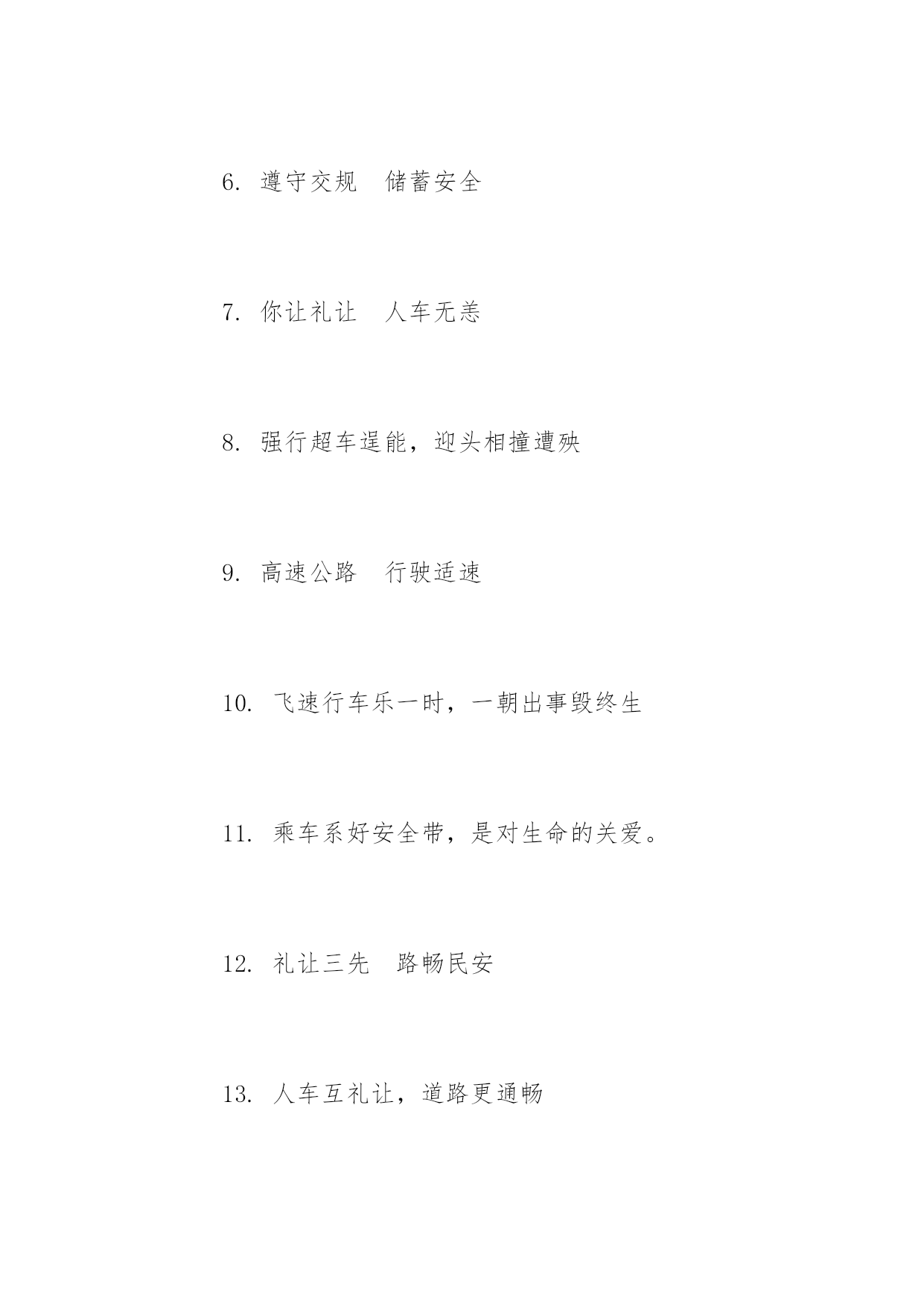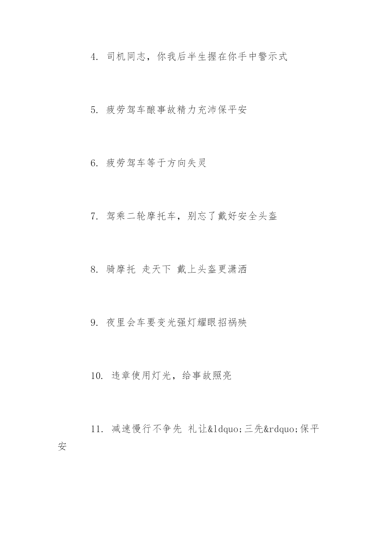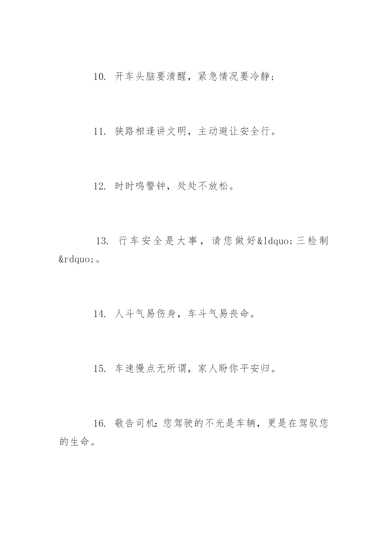驾驶员交通安全标语驾驶员交通安全标语心平气和莫着急,行车安全没问题。以下是小编精心整理的驾驶员交通安全标语,希望大家喜欢!驾驶员交通安全标语【精选篇】1.超载—刹车失效肇事快2.要珍惜生命不坐超载车3.麻痹大意酿事故谨慎驾驶保平安4.无证驾驶,害人害已5.狭路相逢“让”者胜6.遵守交规储蓄安全7.你让礼让人车无恙8.强行超车逞能,迎头相撞遭殃9.高速公路行驶适速10.飞速行车乐一时,一朝出事毁终生11.乘车系好安全带,是对生命的关爱。12.礼让三先路畅民安13.人车互礼让,道路更通畅14.宁绕百步远不抢一步险、15.共建春运交通好秩序确保人车平安路顺畅。16.新春庆佳节安全最关键17.春运安全是大事遵章守规非小节驾驶员交通安全标语【热门篇】1.路无规不畅国无法不宁2.一秒钟车祸,一辈子痛苦3.司机同志,请把握好你生命的时速和方向盘4.司机同志,你我后半生握在你手中警示式5.疲劳驾车酿事故精力充沛保平安6.疲劳驾车等于方向失灵7.驾乘二轮摩托车,别忘了戴好安全头盔8.骑摩托走天下戴上头盔更潇洒9.夜里会车要变光强灯耀眼招祸殃10.违章使用灯光,给事故照亮11.减速慢行不争先礼让“三先”保平安12.超速行驶,容易肇事,事故难免13.礼让——让出海阔天空14.争抢——抢出飞来横祸15.定期车检安全放心让您告别烦恼16.超载超速危机四伏17.超载会翻车翻车会死人坚决不坐超载车驾驶员交通安全标语【经典篇】1.守交规迎春夏秋冬福保安全纳东西南北财2.车辆超速行驶,缩短的不是工作时间,而是您的'生命时间。3.行车不超速,安全又幸福。4.车辆不超载,安全自然来。5.要对生命善待,请系好安全带。6.手握方向盘,绷紧安全弦。7.交通法规要牢记,路过街市别大意;8.心平气和莫着急,行车安全没问题。9.交通法规记心间,安全行车每一天。10.开车头脑要清醒,紧急情况要冷静;11.狭路相逢讲文明,主动避让安全行。12.时时鸣警钟,处处不放松。13.行车安全是大事,请您做好“三检制”。14.人斗气易伤身,车斗气易丧命。15.车速慢点无所谓,家人盼你平安归。16.敬告司机:您驾驶的不光是车辆,更是在驾驭您的生命。