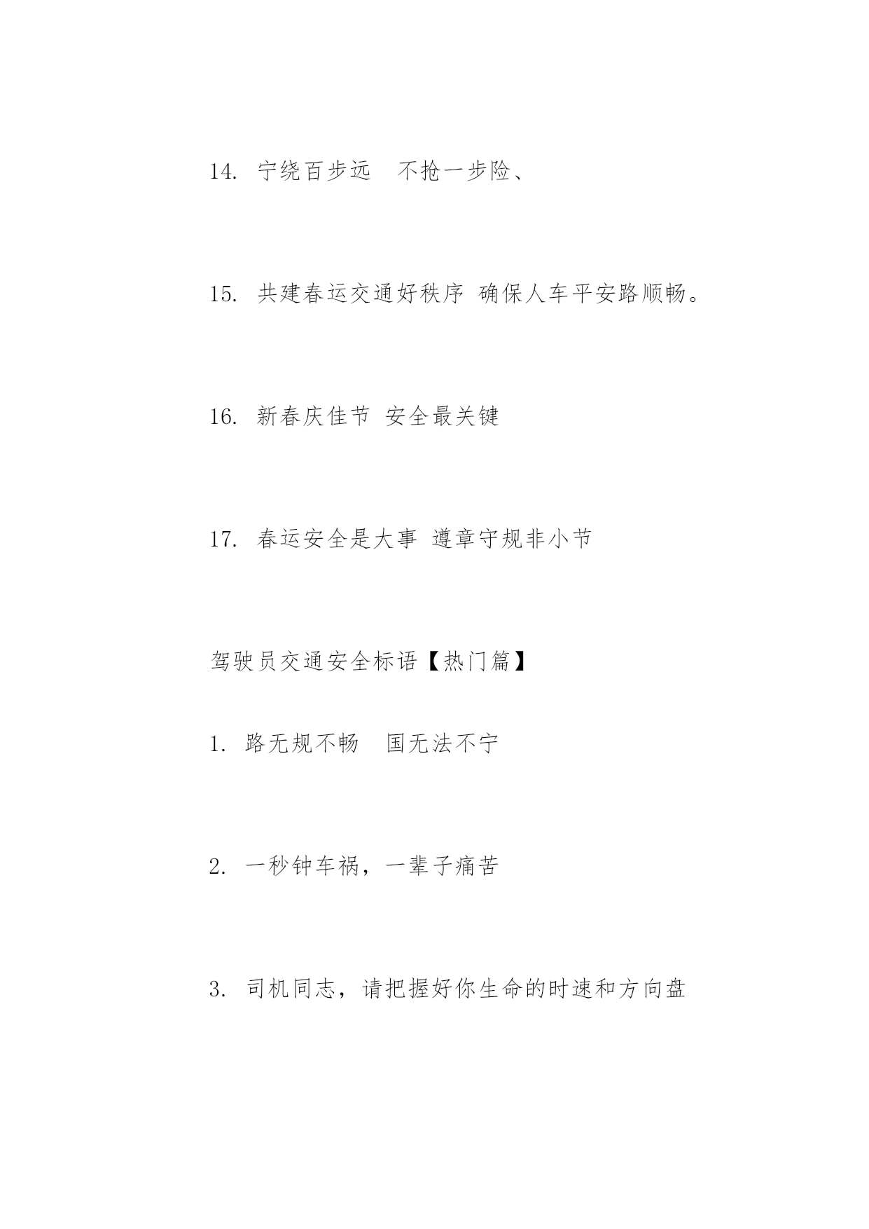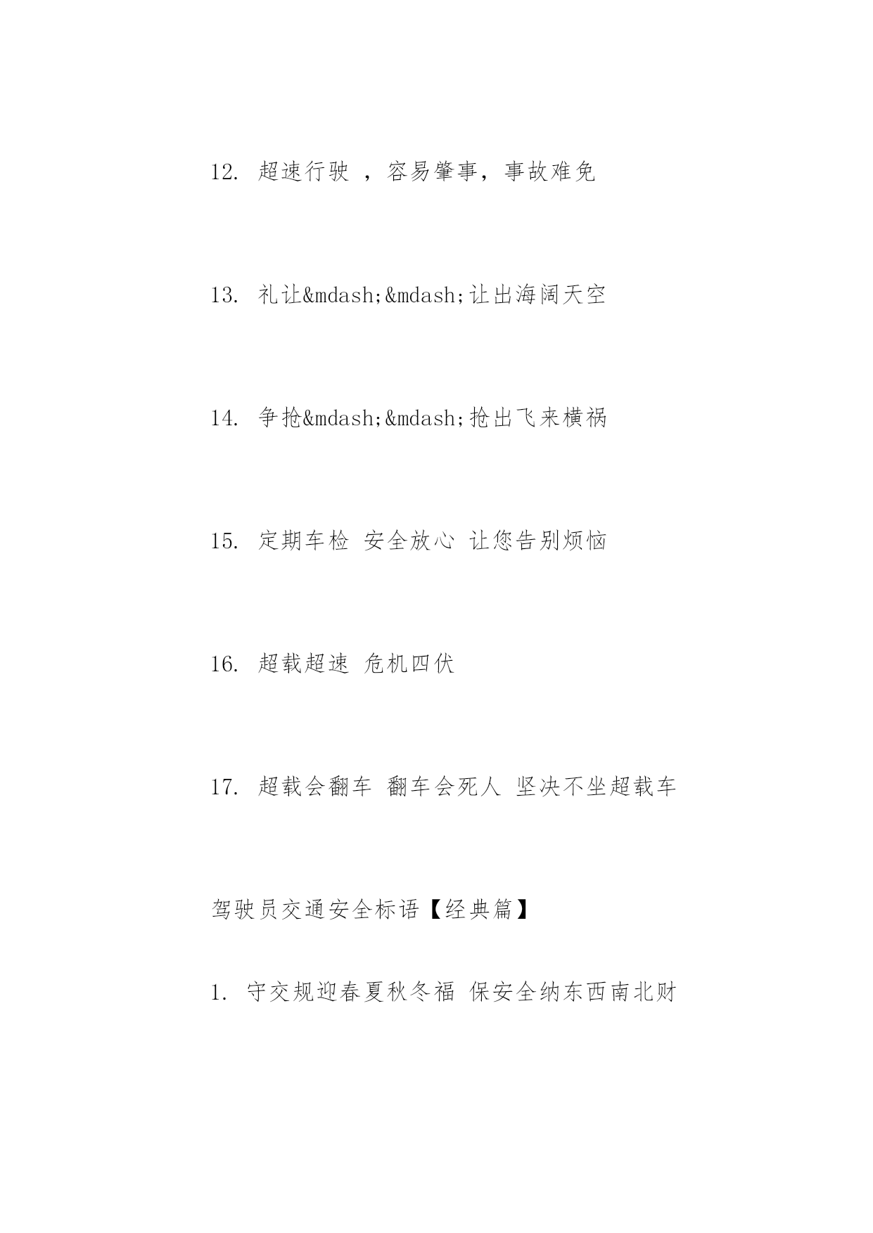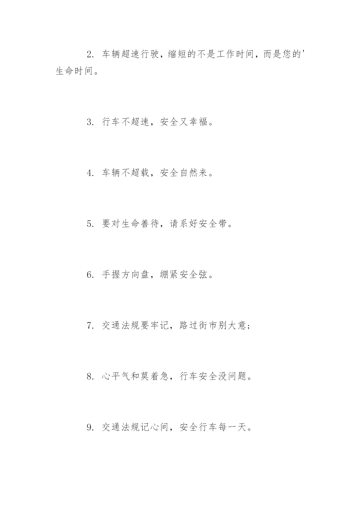 驾驶员交通安全标语驾驶员交通安全标语心平气和莫着急,行车安全没问题。以下是小编精心整理的驾驶员交通安全标语,希望大家喜欢!驾驶员交通安全标语【精选篇】1.超载—刹车失效肇事快2.要珍惜生命不坐超载车3.麻痹大意酿事故谨慎驾驶保平安4.无证驾驶,害人害已5.狭路相逢“让”者胜6.遵守交规储蓄安全7.你让礼让人车无恙8.强行超车逞能,迎头相撞遭殃9.高速公路行驶适速10.飞速行车乐一时,一朝出事毁终生11.乘车系好安全带,是对生命的关爱。12.礼让三先路畅民安13.人车互礼让,道路更通畅14.宁绕百步远不抢一步险、15.共建春运交通好秩序确保人车平安路顺畅。16.新春庆佳节安全最关键17.春运安全是大事遵章守规非小节驾驶员交通安全标语【热门篇】1.路无规不畅国无法不宁2.一秒钟车祸,一辈子痛苦3.司机同志,请把握好你生命的时速和方向盘4.司机同志,你我后半生握在你手中警示式5.疲劳驾车酿事故精力充沛保平安6.疲劳驾车等于方向失灵7.驾乘二轮摩托车,别忘了戴好安全头盔8.骑摩托走天下戴上头盔更潇洒9.夜里会车要变光强灯耀眼招祸殃10.违章使用灯光,给事故照亮11.减速慢行不争先礼让“三先”保平安12.超速行驶,容易肇事,事故难免13.礼让——让出海阔天空14.争抢——抢出飞来横祸15.定期车检安全放心让您告别烦恼16.超载超速危机四伏17.超载会翻车翻车会死人坚决不坐超载车驾驶员交通安全标语【经典篇】1.守交规迎春夏秋冬福保安全纳东西南北财2.车辆超速行驶,缩短的不是工作时间,而是您的'生命时间。3.行车不超速,安全又幸福。4.车辆不超载,安全自然来。5.要对生命善待,请系好安全带。6.手握方向盘,绷紧安全弦。7.交通法规要牢记,路过街市别大意;8.心平气和莫着急,行车安全没问题。9.交通法规记心间,安全行车每一天。10.开车头脑要清醒,紧急情况要冷静;11.狭路相逢讲文明,主动避让安全行。12.时时鸣警钟,处处不放松。13.行车安全是大事,请您做好“三检制”。14.人斗气易伤身,车斗气易丧命。15.车速慢点无所谓,家人盼你平安归。16.敬告司机:您驾驶的不光是车辆,更是在驾驭您的生命。