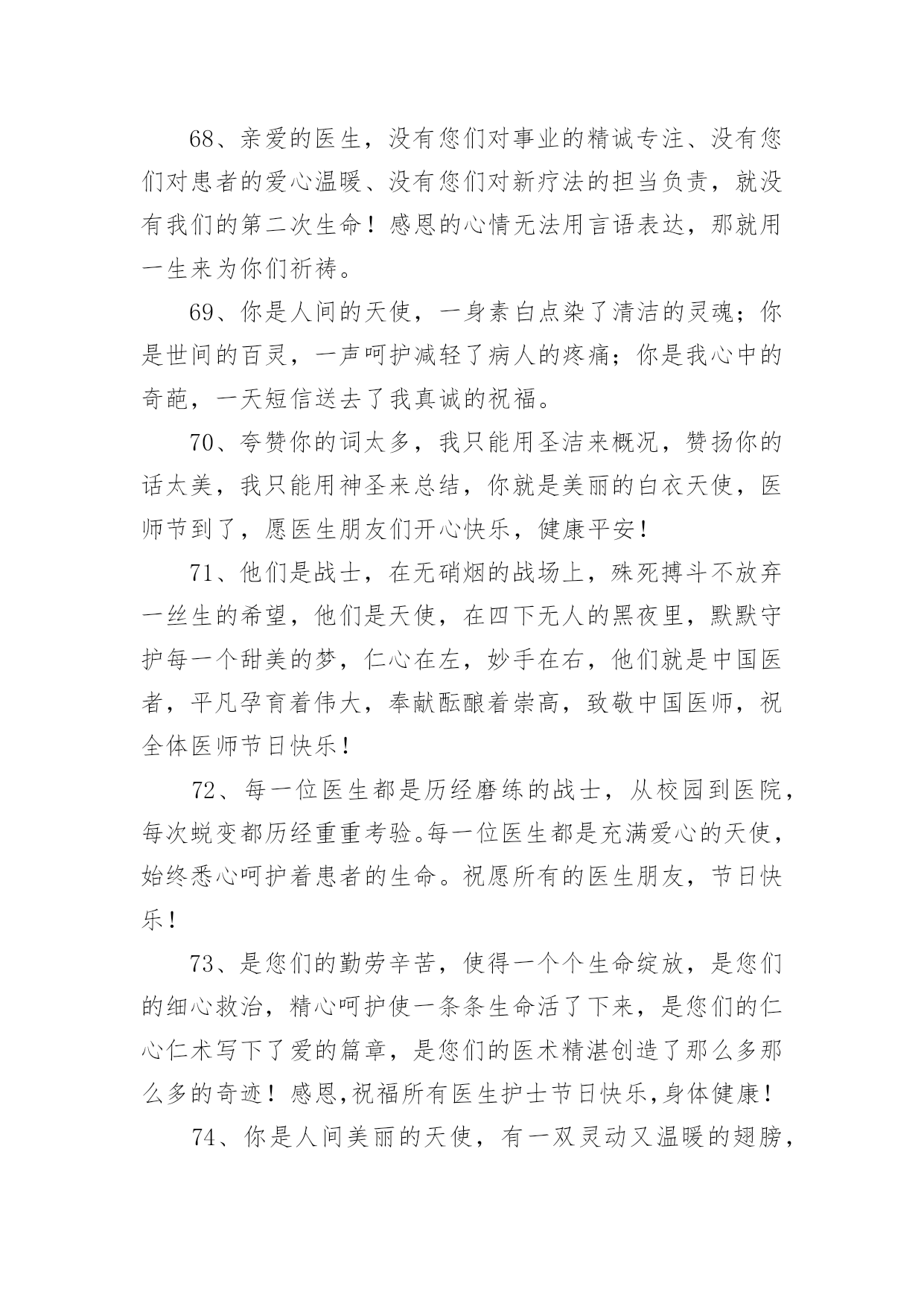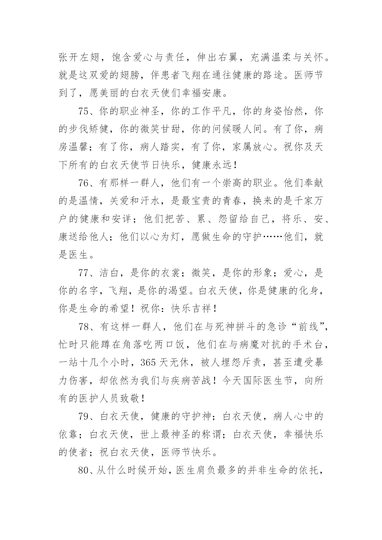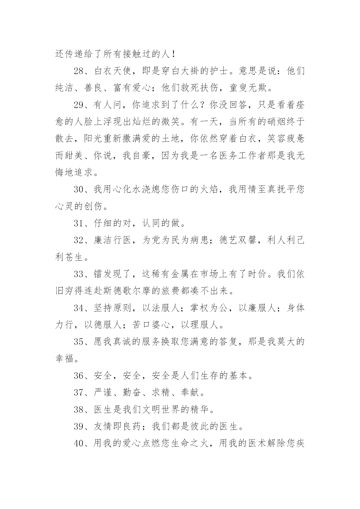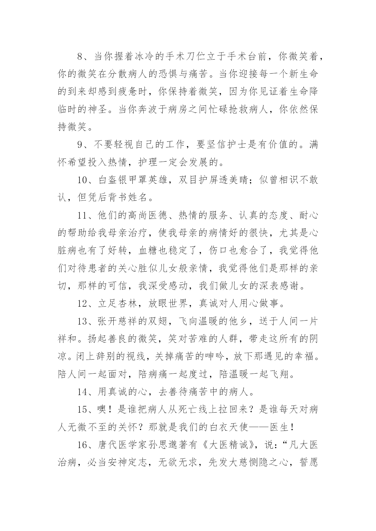 医师节的文案医师节的文案精选370句在学习、工作乃至生活中,大家都知道一些经典的文案吧,文案用以宣泄自己的小情绪,分享自己的心情。你还在找有意思的文案吗?下面是小编精心整理的医师节的文案精选370句,欢迎大家分享。1、我空虚的心灵,终于不再流泪,期待着雨后,缤纷的彩虹,诉说你我的约定,我不安的脚步,终于可以停歇,主你已为我,摆设了生命的盛宴。与你有约,是永恒的约。2、你们对工作尽职尽责,一丝不苟,对医术精益求精,对病人就象对亲人一样,我从内心真的好感激你们,我们全家人会永远记得你们。我没有什么可以留给你们,但我把感激的心留在这里!祝你们万事如意,好人一生平安!3、一个小小的生命降临人间,他的生与死,苦于乐,都像一粒种子,种在亲人的心间,也种在我们的心里。4、年迈医师节不知,群贤祝福起涟漪。光阴只渡无常过,梦盼诸君骨格奇。5、她们奉献的是最最宝贵的青春,换来的是千家万户的幸福和健康拥有者的安祥。6、你们不是清泉,却滋润着每一位患者久旱的心田。7、你们是美丽的天使。在你们的精心照顾下,一个个被病痛折磨的患者恢复了健康,重新走向了工作岗位,你们的工作,看似平凡却非常伟大!8、当你握着冰冷的手术刀伫立于手术台前,你微笑着,你的微笑在分散病人的恐惧与痛苦。当你迎接每一个新生命的到来却感到疲惫时,你保持着微笑,因为你见证着生命降临时的神圣。当你奔波于病房之间忙碌抢救病人,你依然保持微笑。9、不要轻视自己的工作,要坚信护士是有价值的。满怀希望投入热情,护理一定会发展的。10、白盔银甲罩英雄,双目护屏透美睛;似曾相识不敢认,但凭后背书姓名。11、他们的高尚医德、热情的服务、认真的态度、耐心的帮助给我母亲治疗,使我母亲的病情好的很快,尤其是心脏病也有了好转,血糖也稳定了,伤口也愈合了,我觉得他们对待患者的关心胜似儿女般亲情,我觉得他们是那样的亲切,那样的可信,我深受感动,我们做儿女的深表感谢。12、立足杏林,放眼世界,真诚对人用心做事。13、张开慈祥的双翅,飞向温暖的他乡,送于人间一片祥和。扬起善良的微笑,笑对苦难的人群,带走这所有的阴凉。闭上辞别的视线,关掉痛苦的呻吟,放下那遇见的幸福。陪人间一起面对,陪病痛一起度过,陪温暖一起飞翔。14、用真诚的心,去善待痛苦中的病人。15、噢!是谁把病人从死亡线上拉回来?是谁每天对病人无微不至的关怀?那就是我们的白衣天使——医生!16、唐代医学家孙思邈著有《大医精诚》,说:“凡大医治病,必当安神定志,无欲无求,先发大慈恻隐之心,誓愿普求含灵之苦……勿避险希、昼夜、寒暑、饥渴、疲劳,一心赴救,无作功夫形迹之心。如此可为苍生大医。”17、人间天使,白衣战士。救死扶伤,平平常常。18、乐于奉献,勇于付出。19、珍惜生命,善待他人,真诚服务。20、医生工作平凡而又伟大,琐碎而又不易,艰辛而又劳苦;我赞美护士能用柔弱的肩膀挑起一份女儿、母亲、妻子的重担;我赞美护士如春天的雨露滋润患者久旱的心田;如夏天的微风吹走燥热的空气带走患者心灵的创痛;如秋夜的明月照亮患者通往健康的心灵彼岸;如冬天的阳光温暖着患者蒸发她们的忧伤。21、春天的山路上,布满芳香,清新的空气,陶醉了归途的你,你从山路那边走来,洁白的衣服,恬谧的慈祥,银亮的药箱,鲜红的十字,犹如游历凡尘的天使,百鸟为你欢呼,鲜花为你绽放,欢迎凯旋的勇士,又一次战胜了病魔,你就是最美。22、医生有着纯洁的心灵,高尚的情操;走进每一位患者总带着一份职业性的微笑;不求回报只求奉献成了她们心中的骄傲;黑夜的恐怖加上生物钟颠倒;超负荷的工作连着疲惫的心身,她们想着的还是患者的需要;面对许多渴求健康的目光,她们惯用鼓励的眼神传递力量,用有力的双手搀扶着患者越过心灵的沼泽地,带给她们摆脱病魔的勇气和一份生存的基本需要,用心理学知识抚慰心灵空寂的患者轻松地进入梦乡,用语言美学知识为患者补充疾病康复的健康指导。23、俗话说,“吃了五谷生杂病”。人类自古以来就离不开医生,无论是谁都不能保证不生病,都离不开医生。包括医生自己也一样。人们需要医生都是在身体遭受痛苦和折磨的时候,甚至是在生命垂危的时刻。难上好救人,人民从来就非常尊重医生这个职业的。“黄金有价药无价”,“白衣天使”,“救人一命胜造七级浮屠”,这些都是人们对医生职业和行为崇敬和赞美。24、我感叹那生命的脆弱,我惊喜那无畏生命的顽强。我要好好呵护那鲜活的生机,哪怕我什么物质和名誉都失去,也不放弃不抛弃。在追逐事业的道路上,一次次把绝望带到希望,把希望变成美丽的生命,我感到自己仍然有蒸蒸日上的朝气,感觉到那不朽生命的活泼,那种大医傲然的幸福25、我赞美医生她们奉献的是一丝温情,一份关爱,一滴汗水,一份真情;她们奉献的是最最宝贵的青春。26、我赞美医生有着无私的爱,面对多重性格的患者,她们奉献的是海一样博大的情怀;面对刁难者纵使自己