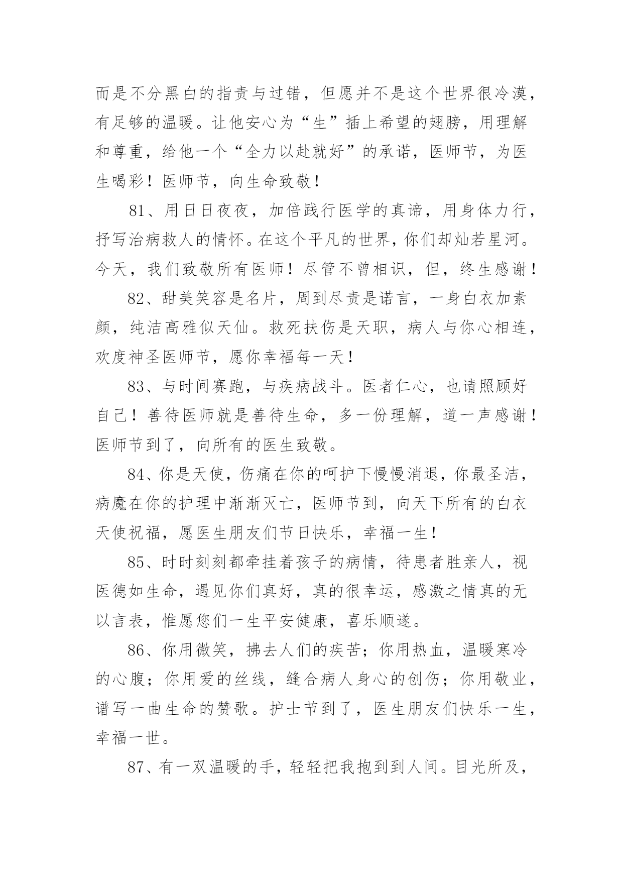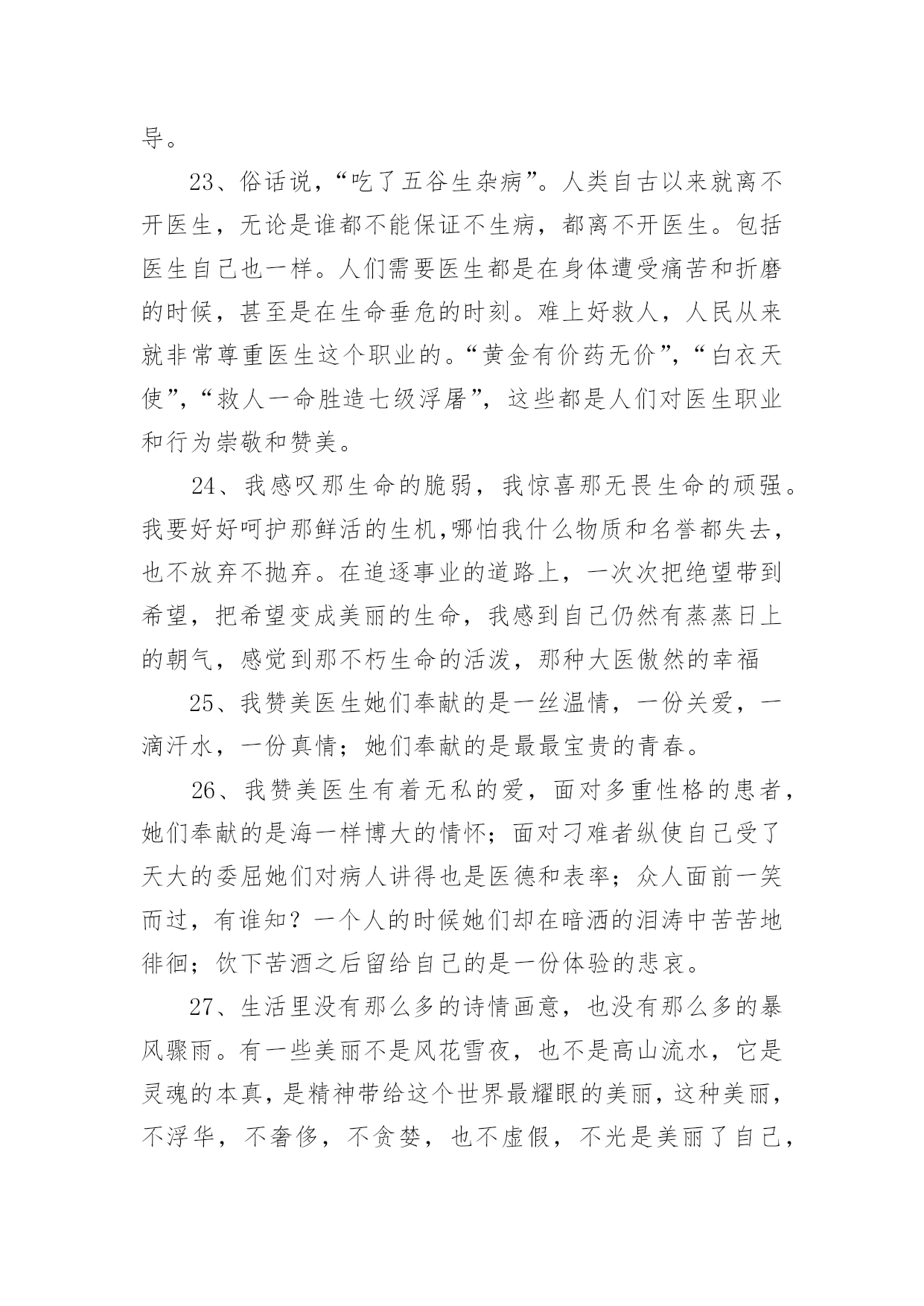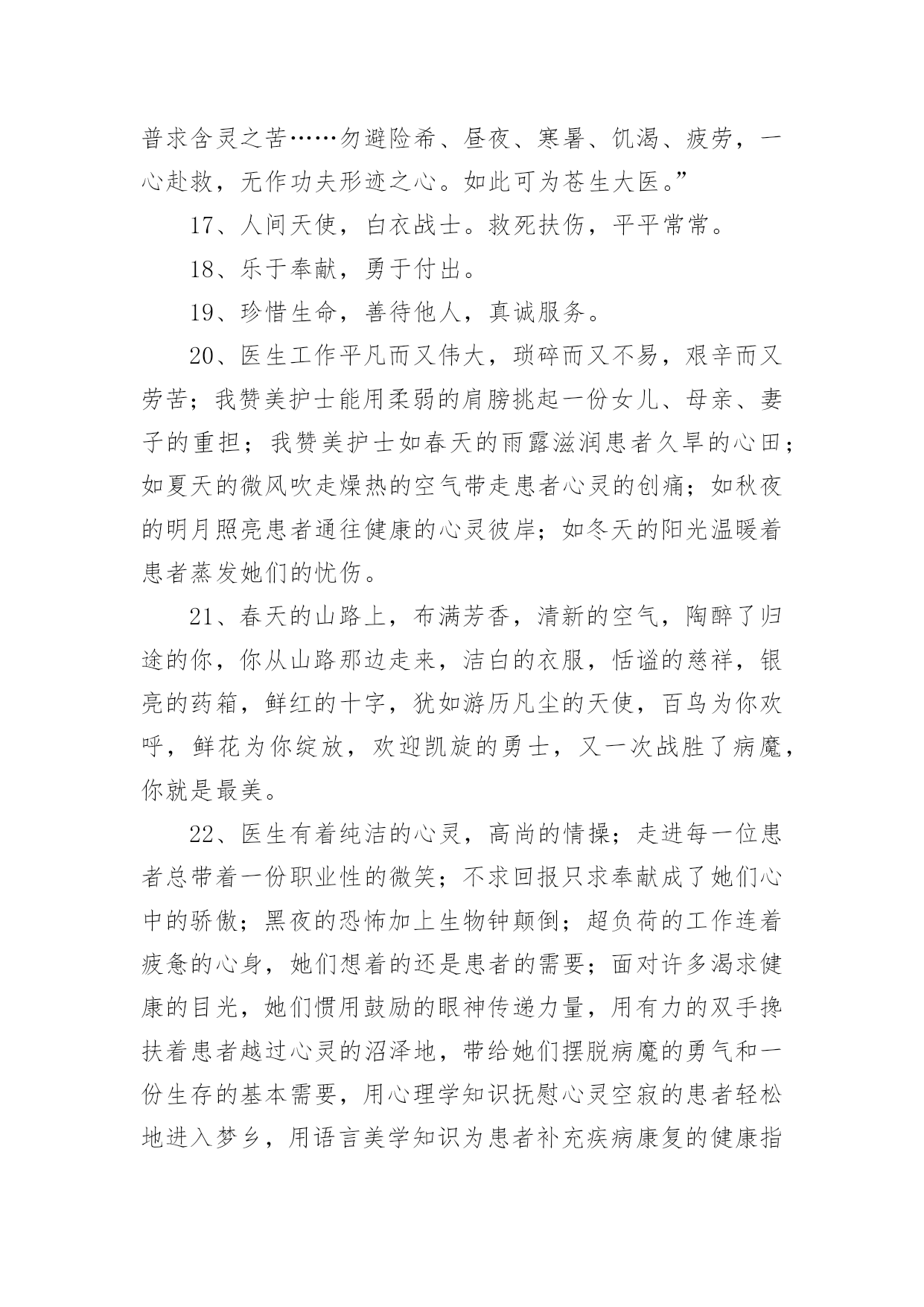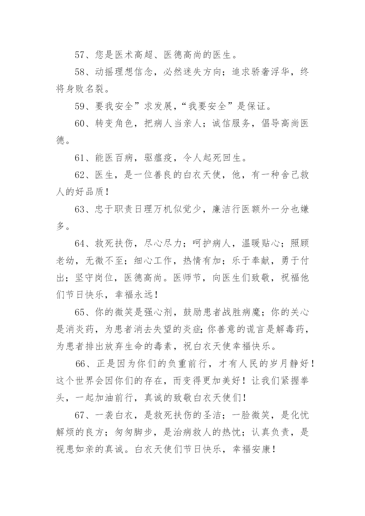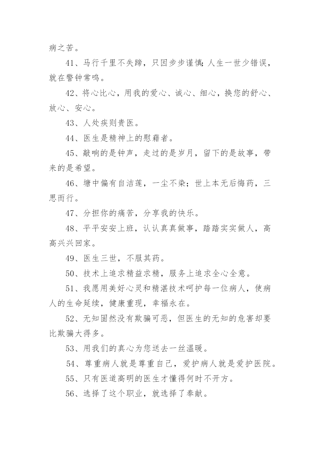 医师节的文案医师节的文案精选370句在学习、工作乃至生活中,大家都知道一些经典的文案吧,文案用以宣泄自己的小情绪,分享自己的心情。你还在找有意思的文案吗?下面是小编精心整理的医师节的文案精选370句,欢迎大家分享。1、我空虚的心灵,终于不再流泪,期待着雨后,缤纷的彩虹,诉说你我的约定,我不安的脚步,终于可以停歇,主你已为我,摆设了生命的盛宴。与你有约,是永恒的约。2、你们对工作尽职尽责,一丝不苟,对医术精益求精,对病人就象对亲人一样,我从内心真的好感激你们,我们全家人会永远记得你们。我没有什么可以留给你们,但我把感激的心留在这里!祝你们万事如意,好人一生平安!3、一个小小的生命降临人间,他的生与死,苦于乐,都像一粒种子,种在亲人的心间,也种在我们的心里。4、年迈医师节不知,群贤祝福起涟漪。光阴只渡无常过,梦盼诸君骨格奇。5、她们奉献的是最最宝贵的青春,换来的是千家万户的幸福和健康拥有者的安祥。6、你们不是清泉,却滋润着每一位患者久旱的心田。7、你们是美丽的天使。在你们的精心照顾下,一个个被病痛折磨的患者恢复了健康,重新走向了工作岗位,你们的工作,看似平凡却非常伟大!8、当你握着冰冷的手术刀伫立于手术台前,你微笑着,你的微笑在分散病人的恐惧与痛苦。当你迎接每一个新生命的到来却感到疲惫时,你保持着微笑,因为你见证着生命降临时的神圣。当你奔波于病房之间忙碌抢救病人,你依然保持微笑。9、不要轻视自己的工作,要坚信护士是有价值的。满怀希望投入热情,护理一定会发展的。10、白盔银甲罩英雄,双目护屏透美睛;似曾相识不敢认,但凭后背书姓名。11、他们的高尚医德、热情的服务、认真的态度、耐心的帮助给我母亲治疗,使我母亲的病情好的很快,尤其是心脏病也有了好转,血糖也稳定了,伤口也愈合了,我觉得他们对待患者的关心胜似儿女般亲情,我觉得他们是那样的亲切,那样的可信,我深受感动,我们做儿女的深表感谢。12、立足杏林,放眼世界,真诚对人用心做事。13、张开慈祥的双翅,飞向温暖的他乡,送于人间一片祥和。扬起善良的微笑,笑对苦难的人群,带走这所有的阴凉。闭上辞别的视线,关掉痛苦的呻吟,放下那遇见的幸福。陪人间一起面对,陪病痛一起度过,陪温暖一起飞翔。14、用真诚的心,去善待痛苦中的病人。15、噢!是谁把病人从死亡线上拉回来?是谁每天对病人无微不至的关怀?那就是我们的白衣天使——医生!16、唐代医学家孙思邈著有《大医精诚》,说:“凡大医治病,必当安神定志,无欲无求,先发大慈恻隐之心,誓愿普求含灵之苦……勿避险希、昼夜、寒暑、饥渴、疲劳,一心赴救,无作功夫形迹之心。如此可为苍生大医。”17、人间天使,白衣战士。救死扶伤,平平常常。18、乐于奉献,勇于付出。19、珍惜生命,善待他人,真诚服务。20、医生工作平凡而又伟大,琐碎而又不易,艰辛而又劳苦;我赞美护士能用柔弱的肩膀挑起一份女儿、母亲、妻子的重担;我赞美护士如春天的雨露滋润患者久旱的心田;如夏天的微风吹走燥热的空气带走患者心灵的创痛;如秋夜的明月照亮患者通往健康的心灵彼岸;如冬天的阳光温暖着患者蒸发她们的忧伤。21、春天的山路上,布满芳香,清新的空气,陶醉了归途的你,你从山路那边走来,洁白的衣服,恬谧的慈祥,银亮的药箱,鲜红的十字,犹如游历凡尘的天使,百鸟为你欢呼,鲜花为你绽放,欢迎凯旋的勇士,又一次战胜了病魔,你就是最美。22、医生有着纯洁的心灵,高尚的情操;走进每一位患者总带着一份职业性的微笑;不求回报只求奉献成了她们心中的骄傲;黑夜的恐怖加上生物钟颠倒;超负荷的工作连着疲惫的心身,她们想着的还是患者的需要;面对许多渴求健康的目光,她们惯用鼓励的眼神传递力量,用有力的双手搀扶着患者越过心灵的沼泽地,带给她们摆脱病魔的勇气和一份生存的基本需要,用心理学知识抚慰心灵空寂的患者轻松地进入梦乡,用语言美学知识为患者补充疾病康复的健康指导。23、俗话说,“吃了五谷生杂病”。人类自古以来就离不开医生,无论是谁都不能保证不生病,都离不开医生。包括医生自己也一样。人们需要医生都是在身体遭受痛苦和折磨的时候,甚至是在生命垂危的时刻。难上好救人,人民从来就非常尊重医生这个职业的。“黄金有价药无价”,“白衣天使”,“救人一命胜造七级浮屠”,这些都是人们对医生职业和行为崇敬和赞美。24、我感叹那生命的脆弱,我惊喜那无畏生命的顽强。我要好好呵护那鲜活的生机,哪怕我什么物质和名誉都失去,也不放弃不抛弃。在追逐事业的道路上,一次次把绝望带到希望,把希望变成美丽的生命,我感到自己仍然有蒸蒸日上的朝气,感觉到那不朽生命的活泼,那种大医傲然的幸福25、我赞美医生她们奉献的是一丝温情,一份关爱,一滴汗水,一份真情;她们奉献的是最最宝贵的青春。26、我赞美医生有着无私的爱,面对多重性格的患者,她们奉献的是海一样博大的情怀;面对刁难者纵使自己