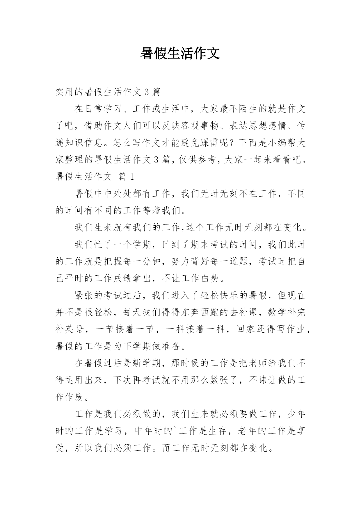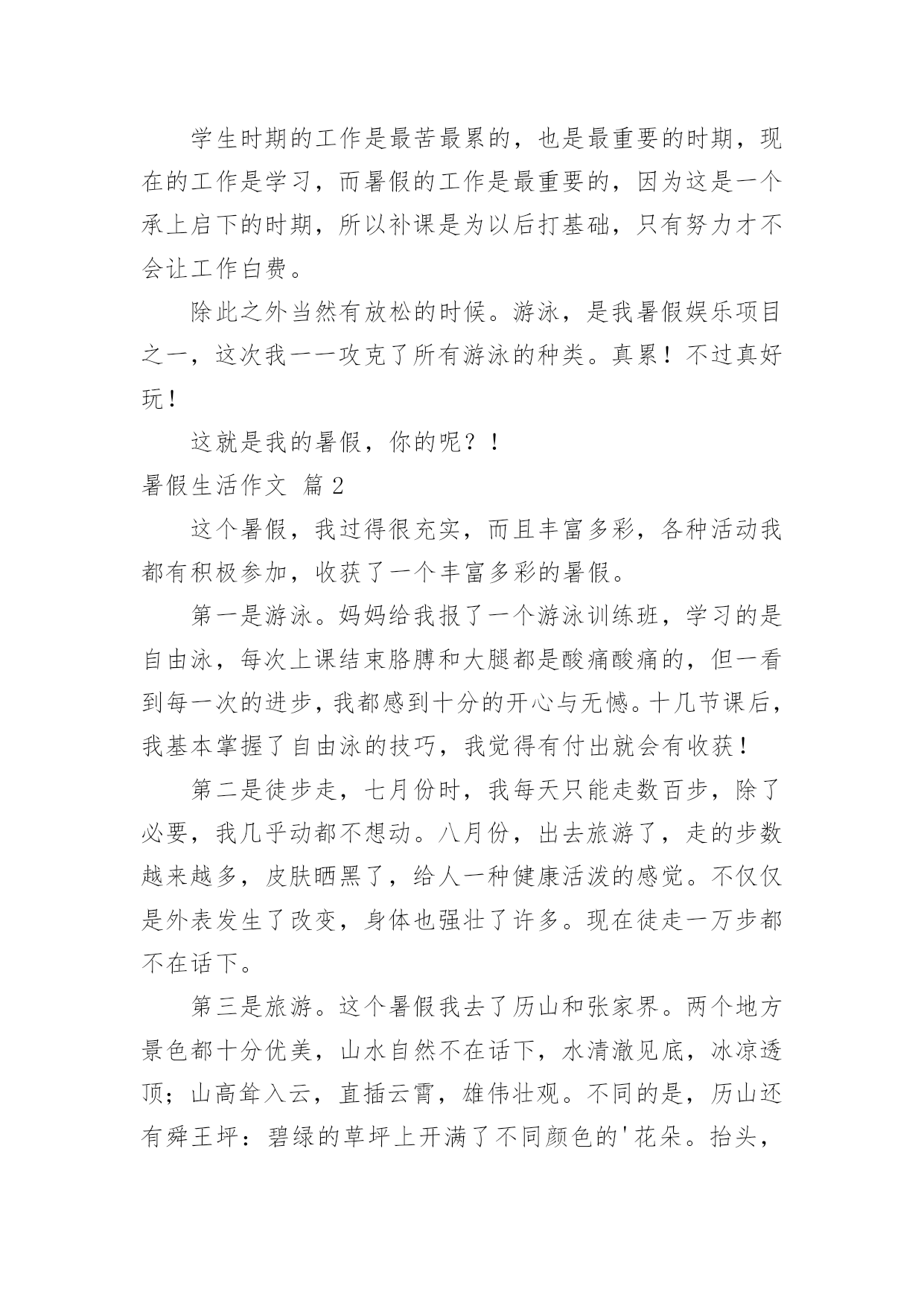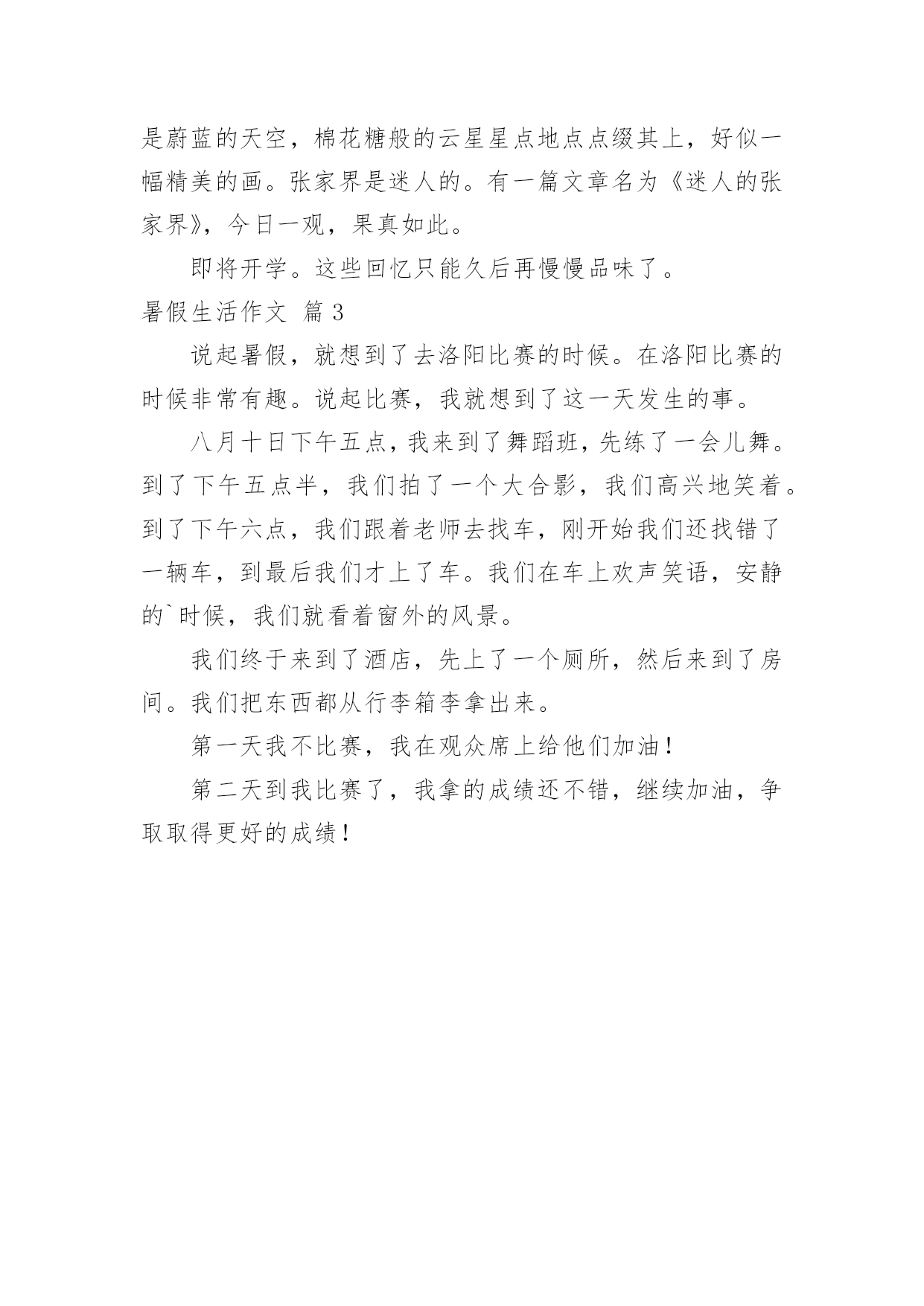 暑假生活作文实用的暑假生活作文3篇在日常学习、工作或生活中,大家最不陌生的就是作文了吧,借助作文人们可以反映客观事物、表达思想感情、传递知识信息。怎么写作文才能避免踩雷呢?下面是小编帮大家整理的暑假生活作文3篇,仅供参考,大家一起来看看吧。暑假生活作文篇1暑假中中处处都有工作,我们无时无刻不在工作,不同的时间有不同的工作等着我们。我们生来就有我们的工作,这个工作无时无刻都在变化。我们忙了一个学期,已到了期末考试的时间,我们此时的工作就是把握每一分钟,努力背好每一道题,考试时把自己平时的工作成绩拿出,不让工作白费。紧张的考试过后,我们进入了轻松快乐的暑假,但现在并不是很轻松,每天我们得得东奔西跑的去补课,数学补完补英语,一节接着一节,一科接着一科,回家还得写作业,暑假的工作是为下学期做准备。在暑假过后是新学期,那时侯的工作是把老师给我们不得运用出来,下次再考试就不用那么紧张了,不讳让做的工作作废。工作是我们必须做的,我们生来就必须要做工作,少年时的工作是学习,中年时的`工作是生存,老年的工作是享受,所以我们必须工作。而工作无时无刻都在变化。学生时期的工作是最苦最累的,也是最重要的时期,现在的工作是学习,而暑假的工作是最重要的,因为这是一个承上启下的时期,所以补课是为以后打基础,只有努力才不会让工作白费。除此之外当然有放松的时候。游泳,是我暑假娱乐项目之一,这次我一一攻克了所有游泳的种类。真累!不过真好玩!这就是我的暑假,你的呢?!暑假生活作文篇2这个暑假,我过得很充实,而且丰富多彩,各种活动我都有积极参加,收获了一个丰富多彩的暑假。第一是游泳。妈妈给我报了一个游泳训练班,学习的是自由泳,每次上课结束胳膊和大腿都是酸痛酸痛的,但一看到每一次的进步,我都感到十分的开心与无憾。十几节课后,我基本掌握了自由泳的技巧,我觉得有付出就会有收获!第二是徒步走,七月份时,我每天只能走数百步,除了必要,我几乎动都不想动。八月份,出去旅游了,走的步数越来越多,皮肤晒黑了,给人一种健康活泼的感觉。不仅仅是外表发生了改变,身体也强壮了许多。现在徒走一万步都不在话下。第三是旅游。这个暑假我去了历山和张家界。两个地方景色都十分优美,山水自然不在话下,水清澈见底,冰凉透顶;山高耸入云,直插云霄,雄伟壮观。不同的是,历山还有舜王坪:碧绿的草坪上开满了不同颜色的'花朵。抬头,是蔚蓝的天空,棉花糖般的云星星点地点点缀其上,好似一幅精美的画。张家界是迷人的。有一篇文章名为《迷人的张家界》,今日一观,果真如此。即将开学。这些回忆只能久后再慢慢品味了。暑假生活作文篇3说起暑假,就想到了去洛阳比赛的时候。在洛阳比赛的时候非常有趣。说起比赛,我就想到了这一天发生的事。八月十日下午五点,我来到了舞蹈班,先练了一会儿舞。到了下午五点半,我们拍了一个大合影,我们高兴地笑着。到了下午六点,我们跟着老师去找车,刚开始我们还找错了一辆车,到最后我们才上了车。我们在车上欢声笑语,安静的`时候,我们就看着窗外的风景。我们终于来到了酒店,先上了一个厕所,然后来到了房间。我们把东西都从行李箱李拿出来。第一天我不比赛,我在观众席上给他们加油!第二天到我比赛了,我拿的成绩还不错,继续加油,争取取得更好的成绩!