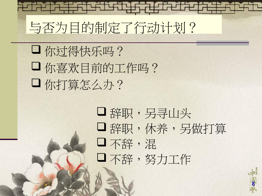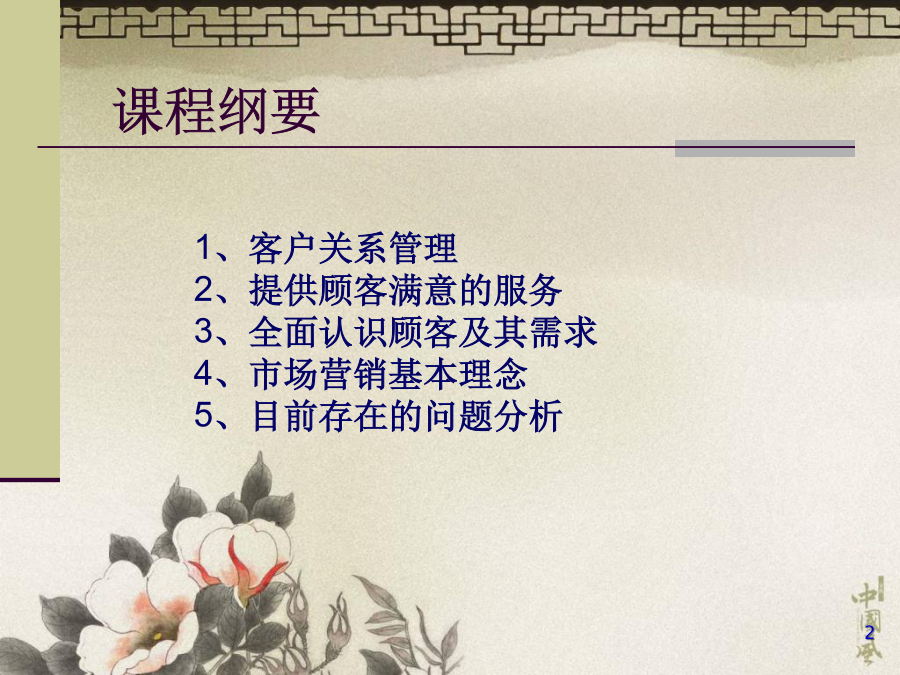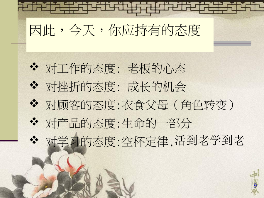 客户关系管理理论分析课程纲要只用口述100%想说的80%说了出来60%被听到125我们的目的技能目的管理与否为目的制定了行动计划?对工作的态度:老板的心态对挫折的态度:成长的机会对顾客的态度:衣食父母(角色转变)对产品的态度:生命的一部分对学习的态度:空杯定律,活到老学到老——随时散布疑云——有传染性——使人消极——使人不能享有人生积极心态带给你——控制自己的思想:Concept——控制自己的时间:Clock——控制接触的对象:Contacts——控制沟通的方式:Communication——控制自己的承诺:Commitments——控制自己的目的:Causes——控制自己的忧虑:Concern让自信心永伴你顾客从我们手里买走的是什么?市场营销学中产品的含义产品的三个构成部分企业利润的来源产品(服务)清单产品概念的延伸问题:和竞争企业比起来我们有何优劣势?怎样让顾客(客户)满意?怎样让客户忠诚?我们为何要想措施留住老顾客?为留住老顾客、鼓励新顾客加入,我们采用了何种方略?今天在顾客(客户)管理方面碰到哪些问题?建立顾客关系的环节什么是营销?营销整合战术4R-获得长期成功的基石老式营销VS服务营销企业竞争力及差异化本源价值的产生与传递营销的战略措施服务营销理念员工满意并忠诚实行关系营销的详细方略顾客Acquainting认识顾客营销学中的市场与顾客细分-内外部-奉献-购置意愿与素质-内/外在价值型-价格与价值导向-需求层次市场细分对企业经营的指导CRM在工作中的辅助作用-交接-壁垒什么是客户满意度客户需求隐含的期望什么能让客户满意影响客户满意度的原因勉强的满意是不够的期望VS获得(反馈)营销的目的:不停地使客户保持长期满意原则化VS个性化努力满足最有价值的客户在每一次互动中发现并满足客户的一系列规定什么使顾客满意?确定目的客户群由于有需求,因此有企业、产品与服务不一样的客户有不一样的需求同一客户在不一样步间的需求也许不一样样客户的需求是运动、变化的客户需求可以被激发而产生需求有隐性的需求有层次划分BasicNeedWantDesireTheUnexpected顾客满意与忠诚的关系企业经营主体的转变:终身客户对满意的定义“满意陷阱”与转移成本对忠诚的理解顾客需求分析与顾客细分影响顾客满意度的重要原因沟通/真实一刻安全度/期望值/对比生意/绩效考核/追踪监督/服务对顾客需求的感知偏差前后台的设计服务的程序面与个人面程序面客户满意度的影响原因影响客户满意度的原因服务体系技术体现情感原因找存车的地方服务效率-识别顾客需求需要理解优质服务的时间规定Explore探索客户需求案例:产品的概念和服务的意识闲逛家乐福,在家电柜台前付款时碰到这样一件事,有一位女士选购了一台热水器、一台抽油烟机、一台煤气灶,付款时规定即时送货,由于她刚到深圳,现正住在酒店里,由于住酒店费用很高,已经租了房子,但愿能立即搬进去住,因此采购了这些生活用品,并且住的地方离这里只有十分钟的步行旅程,因此规定立即送货;这时,企业的规定发挥了巨大的作用,送货的负责人说:对不起,按照我们企业的规定,只能明天送货,今天送不了。那位女士一听后说:假如你今天不能送,那我就不买了。促销小姐顿时着了慌,恳求送货部负责人说:假如能安排过来,就送一趟吧,实在不行的话,我找个人顶班,和你们一起跑一趟。送货负责人说:这是规定,我们只能按规定执行。那位女士终于失望地离开了。这时,送货负责人又发牢骚说:连一天都不愿等,多等一天又有什么要紧,不买就算了。反馈速度及成果提议取消营销部门营销不仅仅是一种部门,而是一种意识,是一种渗透于成功企业中的文化一种以营销为中心的组织,必须使他的员工对客户的态度保持一致——组织中的任何一种人都也许对满意度产生影响并非所有的客户都是有价值的要成为服务业的领先企业,首先必须学会拒绝,拒绝某些市场和成长的机会。“专一经营的企业必须集中精力为高度集中的目的客户群提供少而精的服务,从而获取利润。”在服务交易过程中,应为消费者提供足够的信息,尽量让购置者对服务提高认知度,使购置者在购置过程中感到自己拥有较多的积极权和较大的控制力,充足地理解服务过程、状态,进程和发展,以减少风险,增强配合服务完毕的信心。毕竟,在服务世界里,只有客户才拥有“终极审判权”。一种成功的服务企业唯一不变的就是永远为了适应客户的需求而变化,只有不停进行适应性的变化服务才有生命力。---CraigTerrill优质服务的详细体现怎样发现客户不满意?优美的答复函构造对于埋怨的答复,写给谁看?时限的承诺答复告知方式怎样保证不“遗失”对当事人的处