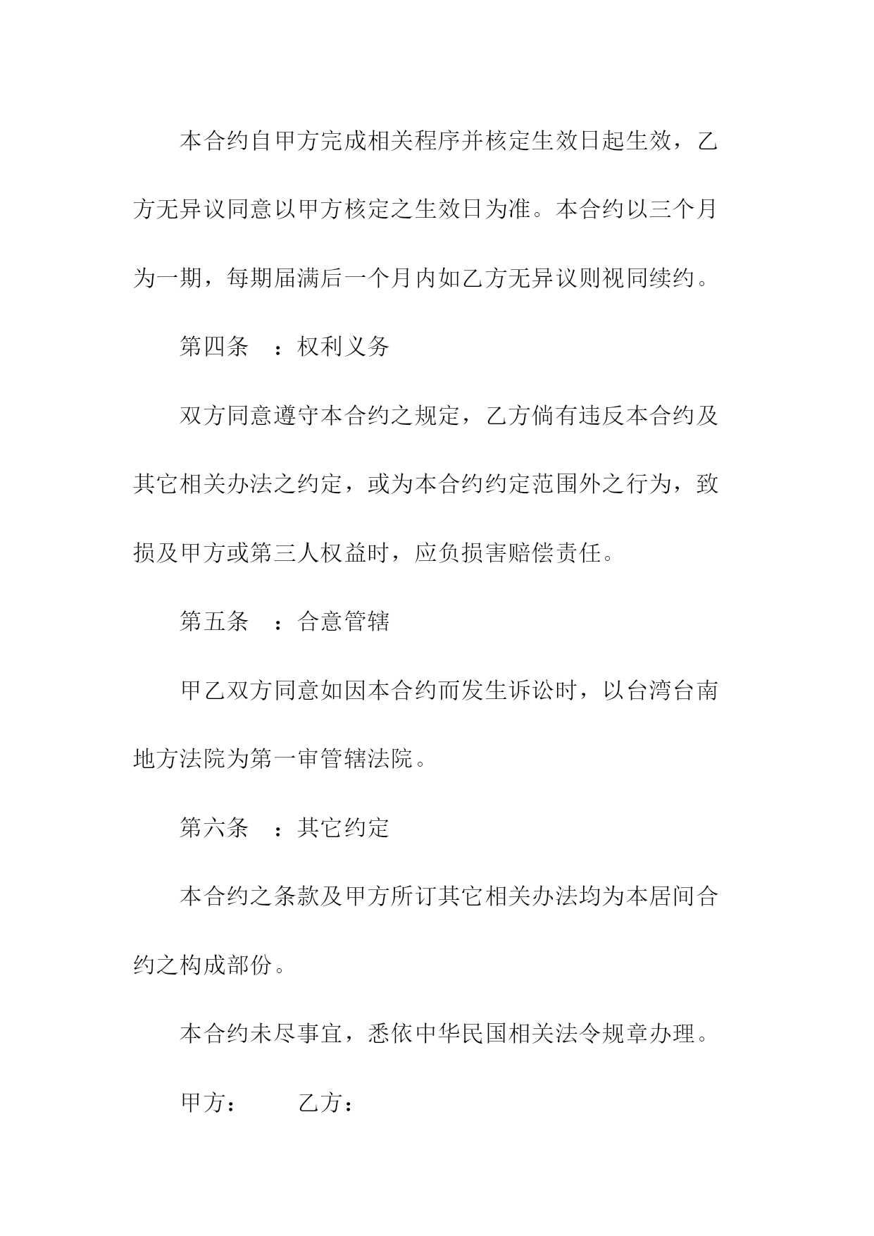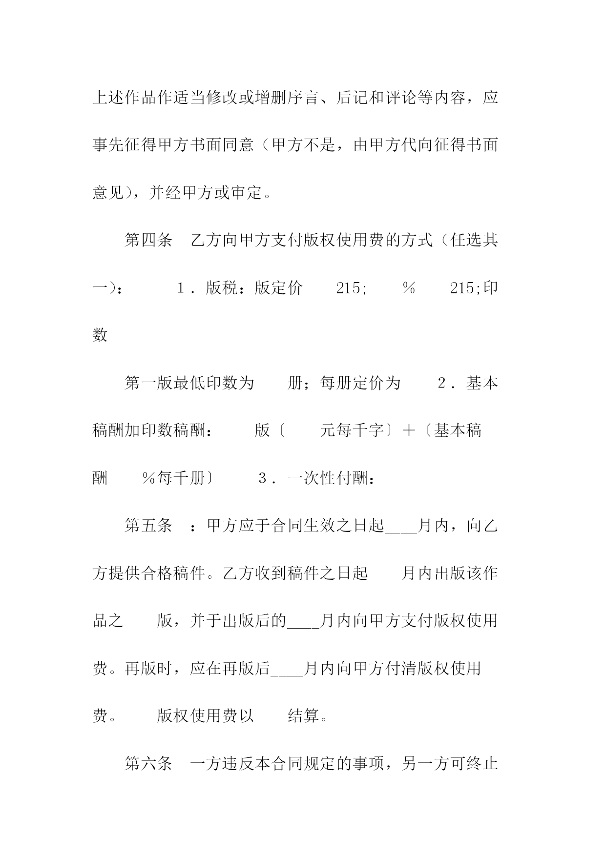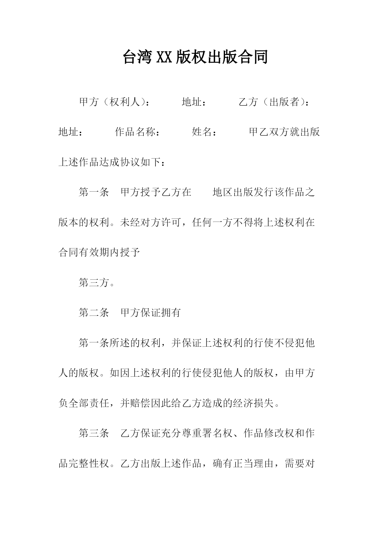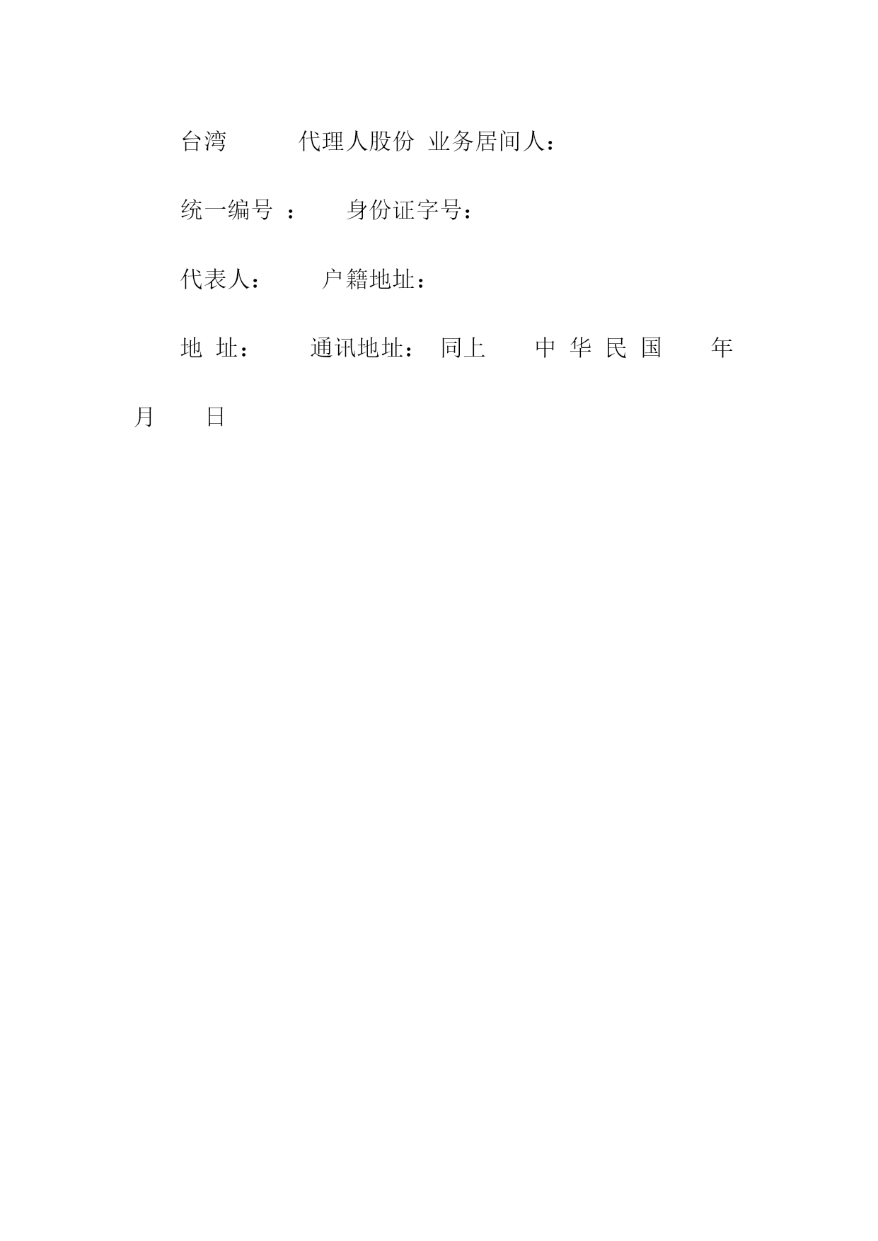 订立契约居间合约(台湾)立合约书人:台湾代理人股份(以下称甲方)先生/女士(以下称乙方)兹因乙方同意为甲方报告订立契约之机会,双方依诚实信用原则订立居间合约如下:第一条:合意事项双方依本合约之约定成立居间关系,不适用其它劳务关系相关约定或规定,乙方同意为甲方寻觅及指示可与其签订契约之相对人,而提供签约之机会。第二条:居间报酬契约因乙方之居间而成立生效,并逾契约撤销期限确定生效后,乙方始得按甲方「展业制度」之相关报酬标准支领报酬。第三条:合约期间本合约自甲方完成相关程序并核定生效日起生效,乙方无异议同意以甲方核定之生效日为准。本合约以三个月为一期,每期届满后一个月内如乙方无异议则视同续约。第四条:权利义务双方同意遵守本合约之规定,乙方倘有违反本合约及其它相关办法之约定,或为本合约约定范围外之行为,致损及甲方或第三人权益时,应负损害赔偿责任。第五条:合意管辖甲乙双方同意如因本合约而发生诉讼时,以台湾台南地方法院为第一审管辖法院。第六条:其它约定本合约之条款及甲方所订其它相关办法均为本居间合约之构成部份。本合约未尽事宜,悉依中华民国相关法令规章办理。甲方:乙方:台湾代理人股份业务居间人:统一编号:身份证字号:代表人:户籍地址:地址:通讯地址:同上中华民国年月日居间合约书合约书编号:_______立合约书人:_______代理人股份(以下称甲方)_______先生/女士(以下称乙方)兹因乙方同意为甲方报告订立契约之机会,双方依诚实信用原则订立居间合约如下:第一条合意事项双方依本合约之约定成立居间关系,不适用其它劳务关系相关约定或规定,乙方同意为甲方寻觅及指示可与其签订契约之相对人,而提供签约之机会。第二条居间报酬契约因乙方之居间而成立生效,并逾契约撤销期限确定生效后,乙方始得按甲方之相关报酬标准支领报酬。第三条合约期间本合约自甲方完成相关程序并核定生效日起生效,乙方无异议同意以甲方核定之生效日为准。本合约以个_______月为一期,每期届满后一个月内如乙方无异议则视同续约。第四条权利义务双方同意遵守本合约之规定,乙方倘有违反本合约及其它相关办法之约定,或为本合约约定范围外之行为,致损及甲方或第三人权益时,应负损害赔偿责任。第五条合意管辖甲乙双方同意如因本合约而发生诉讼时,以_______法院为第一审管辖法院。第六条其它约定本合约之条款及甲方所订其它相关办法均为本居间合约之构成部份。本合约未尽事宜,悉依中华民国相关法令规章办理。甲方:_______代理人股份代表人:_______地址:_______通讯地址:_______乙方:_______(业务居间人)身份证字号:_______户籍地址:_______通讯地址:______________年_______月_______日台湾XX版权出版合同甲方(权利人):地址:乙方(出版者):地址:作品名称:姓名:甲乙双方就出版上述作品达成协议如下:第一条甲方授予乙方在地区出版发行该作品之版本的权利。未经对方许可,任何一方不得将上述权利在合同有效期内授予第三方。第二条甲方保证拥有第一条所述的权利,并保证上述权利的行使不侵犯他人的版权。如因上述权利的行使侵犯他人的版权,由甲方负全部责任,并赔偿因此给乙方造成的经济损失。第三条乙方保证充分尊重署名权、作品修改权和作品完整性权。乙方出版上述作品,确有正当理由,需要对上述作品作适当修改或增删序言、后记和评论等内容,应事先征得甲方书面同意(甲方不是,由甲方代向征得书面意见),并经甲方或审定。第四条乙方向甲方支付版权使用费的方式(任选其一):1.版税:版定价215;%215;印数第一版最低印数为册;每册定价为2.基本稿酬加印数稿酬:版〔元每千字〕+〔基本稿酬%每千册〕3.一次性付酬:第五条:甲方应于合同生效之日起____月内,向乙方提供合格稿件。乙方收到稿件之日起____月内出版该作品之版,并于出版后的____月内向甲方支付版权使用费。再版时,应在再版后____月内向甲方付清版权使用费。版权使用费以结算。第六条一方违反本合同规定的事项,另一方可终止合同,并要求赔偿因此造成的损失。第七条双方因协议的履行或解释发生争议,可协商解决,协商不成,可请求双方同意的进行仲裁。第八条本合同有效期为_____年,自合同签字(或批准)之日起计算。第九条本合同以中文写就一式两份,双方各执一份为凭。第十条本合同签字日期为_____年____月____日。甲方(签字)代理人(签字)乙方(签字)代理人(签字)版权转让和出版合同书按>规定,对出版的每篇论文均要求签署一份正式的书面版权转让和出版合同。请填好下列空格并签字后将原件寄回>编辑部。在收到经签字的本合同后,论文方能正式出版。根据中国>可选用电子签名方式签字,并通过电子邮件方式将本合同寄回编辑部。编辑部专用电