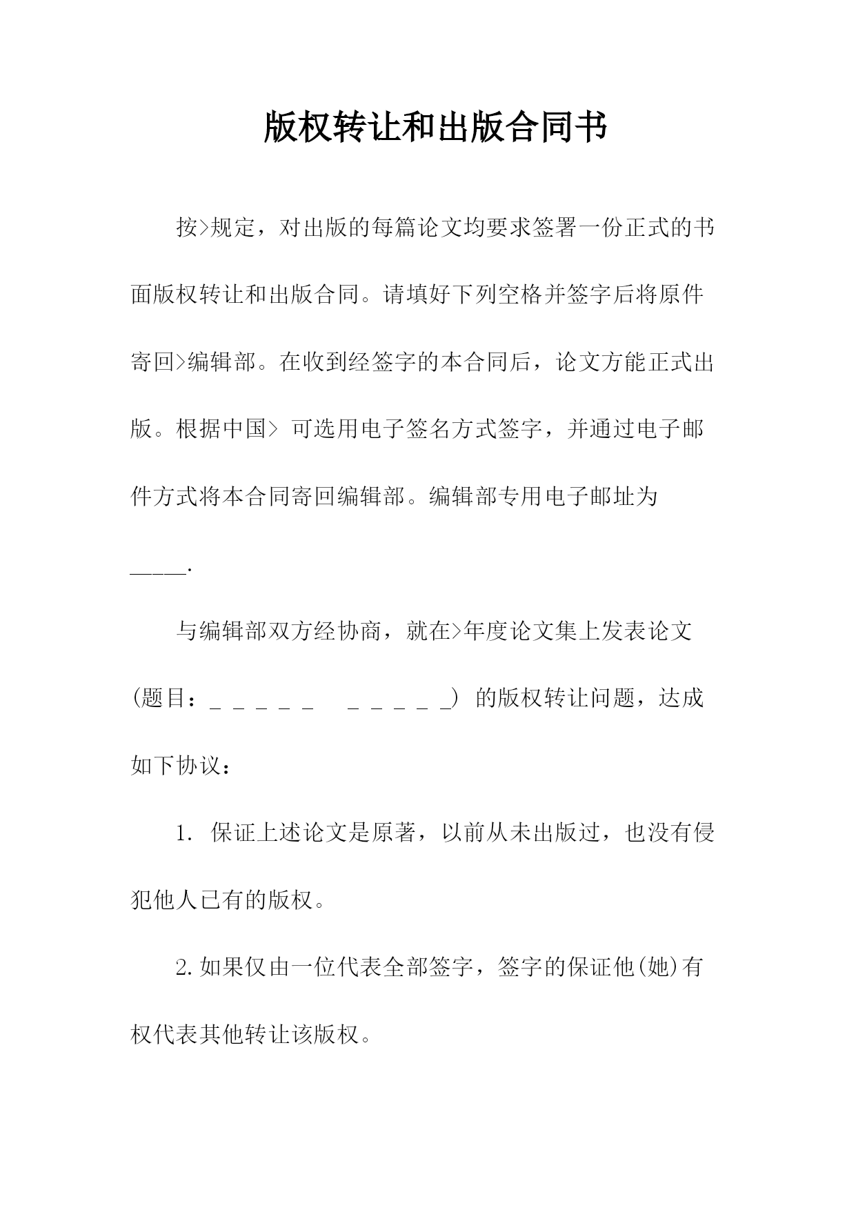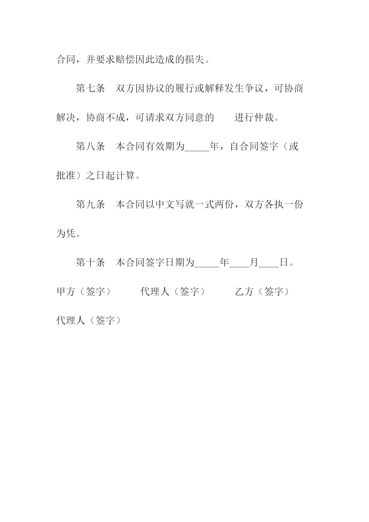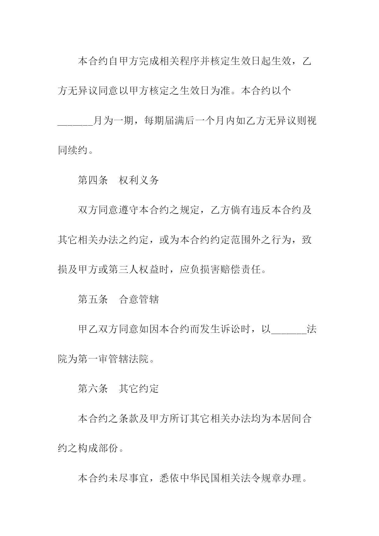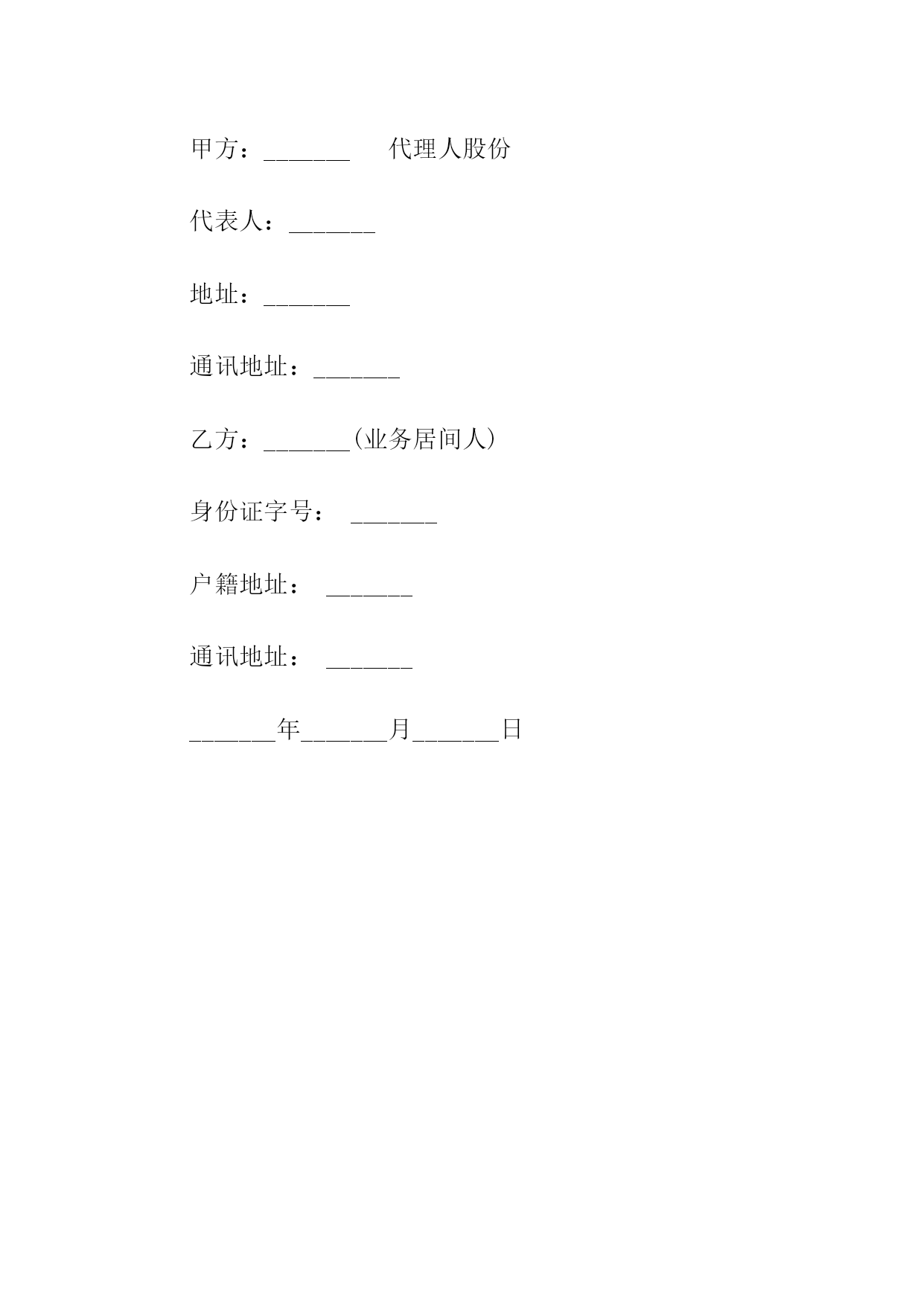 订立契约居间合约(台湾)立合约书人:台湾代理人股份(以下称甲方)先生/女士(以下称乙方)兹因乙方同意为甲方报告订立契约之机会,双方依诚实信用原则订立居间合约如下:第一条:合意事项双方依本合约之约定成立居间关系,不适用其它劳务关系相关约定或规定,乙方同意为甲方寻觅及指示可与其签订契约之相对人,而提供签约之机会。第二条:居间报酬契约因乙方之居间而成立生效,并逾契约撤销期限确定生效后,乙方始得按甲方「展业制度」之相关报酬标准支领报酬。第三条:合约期间本合约自甲方完成相关程序并核定生效日起生效,乙方无异议同意以甲方核定之生效日为准。本合约以三个月为一期,每期届满后一个月内如乙方无异议则视同续约。第四条:权利义务双方同意遵守本合约之规定,乙方倘有违反本合约及其它相关办法之约定,或为本合约约定范围外之行为,致损及甲方或第三人权益时,应负损害赔偿责任。第五条:合意管辖甲乙双方同意如因本合约而发生诉讼时,以台湾台南地方法院为第一审管辖法院。第六条:其它约定本合约之条款及甲方所订其它相关办法均为本居间合约之构成部份。本合约未尽事宜,悉依中华民国相关法令规章办理。甲方:乙方:台湾代理人股份业务居间人:统一编号:身份证字号:代表人:户籍地址:地址:通讯地址:同上中华民国年月日居间合约书合约书编号:_______立合约书人:_______代理人股份(以下称甲方)_______先生/女士(以下称乙方)兹因乙方同意为甲方报告订立契约之机会,双方依诚实信用原则订立居间合约如下:第一条合意事项双方依本合约之约定成立居间关系,不适用其它劳务关系相关约定或规定,乙方同意为甲方寻觅及指示可与其签订契约之相对人,而提供签约之机会。第二条居间报酬契约因乙方之居间而成立生效,并逾契约撤销期限确定生效后,乙方始得按甲方之相关报酬标准支领报酬。第三条合约期间本合约自甲方完成相关程序并核定生效日起生效,乙方无异议同意以甲方核定之生效日为准。本合约以个_______月为一期,每期届满后一个月内如乙方无异议则视同续约。第四条权利义务双方同意遵守本合约之规定,乙方倘有违反本合约及其它相关办法之约定,或为本合约约定范围外之行为,致损及甲方或第三人权益时,应负损害赔偿责任。第五条合意管辖甲乙双方同意如因本合约而发生诉讼时,以_______法院为第一审管辖法院。第六条其它约定本合约之条款及甲方所订其它相关办法均为本居间合约之构成部份。本合约未尽事宜,悉依中华民国相关法令规章办理。甲方:_______代理人股份代表人:_______地址:_______通讯地址:_______乙方:_______(业务居间人)身份证字号:_______户籍地址:_______通讯地址:______________年_______月_______日台湾XX版权出版合同甲方(权利人):地址:乙方(出版者):地址:作品名称:姓名:甲乙双方就出版上述作品达成协议如下:第一条甲方授予乙方在地区出版发行该作品之版本的权利。未经对方许可,任何一方不得将上述权利在合同有效期内授予第三方。第二条甲方保证拥有第一条所述的权利,并保证上述权利的行使不侵犯他人的版权。如因上述权利的行使侵犯他人的版权,由甲方负全部责任,并赔偿因此给乙方造成的经济损失。第三条乙方保证充分尊重署名权、作品修改权和作品完整性权。乙方出版上述作品,确有正当理由,需要对上述作品作适当修改或增删序言、后记和评论等内容,应事先征得甲方书面同意(甲方不是,由甲方代向征得书面意见),并经甲方或审定。第四条乙方向甲方支付版权使用费的方式(任选其一):1.版税:版定价215;%215;印数第一版最低印数为册;每册定价为2.基本稿酬加印数稿酬:版〔元每千字〕+〔基本稿酬%每千册〕3.一次性付酬:第五条:甲方应于合同生效之日起____月内,向乙方提供合格稿件。乙方收到稿件之日起____月内出版该作品之版,并于出版后的____月内向甲方支付版权使用费。再版时,应在再版后____月内向甲方付清版权使用费。版权使用费以结算。第六条一方违反本合同规定的事项,另一方可终止合同,并要求赔偿因此造成的损失。第七条双方因协议的履行或解释发生争议,可协商解决,协商不成,可请求双方同意的进行仲裁。第八条本合同有效期为_____年,自合同签字(或批准)之日起计算。第九条本合同以中文写就一式两份,双方各执一份为凭。第十条本合同签字日期为_____年____月____日。甲方(签字)代理人(签字)乙方(签字)代理人(签字)版权转让和出版合同书按>规定,对出版的每篇论文均要求签署一份正式的书面版权转让和出版合同。请填好下列空格并签字后将原件寄回>编辑部。在收到经签字的本合同后,论文方能正式出版。根据中国>可选用电子签名方式签字,并通过电子邮件方式将本合同寄回编辑部。编辑部专用电