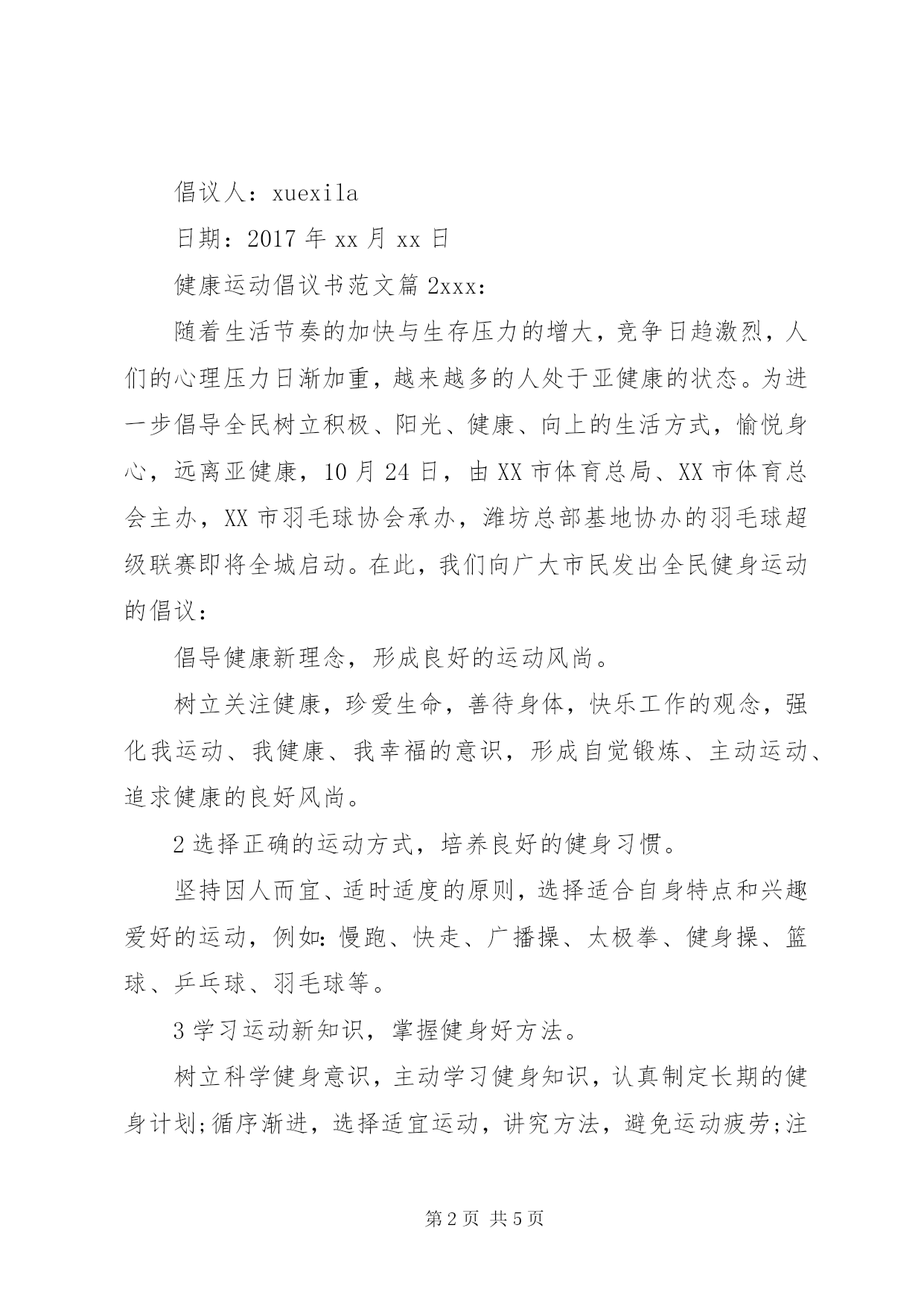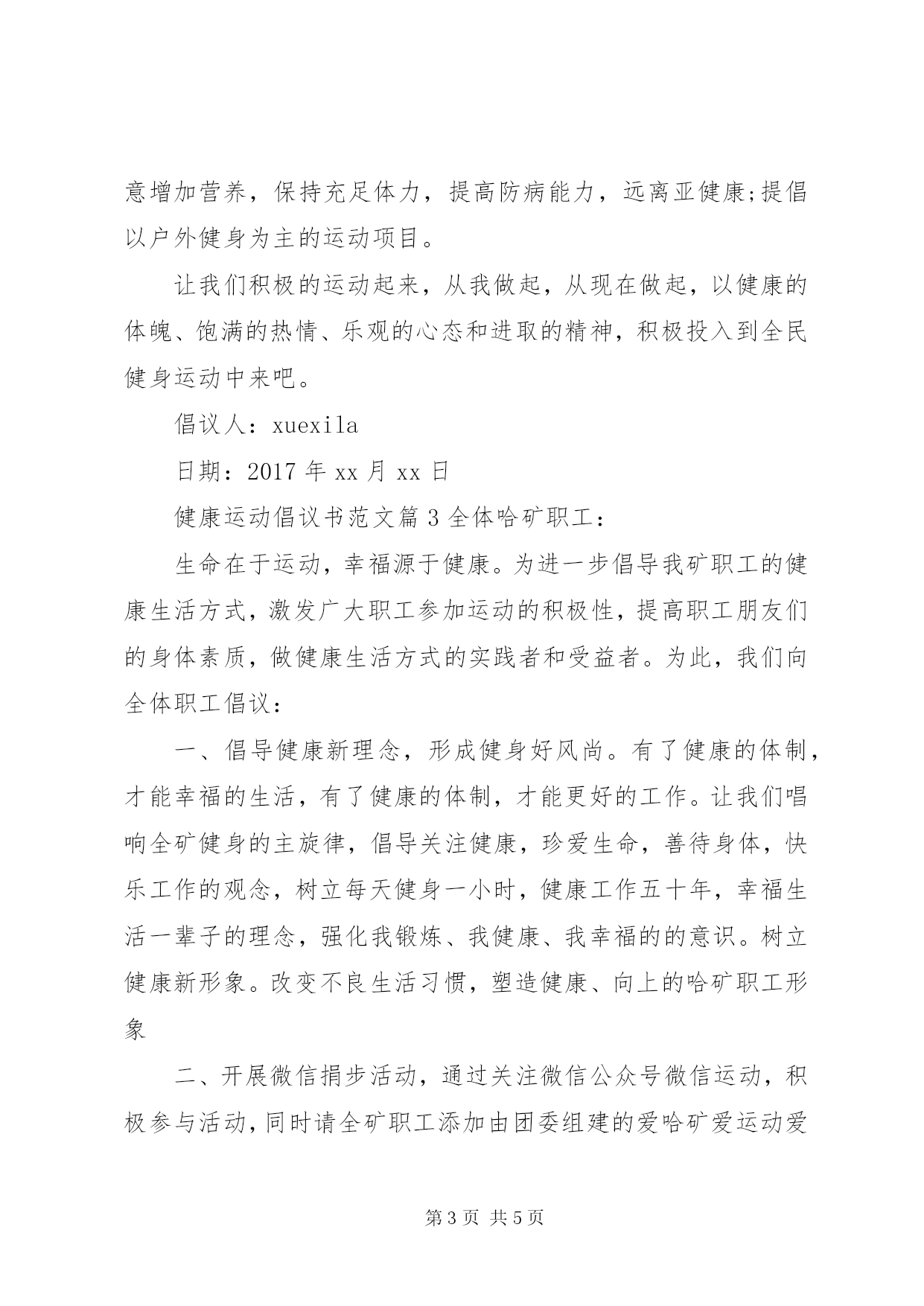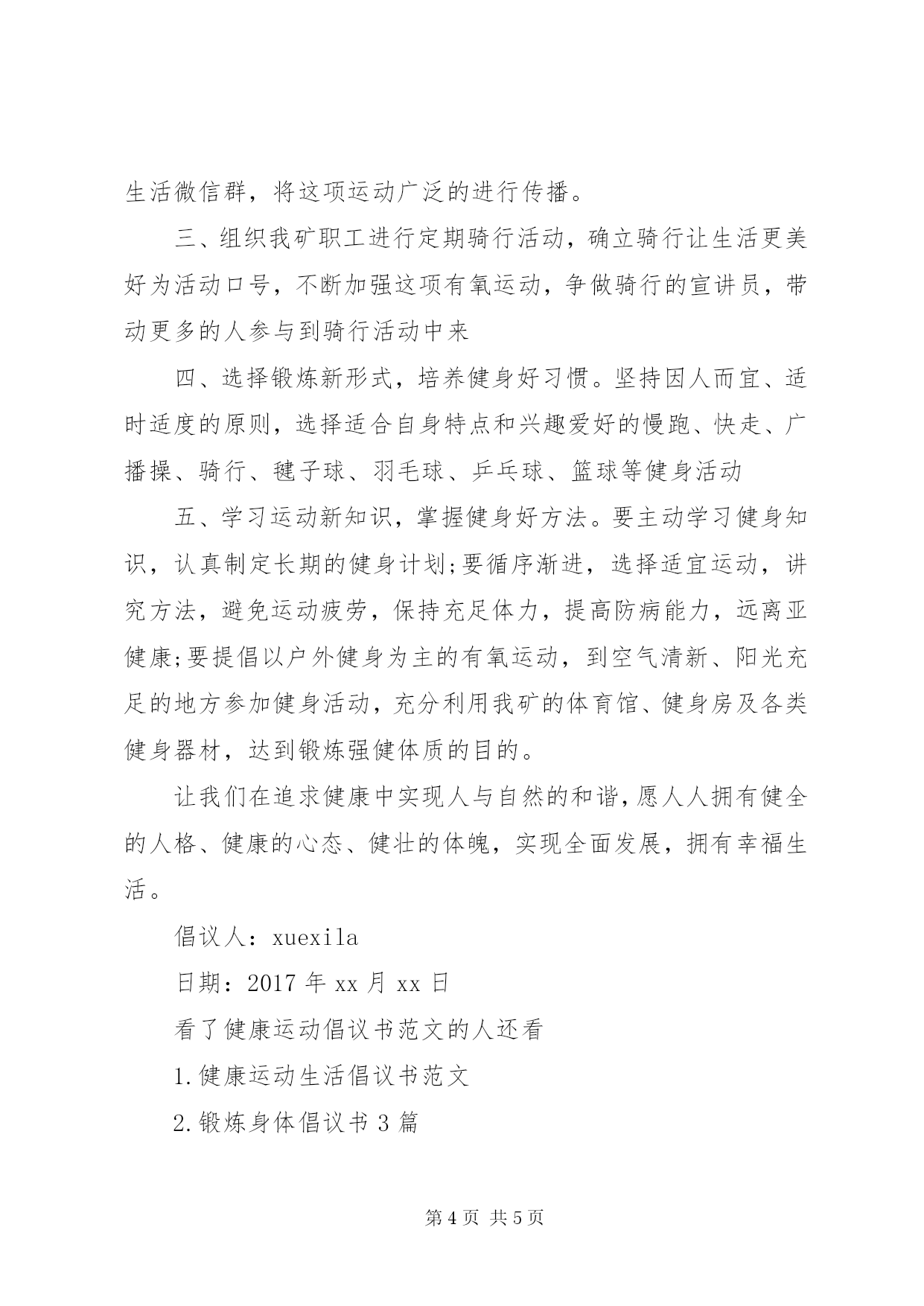 第PAGE\*Arabic\*MERGEFORMAT5页共NUMPAGES\*MERGEFORMAT5页健康运动倡议书范文健康运动倡议书范文篇1xxx:健康生活从运动开始,幼儿园阶段的孩子处于生长发育阶段,进入冬季后,孩子们活动的活动量减少,加上各种季节性的疾病,是抵抗力、免疫力较低的幼儿园的孩子,整个冬天都在吃药打针中度过,适宜的体育锻炼活动是提高孩子的免疫力、抵抗力的最佳方法。今年我们把一年一度的亲子运动会放在冬季展开,意在倡导家长孩子们,健康生活,从运动开始。11月为我园健康、运动月,锻炼孩子们健康的体魄,磨练孩子们坚强的意志力是我们最终目的,在这个冬天让我们和孩子们一起运动起来吧。这次活动目的如下:请家长们积极鼓励孩子参与,并在家多与孩子一起进行运动活动,我们一起为孩子们的健康成长加油。1.通过参加运动会,培养孩子积极进取、坚强勇敢的优良品质。2.。通过开展亲子运动会,加强家长与子女之间的交流,增加家长与子女之间的情感交流,增加孩子之间、家长之间、老师和学生、老师和家长之间的沟通机会。3.发展孩子动作的协调性和灵活性,促进身体全面发展。4.通过体育活动,培养孩子与父母或同伴共同克服困难夺取胜利的精神,培养孩子参加体育活动的兴趣,亲身体验活动的魅力。倡议人:xuexila日期:2017年xx月xx日健康运动倡议书范文篇2xxx:随着生活节奏的加快与生存压力的增大,竞争日趋激烈,人们的心理压力日渐加重,越来越多的人处于亚健康的状态。为进一步倡导全民树立积极、阳光、健康、向上的生活方式,愉悦身心,远离亚健康,10月24日,由XX市体育总局、XX市体育总会主办,XX市羽毛球协会承办,潍坊总部基地协办的羽毛球超级联赛即将全城启动。在此,我们向广大市民发出全民健身运动的倡议:倡导健康新理念,形成良好的运动风尚。树立关注健康,珍爱生命,善待身体,快乐工作的观念,强化我运动、我健康、我幸福的意识,形成自觉锻炼、主动运动、追求健康的良好风尚。2选择正确的运动方式,培养良好的健身习惯。坚持因人而宜、适时适度的原则,选择适合自身特点和兴趣爱好的运动,例如:慢跑、快走、广播操、太极拳、健身操、篮球、乒乓球、羽毛球等。3学习运动新知识,掌握健身好方法。树立科学健身意识,主动学习健身知识,认真制定长期的健身计划;循序渐进,选择适宜运动,讲究方法,避免运动疲劳;注意增加营养,保持充足体力,提高防病能力,远离亚健康;提倡以户外健身为主的运动项目。让我们积极的运动起来,从我做起,从现在做起,以健康的体魄、饱满的热情、乐观的心态和进取的精神,积极投入到全民健身运动中来吧。倡议人:xuexila日期:2017年xx月xx日健康运动倡议书范文篇3全体哈矿职工:生命在于运动,幸福源于健康。为进一步倡导我矿职工的健康生活方式,激发广大职工参加运动的积极性,提高职工朋友们的身体素质,做健康生活方式的实践者和受益者。为此,我们向全体职工倡议:一、倡导健康新理念,形成健身好风尚。有了健康的体制,才能幸福的生活,有了健康的体制,才能更好的工作。让我们唱响全矿健身的主旋律,倡导关注健康,珍爱生命,善待身体,快乐工作的观念,树立每天健身一小时,健康工作五十年,幸福生活一辈子的理念,强化我锻炼、我健康、我幸福的的意识。树立健康新形象。改变不良生活习惯,塑造健康、向上的哈矿职工形象二、开展微信捐步活动,通过关注微信公众号微信运动,积极参与活动,同时请全矿职工添加由团委组建的爱哈矿爱运动爱生活微信群,将这项运动广泛的进行传播。三、组织我矿职工进行定期骑行活动,确立骑行让生活更美好为活动口号,不断加强这项有氧运动,争做骑行的宣讲员,带动更多的人参与到骑行活动中来四、选择锻炼新形式,培养健身好习惯。坚持因人而宜、适时适度的原则,选择适合自身特点和兴趣爱好的慢跑、快走、广播操、骑行、毽子球、羽毛球、乒乓球、篮球等健身活动五、学习运动新知识,掌握健身好方法。要主动学习健身知识,认真制定长期的健身计划;要循序渐进,选择适宜运动,讲究方法,避免运动疲劳,保持充足体力,提高防病能力,远离亚健康;要提倡以户外健身为主的有氧运动,到空气清新、阳光充足的地方参加健身活动,充分利用我矿的体育馆、健身房及各类健身器材,达到锻炼强健体质的目的。让我们在追求健康中实现人与自然的和谐,愿人人拥有健全的人格、健康的心态、健壮的体魄,实现全面发展,拥有幸福生活。倡议人:xuexila日期:2017年xx月xx日看了健康运动倡议书范文的人还看1.健康运动生活倡议书范文2.锻炼身体倡议书3篇3.冬季健康锻炼倡议书4.阳光运动倡议书5.锻炼的倡议书3篇
