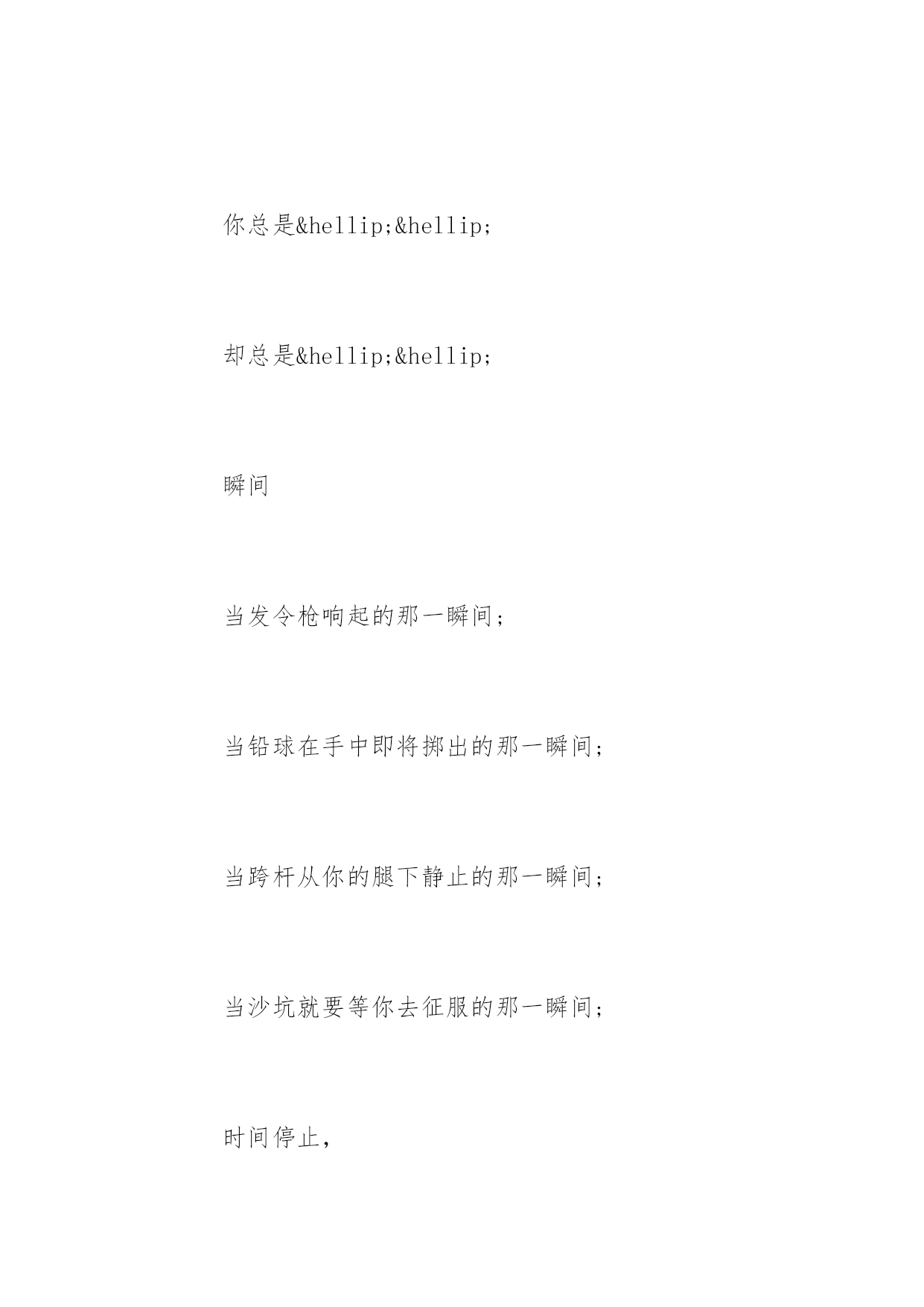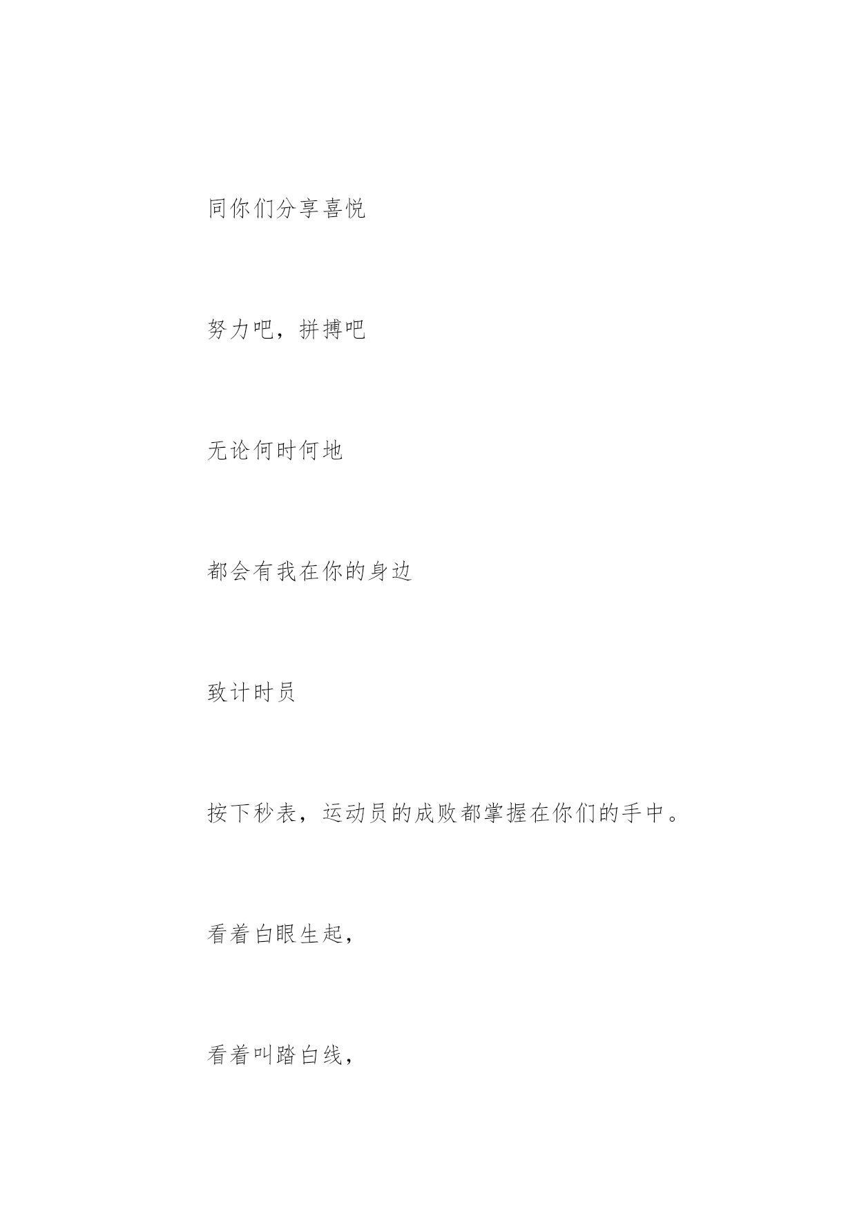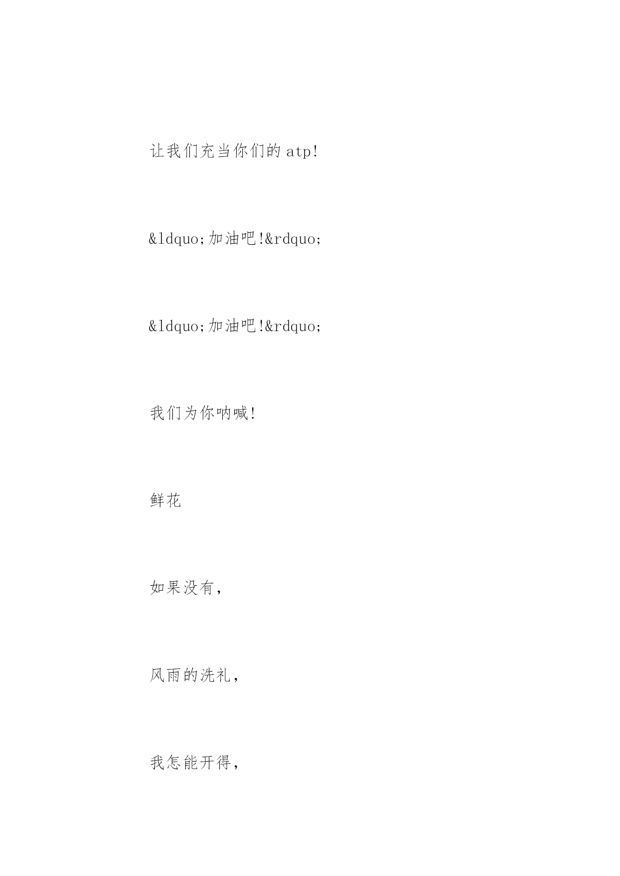 运动会加油稿致观众运动会加油稿致观众你总是,却总是——致服务员你总是递出那一杯杯饱含热情与动力的甘露,却总是忘记自己的嘴唇已爬上了血口。你总是为运动员拭去那滴滴为荣誉而战的汗水,却总是忘记自己的t恤已被汗水湿透。你总是跑前跑后为运动员服务,却总是忘记吃那治病的药。你总是……却总是……瞬间当发令枪响起的那一瞬间;当铅球在手中即将掷出的那一瞬间;当跨杆从你的腿下静止的那一瞬间;当沙坑就要等你去征服的那一瞬间;时间停止,空气凝固,每一个人的嘴里、心里,都在竭力呐喊。这呐喊,成为这瞬间,最激动人心的呼声,最振奋人心的感动。我只愿——致观看者我只愿做一片落叶去点缀金黄的秋天我只愿做一颗恒星去装饰耀眼的星河我只愿做一棵小草去充实五彩的世界我只愿坐在场边同你们分享喜悦努力吧,拼搏吧无论何时何地都会有我在你的身边致计时员按下秒表,运动员的成败都掌握在你们的手中。看着白眼生起,看着叫踏白线,专注在每时每刻,纪录辉煌瞬间。喊起来喊起来让我们为健儿们喝彩!喊起来,让我们给运动员们以再拼搏的力量!喊起来,让我们充当你们的atp!“加油吧!”“加油吧!”我们为你呐喊!鲜花如果没有,风雨的洗礼,我怎能开得,这般的娇艳。所以每当我接受了,一次洗礼,只有欢笑,没有叹息,只要我站在赛场上,就不会把风雨忘记。沉默笔尖流露的只是词句,即使在华丽,也无法表达此刻我们的心情。沉默无言,沉默是金,沉默中,充满了胜利者的凯歌,充满了胜利者的喜悦,沉默……