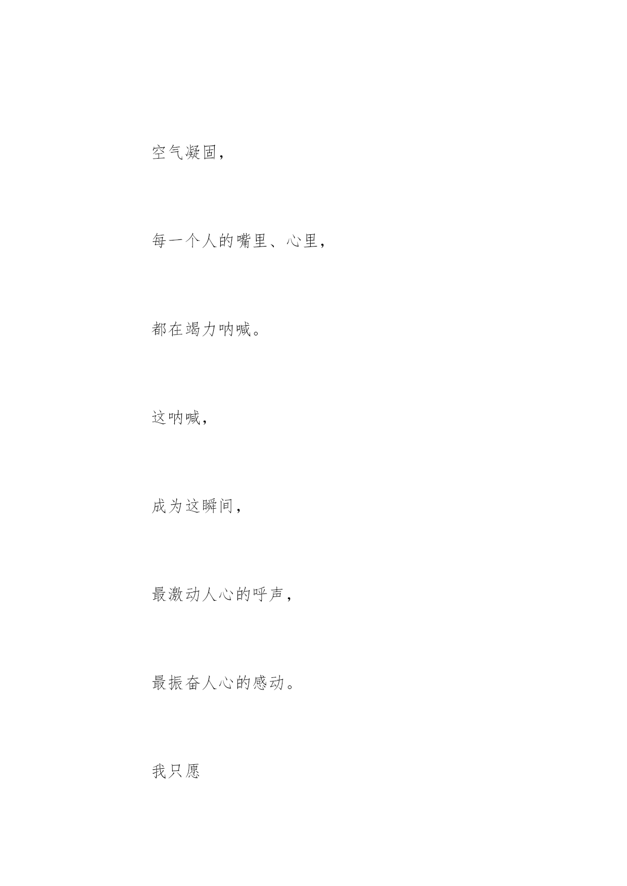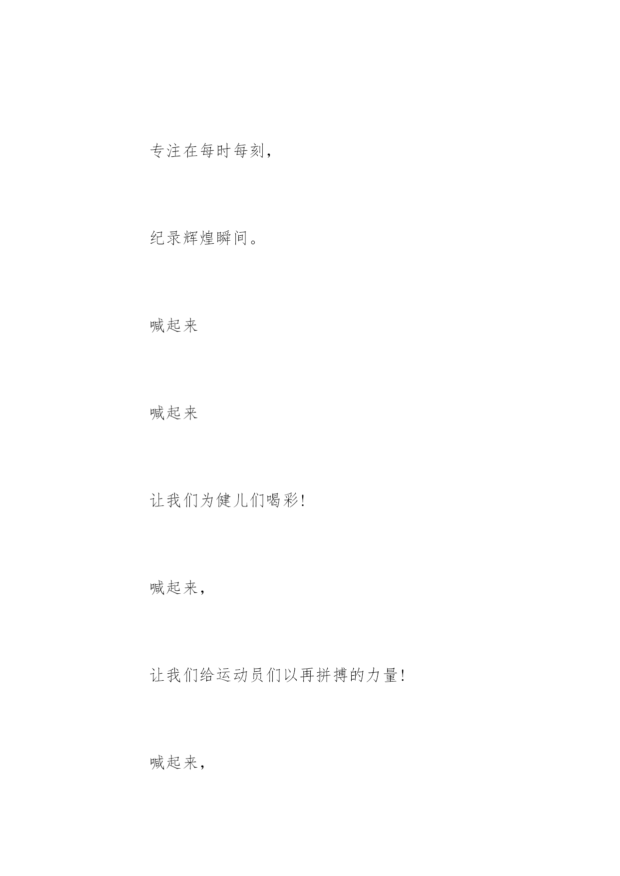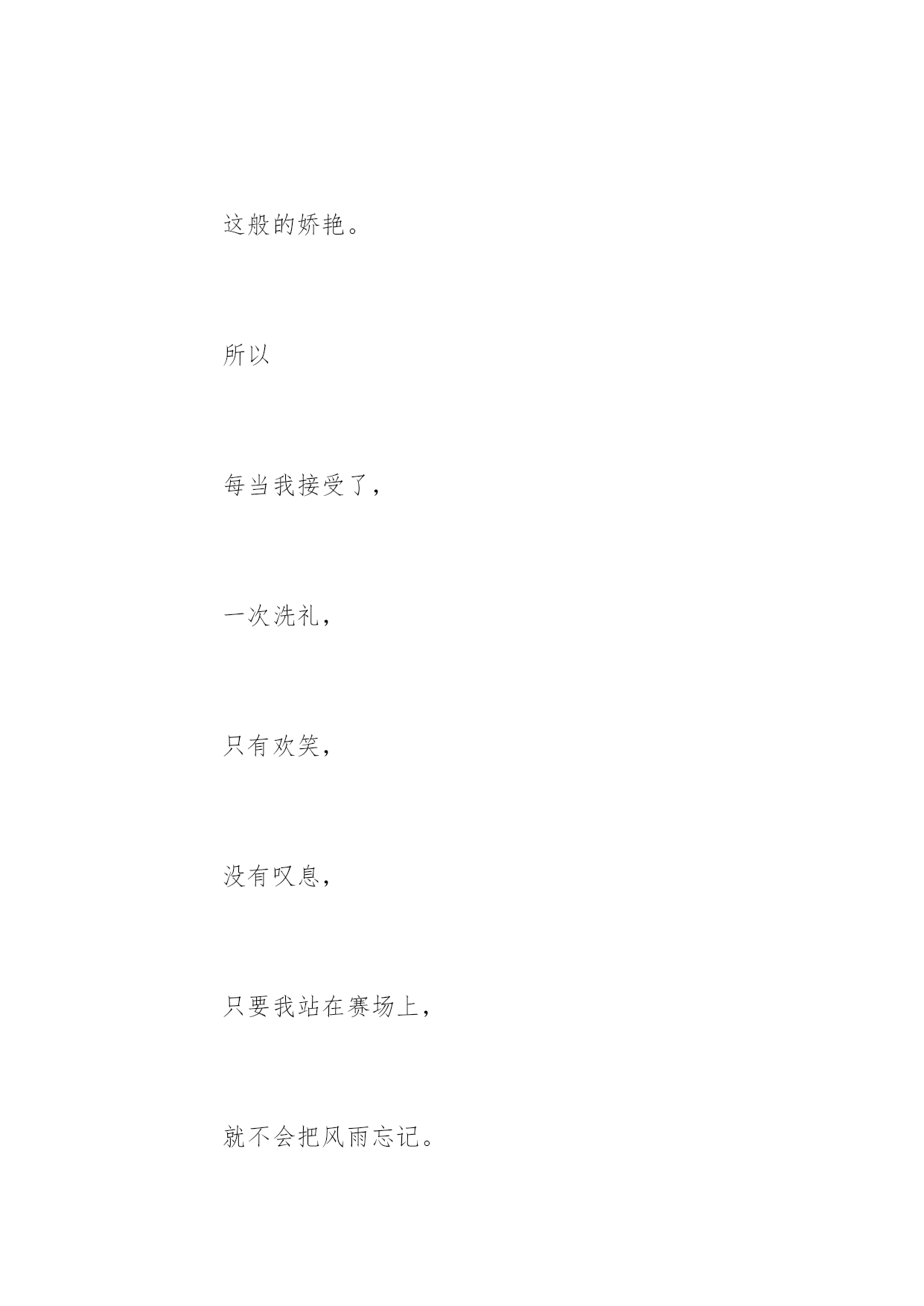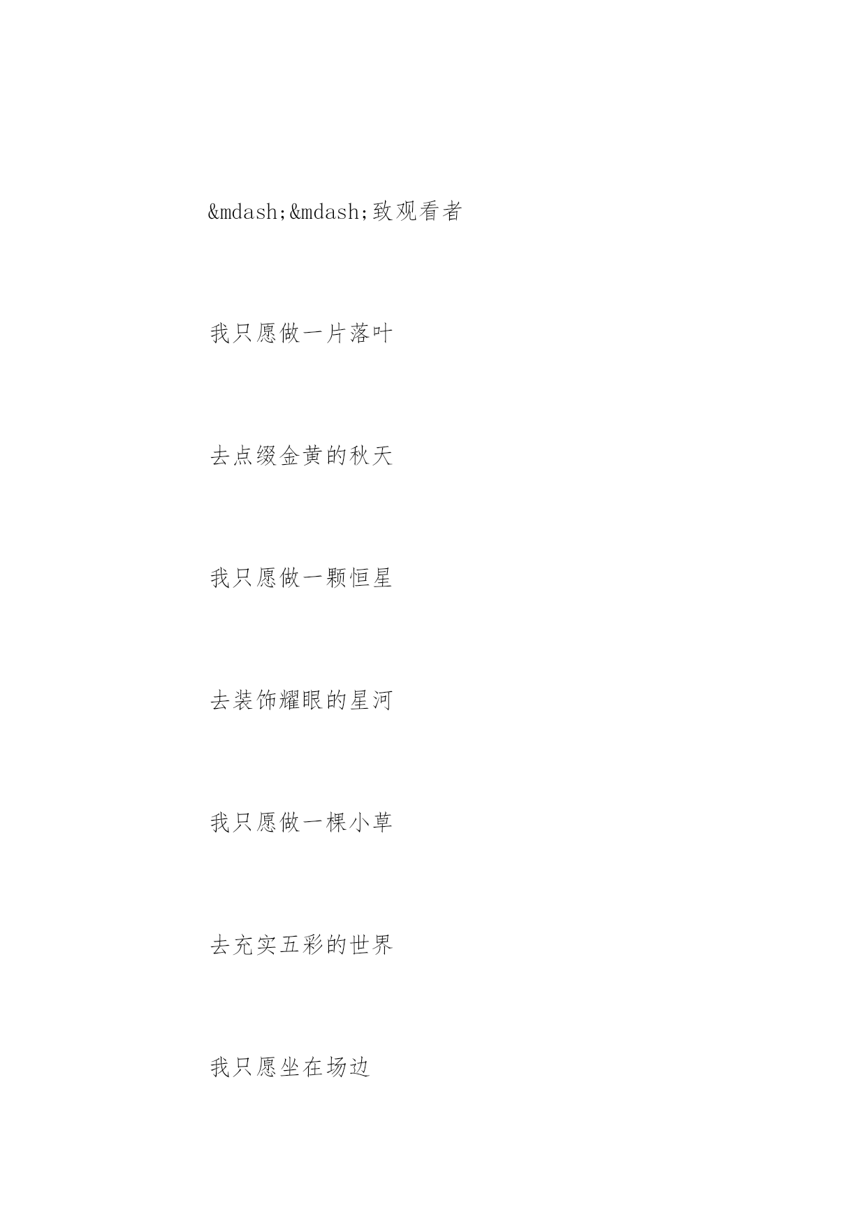 运动会加油稿致观众运动会加油稿致观众你总是,却总是——致服务员你总是递出那一杯杯饱含热情与动力的甘露,却总是忘记自己的嘴唇已爬上了血口。你总是为运动员拭去那滴滴为荣誉而战的汗水,却总是忘记自己的t恤已被汗水湿透。你总是跑前跑后为运动员服务,却总是忘记吃那治病的药。你总是……却总是……瞬间当发令枪响起的那一瞬间;当铅球在手中即将掷出的那一瞬间;当跨杆从你的腿下静止的那一瞬间;当沙坑就要等你去征服的那一瞬间;时间停止,空气凝固,每一个人的嘴里、心里,都在竭力呐喊。这呐喊,成为这瞬间,最激动人心的呼声,最振奋人心的感动。我只愿——致观看者我只愿做一片落叶去点缀金黄的秋天我只愿做一颗恒星去装饰耀眼的星河我只愿做一棵小草去充实五彩的世界我只愿坐在场边同你们分享喜悦努力吧,拼搏吧无论何时何地都会有我在你的身边致计时员按下秒表,运动员的成败都掌握在你们的手中。看着白眼生起,看着叫踏白线,专注在每时每刻,纪录辉煌瞬间。喊起来喊起来让我们为健儿们喝彩!喊起来,让我们给运动员们以再拼搏的力量!喊起来,让我们充当你们的atp!“加油吧!”“加油吧!”我们为你呐喊!鲜花如果没有,风雨的洗礼,我怎能开得,这般的娇艳。所以每当我接受了,一次洗礼,只有欢笑,没有叹息,只要我站在赛场上,就不会把风雨忘记。沉默笔尖流露的只是词句,即使在华丽,也无法表达此刻我们的心情。沉默无言,沉默是金,沉默中,充满了胜利者的凯歌,充满了胜利者的喜悦,沉默……