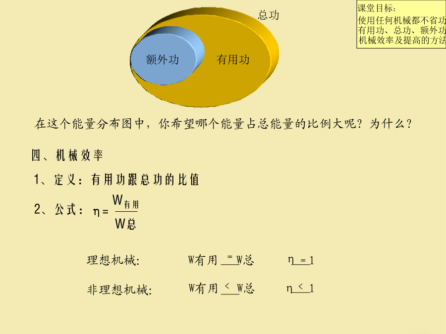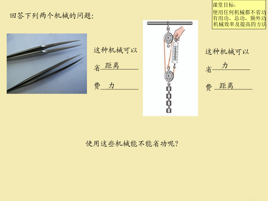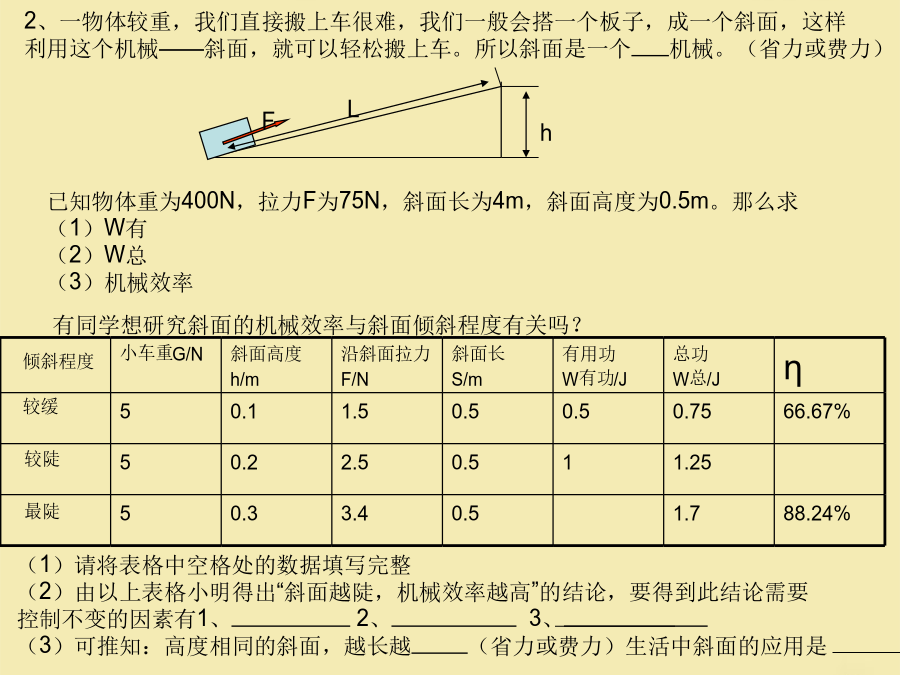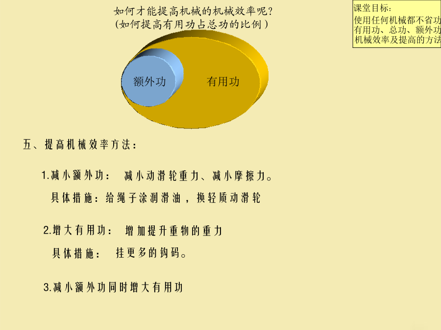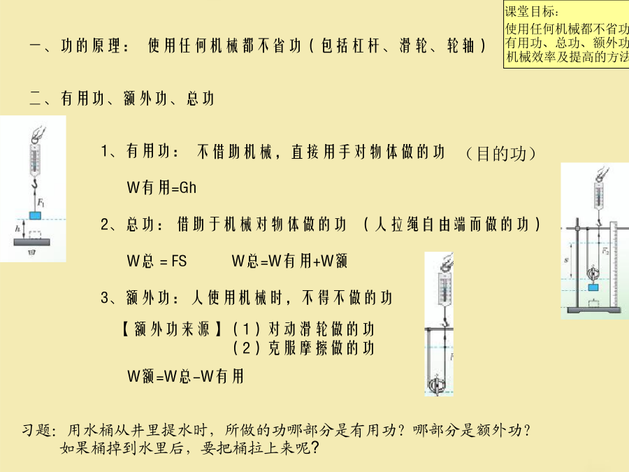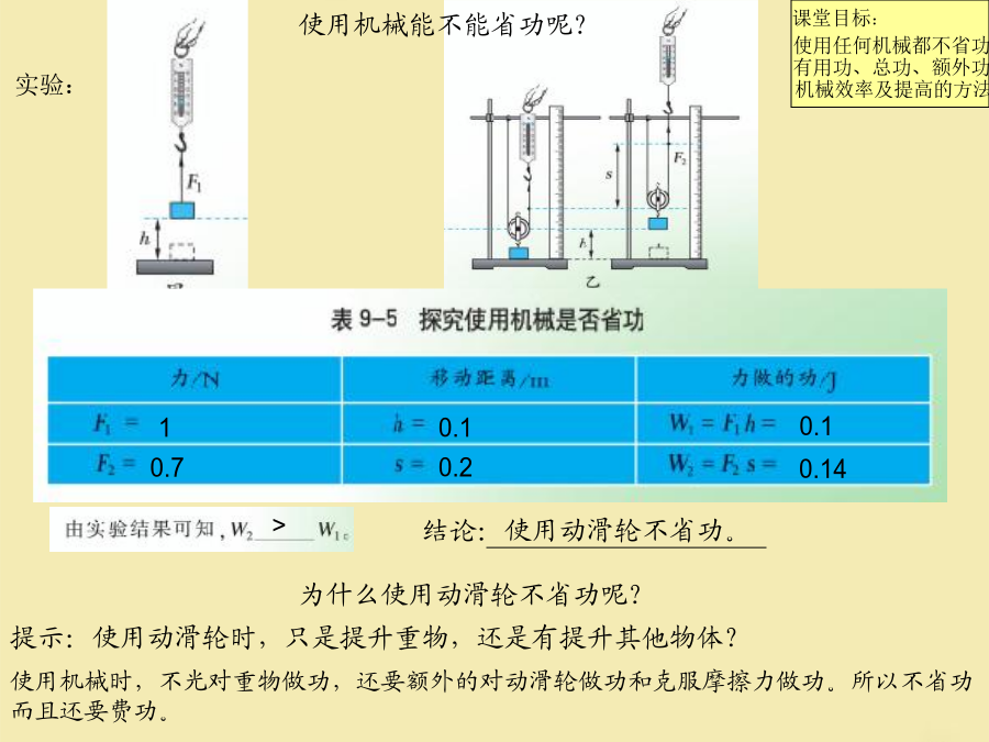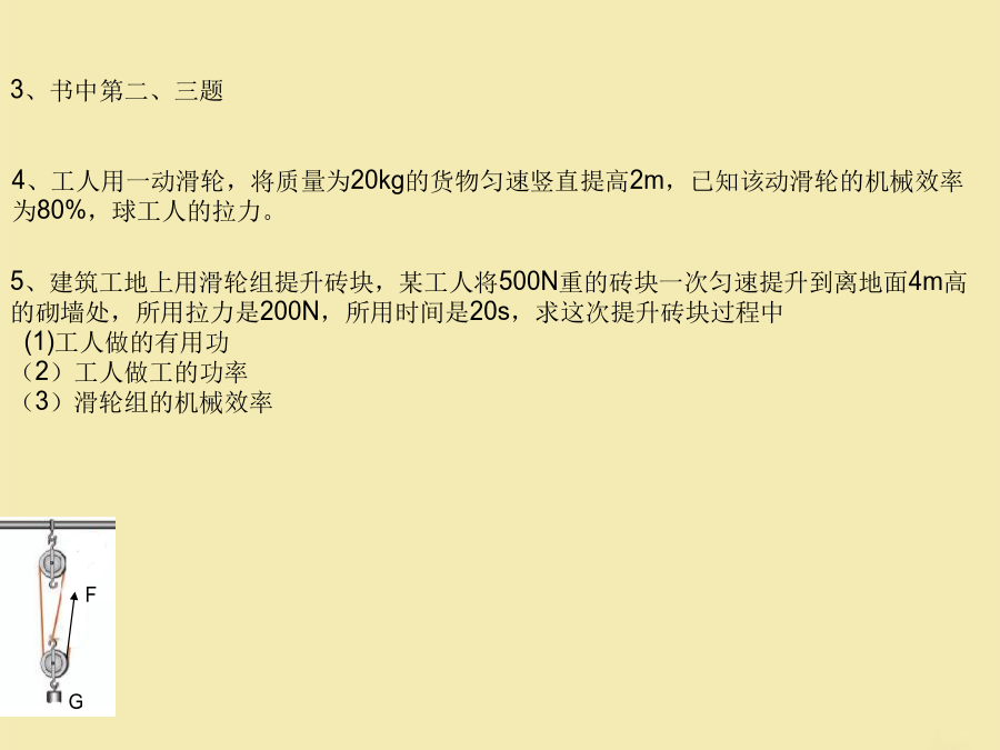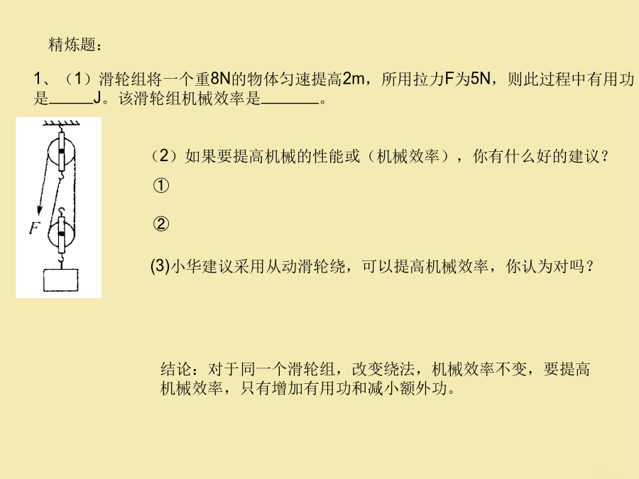 第五节——探究使用机械能省功吗?为什么使用动滑轮不省功呢?一、功的原理:五、提高机械效率方法:精炼题:2、一物体较重,我们直接搬上车很难,我们一般会搭一个板子,成一个斜面,这样利用这个机械——斜面,就可以轻松搬上车。所以斜面是一个机械。(省力或费力)4、工人用一动滑轮,将质量为20kg的货物匀速竖直提高2m,已知该动滑轮的机械效率为80%,球工人的拉力。