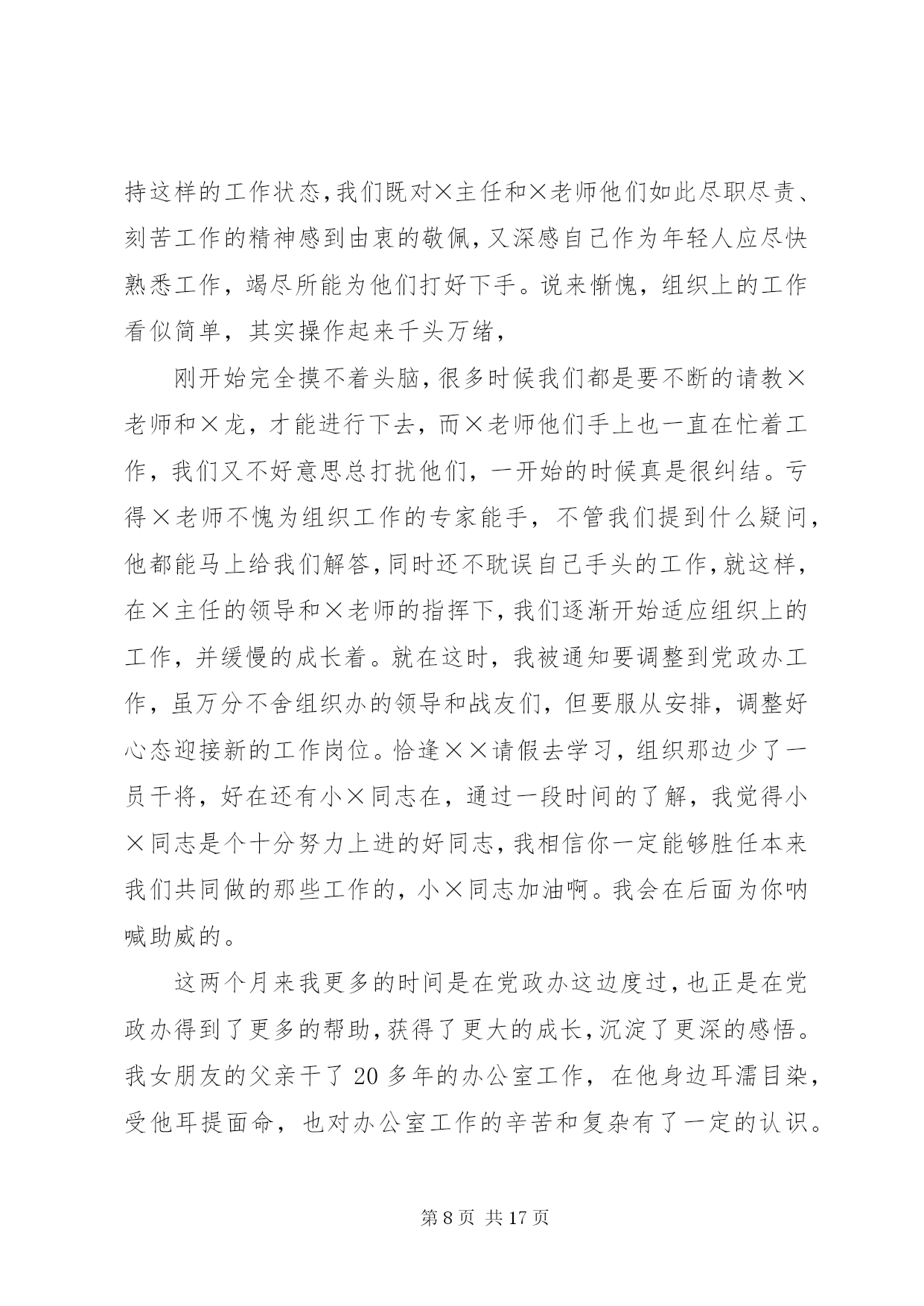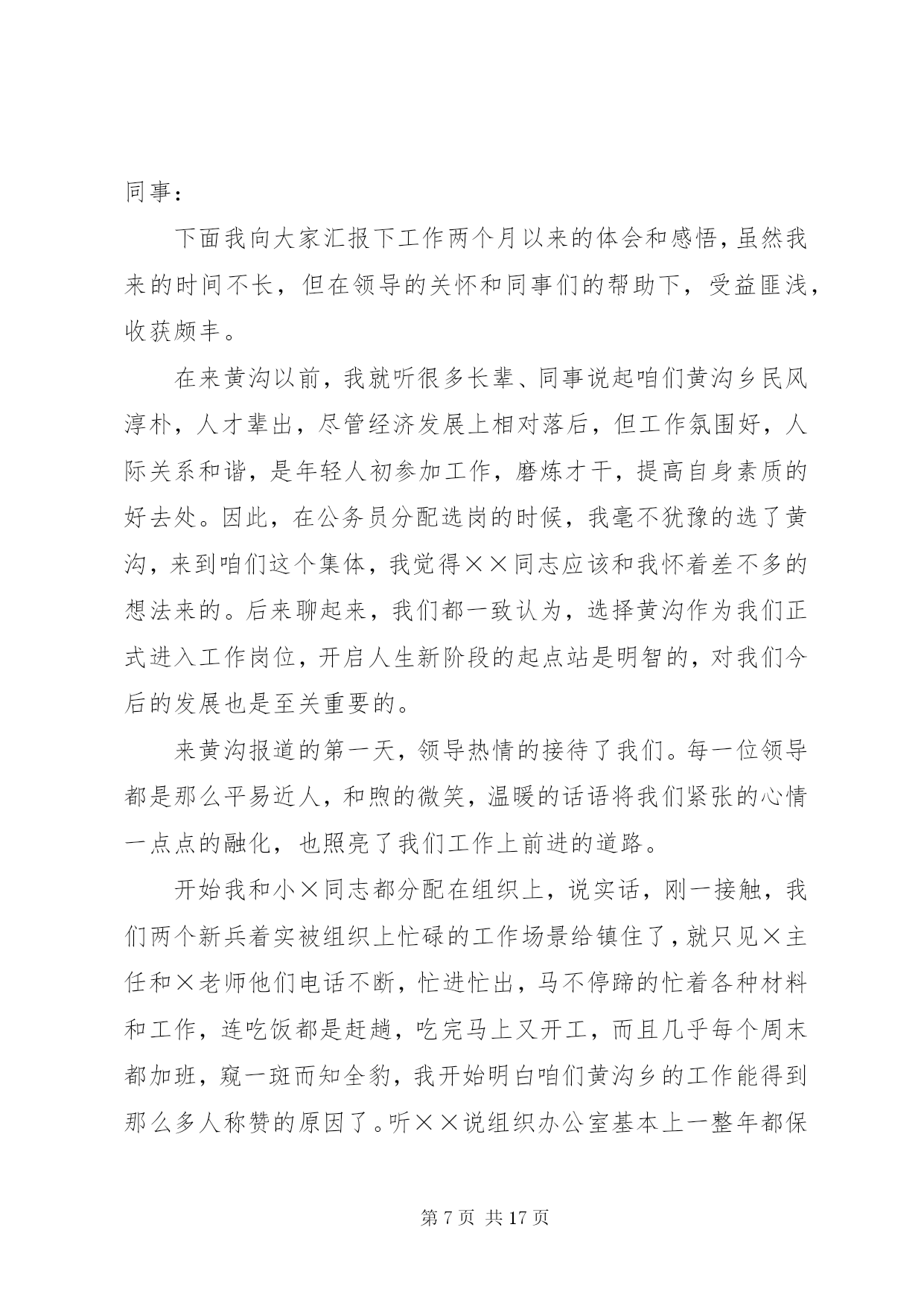 第PAGE\*Arabic\*MERGEFORMAT17页共NUMPAGES\*MERGEFORMAT17页公务员工作体会第1篇第2篇第3篇第4篇第5篇更多顶部目录第一篇:初任公务员工作体会第二篇:公务员工作心得体会第三篇:新进公务员见习期工作体会第四篇:监狱公务员工作心得体会第五篇:2019公务员工作心得体会总结更多相关范文正文第一篇:初任公务员工作体会初任公务员工作体会夏天,扑面而来的热浪,于我代表着一种收获的热度。就在xxxx年的八月盛夏,我收获了我曾经为之努力奋斗过的公务员梦想,走进了属于我的“梦工厂”--xx市xx区国家税务局,成为了一名光荣的公务员。如今,我正式的工作时间才短短数年,在这不长的时间里,我每天都在用心感受着身边的一切,也被身边的一切所感动着。也许就是一次亲切的交谈,一声热情的招呼,一句体己的问候;也许就是在忙碌的时候不知是谁倒上的一杯热水,在不知所措的时候不知是谁站在身边四两拨千斤的解围,在手忙脚乱的时候不知是谁轻声说的一句“慢慢来”;也许,还有好多,就是这些不经意间的也许,让我感激、感动、感慨万千。当初,选择这份职业或许是偶然,但当我第一天穿上制服,拿着自己的工作证反复看了好久的时候,当我在独立办理了一次复杂的业务听到纳税人的感谢而小有成就感的时候,我知道,任凭弱水三千,我只取这一瓢饮。作为我,一名国税新青年,如何立足自身,发挥优势,树立正确的价值观,更好地服务纳税人,如何为我们的上城国税更好地实现新发展,尽自己的一份责,出自己的一份力,这些值得思考。百尺竿头更进一步,国税之路,我们用青春起航。国税之路,需要的是一种力学笃行的意志。同事们熟练的业务技能操作水平,老练的特殊情况处理方式,总让我羡慕又焦急。好在压力可以转化为动力,专业技能上的欠缺随之而来的是强烈的紧迫感,这也刺激了我“初生牛犊不怕虎”的劲头。年轻,应该学习,愿意学习,擅长学习;年轻,更需要实践,勇于实践、乐于实践。从国税相关的政策法规到国税业务的操作流程,从国税服务理念到国税服务技能,作为年轻人,我们都应该静心去学、用心去想、诚心去做。尤其是在“信息化办税”成为主流管税、办税方式的今天,于大家都是新的起点。所以,我们坚持工作当先,学习摆中间,自我放松要靠边。国税之路,需要的是一种低调绽放的姿态。当我们佩上税徽的那一刻起,我们要忘却自己是父母的掌上珠、心头肉;要忘却自己是学校里的佼佼者、优等生;忘却所谓的“天之骄子”。要学会将手心朝下--常常给予,而不是一味的获取;要学会将目光朝下--活在当下,而不是空想的未来。我们要从点滴地为纳税人服务中获得进步,在不断地提高纳税人满意度中获得成长。国税之路,需要的是一种义不容辞的责任。最美司机吴斌,以他高度的责任感诠释了什么是生命的价值。2019年5月29日,他驾驶客车从无锡返杭途中,突然被一块从空中飞落的铁块砸中了他的腹部和手臂,导致其三根肋骨被撞断,肝脏被击碎。40秒,于一个普通人可能就是一个懒腰的时间,但是对于我们的英雄,40秒足以让他挽救一车人的生命。吴斌忍住剧烈疼痛,用这40秒完成了一系列精准的停车动作,留下了笔直的刹车印,也是他生命的痕迹。一个普通司机用这短短的时间,完美地诠释了责任与担当。司马迁曾说:“人固有一死,或重于泰山,或轻于鸿毛,用之所趋异也。”生命属于每个人有且仅有一次。吴斌为了全车人的安全而牺牲在自己的工作岗位上,我们不仅为他不畏艰险、舍己救人的英雄气概而赞叹,更为他如此完美地体现了自己的职业素养而折服。作为国税系统的一份子,我们也要向吴斌同志学习,树立起强烈的工作责任感。对待平时的工作不能是“做一天和尚撞一天钟”的敷衍,即使是星星之火,也要努力发光发热;即使是点点水滴,也要努力浸润一方。办理好每一个业务,服务好每一位纳税人,完成好每一次任务,不可轻视自身的价值,不可小觑自己的责任,不可懈怠分内的工作,服务所在单位取得新的成绩,我们责无旁贷;服务国税事业获得更好地发展,我们匹夫有责。我们,愿以青春盟不变之誓,用青春担应有之责,服务国税工作迎接新挑战,开创新局面,创造新辉煌。在路上,我们激情满怀;在路上,我们竿头直上;在路上,我们矢志不渝。第二篇:公务员工作心得体会在实践工作中锻炼进取心得体会2019年3月份,我借调到县委组织部工作,主要参与学习实践科学发展观活动的相关工作,学习实践活动结束后,我主要负责组织科档案管理、大学生村官管理及一些日常工作。经过一年半的工作和磨炼,我觉得成长了不少,锻炼了不少。一、以学为主,学干结合到组织部工作后,我体会到组织工作包罗万象、错综复杂,需要有良好的心态和素养,需要实干的精神和极强的责任感才能逐步适应,为此我本着缺什么补什么,用什么学什么的原则,去努力做好每一项工作。一是向书本学习。大家整天忙忙碌碌地在做些什么。太