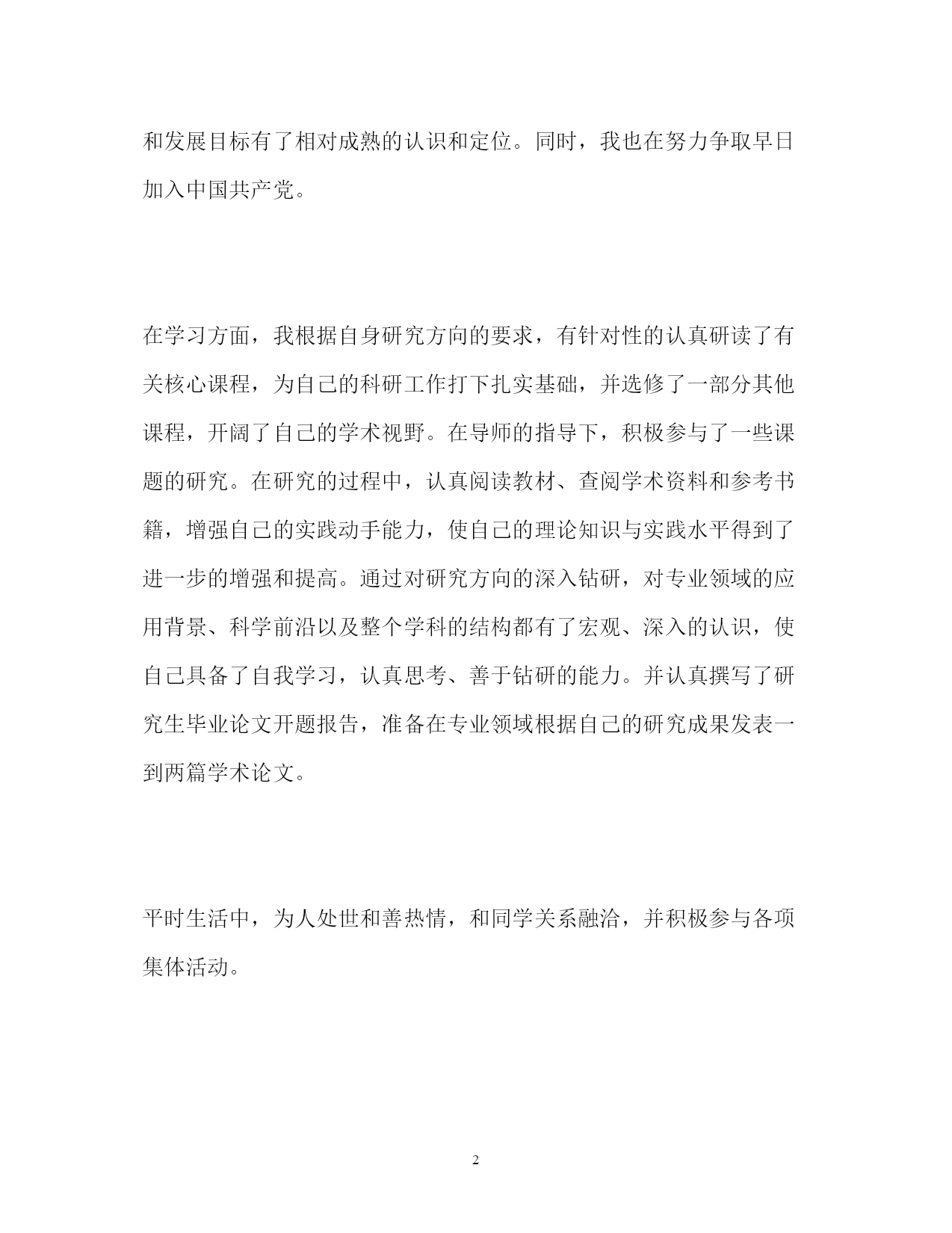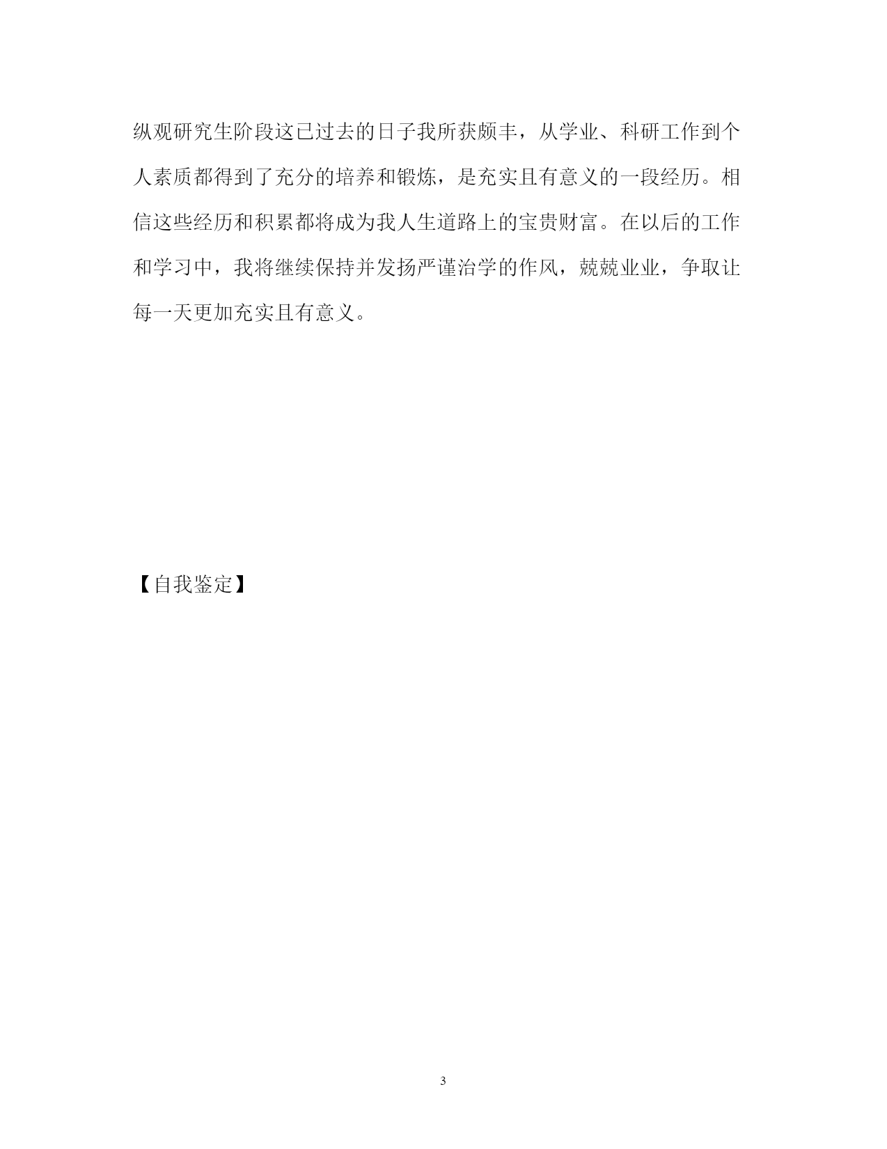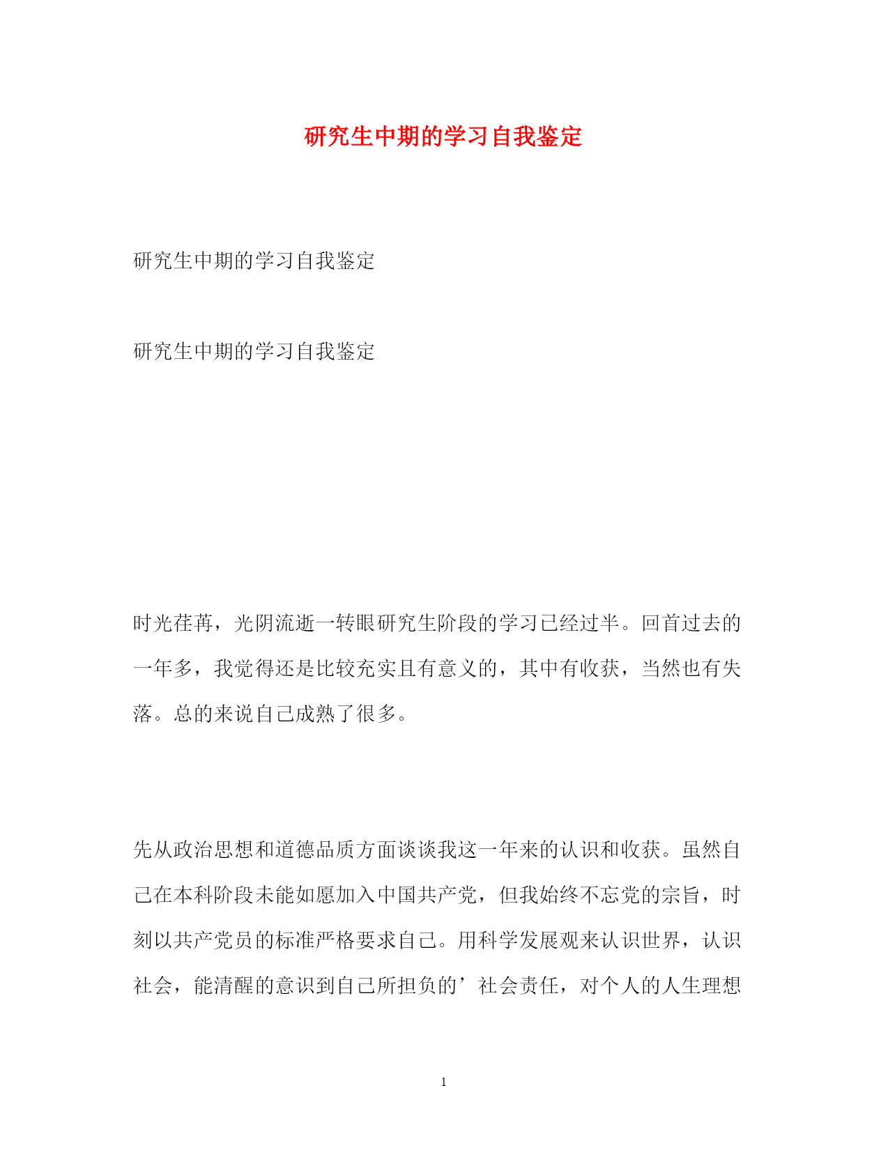 此资料由网络收集而来,如有侵权请告知上传者立即删除。资料共分享,我们负责传递知识。PAGEPAGE3研究生中期的学习自我鉴定研究生中期的学习自我鉴定研究生中期的学习自我鉴定时光荏苒,光阴流逝一转眼研究生阶段的学习已经过半。回首过去的一年多,我觉得还是比较充实且有意义的,其中有收获,当然也有失落。总的来说自己成熟了很多。先从政治思想和道德品质方面谈谈我这一年来的认识和收获。虽然自己在本科阶段未能如愿加入中国共产党,但我始终不忘党的宗旨,时刻以共产党员的标准严格要求自己。用科学发展观来认识世界,认识社会,能清醒的意识到自己所担负的’社会责任,对个人的人生理想和发展目标有了相对成熟的认识和定位。同时,我也在努力争取早日加入中国共产党。在学习方面,我根据自身研究方向的要求,有针对性的认真研读了有关核心课程,为自己的科研工作打下扎实基础,并选修了一部分其他课程,开阔了自己的学术视野。在导师的指导下,积极参与了一些课题的研究。在研究的过程中,认真阅读教材、查阅学术资料和参考书籍,增强自己的实践动手能力,使自己的理论知识与实践水平得到了进一步的增强和提高。通过对研究方向的深入钻研,对专业领域的应用背景、科学前沿以及整个学科的结构都有了宏观、深入的认识,使自己具备了自我学习,认真思考、善于钻研的能力。并认真撰写了研究生毕业论文开题报告,准备在专业领域根据自己的研究成果发表一到两篇学术论文。平时生活中,为人处世和善热情,和同学关系融洽,并积极参与各项集体活动。纵观研究生阶段这已过去的日子我所获颇丰,从学业、科研工作到个人素质都得到了充分的培养和锻炼,是充实且有意义的一段经历。相信这些经历和积累都将成为我人生道路上的宝贵财富。在以后的工作和学习中,我将继续保持并发扬严谨治学的作风,兢兢业业,争取让每一天更加充实且有意义。【自我鉴定】