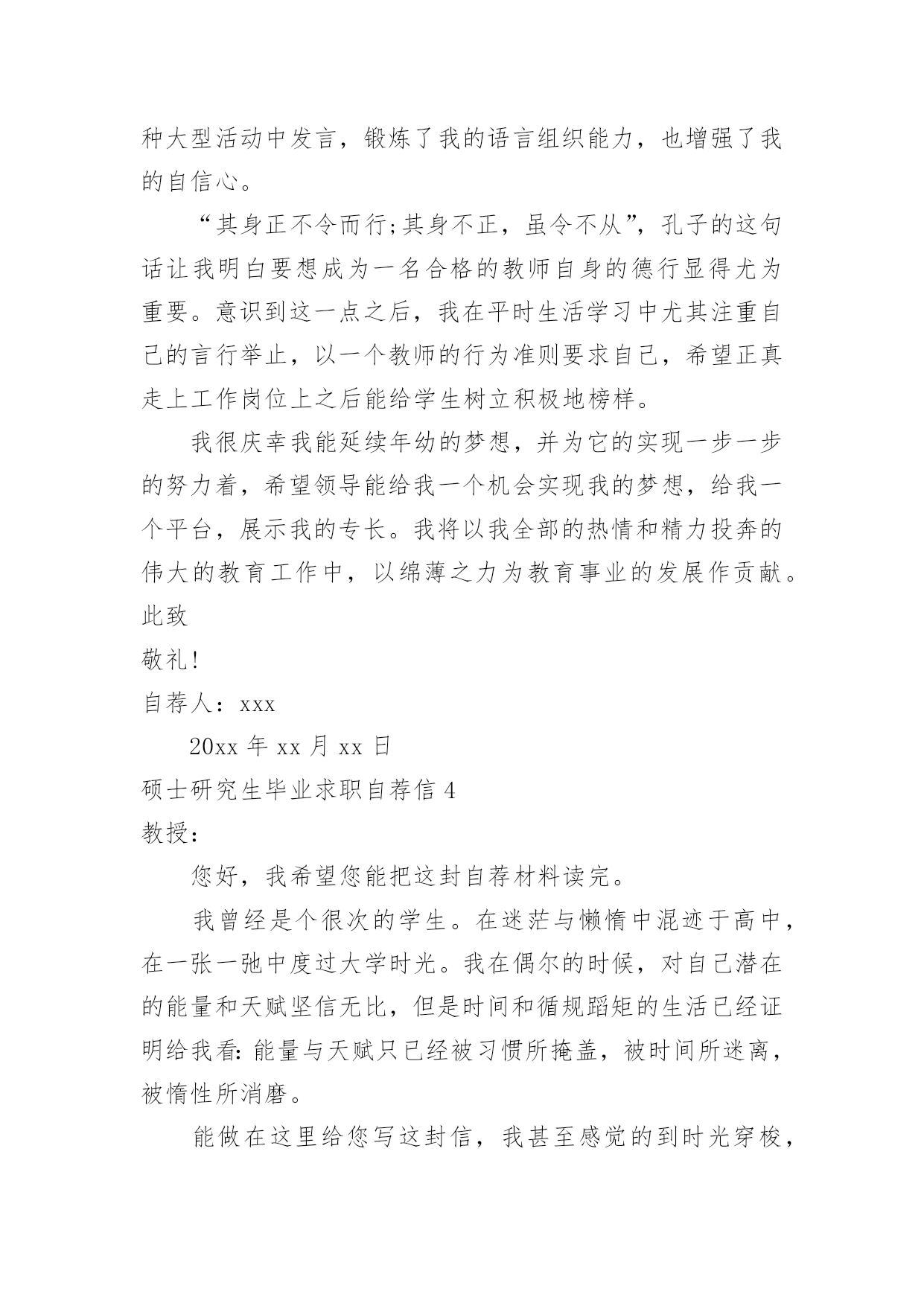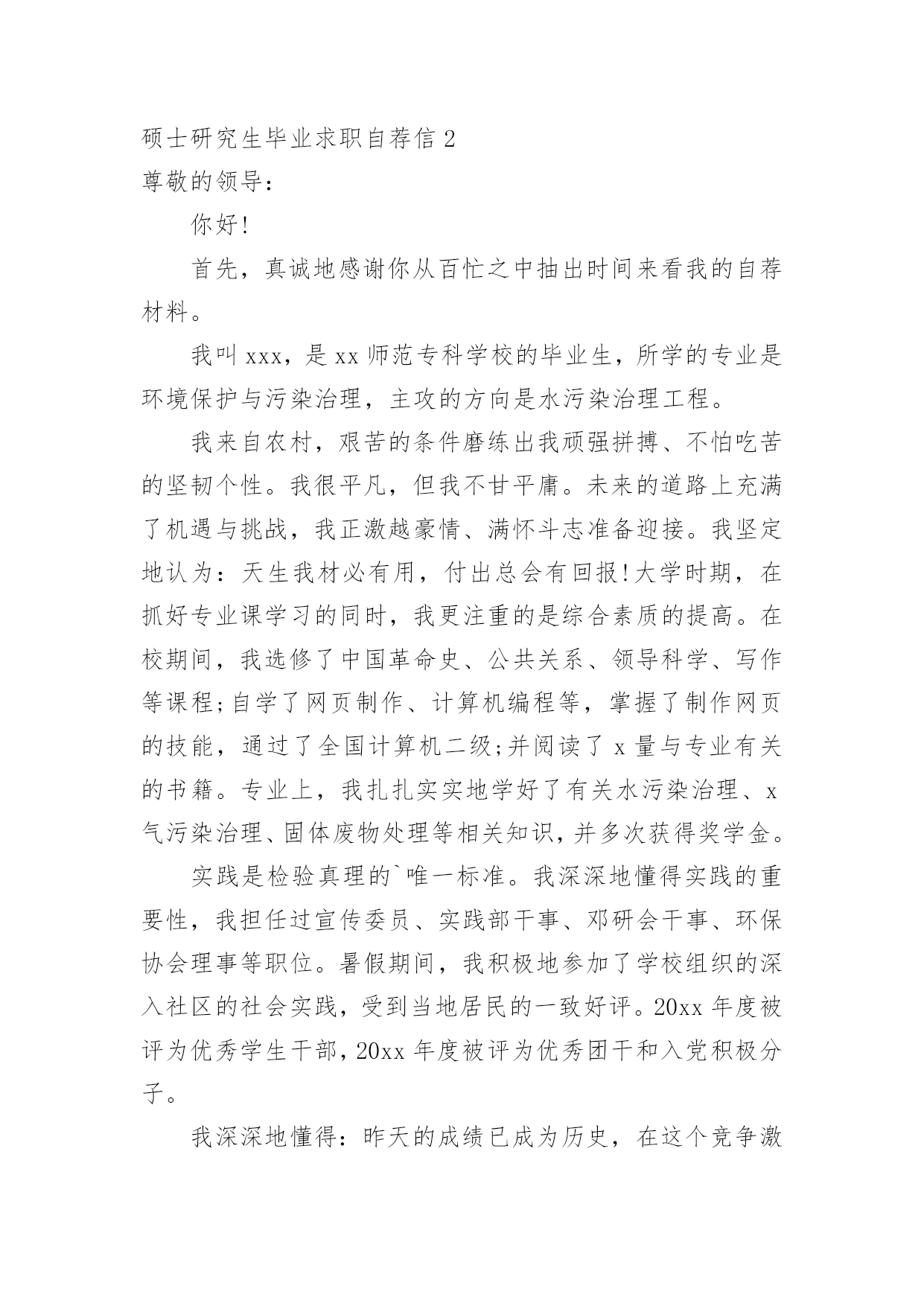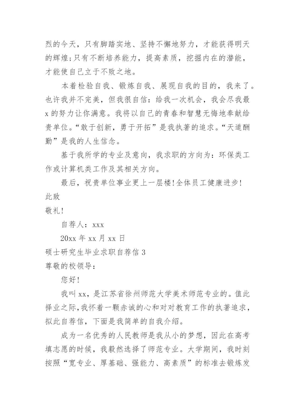 硕士研究生毕业求职自荐信硕士研究生毕业求职自荐信我们眼下的社会,自荐信的使用范围越来越大,我们在写自荐信的时候可以注意一些写作要诀。你还在为写自荐信而苦恼吗?下面是小编帮大家整理的硕士研究生毕业求职自荐信,希望能够帮助到大家。硕士研究生毕业求职自荐信1尊敬的校领导:您好!工作辛苦了!首先向您致以最诚挚的谢意,感谢您在百忙之中翻阅我的自荐材料。我是西北农林科技大学植物保护学院xx届农药学专业的应届硕士毕业生李杰。素闻贵校任人唯贤,宽松的工作环境、和谐的人际关系和温馨的.工作氛围令我神往。所以,怀着一颗激动的心和满腔热情,我向您走近!我的信心来自多年学习和生活的积淀:良好的品格作风学习上认真刻苦、勤奋好学,生活上乐观、待人热情、性格开朗的我,有着诚恳严谨求实、踏实肯干、吃苦耐劳的工作作风和较强的团队协作精神。自荐人:xxx20xx年xx月xx日硕士研究生毕业求职自荐信2尊敬的领导:你好!首先,真诚地感谢你从百忙之中抽出时间来看我的自荐材料。我叫xxx,是xx师范专科学校的毕业生,所学的专业是环境保护与污染治理,主攻的方向是水污染治理工程。我来自农村,艰苦的条件磨练出我顽强拼搏、不怕吃苦的坚韧个性。我很平凡,但我不甘平庸。未来的道路上充满了机遇与挑战,我正激越豪情、满怀斗志准备迎接。我坚定地认为:天生我材必有用,付出总会有回报!大学时期,在抓好专业课学习的同时,我更注重的是综合素质的提高。在校期间,我选修了中国革命史、公共关系、领导科学、写作等课程;自学了网页制作、计算机编程等,掌握了制作网页的技能,通过了全国计算机二级;并阅读了x量与专业有关的书籍。专业上,我扎扎实实地学好了有关水污染治理、x气污染治理、固体废物处理等相关知识,并多次获得奖学金。实践是检验真理的`唯一标准。我深深地懂得实践的重要性,我担任过宣传委员、实践部干事、邓研会干事、环保协会理事等职位。暑假期间,我积极地参加了学校组织的深入社区的社会实践,受到当地居民的一致好评。20xx年度被评为优秀学生干部,20xx年度被评为优秀团干和入党积极分子。我深深地懂得:昨天的成绩已成为历史,在这个竞争激烈的今天,只有脚踏实地、坚持不懈地努力,才能获得明天的辉煌;只有不断培养能力,提高素质,挖掘内在的潜能,才能使自己立于不败之地。本着检验自我、锻炼自我、展现自我的目的,我来了。也许我并不完美,但我很自信:给我一次机会,我会尽我最x的努力让你满意。我将以自己的青春和智慧无悔地奉献给贵单位。“敢于创新,勇于开拓”是我执著的追求。“天道酬勤”是我的人生信念。基于我所学的专业及意向,我求职的方向为:环保类工作或计算机类工作及其相关方向。最后,祝贵单位事业更上一层楼!全体员工健康进步!此致敬礼!自荐人:xxx20xx年xx月xx日硕士研究生毕业求职自荐信3尊敬的校领导:您好!我叫xx,是江苏省徐州师范大学美术师范专业的。值此择业之际,我怀着一颗赤诚的心和对对教育工作的执著追求,拟此自荐信,下面是我简单的自我介绍。成为一名优秀的人民教师是我从小的梦想,因此在高考填志愿的时候,我毅然选择了师范专业。大学期间,我时刻按照“宽专业、厚基础、强能力、高素质”的标准去锻炼发展自我。学习上,我刻苦努力,圆满完成了学校开设的各种专业基础课,如心理学、教育学、教材教法、教师口语等课程,每门学科的成绩都达到优良以上,可以说对从事教育工作所必须掌握的相关知识有了相当程度的理解和掌握。在专业技能方面除了必修的素描色彩外,在学校开设的各种专业技能课如篆刻、书法、陶艺、版画、民间艺术、室内设计等课程的学习上收获了很多经验,相信这些知识为我成为一名合格的小学美术教师打下了坚实的基础。初此之外,我的绘画作品受到老师的一致好评,多幅工笔花鸟、人物作品被学校展览收藏。在学好课程的同时,我还担任班级的考勤班长、宿舍舍长的职位。通过和老师和同学频繁沟通,使我的人际交往能力和处理公务的能力得到发展,为老师和同学提供很多便利。学习之余,我积极参加各种社团活动,并在院红十字会担任副会长一职,常常代表学校到市红十字会总部汇报工作和听取建议。并参与组织多种实践活动,例如组织会员深入农村宣传卫生保健知识;在市区广场宣言艾滋病预防的有关知识;组织全校师生接种甲肝、乙肝疫苗;在汶川地震期间参与策划赈灾义演晚会并现场筹集灾款一万余元。这些实践活动受到了学校和社会的一致好评,而我也由于在这些活动中表现突出被评为优秀社团干部。担任社团干部期间,我的.领导能力、协调能力、组织策划能力得到了进一步的发展,也培养了我的责任心。除此之外,我还多次代表班、系在各种大型活动中发言,锻炼了我的语言组织能力,也增强了我的自信心。“其身正不令而行;其身不正,虽令不从”,孔子的这句话让我明白要想成为一名合格的教师自身的德行显得尤为重要。意识到这一点之后,我在平时生活