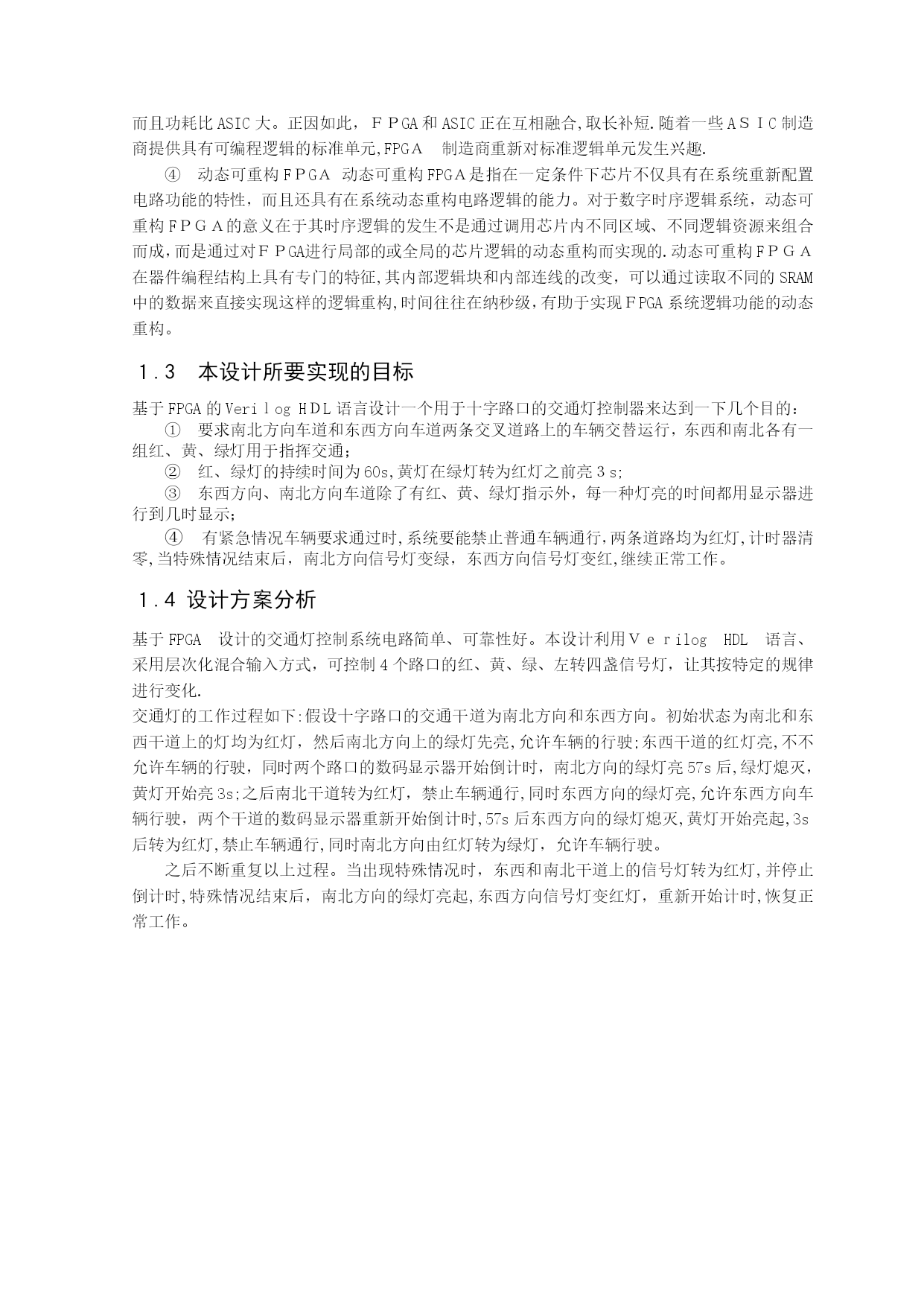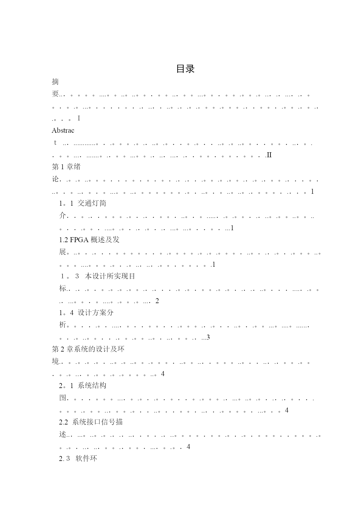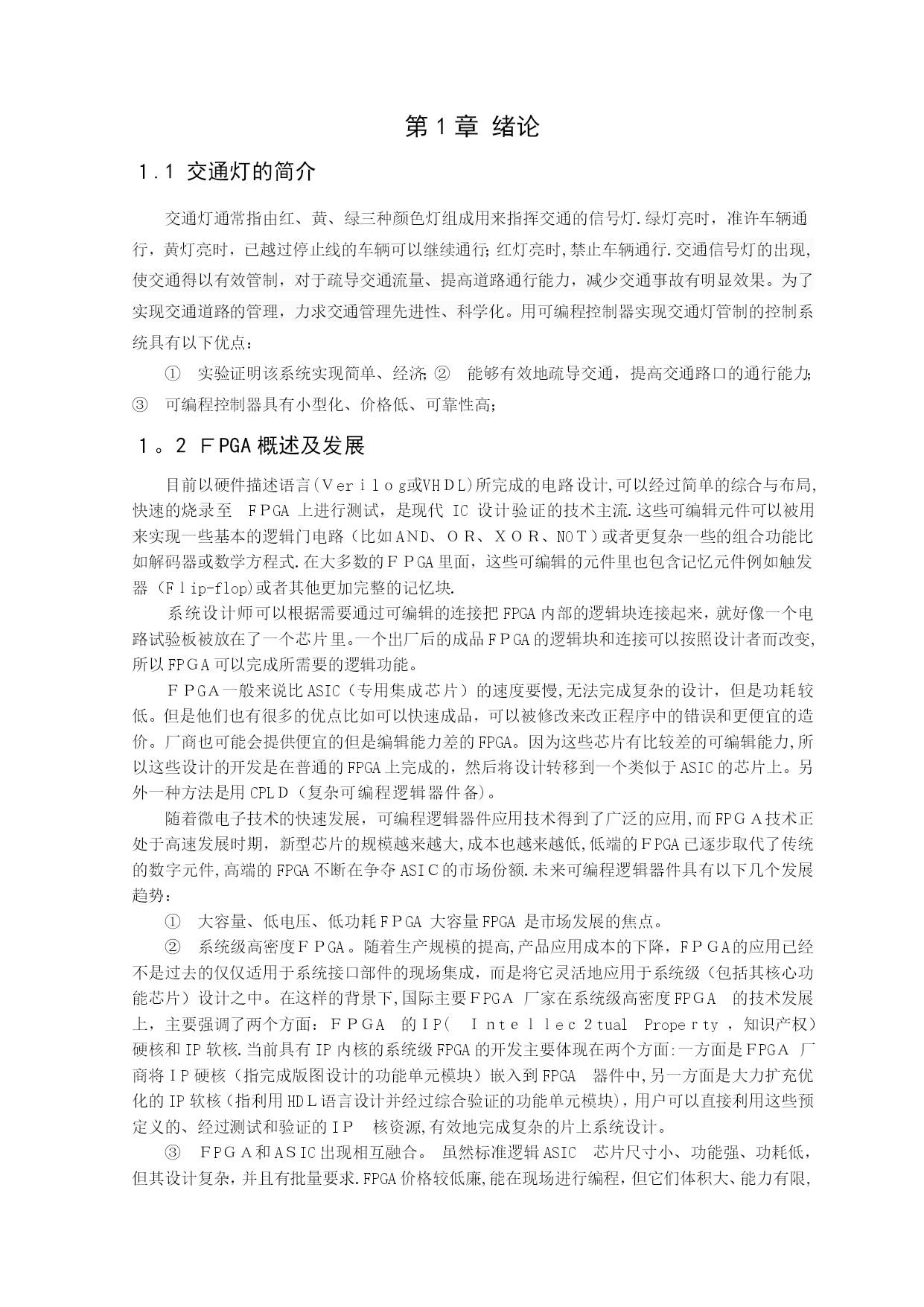 基于FPGA交通灯控制器设计(完整资料)(可以直接使用,可编辑优秀版资料,欢迎下载)摘要随着现代城市及交通工具的发展,交通事故也急剧增加,为了改善交通秩序及减少交通事故,交通灯起着越来越重要的作用。在越来越多的城市的各个路口上安装了交通灯,来改善交通秩序.现代城市在日常运行控制中,越来越多的使用红绿灯对交通进行指挥和管理。而一套完整的交通灯控制系统通常要实现自动控制和手动控制去实现其红绿灯的转换.基于FPGA设计的交通灯控制系统电路简单、可靠性好。本设计利用VerilogHDL语言、采用层次化混合输入方式,可控制4个路口的红、黄、绿、左转四盏信号灯,让其按特定的规律进行变化。在QuartusⅡ下对系统进行了综合与仿真。仿真结果表明系统可实现十字路口红绿灯及左转弯控制和倒计时显示,并能够自动控制交通灯转变.关键词:FPGA,交通灯控制器,QuartusⅡ,VerilogHDLAbstractWiththedevelopmentofmoderncitiesandtransport,trafficaccidentsalsoincreaseddramatically,playsanincreasinglyimportantroleinordertoimprovetrafficorderandreducetrafficaccidentsandtrafficlights.Moreandmorealltheroadsofthecitytoinstalltrafficlightstoimprovetrafficorder。Moderncity,moreandmorecontroloftheday—to-dayrunningofthetrafficlighttrafficcommandandmanagement。Andacompletesetoftrafficlightcontrolsystemisusuallytoachieveautomaticcontrolandmanualcontroltoachievetheconversionofitstrafficlights.FPGAdesign—basedtrafficlightcontrolsystemcircuitissimpleandgoodreliability.ThedesignusingVerilogHDLlanguageusinghierarchicalmixedinput,andcancontrolthefourjunctionsofred,yellow,green,andturnleftatthefoursignallights,sothataparticularlawofchange。QUARTUSⅡsystemsynthesisandsimulation.Thesimulationresultsshowthatthesystemcanachievethecrossroadsoftrafficlightsandturnleftcontrolandcountdowndisplayandcanautomaticallycontrolthetrafficlightsinto.KeyWords:FPGA,trafficlightcontroller,QuartusII,TheVerilogHDL目录TOC\o"1-2"\h\z\u\*MERGEFORMATHYPERLINK\l"_Toc325529561"摘要...。。。。....。。..。..。。.。。...。。...。。.。。.。。.。...........。。.。.。...。..............。...。..。。.。。。...。。..。。..。...。.。PAGEREF_Toc325529561\hIHYPERLINK\l"_Toc325529562”Abstract...............。..。。。.。....。.。..。.。....。.。..。。..。。....。..。。...........。..。。...。。............。。.。。.。。..PAGEREF_Toc325529562\hII第HYPERLINK\l"_Toc325529563"1章绪论..。.。..。。。...。.。.。.......。。.。.。。...。..。。....。...。.。...。.。....。...。。。。。。.。...。.。..。..。..。。。....。PAGEREF_Toc325529563\h11。1交通灯简介..。...。。。.。....。。...。.。.......。.。。.....。.。。..。。..。...。。