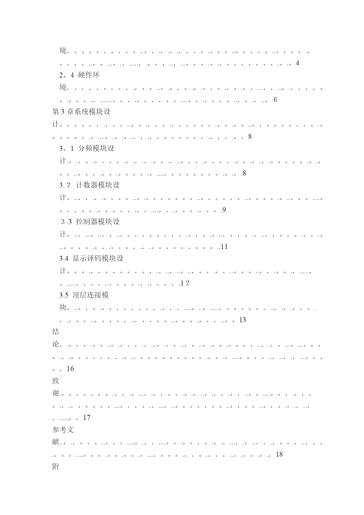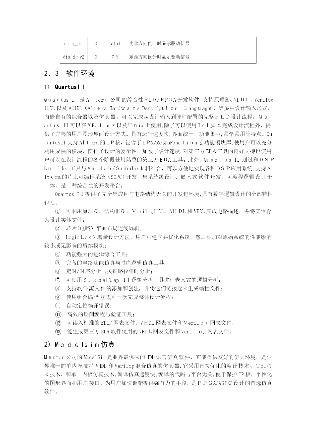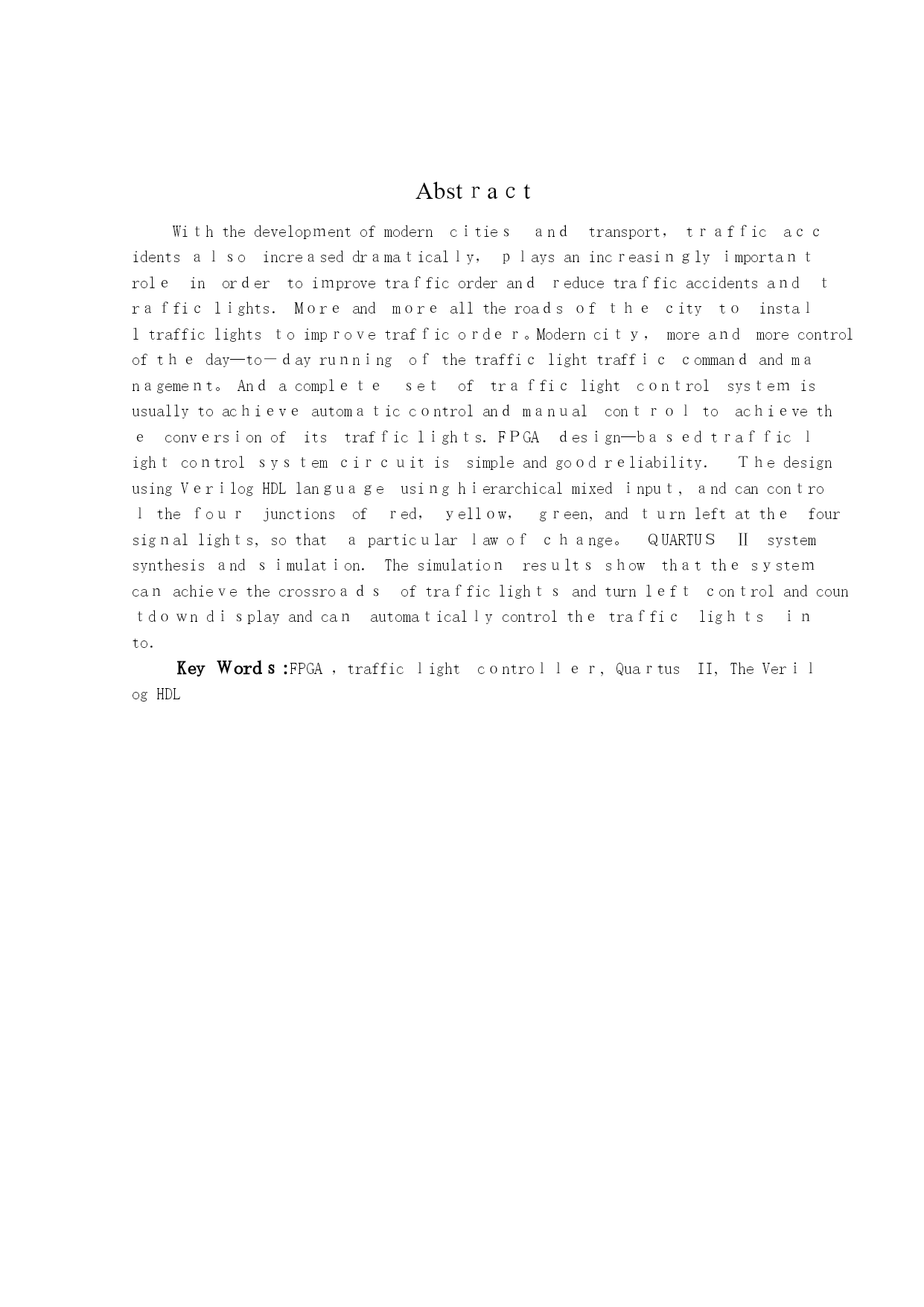 基于FPGA交通灯控制器设计(完整资料)(可以直接使用,可编辑优秀版资料,欢迎下载)摘要随着现代城市及交通工具的发展,交通事故也急剧增加,为了改善交通秩序及减少交通事故,交通灯起着越来越重要的作用。在越来越多的城市的各个路口上安装了交通灯,来改善交通秩序.现代城市在日常运行控制中,越来越多的使用红绿灯对交通进行指挥和管理。而一套完整的交通灯控制系统通常要实现自动控制和手动控制去实现其红绿灯的转换.基于FPGA设计的交通灯控制系统电路简单、可靠性好。本设计利用VerilogHDL语言、采用层次化混合输入方式,可控制4个路口的红、黄、绿、左转四盏信号灯,让其按特定的规律进行变化。在QuartusⅡ下对系统进行了综合与仿真。仿真结果表明系统可实现十字路口红绿灯及左转弯控制和倒计时显示,并能够自动控制交通灯转变.关键词:FPGA,交通灯控制器,QuartusⅡ,VerilogHDLAbstractWiththedevelopmentofmoderncitiesandtransport,trafficaccidentsalsoincreaseddramatically,playsanincreasinglyimportantroleinordertoimprovetrafficorderandreducetrafficaccidentsandtrafficlights.Moreandmorealltheroadsofthecitytoinstalltrafficlightstoimprovetrafficorder。Moderncity,moreandmorecontroloftheday—to-dayrunningofthetrafficlighttrafficcommandandmanagement。Andacompletesetoftrafficlightcontrolsystemisusuallytoachieveautomaticcontrolandmanualcontroltoachievetheconversionofitstrafficlights.FPGAdesign—basedtrafficlightcontrolsystemcircuitissimpleandgoodreliability.ThedesignusingVerilogHDLlanguageusinghierarchicalmixedinput,andcancontrolthefourjunctionsofred,yellow,green,andturnleftatthefoursignallights,sothataparticularlawofchange。QUARTUSⅡsystemsynthesisandsimulation.Thesimulationresultsshowthatthesystemcanachievethecrossroadsoftrafficlightsandturnleftcontrolandcountdowndisplayandcanautomaticallycontrolthetrafficlightsinto.KeyWords:FPGA,trafficlightcontroller,QuartusII,TheVerilogHDL目录TOC\o"1-2"\h\z\u\*MERGEFORMATHYPERLINK\l"_Toc325529561"摘要...。。。。....。。..。..。。.。。...。。...。。.。。.。。.。...........。。.。.。...。..............。...。..。。.。。。...。。..。。..。...。.。PAGEREF_Toc325529561\hIHYPERLINK\l"_Toc325529562”Abstract...............。..。。。.。....。.。..。.。....。.。..。。..。。....。..。。...........。..。。...。。............。。.。。.。。..PAGEREF_Toc325529562\hII第HYPERLINK\l"_Toc325529563"1章绪论..。.。..。。。...。.。.。.......。。.。.。。...。..。。....。...。.。...。.。....。...。。。。。。.。...。.。..。..。..。。。....。PAGEREF_Toc325529563\h11。1交通灯简介..。...。。。.。....。。...。.。.......。.。。.....。.。。..。。..。...。。