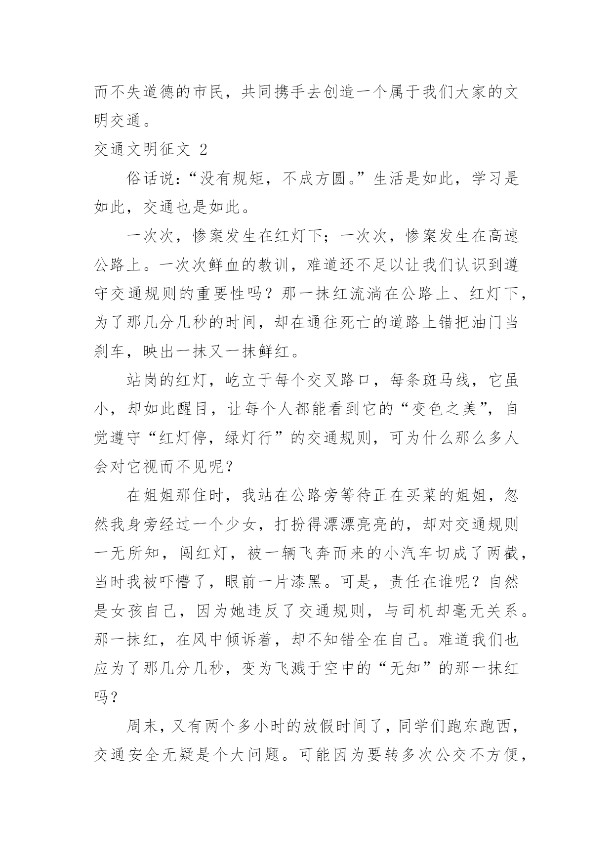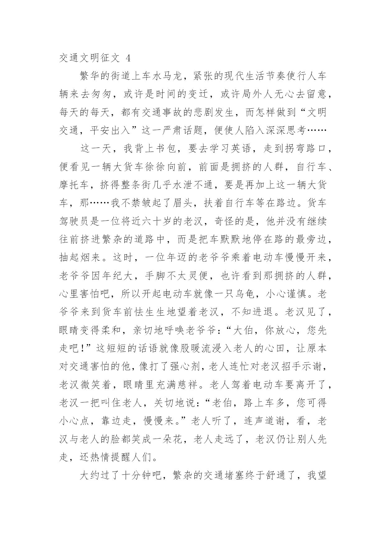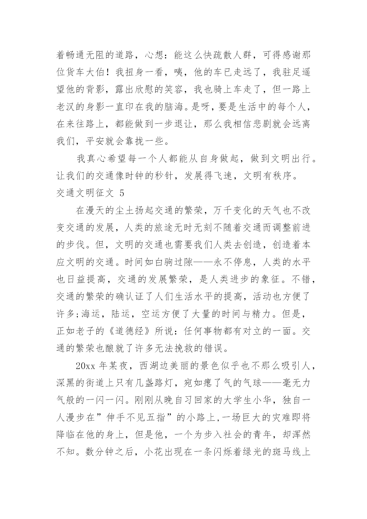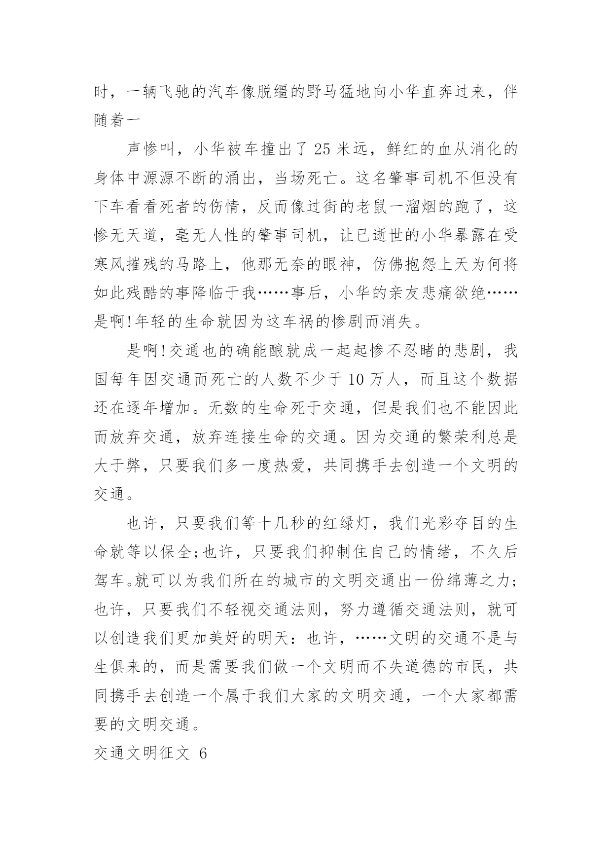 交通文明征文交通文明征文15篇在日常学习、工作抑或是生活中,大家总少不了接触征文吧,征文一般都具有精彩的开头,给人耳目一新的感觉。相信很多朋友都对写征文感到非常苦恼吧,以下是小编整理的交通文明征文,仅供参考,欢迎大家阅读。交通文明征文1亲爱的妈妈:您好!您天天骑着摩托车带我,所以,我也了解一些交通状况,甚至目睹了几次交通事故。有一天,您骑车带我去书店。猛得听见身后一片惊叫。我急忙向后看去,一辆卡车已经停在一个摔倒在地的小女孩面前。同时,一群人向那边涌去。您马上在路边把车停好,带我挤了过去。只见那女孩脸色惨白,胸脯急促地起伏着,过了好一会儿,才“哇”地一声哭了起来。年轻的司机慌了,旁边的一位中年妇女俯下身,撩起小女孩的裤管和衣袖,那血肉模糊的手脚,真让人心疼。那妇女做了紧急处理,便赶快叫司机把女孩送到医院。女孩被抱上车后,疾驰而去。周围的群众议论纷纷:“哎,这女孩也真是的,自己不遵守交通规则,乱穿马路,弄成这样,幸亏没什么大碍。”从这起车祸中,让我感受到不遵守交通规则的严重性,这次是没什么事,要真出了什么意外,双方都得承受现实的压力,彼此都得受到良心的谴责。从那以后,我走在马路上格外地小心。有一天早上,我高高兴兴地去上学,正过马路时,突然,一辆飞速行驶的卡车开了过来,我顿时吓了一跳。这时,我想起了您对我说过的话:过马路时,不要慌张。要不就快走,要不就站在原地不动,避免给司机造成误会。我按照您的吩咐做了,就这样,我才安全地过了马路。妈妈,我每次外出时,您都会说一句:“注意安全。在过马路时,要看好车文明交通我见证。小心点!”妈妈我会的,我会注意安全,小心谨慎地过马路,避免车祸的发生。我不仅自己遵守交通规则,看见违反交通规则的行人也忍不住要提醒他,注意行走时的交通安全。还记得吗?有一次我们一起过马路,马路与自行车道的交夹处是一排崭新的栅栏,一位二十多岁的小伙子图方便,正准备跨栏过马路我发现了,跑过去幽默地对他说:“叔叔,请你别学刘翔了,这儿是马路,很危险,还是走斑马线吧。”小伙子听了,脸“刷”地红了,跟着我走了斑马线。我很高兴,心想,我终于为城市交通出了点力。妈妈,因为常坐着你的车在路上奔驰,让我对交通安全有了更深刻的感受。生命是惟一的,是宝贵的,世界因为有了生命而变得精彩。为了这宝贵的生命,让我们大家都遵守交通法规,注意交通安全吧!文明的交通不是与生俱来的,而是需要我们做一个文明而不失道德的市民,共同携手去创造一个属于我们大家的文明交通。交通文明征文2俗话说:“没有规矩,不成方圆。”生活是如此,学习是如此,交通也是如此。一次次,惨案发生在红灯下;一次次,惨案发生在高速公路上。一次次鲜血的教训,难道还不足以让我们认识到遵守交通规则的重要性吗?那一抹红流淌在公路上、红灯下,为了那几分几秒的时间,却在通往死亡的道路上错把油门当刹车,映出一抹又一抹鲜红。站岗的红灯,屹立于每个交叉路口,每条斑马线,它虽小,却如此醒目,让每个人都能看到它的“变色之美”,自觉遵守“红灯停,绿灯行”的交通规则,可为什么那么多人会对它视而不见呢?在姐姐那住时,我站在公路旁等待正在买菜的姐姐,忽然我身旁经过一个少女,打扮得漂漂亮亮的,却对交通规则一无所知,闯红灯,被一辆飞奔而来的小汽车切成了两截,当时我被吓懵了,眼前一片漆黑。可是,责任在谁呢?自然是女孩自己,因为她违反了交通规则,与司机却毫无关系。那一抹红,在风中倾诉着,却不知错全在自己。难道我们也应为了那几分几秒,变为飞溅于空中的“无知”的那一抹红吗?周末,又有两个多小时的放假时间了,同学们跑东跑西,交通安全无疑是个大问题。可能因为要转多次公交不方便,大多数同学都选择搭乘“摩的”。这种行为是不值得提倡的,搭乘公交车比搭乘“摩的”更安全,更环保。据反映,我们学校有些学生喜欢违反交通规则,有些同学甚至把闯红灯当作节省时间的“工具”。这是非常不应该的。放假的时间固然短,但交通规则是不可违背的。宝贵的生命又怎会比不上那违规的几分几秒?还有同学认为,能快则快,何必总要人让车呢?让车也让我一回吧。我认为这是一种病态的心理,我们正值年少,精力充沛,那几步短短的道路,又何能阻挡我们。这样也违反了交通规则,容易引发交通事故。把自己推向“那一抹红”。并会造成人精神懒惰,导致在学习上思考不积极,一遇到难题就按“空格键”直接跳过,学习成绩迅速下降,交通道德也加了相反的加速度,日益逼近那一抹红。即使你有大成就、好成绩,但你如果不遵守交通安全规则,可能在某一天,你便成了红灯下流淌的那一抹红,到头来只是梦一场,空悲切。我们是隆回二中的学生,成绩不比别人差;道德素质不比别人低;遵守交通规则也不会比别人做的差。让我们改掉种种交通陋习,做到在指定地点候车,先下后上;坐车时,不能把头或身体伸出窗外;不爬车、跳车;不乘坐无牌无证的车辆;不乘坐超载的车