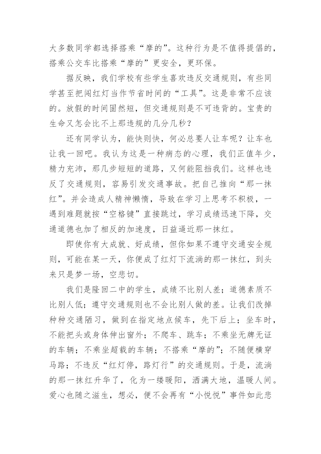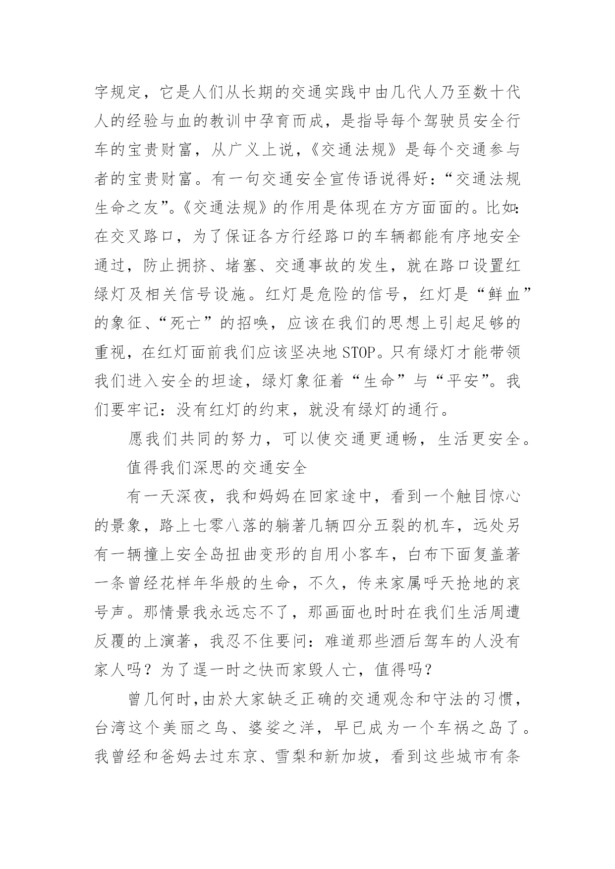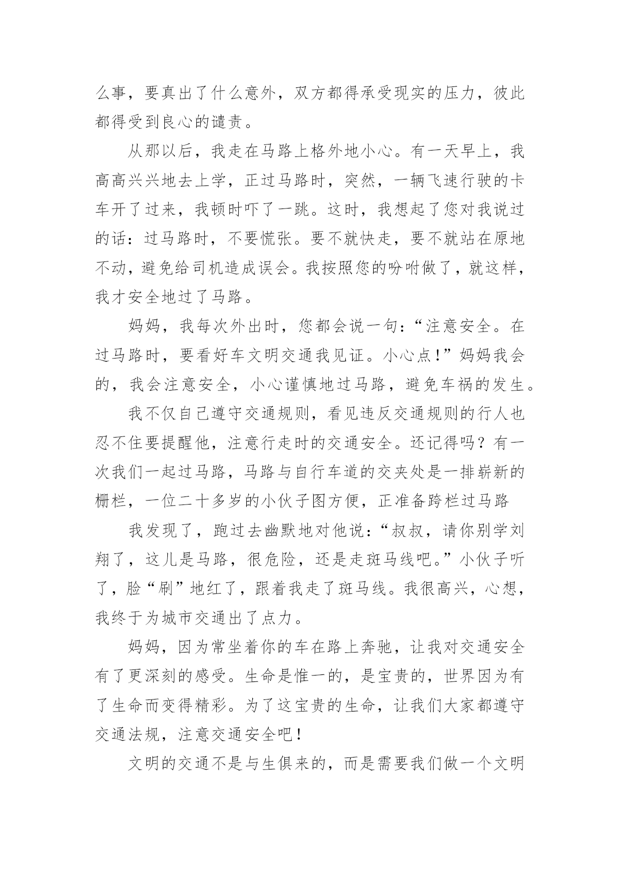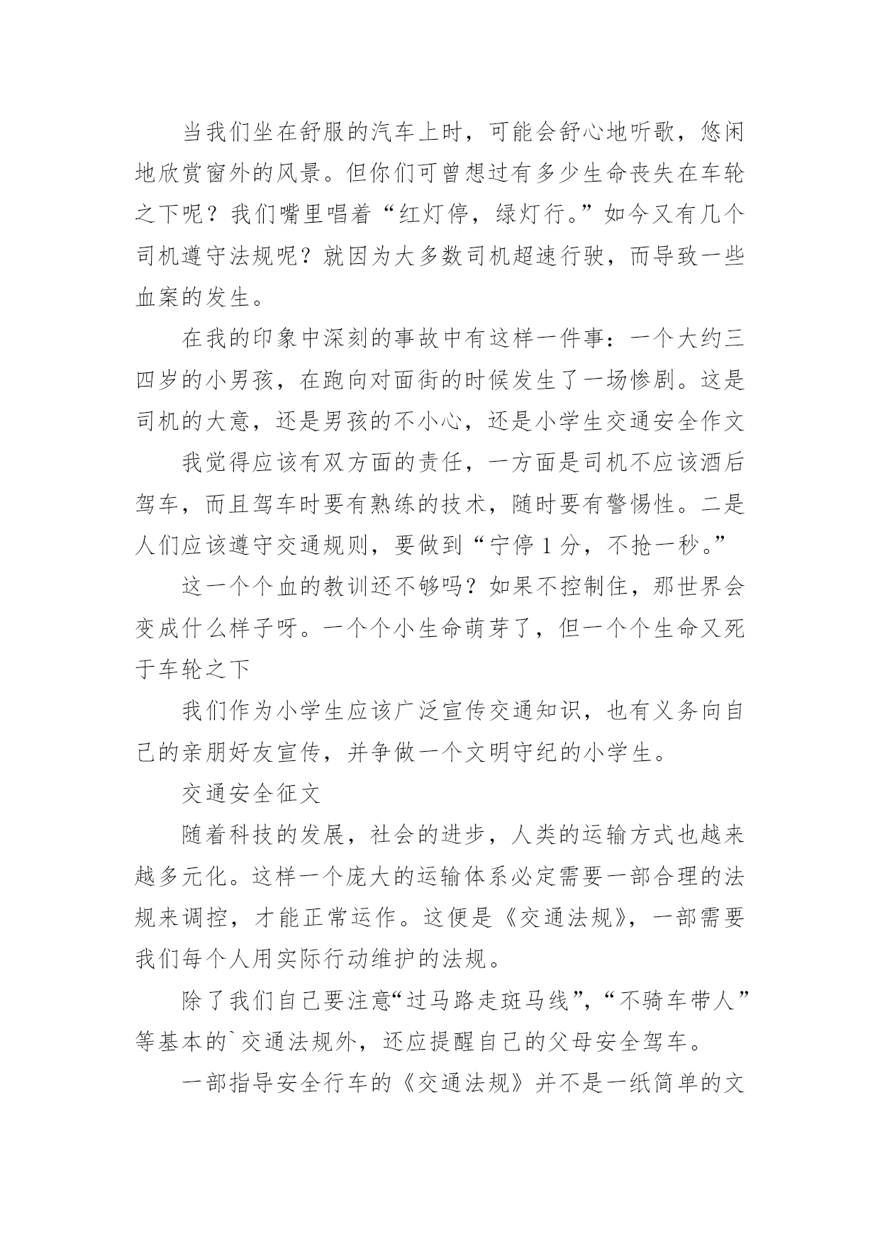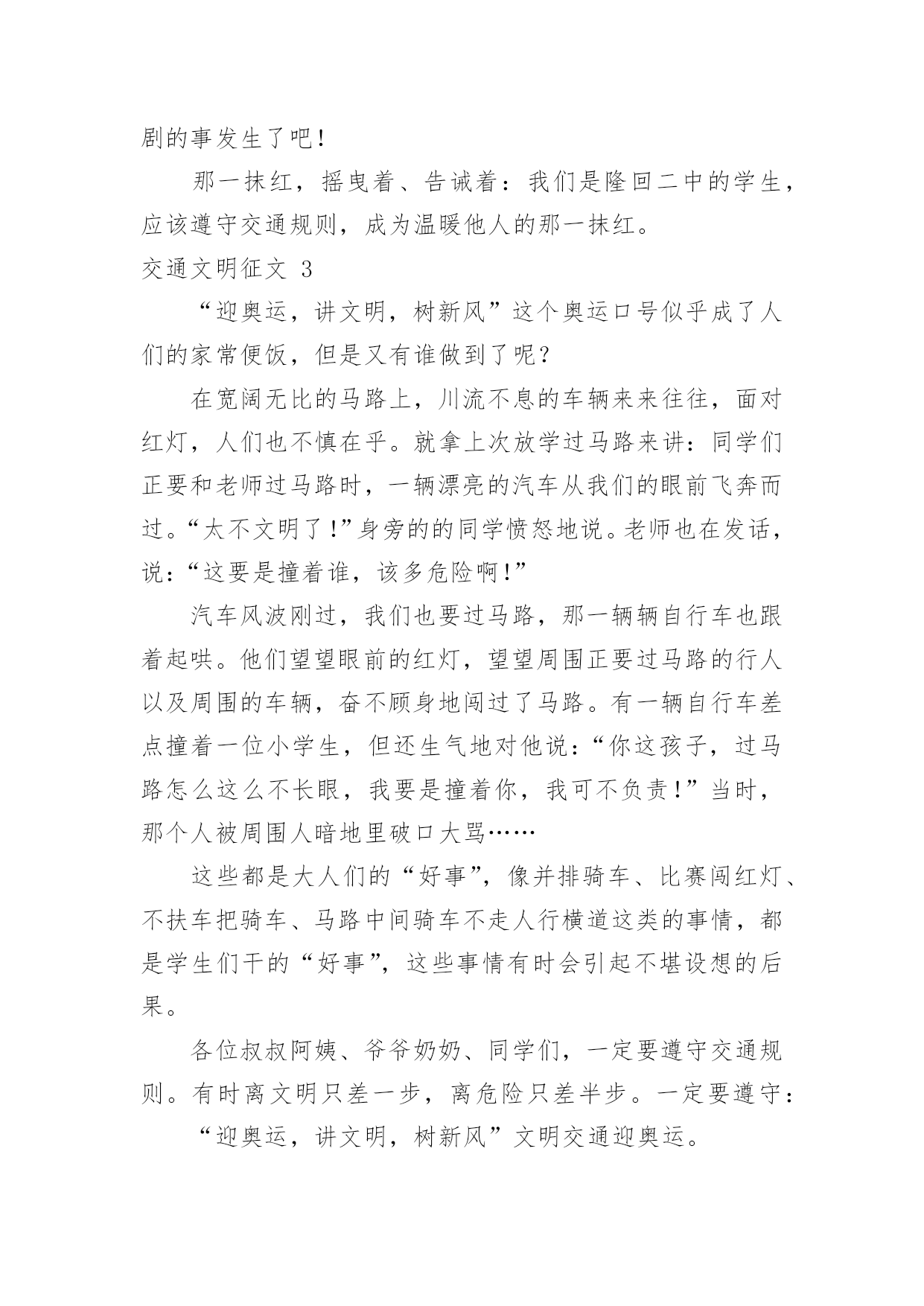 交通文明征文交通文明征文15篇在日常学习、工作抑或是生活中,大家总少不了接触征文吧,征文一般都具有精彩的开头,给人耳目一新的感觉。相信很多朋友都对写征文感到非常苦恼吧,以下是小编整理的交通文明征文,仅供参考,欢迎大家阅读。交通文明征文1亲爱的妈妈:您好!您天天骑着摩托车带我,所以,我也了解一些交通状况,甚至目睹了几次交通事故。有一天,您骑车带我去书店。猛得听见身后一片惊叫。我急忙向后看去,一辆卡车已经停在一个摔倒在地的小女孩面前。同时,一群人向那边涌去。您马上在路边把车停好,带我挤了过去。只见那女孩脸色惨白,胸脯急促地起伏着,过了好一会儿,才“哇”地一声哭了起来。年轻的司机慌了,旁边的一位中年妇女俯下身,撩起小女孩的裤管和衣袖,那血肉模糊的手脚,真让人心疼。那妇女做了紧急处理,便赶快叫司机把女孩送到医院。女孩被抱上车后,疾驰而去。周围的群众议论纷纷:“哎,这女孩也真是的,自己不遵守交通规则,乱穿马路,弄成这样,幸亏没什么大碍。”从这起车祸中,让我感受到不遵守交通规则的严重性,这次是没什么事,要真出了什么意外,双方都得承受现实的压力,彼此都得受到良心的谴责。从那以后,我走在马路上格外地小心。有一天早上,我高高兴兴地去上学,正过马路时,突然,一辆飞速行驶的卡车开了过来,我顿时吓了一跳。这时,我想起了您对我说过的话:过马路时,不要慌张。要不就快走,要不就站在原地不动,避免给司机造成误会。我按照您的吩咐做了,就这样,我才安全地过了马路。妈妈,我每次外出时,您都会说一句:“注意安全。在过马路时,要看好车文明交通我见证。小心点!”妈妈我会的,我会注意安全,小心谨慎地过马路,避免车祸的发生。我不仅自己遵守交通规则,看见违反交通规则的行人也忍不住要提醒他,注意行走时的交通安全。还记得吗?有一次我们一起过马路,马路与自行车道的交夹处是一排崭新的栅栏,一位二十多岁的小伙子图方便,正准备跨栏过马路我发现了,跑过去幽默地对他说:“叔叔,请你别学刘翔了,这儿是马路,很危险,还是走斑马线吧。”小伙子听了,脸“刷”地红了,跟着我走了斑马线。我很高兴,心想,我终于为城市交通出了点力。妈妈,因为常坐着你的车在路上奔驰,让我对交通安全有了更深刻的感受。生命是惟一的,是宝贵的,世界因为有了生命而变得精彩。为了这宝贵的生命,让我们大家都遵守交通法规,注意交通安全吧!文明的交通不是与生俱来的,而是需要我们做一个文明而不失道德的市民,共同携手去创造一个属于我们大家的文明交通。交通文明征文2俗话说:“没有规矩,不成方圆。”生活是如此,学习是如此,交通也是如此。一次次,惨案发生在红灯下;一次次,惨案发生在高速公路上。一次次鲜血的教训,难道还不足以让我们认识到遵守交通规则的重要性吗?那一抹红流淌在公路上、红灯下,为了那几分几秒的时间,却在通往死亡的道路上错把油门当刹车,映出一抹又一抹鲜红。站岗的红灯,屹立于每个交叉路口,每条斑马线,它虽小,却如此醒目,让每个人都能看到它的“变色之美”,自觉遵守“红灯停,绿灯行”的交通规则,可为什么那么多人会对它视而不见呢?在姐姐那住时,我站在公路旁等待正在买菜的姐姐,忽然我身旁经过一个少女,打扮得漂漂亮亮的,却对交通规则一无所知,闯红灯,被一辆飞奔而来的小汽车切成了两截,当时我被吓懵了,眼前一片漆黑。可是,责任在谁呢?自然是女孩自己,因为她违反了交通规则,与司机却毫无关系。那一抹红,在风中倾诉着,却不知错全在自己。难道我们也应为了那几分几秒,变为飞溅于空中的“无知”的那一抹红吗?周末,又有两个多小时的放假时间了,同学们跑东跑西,交通安全无疑是个大问题。可能因为要转多次公交不方便,大多数同学都选择搭乘“摩的”。这种行为是不值得提倡的,搭乘公交车比搭乘“摩的”更安全,更环保。据反映,我们学校有些学生喜欢违反交通规则,有些同学甚至把闯红灯当作节省时间的“工具”。这是非常不应该的。放假的时间固然短,但交通规则是不可违背的。宝贵的生命又怎会比不上那违规的几分几秒?还有同学认为,能快则快,何必总要人让车呢?让车也让我一回吧。我认为这是一种病态的心理,我们正值年少,精力充沛,那几步短短的道路,又何能阻挡我们。这样也违反了交通规则,容易引发交通事故。把自己推向“那一抹红”。并会造成人精神懒惰,导致在学习上思考不积极,一遇到难题就按“空格键”直接跳过,学习成绩迅速下降,交通道德也加了相反的加速度,日益逼近那一抹红。即使你有大成就、好成绩,但你如果不遵守交通安全规则,可能在某一天,你便成了红灯下流淌的那一抹红,到头来只是梦一场,空悲切。我们是隆回二中的学生,成绩不比别人差;道德素质不比别人低;遵守交通规则也不会比别人做的差。让我们改掉种种交通陋习,做到在指定地点候车,先下后上;坐车时,不能把头或身体伸出窗外;不爬车、跳车;不乘坐无牌无证的车辆;不乘坐超载的车