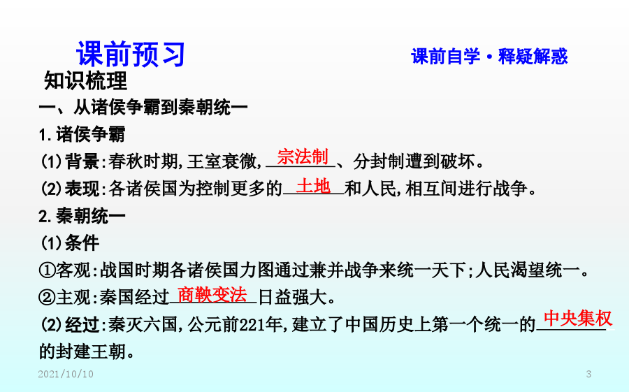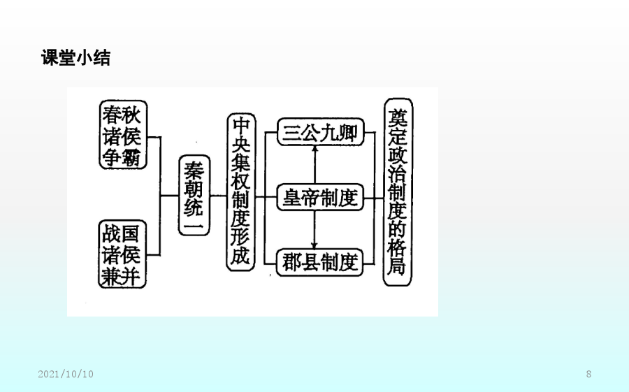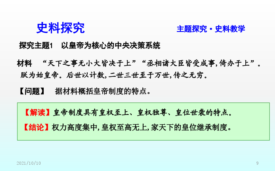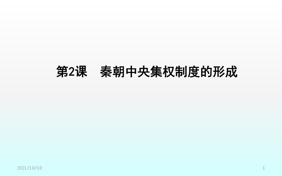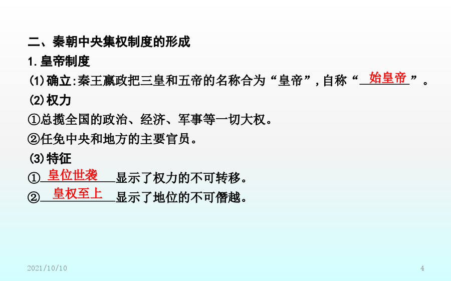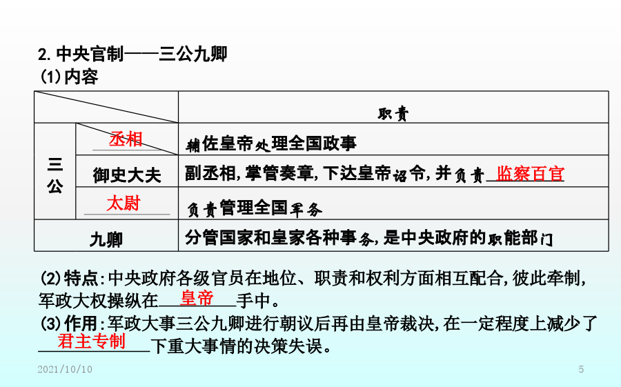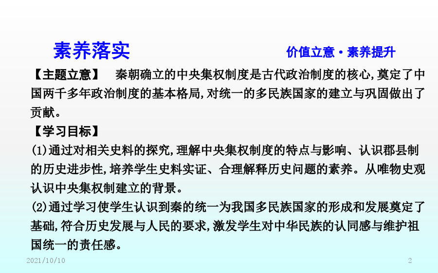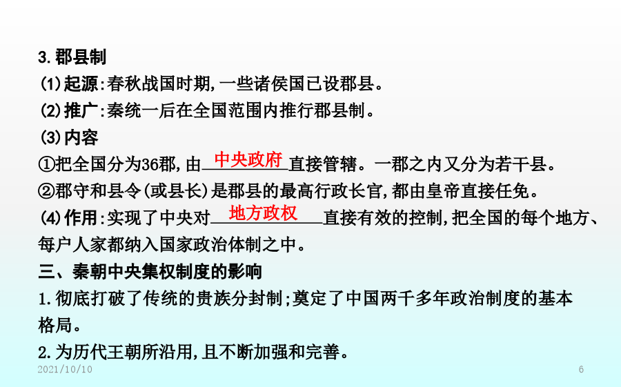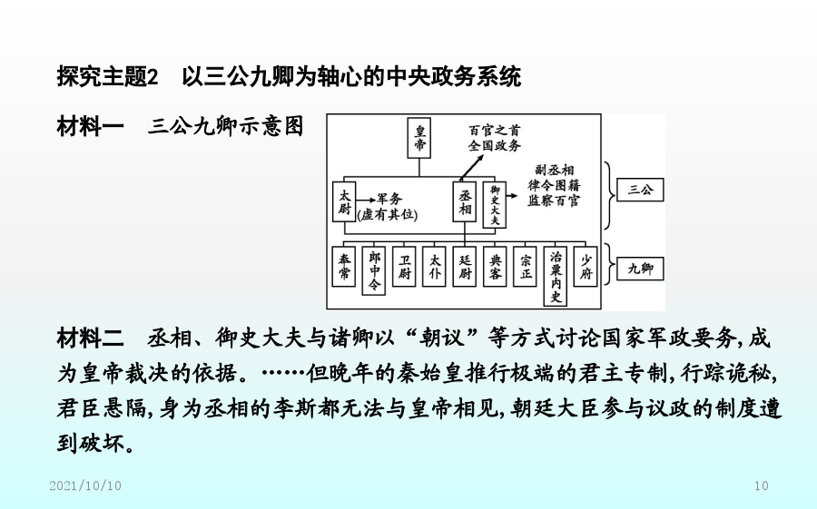 第2课秦朝中央集权制度的形成素养落实价值立意·素养提升课前预习课前自学·释疑解惑二、秦朝中央集权制度的形成1.皇帝制度(1)确立:秦王嬴政把三皇和五帝的名称合为“皇帝”,自称“”。(2)权力①总揽全国的政治、经济、军事等一切大权。②任免中央和地方的主要官员。(3)特征①显示了权力的不可转移。②显示了地位的不可僭越。2.中央官制——三公九卿(1)内容3.郡县制(1)起源:春秋战国时期,一些诸侯国已设郡县。(2)推广:秦统一后在全国范围内推行郡县制。(3)内容①把全国分为36郡,由直接管辖。一郡之内又分为若干县。②郡守和县令(或县长)是郡县的最高行政长官,都由皇帝直接任免。(4)作用:实现了中央对直接有效的控制,把全国的每个地方、每户人家都纳入国家政治体制之中。三、秦朝中央集权制度的影响1.彻底打破了传统的贵族分封制;奠定了中国两千多年政治制度的基本格局。2.为历代王朝所沿用,且不断加强和完善。【概念解读】专制主义:是一种政体,是与民主政体相对立的概念,指中央决策方式由一个人或少数几个人独裁的政权组织形式,体现在帝位终身制和皇位世袭制上,其主要特征是皇帝个人的专断独裁,集国家最高权力于一身,从决策到行使军政、财政大权都具有独断性和随意性。中央集权制度:中央集权是一种国家政权的制度,以国家职权统一于中央政府,削弱地方政府力量为标志。秦朝最早在全国范围内确立了中央集权制,此后,这种政治体制在中国延续了2000多年。课堂小结探究主题1以皇帝为核心的中央决策系统探究主题2以三公九卿为轴心的中央政务系统【问题】依据材料一、二并结合所学,如何看待秦朝三公九卿制的运作?探究主题3以郡县制为基础的地方管理系统【问题】(1)根据材料一并结合所学知识,指出西周和秦朝的主要政治制度。分析说明周秦政治制度的主要差别。(2)根据材料二,概括郡县制的作用。【深化拓展】分封制与郡县制的比较探究主题4中央集权制度的影响【问题】依据材料并结合所学,概括中央集权制度对推动中华民族发展的作用。【深化拓展】中央集权制度建立的影响(1)积极作用:有利于维护祖国统一与领土完整。能有效地组织人力、物力和财力从事大规模的生产活动和经济建设以及救灾行动,有利于社会经济的发展。在统一的环境下,有利于各民族的融合,有利于各地区的经济文化交流。(2)消极影响:皇权专制极易形成暴政、腐败现象,是阻碍历史发展的因素。在思想上表现为独尊一家,钳制了思想,压抑了创造力,助长了官僚作风和贪污腐败之风。在封建社会末期,阻碍了新兴的资本主义生产关系萌芽的发展,束缚了社会生产力的发展,妨碍了中国社会的进步。随堂训练即学即练·学以致用一、选择题1.司马迁在《史记·秦始皇本纪》中这样形容秦代的皇帝制度:“法令出一”“别黑白而定一尊”,该政治制度突出的特点是()A.严格的等级制度B.浓厚的宗族色彩C.皇帝非常勤政D.权力高度集中2.“秦廷有集议之制……君臣集议,犹与春秋列国贵族世卿之世略似。……亦非一君权专制独伸之象。”材料认为秦朝集议制度()A.有利于皇帝决策时集思广益B.承继先秦的分封制度C.有效解决了皇权与相权的矛盾D.强化君主个人独裁3.(2018·福建龙岩月考)《三国志》称秦始皇“罢侯置守,设官分职,不与古同”。这是指秦朝实行了()A.郡县制B.分封制C.井田制D.宗法制4.柳宗元称郡县制“摄制四海,运于掌握之内,此其所以为得也”。柳宗元认为郡县制()A.有利于加强中央集权B.有利于加强君主专制C.有利于社会经济发展D.彻底消除了封建割据5.《嬴政的道》一文中写道:“始皇帝嬴政比较黏糊,只要走进历史,不管你是否乐意,也无论你停在哪一段儿,他都将不请自来,躲不掉也避不开。”作者这样评价秦始皇,主要是基于他()A.开始实行郡县制加强对地方的管理B.确定了后世两千多年的国家政治框架C.确立了分封子弟的制度D.开始用军功爵制代替世卿世禄制二、非选择题6.(2018·河北邯郸期末)阅读下列材料,回答问题:材料一在牧野之战中周人战胜了曾经相当强大的商人,获得了对中原地区的统治权。为了能在更加广阔的领域内迅速建立并巩固自己的统治,他们推行了分封制,“封建亲戚,以藩屏周”。——李凤琴《西周分封制与西欧中世纪分封制之比较》材料二分封制在联系制度上就已经决定了周天子的政权不稳,国家的动荡。面对众多力量强大且不受约束的诸侯,假使一家的实力真正成长到能够与天子抗衡,那么王朝的覆灭也就不远了。况且世袭制的延续性,就能够让一方诸侯持续的累积实力。而郡县制联系于任免制而非世袭制。郡守与县长官均由皇帝直接任命,并且还设立监察使,行政、军事与司法三权分立,层层将权力集中到中央。这样,不仅减少了地方实力超越中央的可能,还将权力集中于皇