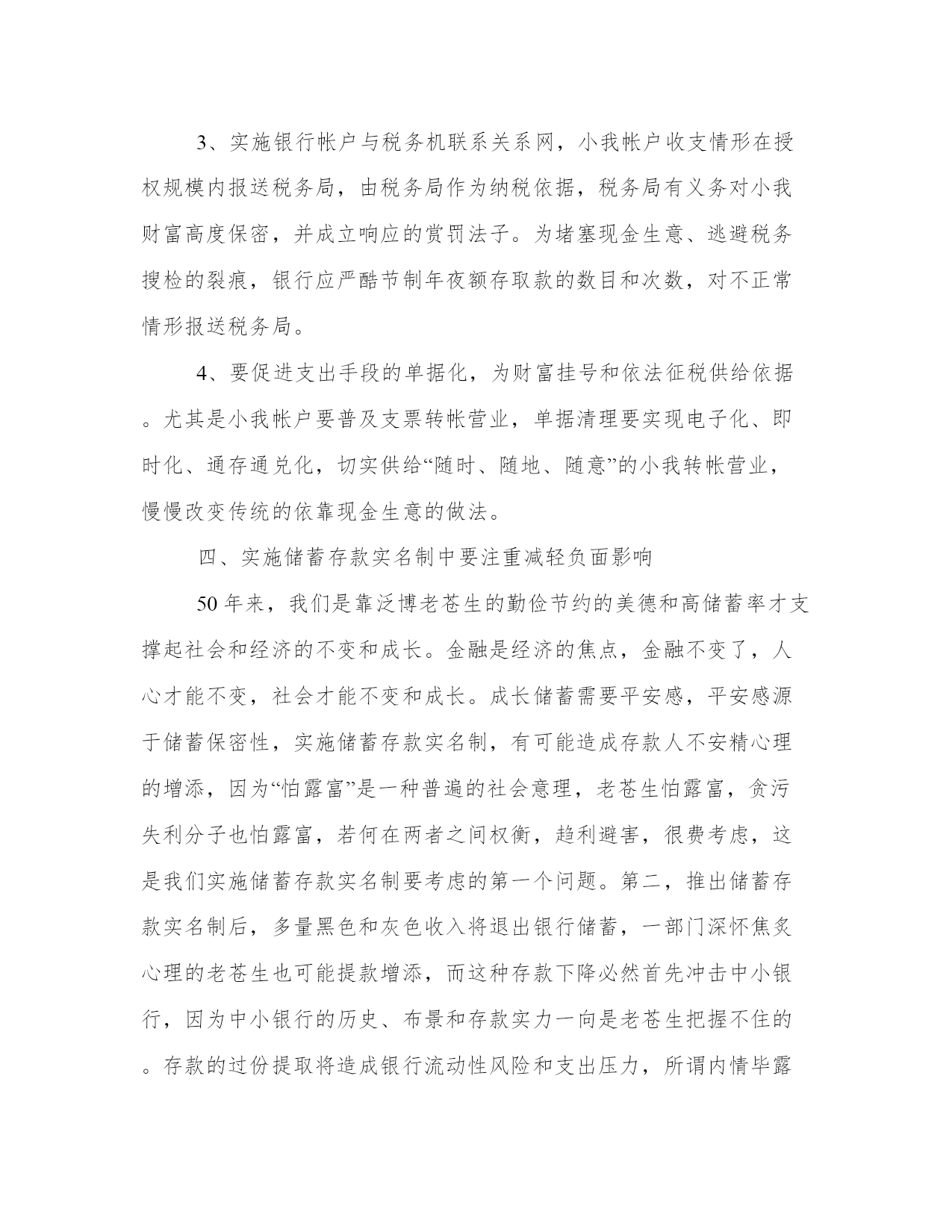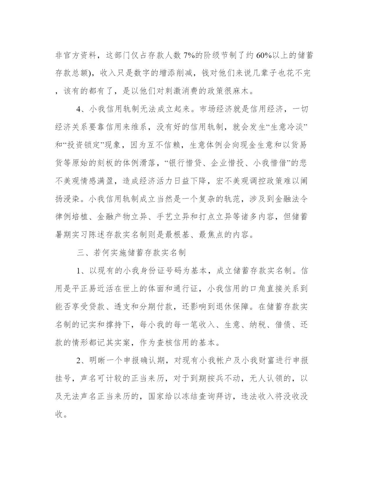 中国工商银会计实习报告范文精选一、储蓄存款实名制的寄义储蓄存款实名制是指居平易近在金融机构开户和打点储蓄营业时,必需出示有用身份证实,银行员工有义务给以记实,并要求存款人在存单上留下自己姓名的轨制。其根柢宗旨在于有用呵护小我益处和维护国家益处的前提下,促进金融系统在公允、合理、公开的基本长进行,保证小我金融资产的真实性、正当性。我国开国五十年来,储蓄存款轨制一向实施的是记名(虚名)储蓄轨制。其记名可所以真名、假名、代码亦可所以亲友的名字。出格是活期储蓄,银行只认存折不认人,只要取款人供给存折出示印鉴或输对密码(由取款人开户时商定)银行即按折付款。储蓄存款实名制是发家国家早已实施的一项金融轨制,也是绝年夜年夜都成长中国家实施的金融轨制.二、为什么要实储蓄存款实名制我国现行的储蓄存款记名制可以说从泉源上造成了一系列社会经济问题,已经故障了更始开放的历程,到了积重难返的境界。1、储蓄存款加速增添现象下袒护了惊心动魄的社会财富转移。截止1999年6月末,我国商业银行储蓄存款总额(本外币全折人平易近币)达6.3万亿元。我国居平易近储蓄存款是呈几何级数增添的,1987年,我国居平易近储蓄存款余额仅3073亿元,1992年打破1万亿元,1994年打破2万亿元,t995年打破3万亿元,到1998年尾更是达5.3万亿元,而仅仅半年,1999年6月末已达6.3万亿元。1992年以来,我国gdp增添率虽然走上了快速增添的通道,最高的年份是1992年的14.1%,最低的年份是1998年的7.8%,从92年到98年,算术平均数也仅10.76%,gdp的增添与储蓄存款增添分歧步,这声名两点,一是国平易近收入的分配过份向小我倾斜。二是有些小我收入已经不来历于国平易近收入,而是直接来历于国有资产的流失踪。2、税收征管坚苦,偷逃税款严重。纳税是平正易近的义务,但在现实前提下,能偷逃税赋成了小我的本事,对不少财政打点人员来说,逃税倒成了其义务,我国小我所得税规模占人均gdp的比重年夜约在0.28%摆布,远低于成长中国家平均水平的2.1%,税源流失踪过多,根源在于我国的现行储蓄存款轨制根柢无法撑持小我所得税的征收和监管,而存款轨制的不完美,晦气于成立平正易近的信用系统,不能明晰小我对国家应尽的义务,无法经由过程税收杠杆调节居平易近收入差距和贫富差距,缓解社会矛盾,使国家集中力量办年夜事。3、使我国的相关调整政策无所适从,实施下场年夜打折扣。好比,针对我国内需不旺、消费疲软的状况,国家出台了一系列刺激消费的政策,如持续下调利率、鼓舞激励消费信贷、征收储蓄利息所得税、增添公务员和事业单元人员工资收入、刺激教育消费等等,但这些政策实施下场很不较着,为什么?因为储蓄存款记名制袒护了贫富差距,立法和行政机构很难有的放矢,对少部门暴富阶级的人士来说(据非官方资料,这部门仅占存款人数7%的阶级节制了约60%以上的储蓄存款总额),收入只是数字的增添削减,钱对他们来说几辈子也花不完,该有的都有了,是以他们对刺激消费的政策很麻木。4、小我信用轨制无法成立起来。市场经济就是信用经济,一切经济关系要靠信用来维系,没有好的信用轨制,就会发生“生意冷淡”和“投资锁定”现象,因为互不信赖,生意体例会向现金生意和以货易货等原始的刻板的体例滑落,“银行惜贷、企业惜投、小我惜借”的悲不美观情感满盈,造成经济活力日益下降,宏不美观调控政策难以阐扬浸染。小我信用轨制成立当然是一个复杂的轨范,涉及到金融法令律例培植、金融产物立异、手艺立异和打点立异等诸多内容,但储蓄暑期实习陈述存款实名制则是最根基、最焦点的内容。三、若何实施储蓄存款实名制1、以现有的小我身份证号码为基本,成立储蓄存款实名制。信用是平正易近活在世上的体面和通行证,小我信用的口角直接关系到能否享受贷款、透支和分期付款,还影响到退休保障。在储蓄存款实名制的记实和撑持下,每小我的每一笔收入、生意、纳税、借债、还款的情形都记其实案,作为查核信用的基本。2、明晰一个申报确认期,对现有小我帐户及小我财富进行申报挂号,声名可计较的正当来历,对于到期按兵不动,无人认领的,以及无法声名正当来历的,国家给以冻结查询拜访,违法收入将没收没收。3、实施银行帐户与税务机联系关系网,小我帐户收支情形在授权规模内报送税务局,由税务局作为纳税依据,税务局有义务对小我财富高度保密,并成立响应的赏罚法子。为堵塞现金生意、逃避税务搜检的裂痕,银行应严酷节制年夜额存取款的数目和次数,对不正常情形报送税务局。4、要促进支出手段的单据化,为财富挂号和依法征税供给依据。尤其是小我帐户要普及支票转帐营业,单据清理要实现电子化、即时化、通存通兑化,切实供给“随时、随地、随意”的小我转帐营业,慢慢改变传统的依靠现金生意的做法。四、实施储蓄存款实名制中要注重减轻