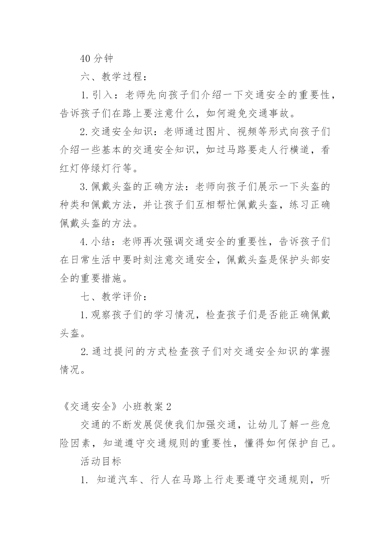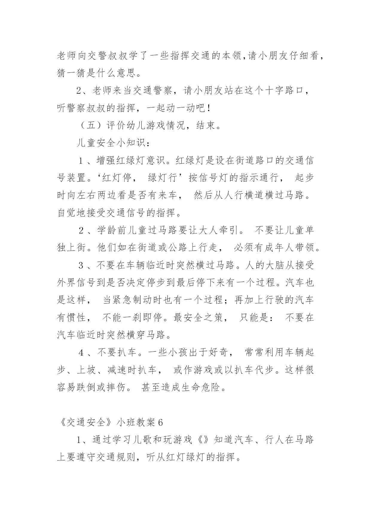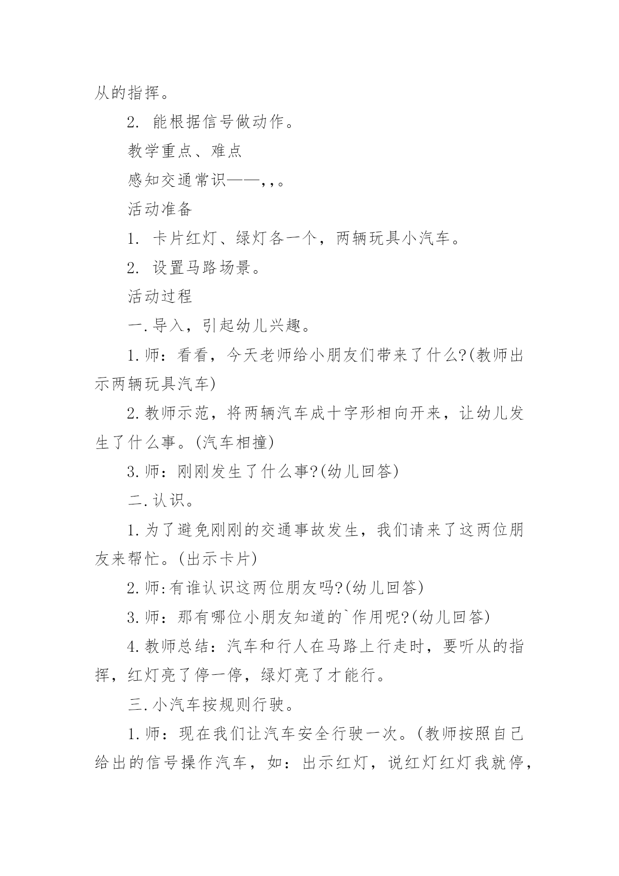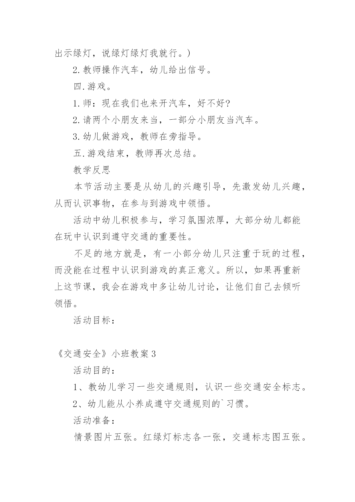 《交通安全》小班教案作为一名教职工,就不得不需要编写教案,借助教案可以恰当地选择和运用教学方法,调动学生学习的积极性。如何把教案做到重点突出呢?以下是小编收集整理的《交通安全》小班教案,供大家参考借鉴,希望可以帮助到有需要的朋友。《交通安全》小班教案1一、教学目标:1.了解交通安全意识,掌握交通安全知识。2.了解佩戴头盔的重要性,掌握佩戴头盔的正确方法。二、教学内容:1.交通安全知识2.佩戴头盔的正确方法三、教学方法:1.讲解法:通过图片、视频等形式向孩子们介绍交通安全知识和佩戴头盔的正确方法。2.互动法:让孩子们互相帮忙佩戴头盔,练习正确佩戴头盔的`方法。四、教学材料:1.头盔2.图片、视频等教学辅助材料五、教学时间:40分钟六、教学过程:1.引入:老师先向孩子们介绍一下交通安全的重要性,告诉孩子们在路上要注意什么,如何避免交通事故。2.交通安全知识:老师通过图片、视频等形式向孩子们介绍一些基本的交通安全知识,如过马路要走人行横道,看红灯停绿灯行等。3.佩戴头盔的正确方法:老师向孩子们展示一下头盔的种类和佩戴方法,并让孩子们互相帮忙佩戴头盔,练习正确佩戴头盔的方法。4.小结:老师再次强调交通安全的重要性,告诉孩子们在日常生活中要时刻注意交通安全,佩戴头盔是保护头部安全的重要措施。七、教学评价:1.观察孩子们的学习情况,检查孩子们是否能正确佩戴头盔。2.通过提问的方式检查孩子们对交通安全知识的掌握情况。《交通安全》小班教案2交通的不断发展促使我们加强交通,让幼儿了解一些危险因素,知道遵守交通规则的重要性,懂得如何保护自己。活动目标1.知道汽车、行人在马路上行走要遵守交通规则,听从的指挥。2.能根据信号做动作。教学重点、难点感知交通常识——,,。活动准备1.卡片红灯、绿灯各一个,两辆玩具小汽车。2.设置马路场景。活动过程一.导入,引起幼儿兴趣。1.师:看看,今天老师给小朋友们带来了什么?(教师出示两辆玩具汽车)2.教师示范,将两辆汽车成十字形相向开来,让幼儿发生了什么事。(汽车相撞)3.师:刚刚发生了什么事?(幼儿回答)二.认识。1.为了避免刚刚的交通事故发生,我们请来了这两位朋友来帮忙。(出示卡片)2.师:有谁认识这两位朋友吗?(幼儿回答)3.师:那有哪位小朋友知道的`作用呢?(幼儿回答)4.教师总结:汽车和行人在马路上行走时,要听从的指挥,红灯亮了停一停,绿灯亮了才能行。三.小汽车按规则行驶。1.师:现在我们让汽车安全行驶一次。(教师按照自己给出的信号操作汽车,如:出示红灯,说红灯红灯我就停,出示绿灯,说绿灯绿灯我就行。)2.教师操作汽车,幼儿给出信号。四.游戏。1.师:现在我们也来开汽车,好不好?2.请两个小朋友来当,一部分小朋友当汽车。3.幼儿做游戏,教师在旁指导。五.游戏结束,教师再次总结。教学反思本节活动主要是从幼儿的兴趣引导,先激发幼儿兴趣,从而认识事物,在参与到游戏中领悟。活动中幼儿积极参与,学习氛围浓厚,大部分幼儿都能在玩中认识到遵守交通的重要性。不足的地方就是,有一小部分幼儿只注重于玩的过程,而没能在过程中认识到游戏的真正意义。所以,如果再重新上这节课,我会在游戏中多让幼儿讨论,让他们自己去倾听领悟。活动目标:《交通安全》小班教案3活动目的:1、教幼儿学习一些交通规则,认识一些交通安全标志。2、幼儿能从小养成遵守交通规则的`习惯。活动准备:情景图片五张。红绿灯标志各一张,交通标志图五张。(一)、小学生交通安全教育教案范文(三篇)(二)、高中交通安全教育班会教案设计范文(三)、学校交通安全应急预案范文(三篇)(四)、小学生交通安全会议记录模板范文(两篇)(五)、小学生交通安全教育主题班会记录(两篇)(六)、幼儿园小班交通安全教案安全过马路活动反思范文(七)、幼儿园小班交通安全活动教案策划(五篇)(八)、幼儿园小班交通安全教案设计(四篇)(九)、交通安全事故心得体会范文(三篇)(十)、幼儿园大班交通安全教案设计(三篇)活动过程:一、猜谜语,导入新课。红绿灯和斑马线,可结合班内墙上的斑马线图案介绍斑马线的作用。二、结合情景图片,学习交通规则。1、幼儿自由举手回答,自己还知道哪些交通规则?2、幼儿说出来的可结合图片讲解,没想到的出示图片,说说图片上的幼儿做的对不对,应该怎样做才是遵守交通规则。三、认识交通安全标志。出示图片,请幼儿猜猜它表示什么?四、学儿歌记交通规则儿歌:交通安全歌红灯停,绿灯行,黄灯请你准备好。天桥地道人行道,横穿马路离不了。头手不出车窗外,不在路上玩游戏。交通规则很重要,我们把它记得牢。五、红绿灯和小司机请两名小朋友,一人扮演红灯,一人扮演绿灯,其他小朋友为小司机,看哪位小司机遵守交通规则。《交通安全》小班教案41、注意安全,初步培养幼儿的自我保护意识。2、能认识简单的交通标记并了解安全通应遵