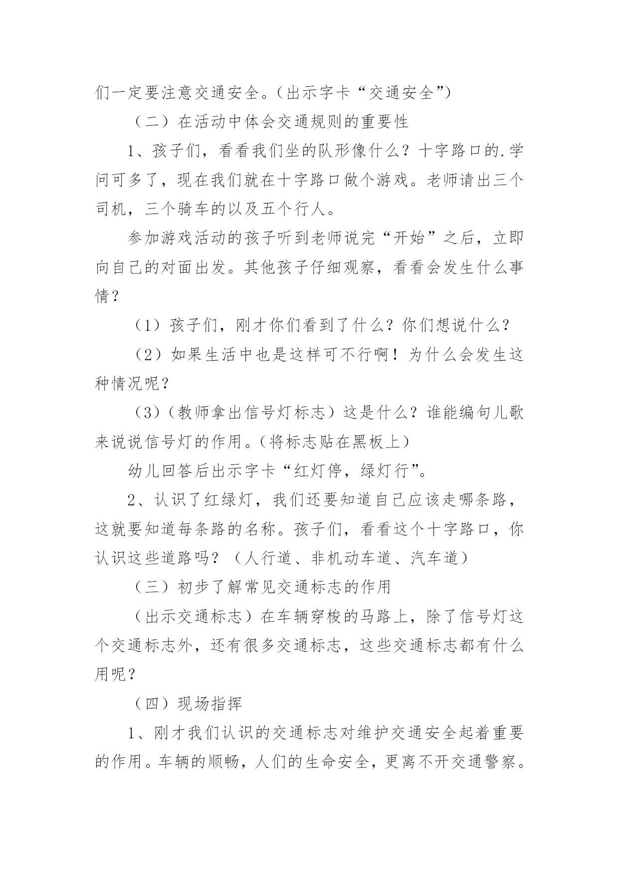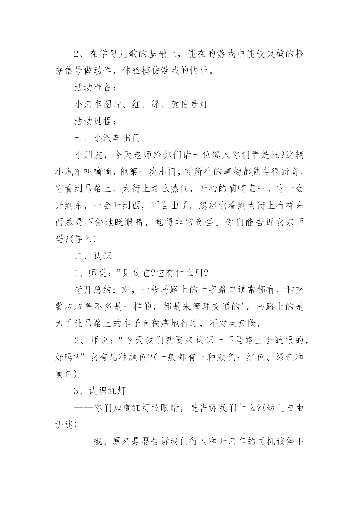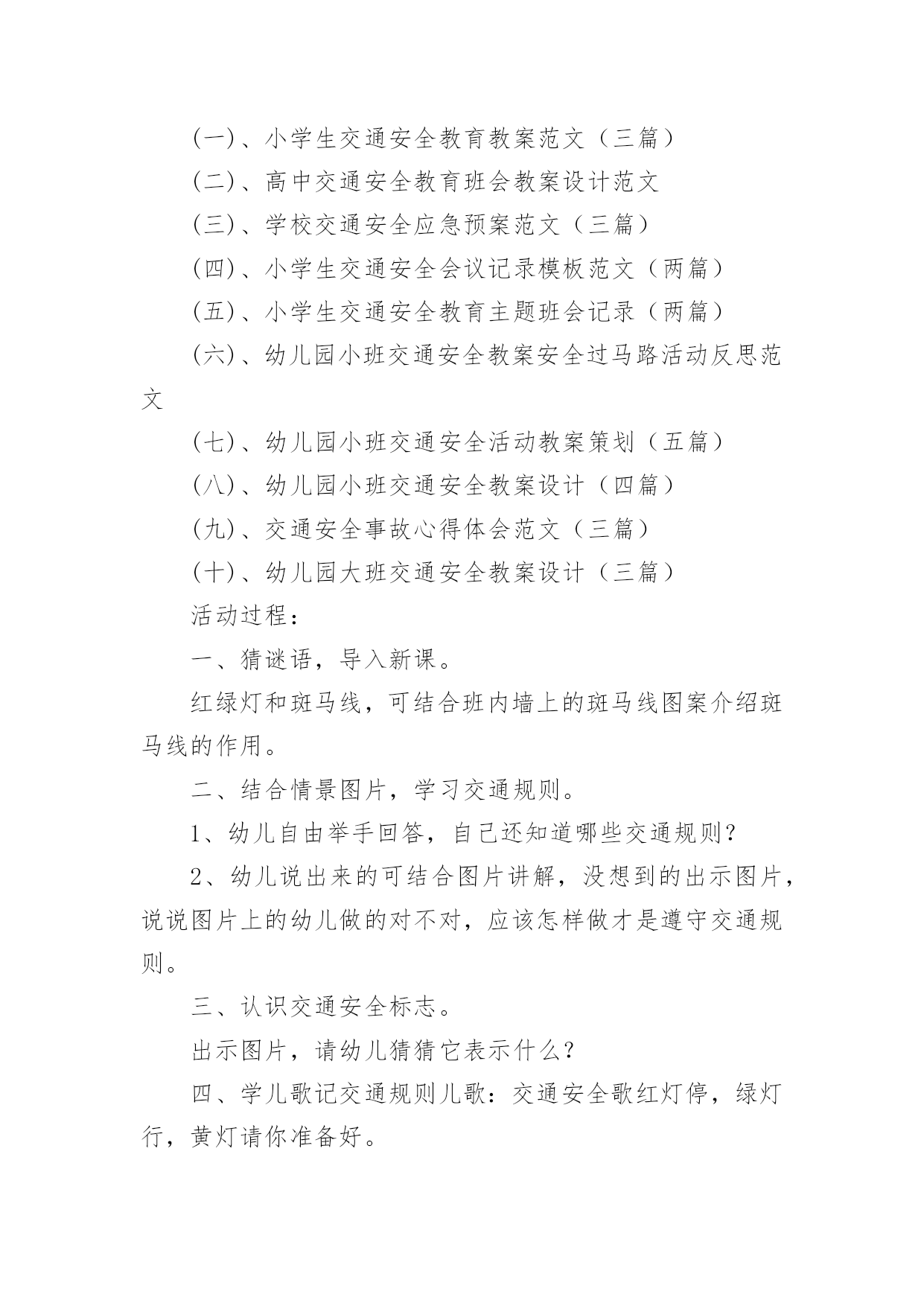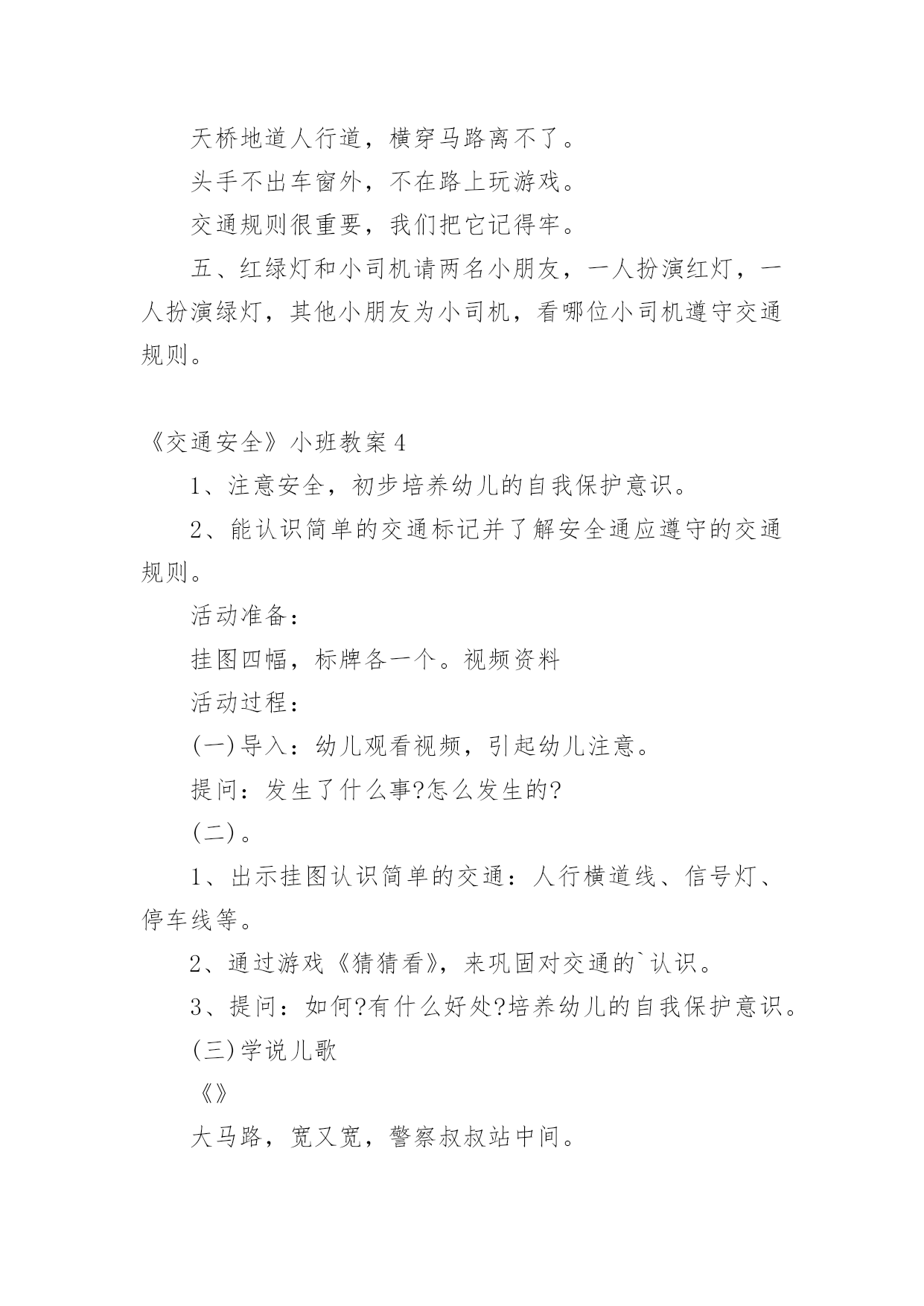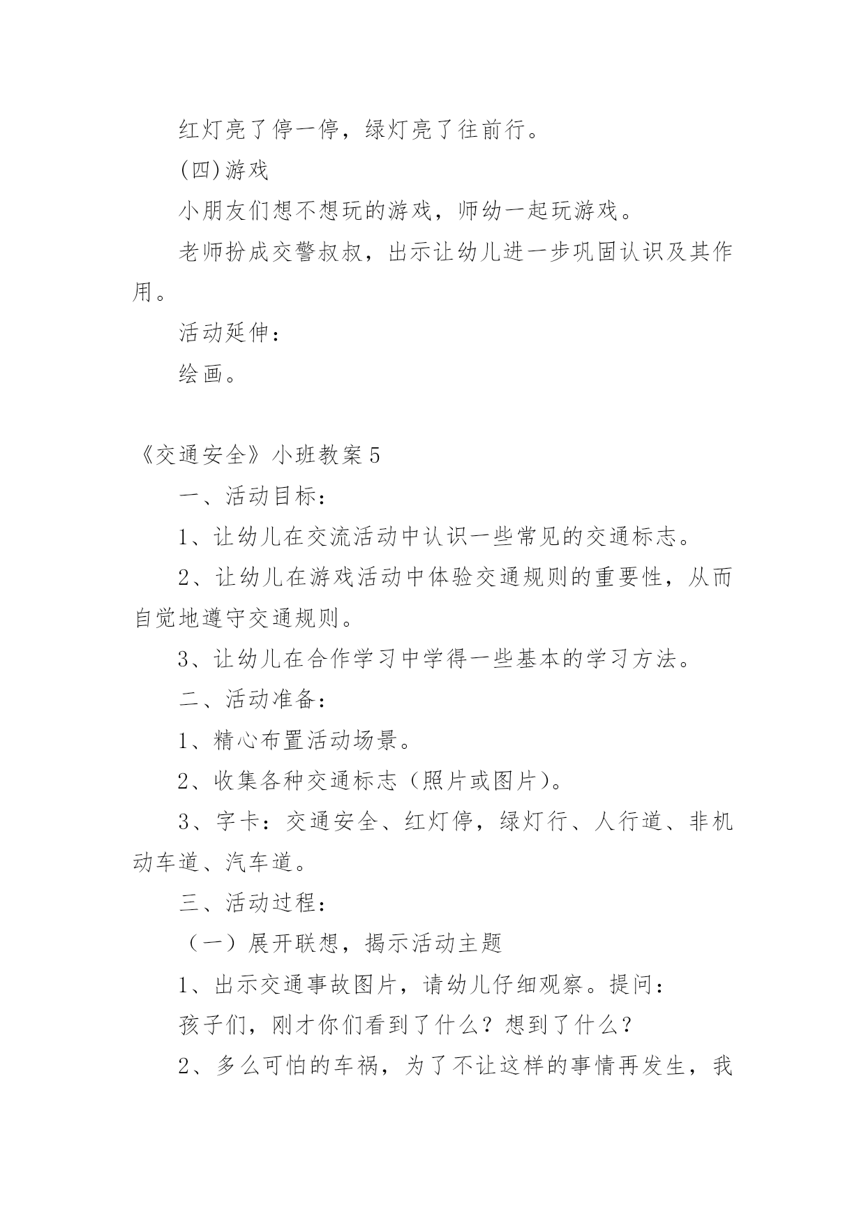 《交通安全》小班教案作为一名教职工,就不得不需要编写教案,借助教案可以恰当地选择和运用教学方法,调动学生学习的积极性。如何把教案做到重点突出呢?以下是小编收集整理的《交通安全》小班教案,供大家参考借鉴,希望可以帮助到有需要的朋友。《交通安全》小班教案1一、教学目标:1.了解交通安全意识,掌握交通安全知识。2.了解佩戴头盔的重要性,掌握佩戴头盔的正确方法。二、教学内容:1.交通安全知识2.佩戴头盔的正确方法三、教学方法:1.讲解法:通过图片、视频等形式向孩子们介绍交通安全知识和佩戴头盔的正确方法。2.互动法:让孩子们互相帮忙佩戴头盔,练习正确佩戴头盔的`方法。四、教学材料:1.头盔2.图片、视频等教学辅助材料五、教学时间:40分钟六、教学过程:1.引入:老师先向孩子们介绍一下交通安全的重要性,告诉孩子们在路上要注意什么,如何避免交通事故。2.交通安全知识:老师通过图片、视频等形式向孩子们介绍一些基本的交通安全知识,如过马路要走人行横道,看红灯停绿灯行等。3.佩戴头盔的正确方法:老师向孩子们展示一下头盔的种类和佩戴方法,并让孩子们互相帮忙佩戴头盔,练习正确佩戴头盔的方法。4.小结:老师再次强调交通安全的重要性,告诉孩子们在日常生活中要时刻注意交通安全,佩戴头盔是保护头部安全的重要措施。七、教学评价:1.观察孩子们的学习情况,检查孩子们是否能正确佩戴头盔。2.通过提问的方式检查孩子们对交通安全知识的掌握情况。《交通安全》小班教案2交通的不断发展促使我们加强交通,让幼儿了解一些危险因素,知道遵守交通规则的重要性,懂得如何保护自己。活动目标1.知道汽车、行人在马路上行走要遵守交通规则,听从的指挥。2.能根据信号做动作。教学重点、难点感知交通常识——,,。活动准备1.卡片红灯、绿灯各一个,两辆玩具小汽车。2.设置马路场景。活动过程一.导入,引起幼儿兴趣。1.师:看看,今天老师给小朋友们带来了什么?(教师出示两辆玩具汽车)2.教师示范,将两辆汽车成十字形相向开来,让幼儿发生了什么事。(汽车相撞)3.师:刚刚发生了什么事?(幼儿回答)二.认识。1.为了避免刚刚的交通事故发生,我们请来了这两位朋友来帮忙。(出示卡片)2.师:有谁认识这两位朋友吗?(幼儿回答)3.师:那有哪位小朋友知道的`作用呢?(幼儿回答)4.教师总结:汽车和行人在马路上行走时,要听从的指挥,红灯亮了停一停,绿灯亮了才能行。三.小汽车按规则行驶。1.师:现在我们让汽车安全行驶一次。(教师按照自己给出的信号操作汽车,如:出示红灯,说红灯红灯我就停,出示绿灯,说绿灯绿灯我就行。)2.教师操作汽车,幼儿给出信号。四.游戏。1.师:现在我们也来开汽车,好不好?2.请两个小朋友来当,一部分小朋友当汽车。3.幼儿做游戏,教师在旁指导。五.游戏结束,教师再次总结。教学反思本节活动主要是从幼儿的兴趣引导,先激发幼儿兴趣,从而认识事物,在参与到游戏中领悟。活动中幼儿积极参与,学习氛围浓厚,大部分幼儿都能在玩中认识到遵守交通的重要性。不足的地方就是,有一小部分幼儿只注重于玩的过程,而没能在过程中认识到游戏的真正意义。所以,如果再重新上这节课,我会在游戏中多让幼儿讨论,让他们自己去倾听领悟。活动目标:《交通安全》小班教案3活动目的:1、教幼儿学习一些交通规则,认识一些交通安全标志。2、幼儿能从小养成遵守交通规则的`习惯。活动准备:情景图片五张。红绿灯标志各一张,交通标志图五张。(一)、小学生交通安全教育教案范文(三篇)(二)、高中交通安全教育班会教案设计范文(三)、学校交通安全应急预案范文(三篇)(四)、小学生交通安全会议记录模板范文(两篇)(五)、小学生交通安全教育主题班会记录(两篇)(六)、幼儿园小班交通安全教案安全过马路活动反思范文(七)、幼儿园小班交通安全活动教案策划(五篇)(八)、幼儿园小班交通安全教案设计(四篇)(九)、交通安全事故心得体会范文(三篇)(十)、幼儿园大班交通安全教案设计(三篇)活动过程:一、猜谜语,导入新课。红绿灯和斑马线,可结合班内墙上的斑马线图案介绍斑马线的作用。二、结合情景图片,学习交通规则。1、幼儿自由举手回答,自己还知道哪些交通规则?2、幼儿说出来的可结合图片讲解,没想到的出示图片,说说图片上的幼儿做的对不对,应该怎样做才是遵守交通规则。三、认识交通安全标志。出示图片,请幼儿猜猜它表示什么?四、学儿歌记交通规则儿歌:交通安全歌红灯停,绿灯行,黄灯请你准备好。天桥地道人行道,横穿马路离不了。头手不出车窗外,不在路上玩游戏。交通规则很重要,我们把它记得牢。五、红绿灯和小司机请两名小朋友,一人扮演红灯,一人扮演绿灯,其他小朋友为小司机,看哪位小司机遵守交通规则。《交通安全》小班教案41、注意安全,初步培养幼儿的自我保护意识。2、能认识简单的交通标记并了解安全通应遵