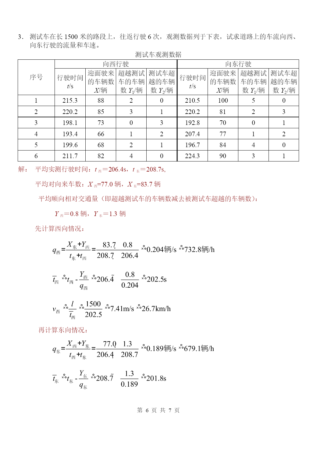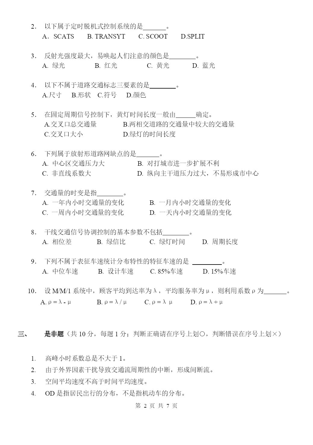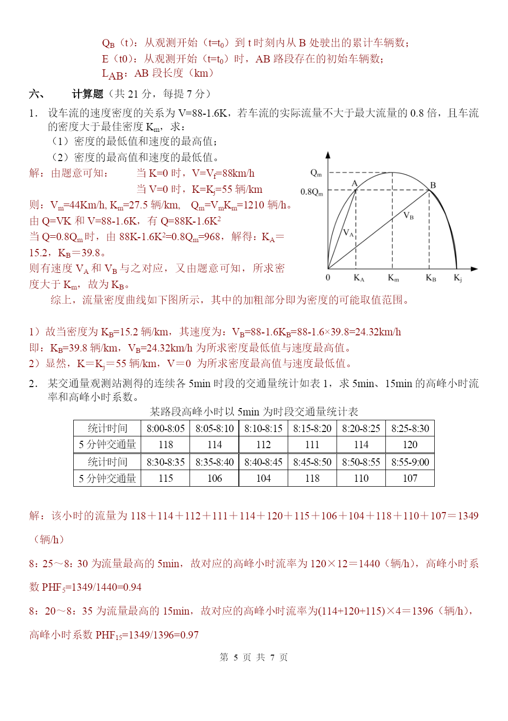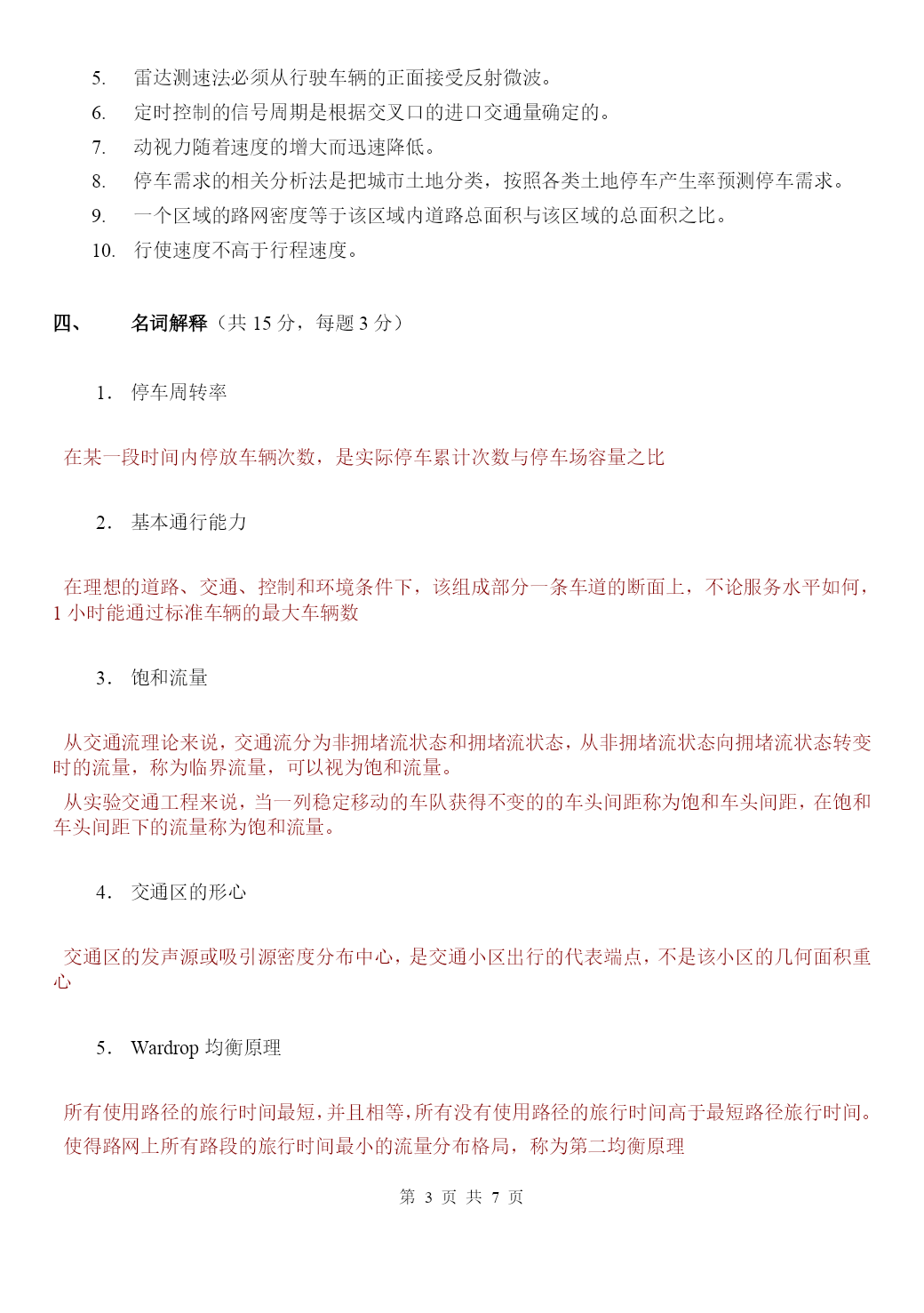 第页共NUMPAGES7页(2006-2007年)东南大学考试卷课程名称交通工程基础姓名学号适用专业交通工程考试形式闭卷考试时间120分钟填充题(24分,每空1分)道路交通系统中的人包括____________、____________和____________。汽车的动力性能通常用、和三个指标来评定。交通信号控制按范围可以划分为、、。由跟车理论知,非自由行驶状态的车队的三个特性是________________。高峰小时流量比指与之比,它反映了交通量的集中度。汽车制动性能主要体现在或两个指标上。我国根据交通事故严重性质把交通事故分为、和。用车辆通过区间的时间(不含停车时间)及其区间距离,获得的车速是。绿信比是指和的比值。道路的功能主要有、、。选择题(10分,每空1分;在填写相应的字母)在交通分配中,最简单的分配方法是。A.用户最优分配法B.全有全无分配法C.系统最优分配法D.增量加载分配法以下属于定时脱机式控制系统的是_______。A.SCATSB.TRANSYTC.SCOOTD.SPLIT反射光强度最大,易唤起人们注意的颜色是。A.绿光B.红光C.黄光D.蓝光以下不属于道路交通标志三要素的是。A.尺寸B.形状C.符号D.颜色在固定周期信号控制下,黄灯时间长度一般由确定。A.交叉口总交通量B.两相交道路的交通量中较大的交通量C.交叉口大小D.绿灯的时间长度下列属于放射形道路网缺点的是。A.中心区交通压力大B.对打城市进一步扩展不利C.非直线系数大D.纵向主干道压力过大,不易形成市中心交通量的时变是指。A.一年内小时交通量的变化B.一月内小时交通量的变化C.一周内小时交通量的变化D.一天内小时交通量的变化干线交通信号协调控制的基本参数不包括。A.相位差B.绿信比C.绿灯时间D.周期长度下列不属于表征车速统计分布特性的特征车速的是。A.中位车速B.设计车速C.85%车速D.15%车速设M/M/1系统中,顾客平均到达率为λ,平均服务率为μ,则利用系数ρ为。A.ρ=λ-μB.ρ=λ/μC.ρ=λμD.ρ=λ+μ是非题(共10分,每题1分;判断正确请在序号上划○,判断错误在序号上划×)高峰小时系数总是不大于1。由于外界因素干扰导致交通流周期性的中断,形成间断流。空间平均速度不高于时间平均速度。OD是指居民出行的分布,不是指机动车的分布。雷达测速法必须从行驶车辆的正面接受反射微波。定时控制的信号周期是根据交叉口的进口交通量确定的。动视力随着速度的增大而迅速降低。停车需求的相关分析法是把城市土地分类,按照各类土地停车产生率预测停车需求。一个区域的路网密度等于该区域内道路总面积与该区域的总面积之比。行使速度不高于行程速度。名词解释(共15分,每题3分)停车周转率在某一段时间内停放车辆次数,是实际停车累计次数与停车场容量之比基本通行能力在理想的道路、交通、控制和环境条件下,该组成部分一条车道的断面上,不论服务水平如何,1小时能通过标准车辆的最大车辆数饱和流量从交通流理论来说,交通流分为非拥堵流状态和拥堵流状态,从非拥堵流状态向拥堵流状态转变时的流量,称为临界流量,可以视为饱和流量。从实验交通工程来说,当一列稳定移动的车队获得不变的的车头间距称为饱和车头间距,在饱和车头间距下的流量称为饱和流量。交通区的形心交通区的发声源或吸引源密度分布中心,是交通小区出行的代表端点,不是该小区的几何面积重心Wardrop均衡原理所有使用路径的旅行时间最短,并且相等,所有没有使用路径的旅行时间高于最短路径旅行时间。使得路网上所有路段的旅行时间最小的流量分布格局,称为第二均衡原理问答题(共20分,每题5分)什么是‘四阶段’交通需求预测法?‘四阶段’预测方法有哪些不足之处?交通量发生和吸引交通量分布交通方式分担交通量分配各阶段模型不统一,没有明确的行为假设;没有考虑个体特性;预测精度与交通小区划分有关叙述智能交通系统(ITS)研究内容的主要构成,并就其中某个子系统简述其内容。1先进的交通管理系统2先进的出行者信息系统3先进的公共交通系统4运营车辆调度系统5先进的乡村运输系统6先进的车辆控制系统7自动公路系统先进的出行者信息系统是ITS的主要部分1出行车信息系统2车载路径诱导系统3停车场停车诱导系统4数字地图数据库简述城市交通规划的层次与范围。规划范围以市区为主,协调好城市间交通与城市内交通的关系、市域内的城镇与中心城镇的交通联系以城市总体规划为基础,满足土地利用对交通的需求,发挥城市道路交通对