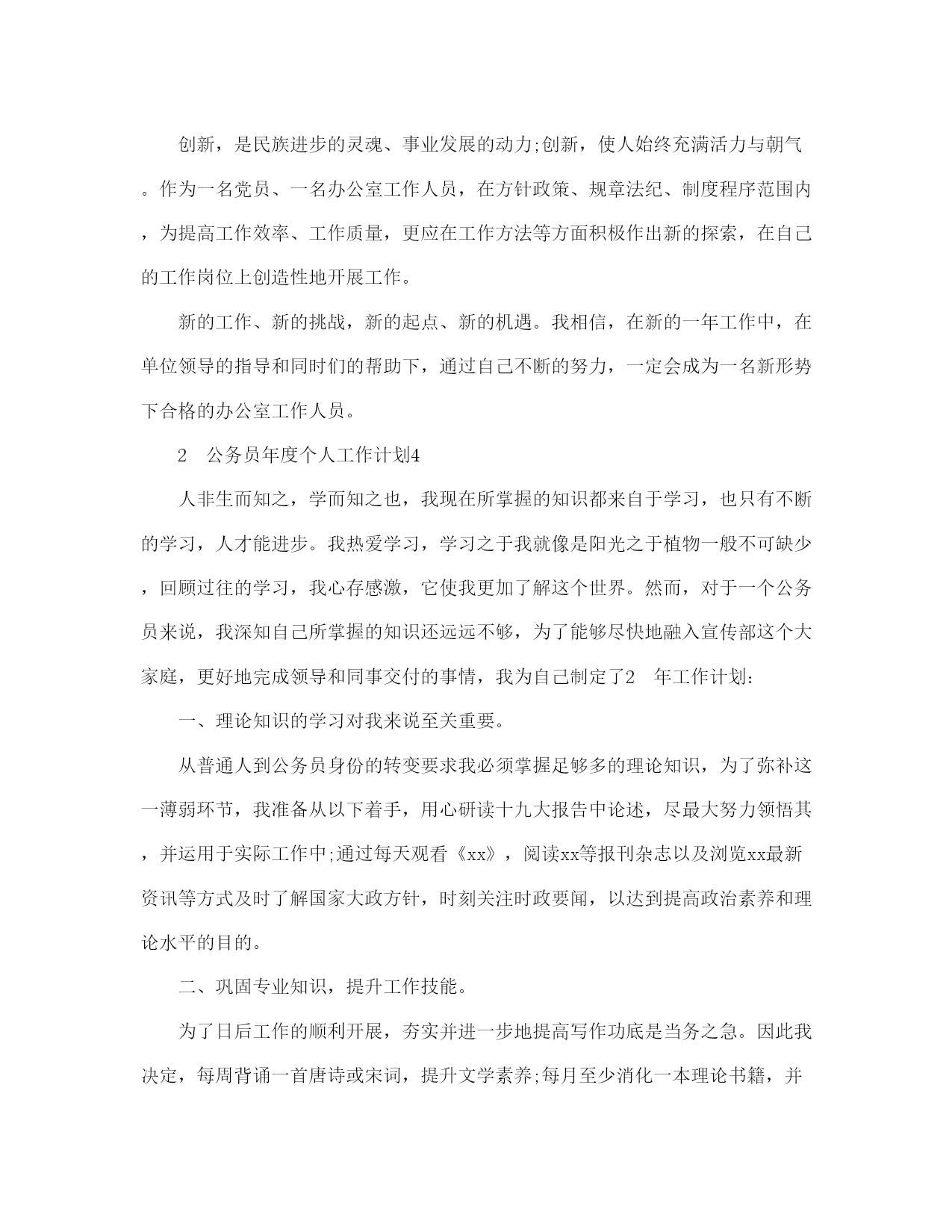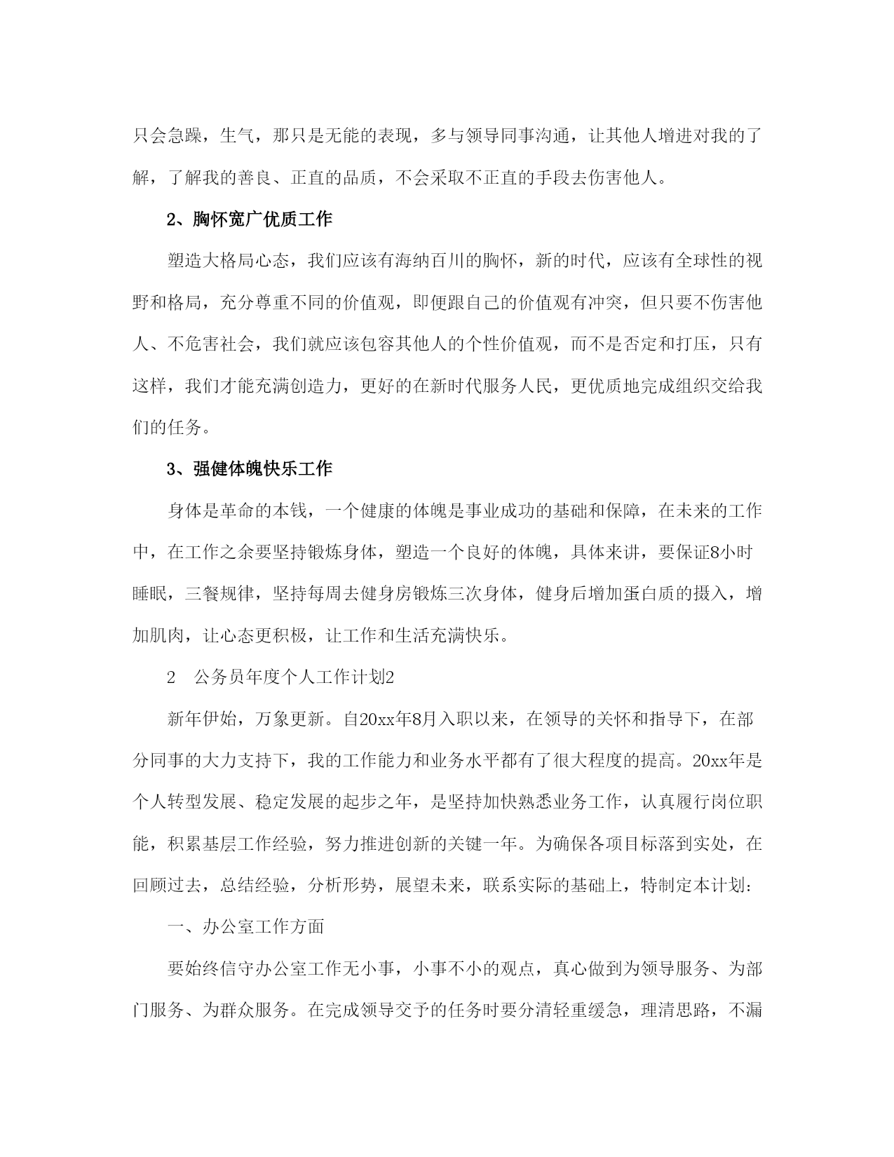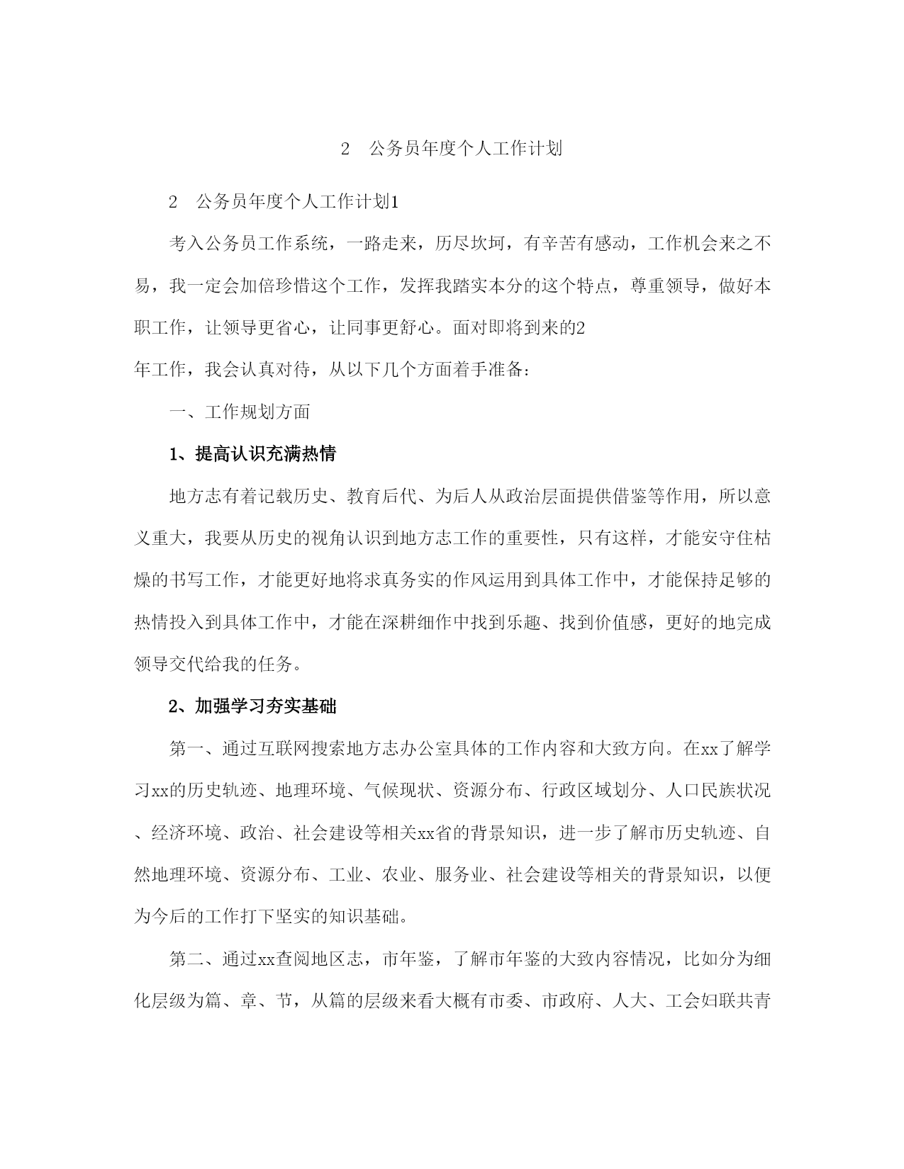 公务员度个人工作计划(完整版)文档资料可直接使用,可编辑,欢迎下载2公务员年度个人工作计划2公务员年度个人工作计划1考入公务员工作系统,一路走来,历尽坎坷,有辛苦有感动,工作机会来之不易,我一定会加倍珍惜这个工作,发挥我踏实本分的这个特点,尊重领导,做好本职工作,让领导更省心,让同事更舒心。面对即将到来的2年工作,我会认真对待,从以下几个方面着手准备:一、工作规划方面1、提高认识充满热情地方志有着记载历史、教育后代、为后人从政治层面提供借鉴等作用,所以意义重大,我要从历史的视角认识到地方志工作的重要性,只有这样,才能安守住枯燥的书写工作,才能更好地将求真务实的作风运用到具体工作中,才能保持足够的热情投入到具体工作中,才能在深耕细作中找到乐趣、找到价值感,更好的地完成领导交代给我的任务。2、加强学习夯实基础第一、通过互联网搜索地方志办公室具体的工作内容和大致方向。在xx了解学习xx的历史轨迹、地理环境、气候现状、资源分布、行政区域划分、人口民族状况、经济环境、政治、社会建设等相关xx省的背景知识,进一步了解市历史轨迹、自然地理环境、资源分布、工业、农业、服务业、社会建设等相关的背景知识,以便为今后的工作打下坚实的知识基础。第二、通过xx查阅地区志,市年鉴,了解市年鉴的大致内容情况,比如分为细化层级为篇、章、节,从篇的层级来看大概有市委、市政府、人大、工会妇联共青团、军事、法制、经济管理、社会等等,具体的行文风格,数据来源,什么是重点内容,大致了解后方便以后工作进一步细化、完善,以后今后工作少走弯路。第三、作为新人,要在志鉴论坛、志鉴纵横、修志法苑中阅读、学习前辈们对地方志工作的观点、看法、要求,吸取精华,了解写志人未来的工作内容、大致方向,可能犯的错误,在未来的实践中不断修正、完善,确保今后的工作让领导和组织满意。第四、通过互联网等新媒体平台了解党最新的动态。比如浏览xx的时政频道—高层动态栏目,了解党和国家领导人的动态,包括外交、参与会议、重大部署等,掌握党的最新形势,以便在今后的工作能紧跟党的指示;让今后的工作更有高度、深度、广度。第五、阅读国务院20xx年下发的《地方志工作条例》,了解国务院对地方志工作的要求,比如对整体工作的规则大致了解,为以后工作能更顺利打下基础。二、人际处理方面1、尊重领导,踏实做事。做好自己份内的工作,实在做事,实在做人,多看他人的优点,少看他人的缺点,对自己要求高一点,对别人宽容大度一点,相信工作氛围就会更融洽团结,工作任务也会完成的更圆满。领导的工作能力和为人处事都是新人学习的榜样,要充分了解领导对工作的具体要求,按照领导的要求按时完成工作,让领导放心,做领导的得力帮手。但是,工作中一定会遇到一些问题,如有些具体的工作的问题我领会不清,或者有自己的看法,会委婉地向领导表达我的看法和意见,在充分尊重领导的前提下以征求领导意见,如果领导仍然不认可我的意见,那么一定会按照领导的意图做事,确保任务圆满完成。2、帮助同事,学习同事。老同事对科室的情况更熟悉,对工作业务更熟练,平时多向老同事学习,向老同事请教,如果老同事工作量比较大,我又有余力的话,一定尽量帮老同事分担他们的工作压力,让整个科室高效工作,圆满完成上级下达的任务。3、如有误会,自省沟通。如果在工作中遇到问题,领导或者同事对我有一些误会。首先我会反省自我,第一反省是不是自己的工作能力不足,如果是工作能力不足,我会在工作之余充实自己的专业知识,提高自己的专业技能,提高自己的工作效率,提升自己的工作质量,让领导满意我的工作内容,第二反省是不是我说话、处理问题方式存在问题,处理问题时没有充分考虑领导、同事的感受,如果是我没有充分照顾领导和同事的情绪,我会调整我说话的方式方法,让领导同事情绪得意照顾,舒心地工作。如果领导和同事仍然对我有一些误会,那么我会多与领导同事相处沟通,比如一起锻炼运动,在娱乐运动放松的状态下,相信领导和同事也会更了解我的为人和个性是实实在在的,不会存在其他负面的思想和作为,以消除我们之间的误会,进而完成好工作。三、个人修养方面1、正直善良自信稳健改正自己性格死板,话语比较少的的毛病,塑造自己一种平和中积极向上的心态,自信、稳重、从容,即便遇到困难和挫折,也会想办法去解决而不是遇到困难只会急躁,生气,那只是无能的表现,多与领导同事沟通,让其他人增进对我的了解,了解我的善良、正直的品质,不会采取不正直的手段去伤害他人。2、胸怀宽广优质工作塑造大格局心态,我们应该有海纳百川的胸怀,新的时代,应该有全球性的视野和格局,充分尊重不同的价值观,即便跟自己的价值观有冲突,但只要不伤害他人、不危害社会,我们就应该包容其他人的个性价值观,而不是否定和打压,只有这样,我们才能充满创造力,更好的在