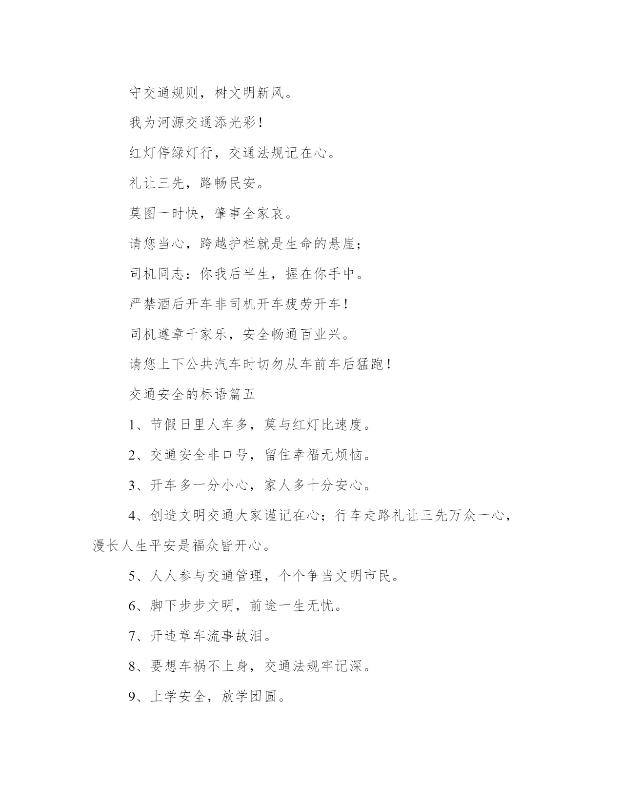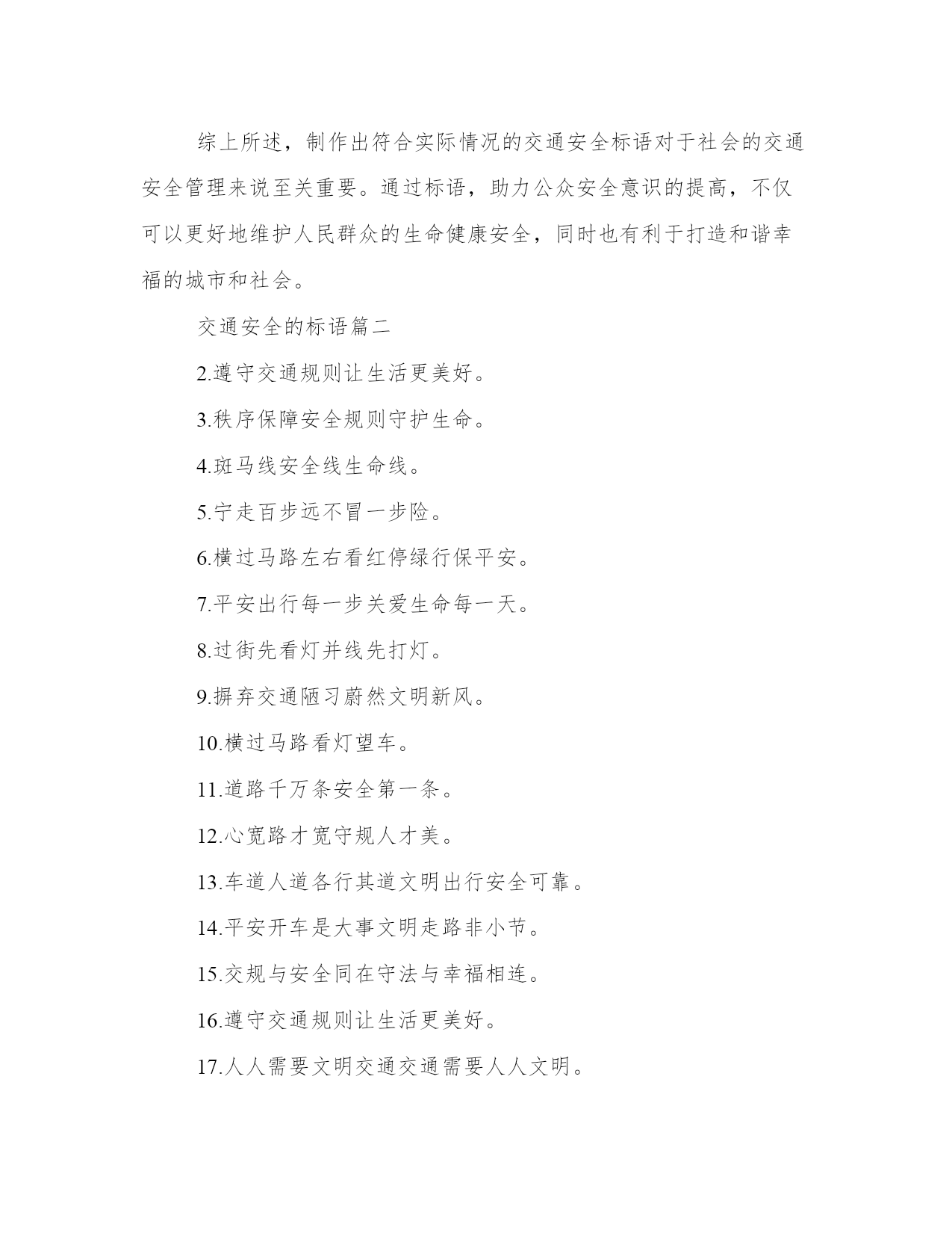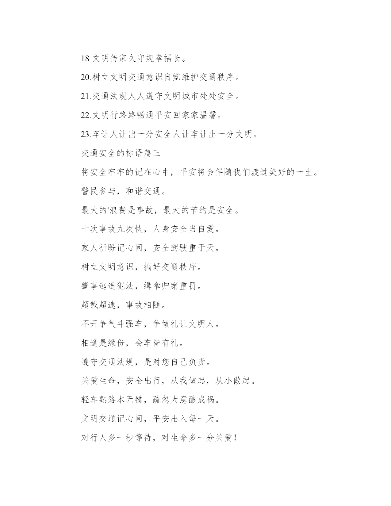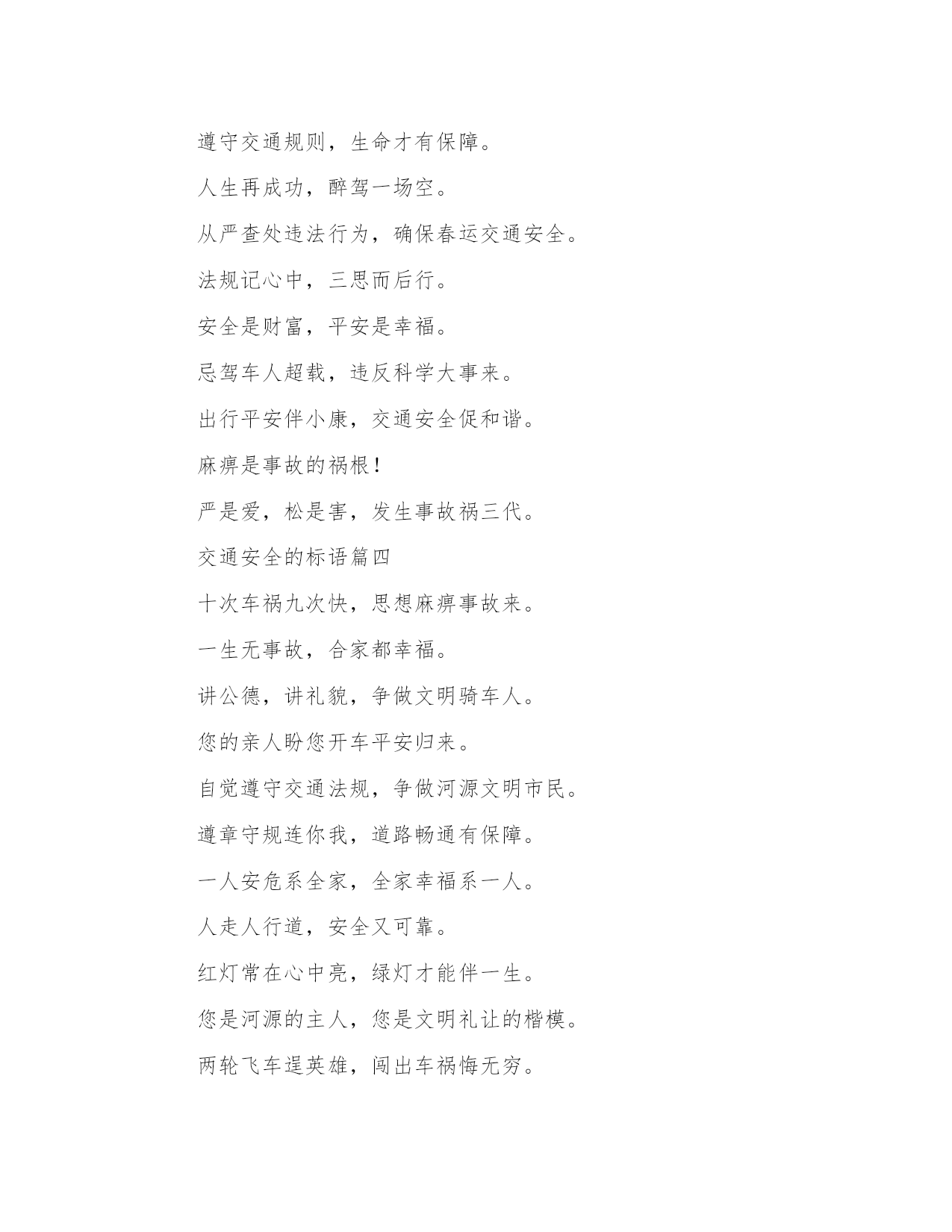 2023年交通安全的标语(精选8篇)在日常的学习、工作、生活中,肯定对各类范文都很熟悉吧。那么我们该如何写一篇较为完美的范文呢?下面是小编帮大家整理的优质范文,仅供参考,大家一起来看看吧。交通安全的标语篇一交通安全一直是我们社会生活中非常重要的问题,而标语则是从各个角度对交通安全进行宣传和教育的有效手段。在这篇文章中,我们将围绕交通安全心得体会标语这一主题进行阐述,从多个角度对标语的意义、作用以及如何制作出符合实际情况并起到良好宣传作用的标语提供帮助。一、标语的意义和作用。标语是用语言艺术的方式来传递信息,号召人们动起来去实现交通安全,不仅弘扬了社会正能量,也有助于增强人们的交通安全意识,引起广大市民对其安全的重视和警觉。而在标语的设计中,也应该具备易读、易懂,充满创意和思想的特点,并且让人们熟记于心。交通安全标语的使用场合通常包括城市交通管理、公共交通、学校教育、高速公路等领域。城市交通管理中,标语可以用来引导交通秩序,保护行人的安全;公共交通领域中,标语可以提醒乘客如何正确使用交通工具,避免交通事故的发生;在学校中,可以制作出多种形式的标语,让学生牢记安全知识;在高速公路上则能起到警醒和提示的作用。三、标语的设计。在标语的设计中,考虑到大部分标语是为了提醒和鼓励人们在交通安全方面做的更好,一般设计师可以从以下方面进行考虑:一是字句要突出,以短小精悍、简单明了的方式表达主旨;二是宣传重点要凸显,突出注重的方面;三是形式要独特,可以将标语融入周边环境中,确保眼球在公共场所显著突出。四、制作标语的方式。制作标语的方式确定了,基本就是进行创意的构思和制作的工具的选择。要制作出一份成功的标语,从图像美学、文字排版和分布规律、色彩搭配等方面进行考虑。需要注意的是,制作标语要有自然环境和具体场景的渗透,以达到接受者产生共鸣的效果。五、标语应用到实际生活中优化。在实际的交通安全工作中,标语的作用是非常重要的,营造了社会的正能量、记录下市民对于安全的态度,更重要的是,它提醒着我们,安全是生命的保障,希望人们能够遵守相关交通规则,并做出诚实守信、法治自觉的公民行为。与此同时,制作好的标语不仅可以用于激励社会积极参与到交通管理中来,更可以作为思想启示,让我们在日常的生活中多关注、多维护,为交通安全大事出一份力。综上所述,制作出符合实际情况的交通安全标语对于社会的交通安全管理来说至关重要。通过标语,助力公众安全意识的提高,不仅可以更好地维护人民群众的生命健康安全,同时也有利于打造和谐幸福的城市和社会。交通安全的标语篇二2.遵守交通规则让生活更美好。3.秩序保障安全规则守护生命。4.斑马线安全线生命线。5.宁走百步远不冒一步险。6.横过马路左右看红停绿行保平安。7.平安出行每一步关爱生命每一天。8.过街先看灯并线先打灯。9.摒弃交通陋习蔚然文明新风。10.横过马路看灯望车。11.道路千万条安全第一条。12.心宽路才宽守规人才美。13.车道人道各行其道文明出行安全可靠。14.平安开车是大事文明走路非小节。15.交规与安全同在守法与幸福相连。16.遵守交通规则让生活更美好。17.人人需要文明交通交通需要人人文明。18.文明传家久守规幸福长。20.树立文明交通意识自觉维护交通秩序。21.交通法规人人遵守文明城市处处安全。22.文明行路路畅通平安回家家温馨。23.车让人让出一分安全人让车让出一分文明。交通安全的标语篇三将安全牢牢的记在心中,平安将会伴随我们渡过美好的一生。警民参与,和谐交通。最大的'浪费是事故,最大的节约是安全。十次事故九次快,人身安全当自爱。家人祈盼记心间,安全驾驶重于天。树立文明意识,搞好交通秩序。肇事逃逸犯法,缉拿归案重罚。超载超速,事故相随。不开争气斗强车,争做礼让文明人。相逢是缘份,会车皆有礼。遵守交通法规,是对您自己负责。关爱生命,安全出行,从我做起,从小做起。轻车熟路本无错,疏忽大意酿成祸。文明交通记心间,平安出入每一天。对行人多一秒等待,对生命多一分关爱!遵守交通规则,生命才有保障。人生再成功,醉驾一场空。从严查处违法行为,确保春运交通安全。法规记心中,三思而后行。安全是财富,平安是幸福。忌驾车人超载,违反科学大事来。出行平安伴小康,交通安全促和谐。麻痹是事故的祸根!严是爱,松是害,发生事故祸三代。交通安全的标语篇四十次车祸九次快,思想麻痹事故来。一生无事故,合家都幸福。讲公德,讲礼貌,争做文明骑车人。您的亲人盼您开车平安归来。自觉遵守交通法规,争做河源文明市民。遵章守规连你我,道路畅通有保障。一人安危系全家,全家幸福系一人。人走人行道,安全又可靠。红灯常在心中亮,绿灯才能伴一生。您