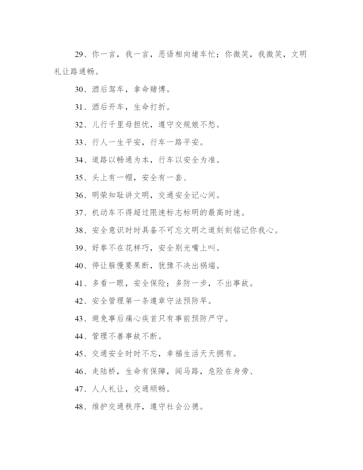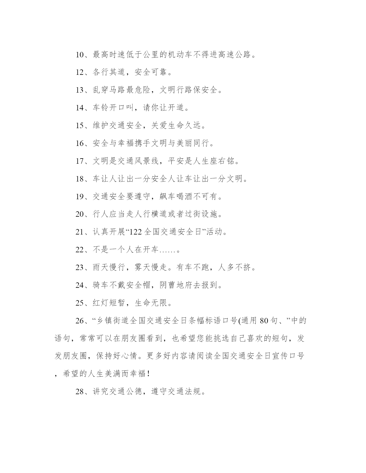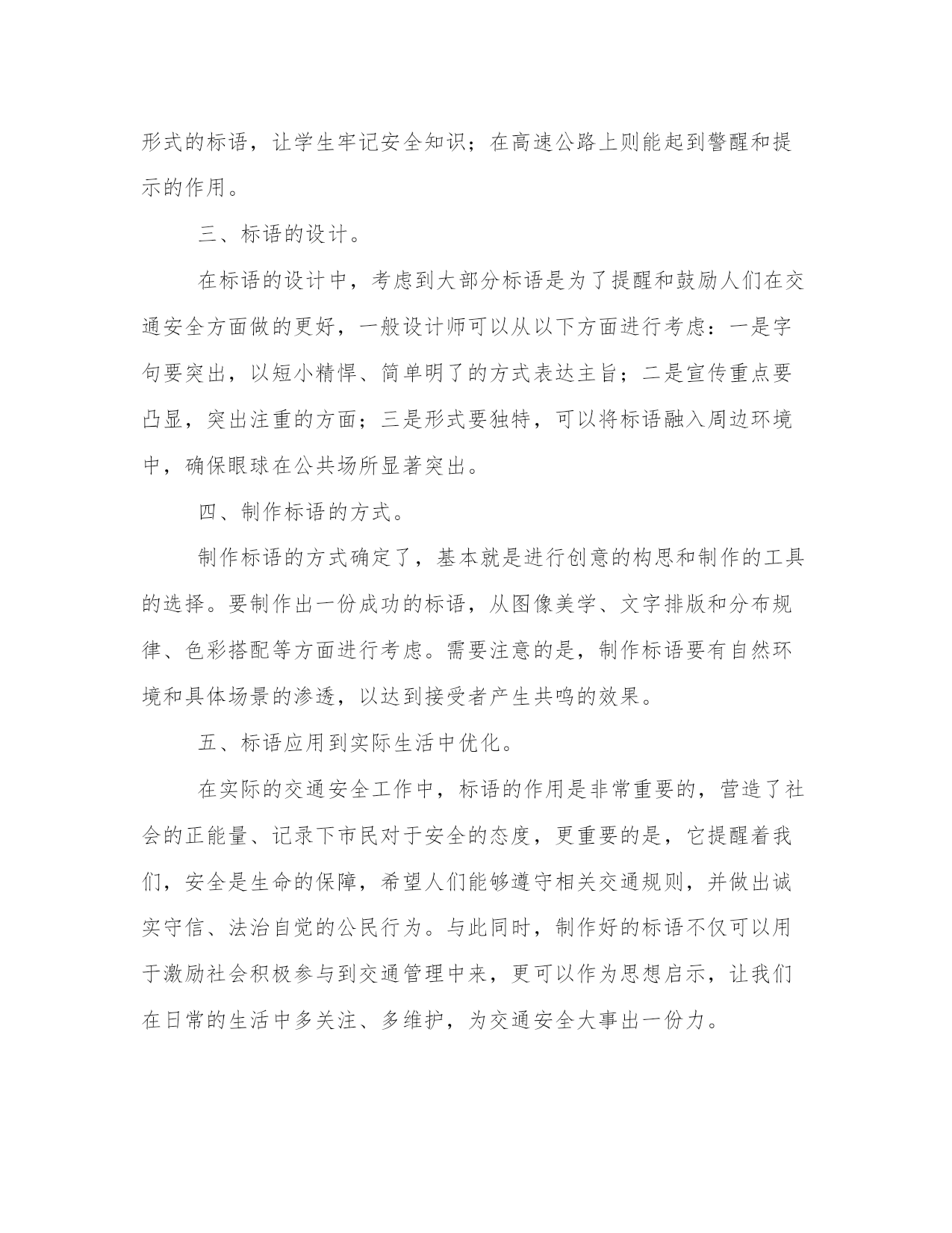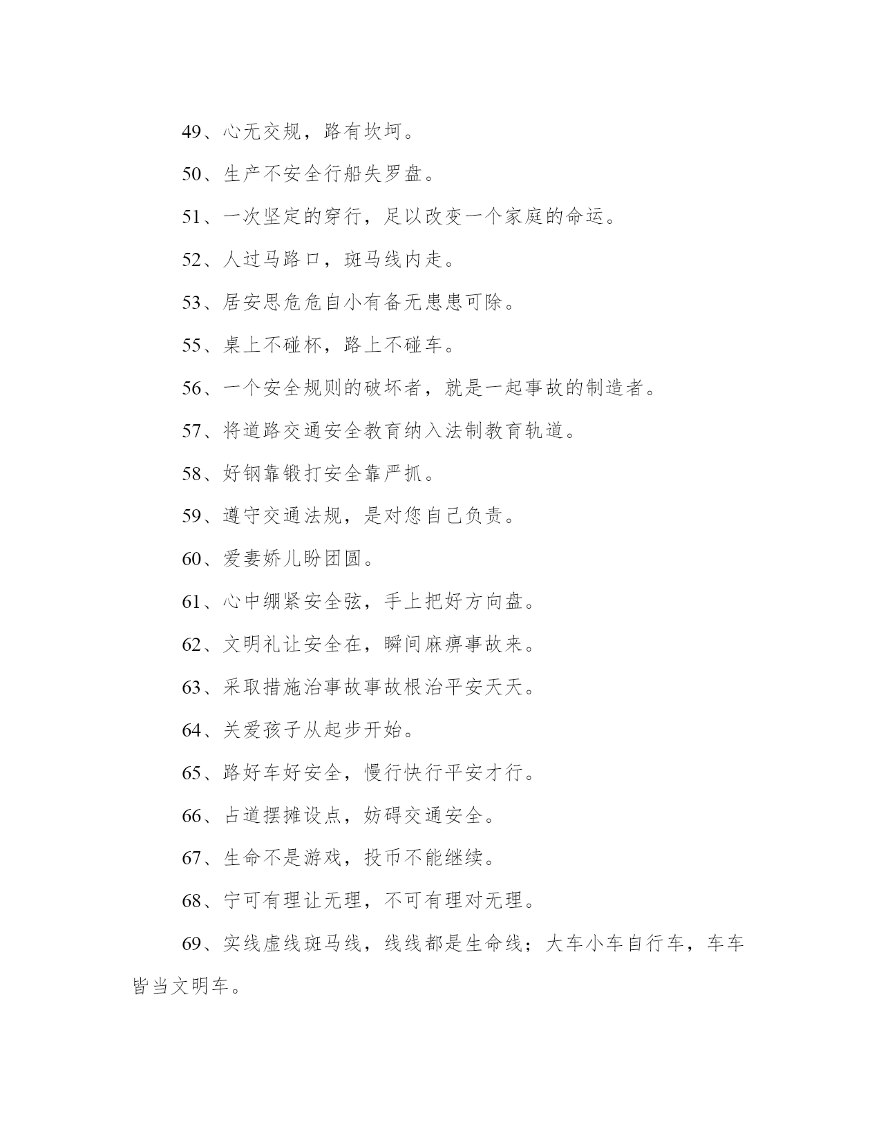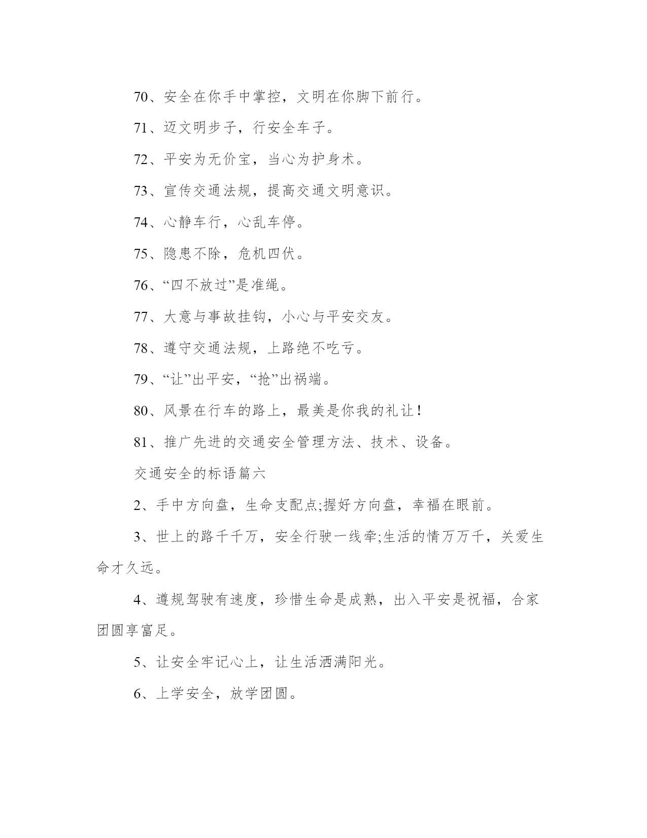2023年交通安全的标语(精选8篇)在日常的学习、工作、生活中,肯定对各类范文都很熟悉吧。那么我们该如何写一篇较为完美的范文呢?下面是小编帮大家整理的优质范文,仅供参考,大家一起来看看吧。交通安全的标语篇一交通安全一直是我们社会生活中非常重要的问题,而标语则是从各个角度对交通安全进行宣传和教育的有效手段。在这篇文章中,我们将围绕交通安全心得体会标语这一主题进行阐述,从多个角度对标语的意义、作用以及如何制作出符合实际情况并起到良好宣传作用的标语提供帮助。一、标语的意义和作用。标语是用语言艺术的方式来传递信息,号召人们动起来去实现交通安全,不仅弘扬了社会正能量,也有助于增强人们的交通安全意识,引起广大市民对其安全的重视和警觉。而在标语的设计中,也应该具备易读、易懂,充满创意和思想的特点,并且让人们熟记于心。交通安全标语的使用场合通常包括城市交通管理、公共交通、学校教育、高速公路等领域。城市交通管理中,标语可以用来引导交通秩序,保护行人的安全;公共交通领域中,标语可以提醒乘客如何正确使用交通工具,避免交通事故的发生;在学校中,可以制作出多种形式的标语,让学生牢记安全知识;在高速公路上则能起到警醒和提示的作用。三、标语的设计。在标语的设计中,考虑到大部分标语是为了提醒和鼓励人们在交通安全方面做的更好,一般设计师可以从以下方面进行考虑:一是字句要突出,以短小精悍、简单明了的方式表达主旨;二是宣传重点要凸显,突出注重的方面;三是形式要独特,可以将标语融入周边环境中,确保眼球在公共场所显著突出。四、制作标语的方式。制作标语的方式确定了,基本就是进行创意的构思和制作的工具的选择。要制作出一份成功的标语,从图像美学、文字排版和分布规律、色彩搭配等方面进行考虑。需要注意的是,制作标语要有自然环境和具体场景的渗透,以达到接受者产生共鸣的效果。五、标语应用到实际生活中优化。在实际的交通安全工作中,标语的作用是非常重要的,营造了社会的正能量、记录下市民对于安全的态度,更重要的是,它提醒着我们,安全是生命的保障,希望人们能够遵守相关交通规则,并做出诚实守信、法治自觉的公民行为。与此同时,制作好的标语不仅可以用于激励社会积极参与到交通管理中来,更可以作为思想启示,让我们在日常的生活中多关注、多维护,为交通安全大事出一份力。综上所述,制作出符合实际情况的交通安全标语对于社会的交通安全管理来说至关重要。通过标语,助力公众安全意识的提高,不仅可以更好地维护人民群众的生命健康安全,同时也有利于打造和谐幸福的城市和社会。交通安全的标语篇二2.遵守交通规则让生活更美好。3.秩序保障安全规则守护生命。4.斑马线安全线生命线。5.宁走百步远不冒一步险。6.横过马路左右看红停绿行保平安。7.平安出行每一步关爱生命每一天。8.过街先看灯并线先打灯。9.摒弃交通陋习蔚然文明新风。10.横过马路看灯望车。11.道路千万条安全第一条。12.心宽路才宽守规人才美。13.车道人道各行其道文明出行安全可靠。14.平安开车是大事文明走路非小节。15.交规与安全同在守法与幸福相连。16.遵守交通规则让生活更美好。17.人人需要文明交通交通需要人人文明。18.文明传家久守规幸福长。20.树立文明交通意识自觉维护交通秩序。21.交通法规人人遵守文明城市处处安全。22.文明行路路畅通平安回家家温馨。23.车让人让出一分安全人让车让出一分文明。交通安全的标语篇三将安全牢牢的记在心中,平安将会伴随我们渡过美好的一生。警民参与,和谐交通。最大的'浪费是事故,最大的节约是安全。十次事故九次快,人身安全当自爱。家人祈盼记心间,安全驾驶重于天。树立文明意识,搞好交通秩序。肇事逃逸犯法,缉拿归案重罚。超载超速,事故相随。不开争气斗强车,争做礼让文明人。相逢是缘份,会车皆有礼。遵守交通法规,是对您自己负责。关爱生命,安全出行,从我做起,从小做起。轻车熟路本无错,疏忽大意酿成祸。文明交通记心间,平安出入每一天。对行人多一秒等待,对生命多一分关爱!遵守交通规则,生命才有保障。人生再成功,醉驾一场空。从严查处违法行为,确保春运交通安全。法规记心中,三思而后行。安全是财富,平安是幸福。忌驾车人超载,违反科学大事来。出行平安伴小康,交通安全促和谐。麻痹是事故的祸根!严是爱,松是害,发生事故祸三代。交通安全的标语篇四十次车祸九次快,思想麻痹事故来。一生无事故,合家都幸福。讲公德,讲礼貌,争做文明骑车人。您的亲人盼您开车平安归来。自觉遵守交通法规,争做河源文明市民。遵章守规连你我,道路畅通有保障。一人安危系全家,全家幸福系一人。人走人行道,安全又可靠。红灯常在心中亮,绿灯才能伴一生。您
