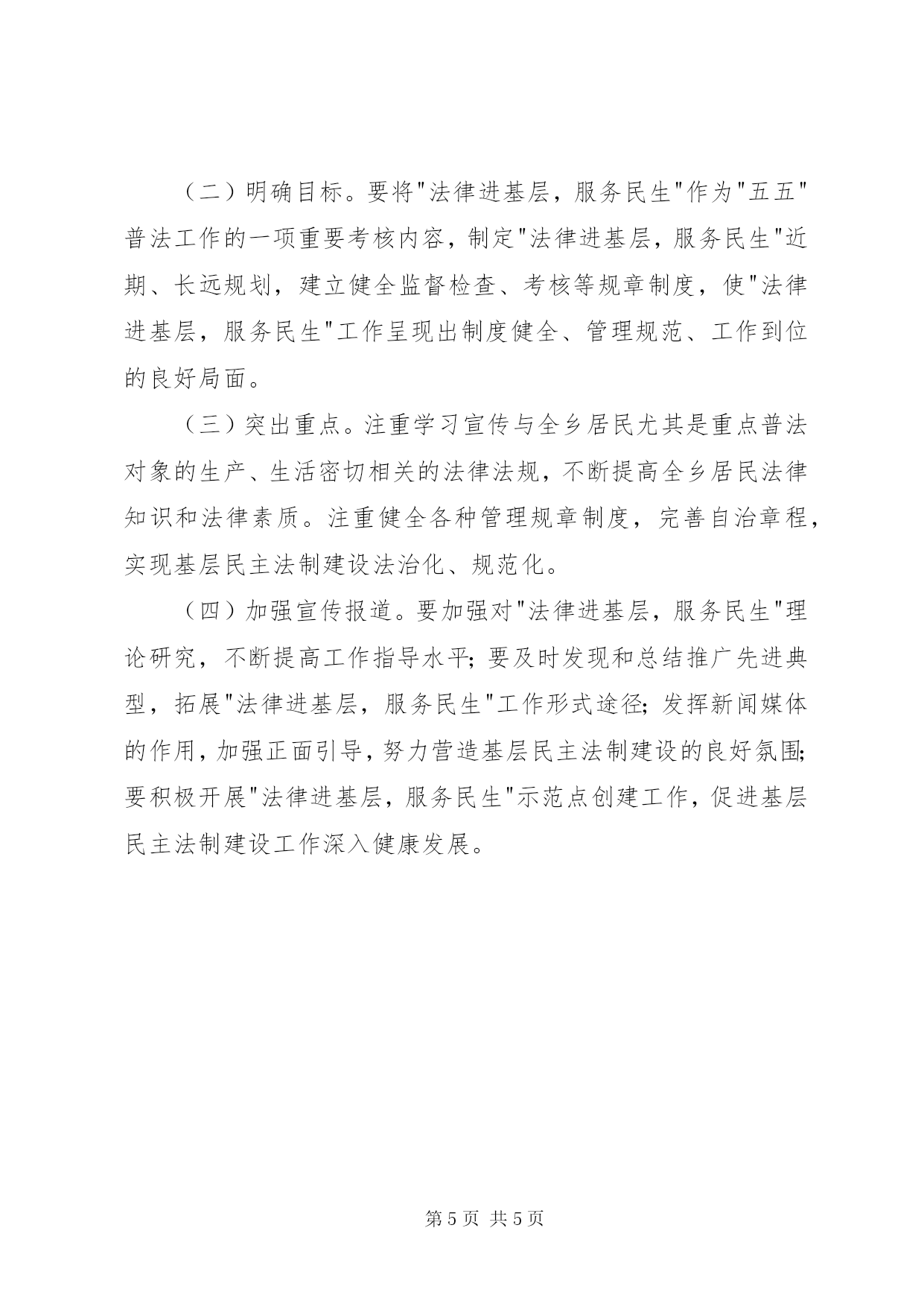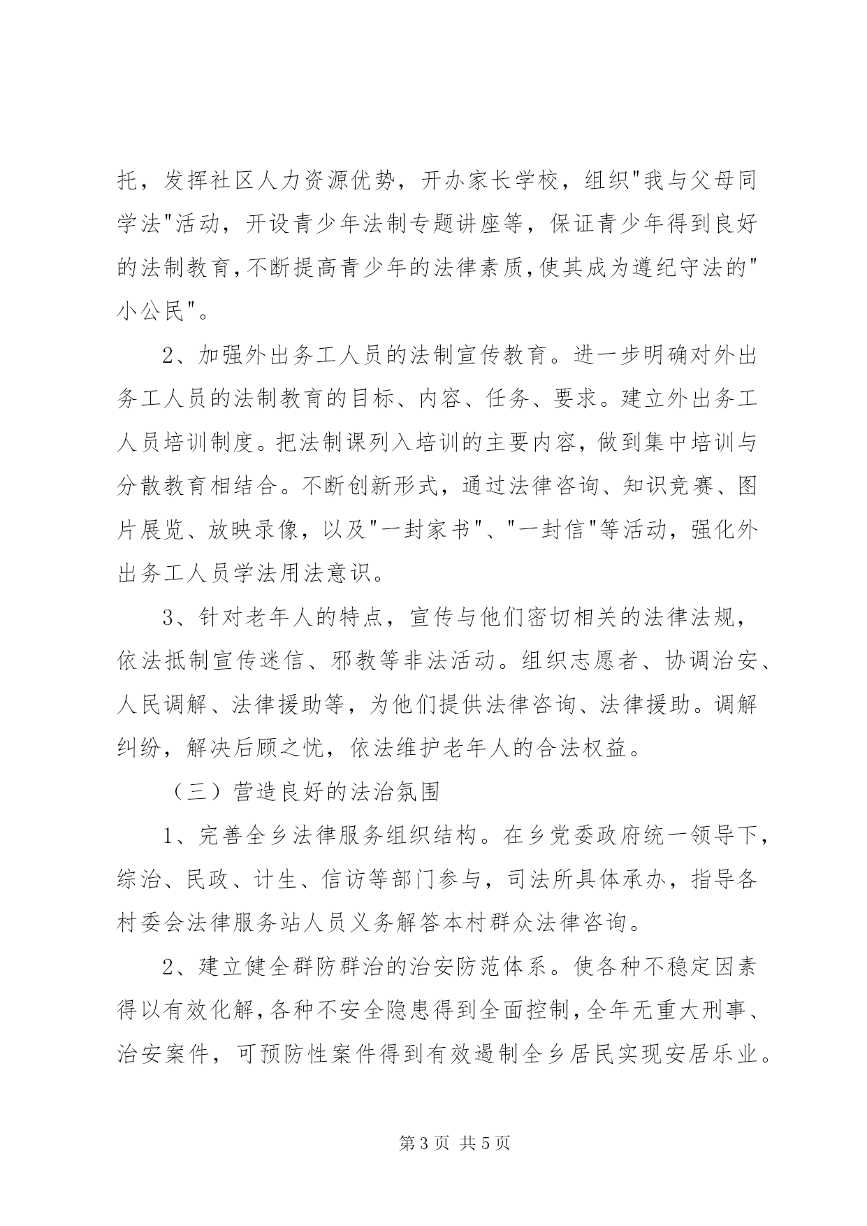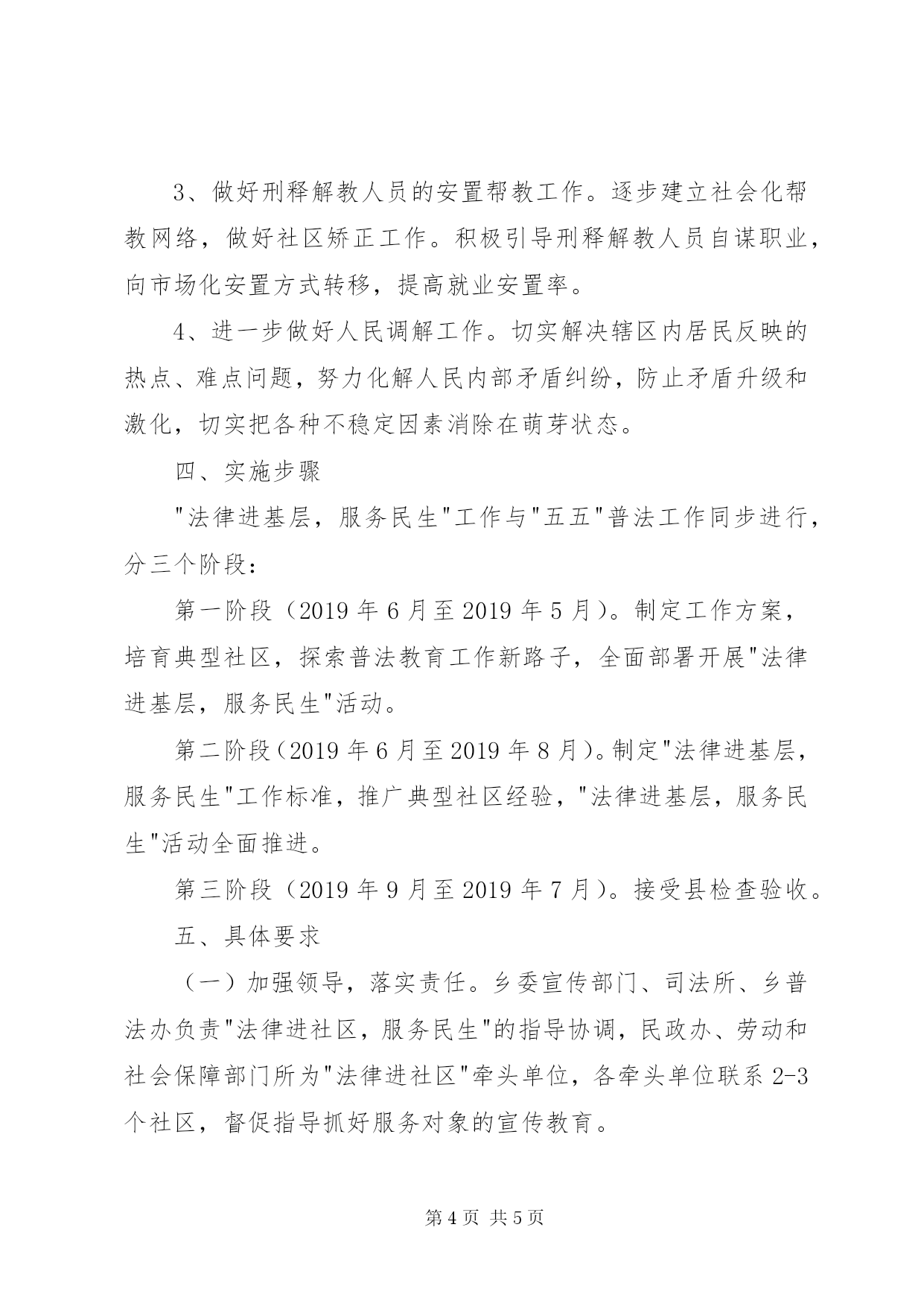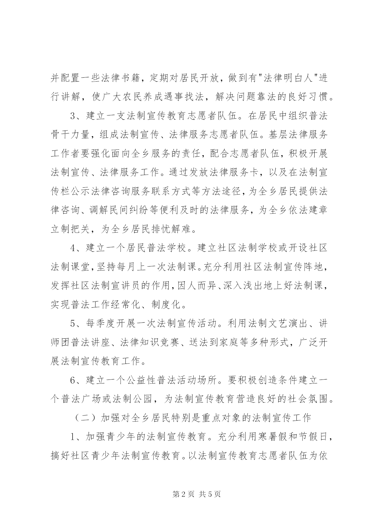 第PAGE\*Arabic\*MERGEFORMAT5页共NUMPAGES\*MERGEFORMAT5页社区普法活动方案"走进基层,服务民生"实施方案为认真落实环城乡"五五"普法规划,增强全乡广大居民学法用法意识,促进管理有序、文明祥和的新型社会主义新农村建设,积极探索环城乡法制宣传教育新途径,丰富全乡法制宣传教育形式,结合我乡普法依法治理工作实际,制定本实施方案。一、工作目标通过开展"法律进基层,服务民生"活动,使全乡居民的法律意识和法律素质进一步提高,依法维护自身合法权益的能力不断增强。村屯管理、服务的规章制度进一步健全,监督机制进一步完善,广大农民参与管理基层公共事务的权利得到切实尊重和保障,在社区形成良好的社会法治氛围,实现民主选举、民主决策、民主管理、民主监督。为全乡居民安居乐业创造良好的法治环境。(一)"法律进社区,服务民生"工作做到"六个一"二、工作对象"法律进基层,服务民生"活动要以全乡广大居民为服务对象。突出抓好青少年、外出务工人员。老年人的法制宣传教育。三、措施任务、各村设置一个法制宣传栏(橱窗)。将与全村居民切身利益相关的法律知识、新颁布的法律法规定期载入专栏,运用通俗易懂的语言、漫画,结合具体事例"说"法。2、在各村要建立一个法律图书角(柜)。在各村开辟场所,并配置一些法律书籍,定期对居民开放,做到有"法律明白人"进行讲解,使广大农民养成遇事找法,解决问题靠法的良好习惯。3、建立一支法制宣传教育志愿者队伍。在居民中组织普法骨干力量,组成法制宣传、法律服务志愿者队伍。基层法律服务工作者要强化面向全乡服务的责任,配合志愿者队伍,积极开展法制宣传、法律服务工作。通过发放法律服务卡,以及在法制宣传栏公示法律咨询服务联系方式等方法途径,为全乡居民提供法律咨询、调解民间纠纷等便利及时的法律服务,为全乡依法建章立制把关,为全乡居民排忧解难。4、建立一个居民普法学校。建立社区法制学校或开设社区法制课堂,坚持每月上一次法制课。充分利用社区法制宣传阵地,发挥社区法制宣讲员的作用,因人而异、深入浅出地上好法制课,实现普法工作经常化、制度化。5、每季度开展一次法制宣传活动。利用法制文艺演出、讲师团普法讲座、法律知识竞赛、送法到家庭等多种形式,广泛开展法制宣传教育工作。6、建立一个公益性普法活动场所。要积极创造条件建立一个普法广场或法制公园,为法制宣传教育营造良好的社会氛围。(二)加强对全乡居民特别是重点对象的法制宣传工作l、加强青少年的法制宣传教育。充分利用寒暑假和节假日,搞好社区青少年法制宣传教育。以法制宣传教育志愿者队伍为依托,发挥社区人力资源优势,开办家长学校,组织"我与父母同学法"活动,开设青少年法制专题讲座等,保证青少年得到良好的法制教育,不断提高青少年的法律素质,使其成为遵纪守法的"小公民"。2、加强外出务工人员的法制宣传教育。进一步明确对外出务工人员的法制教育的目标、内容、任务、要求。建立外出务工人员培训制度。把法制课列入培训的主要内容,做到集中培训与分散教育相结合。不断创新形式,通过法律咨询、知识竞赛、图片展览、放映录像,以及"一封家书"、"一封信"等活动,强化外出务工人员学法用法意识。3、针对老年人的特点,宣传与他们密切相关的法律法规,依法抵制宣传迷信、邪教等非法活动。组织志愿者、协调治安、人民调解、法律援助等,为他们提供法律咨询、法律援助。调解纠纷,解决后顾之忧,依法维护老年人的合法权益。(三)营造良好的法治氛围1、完善全乡法律服务组织结构。在乡党委政府统一领导下,综治、民政、计生、信访等部门参与,司法所具体承办,指导各村委会法律服务站人员义务解答本村群众法律咨询。2、建立健全群防群治的治安防范体系。使各种不稳定因素得以有效化解,各种不安全隐患得到全面控制,全年无重大刑事、治安案件,可预防性案件得到有效遏制全乡居民实现安居乐业。3、做好刑释解教人员的安置帮教工作。逐步建立社会化帮教网络,做好社区矫正工作。积极引导刑释解教人员自谋职业,向市场化安置方式转移,提高就业安置率。4、进一步做好人民调解工作。切实解决辖区内居民反映的热点、难点问题,努力化解人民内部矛盾纠纷,防止矛盾升级和激化,切实把各种不稳定因素消除在萌芽状态。四、实施步骤"法律进基层,服务民生"工作与"五五"普法工作同步进行,分三个阶段:第一阶段(2019年6月至2019年5月)。制定工作方案,培育典型社区,探索普法教育工作新路子,全面部署开展"法律进基层,服务民生"活动。第二阶段(2019年6月至2019年8月)。制定"法律进基层,服务民生"工作标准,推广典型社区经验,"法律进基层,服务民生"活动全面推进。第三阶段(2019年9月至2019年7月)。接受县检查验收。五、具体要求(一)加强领导,落实责任。乡委宣传部门、司法