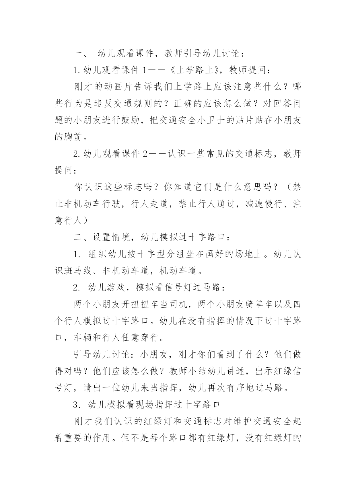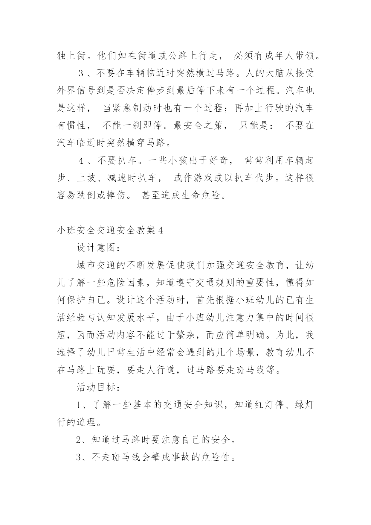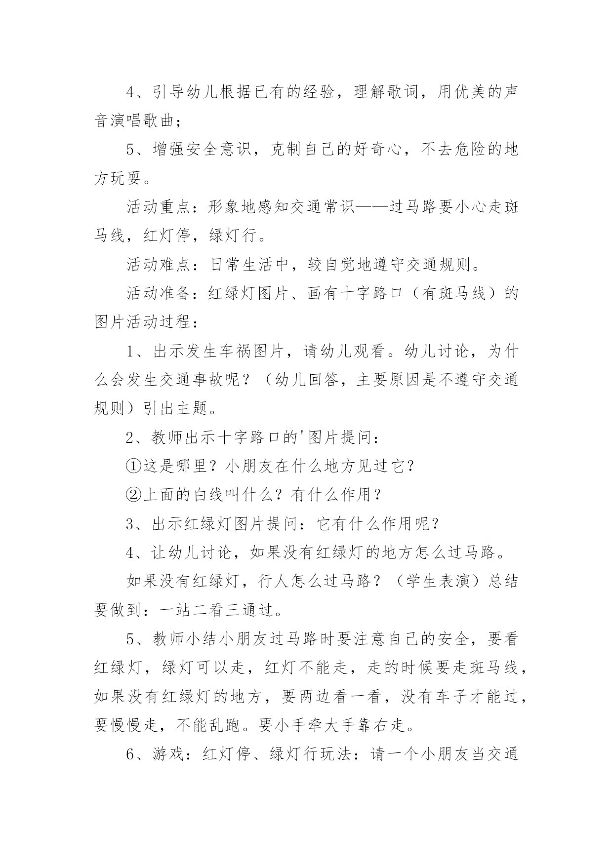 小班安全交通安全教案作为一名教职工,总归要编写教案,教案是保证教学取得成功、提高教学质量的基本条件。那要怎么写好教案呢?下面是小编帮大家整理的小班安全交通安全教案,希望对大家有所帮助。小班安全交通安全教案1活动目标:1、让幼儿了解一些基本的交通安全知识,知道红灯停,绿灯行的道理。2、知道过马路时要注意自己的安全,让幼儿知道不走斑马线的危险性。3、让幼儿学会念儿歌,进一步培养幼儿的幼儿的语言表达能力。4、培养幼儿敏锐的观察能力。5、加强幼儿的安全意识。活动准备:1、图片红绿灯、斑马线2、儿歌《交通灯》活动过程:1、手指游戏,稳定幼儿情绪。"小朋友们伸出小手,跟叔叔一起玩个手指游戏好不好?"2、谈话,引入主题。"小朋友们知道怎样过马路吗?过马路时应该注意些什么?"(幼儿讨论)3、出示图片,提高幼儿兴趣。"我们小班小朋友太乖了,叔叔让你们看以些图片好不好?想不想看?小朋友们把小眼睛闭上,叔叔把小图片请出来,3,2,1,好了,睁开小眼睛。""这是什么呀?(红绿灯)小朋友们见过吗?小朋友们跟爸爸妈妈上街的时候有没有见过?"(幼儿讨论)4、引导幼儿认识红绿灯"小班小朋友真棒,叔叔来告诉小朋友,这个是红绿灯,小朋友们跟爸爸妈妈上街时候可以看一看,马路上的`十字路口就有了。"5、引导幼儿讨论"我们小班小朋友那么聪明,那么,你们知道要怎样看红绿灯吗?"(幼儿讨论)6、讲解怎样安全过马路"小朋友说街上车多不多?危不危险?所以小朋友们一定要知道怎样看红绿灯是不是。那小朋友们要张开小嘴巴跟叔叔学了好不好。""红灯停(出示图片红灯),绿灯行(出示图片绿灯)。"(反复教幼儿三遍)7、引导幼儿认识斑马线"小朋友们看,这又是什么呀?你们有没有见过"(同上,介绍红绿灯时一样)"小朋友们张开小嘴巴跟叔叔念,过马路要走斑马线"8、引导幼儿学习儿歌"今天中三班小朋友表现太棒了,叔叔来你们一首儿歌好不好?每个小朋友都要张开小嘴巴跟叔叔读了,叔叔来一下,看哪个小朋友的声音最好听,等一下我们就送小星星给它。"9、带幼儿读儿歌(引导幼儿读第一遍,鼓励幼儿读第二遍,表扬幼儿读得棒,提到幼儿兴趣,读第三遍。)10、延伸"小朋友跟爸爸妈妈上街时候还要注意些什么呀?"(做公车时先下后上,上街时要拉好爸爸妈妈的手,不能攀爬街上的护栏等等)11、请小朋友跟图片红绿灯说再见,活动结束。儿歌交通灯,会说话黄灯说,请注意红灯说,快停下绿灯说,请走吧牢记他们说的话按照红黄绿行动做个文明好娃娃。手指游戏一个手指一个手指,变成大山两个手指两个手指,变成剪刀三个手指三个手指,变成水母四个手指四个手指,变成胡须五个手指五个手指,变成海鸥,飞走了。教学反思:孩子们对交通安全有一定的认知,能较客观的认定其他人行为的对与错。在活动中,幼儿的语言表达能力有了很大的进步,尤其是对于自己比较了解的事情,语言的条理性很强。由此可见,生活经验的积累对幼儿的思维、语言发展起着很重要的作用。小班安全交通安全教案2活动目标:1.幼儿了解一些基本的道路交通安全知识,认识一些常见的交通标志。2.幼儿能积极参与到活动中来,在游戏活动中体验交通规则的重要性,懂得如何在实际情景中运用所知道的交通安全知识。3.幼儿养成自觉地遵守交通规则的好习惯。活动重点:幼儿了解一些基本的道路交通安全知识,认识一些常见的交通标志。活动难点:幼儿在游戏活动中体验交通规则的重要性,懂得如何在实际情景中运用所知道的交通安全知识。活动准备:物质准备:课件,儿童自行车两辆,小汽车(扭扭车)两辆,红绿信号灯标志,汽车方向盘4个,一顶警帽,交通安全小卫士的.贴纸。经验准备:幼儿知道一些简单的道路交通安全知识。场地准备:布置好活动场景(模拟十字路口),画好机动车道、非机动车道、人行横道。活动过程:一、幼儿观看课件,教师引导幼儿讨论:1.幼儿观看课件1――《上学路上》,教师提问:刚才的动画片告诉我们上学路上应该注意些什么?哪些行为是违反交通规则的?正确的应该怎么做?对回答问题的小朋友进行鼓励,把交通安全小卫士的贴片贴在小朋友的胸前。2.幼儿观看课件2――认识一些常见的交通标志,教师提问:你认识这些标志吗?你知道它们是什么意思吗?(禁止非机动车行驶,行人走道,禁止行人通过,减速慢行、注意行人)二、设置情境,幼儿模拟过十字路口:1.组织幼儿按十字型分组坐在画好的场地上。幼儿认识斑马线、非机动车道,机动车道。2.幼儿游戏,模拟看信号灯过马路:两个小朋友开扭扭车当司机,两个小朋友骑单车以及四个行人模拟过十字路口。幼儿在没有指挥的情况下过十字路口,车辆和行人任意穿行。引导幼儿讨论:小朋友,刚才你们看到了什么?他们做得对吗?他们应该怎么做?教师小结幼儿讲述,出示红绿信号灯,请出一位幼儿来当指挥,幼儿再次有序地过马路。3.幼儿模拟看现场指挥过十字路口刚才我们认识的红绿灯和交通标