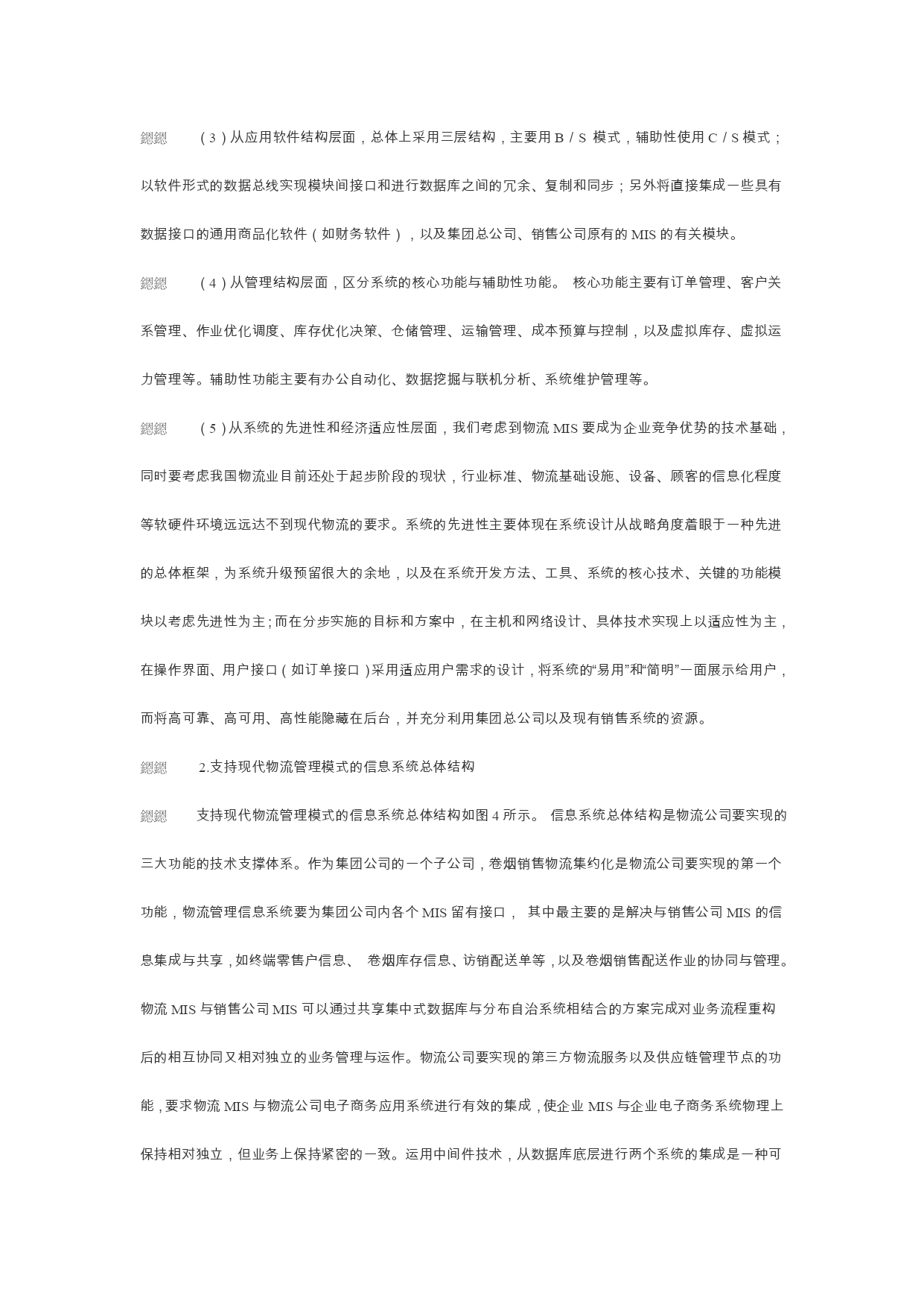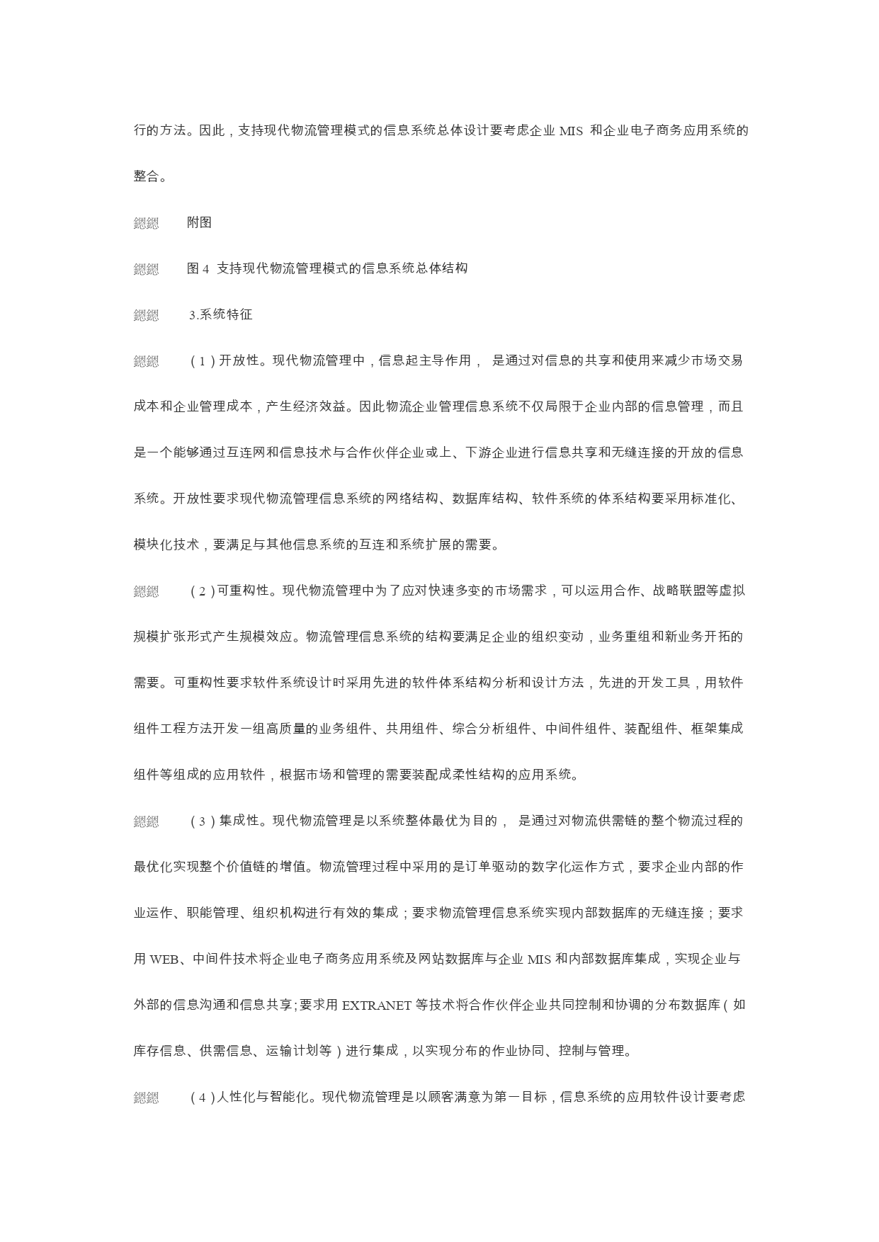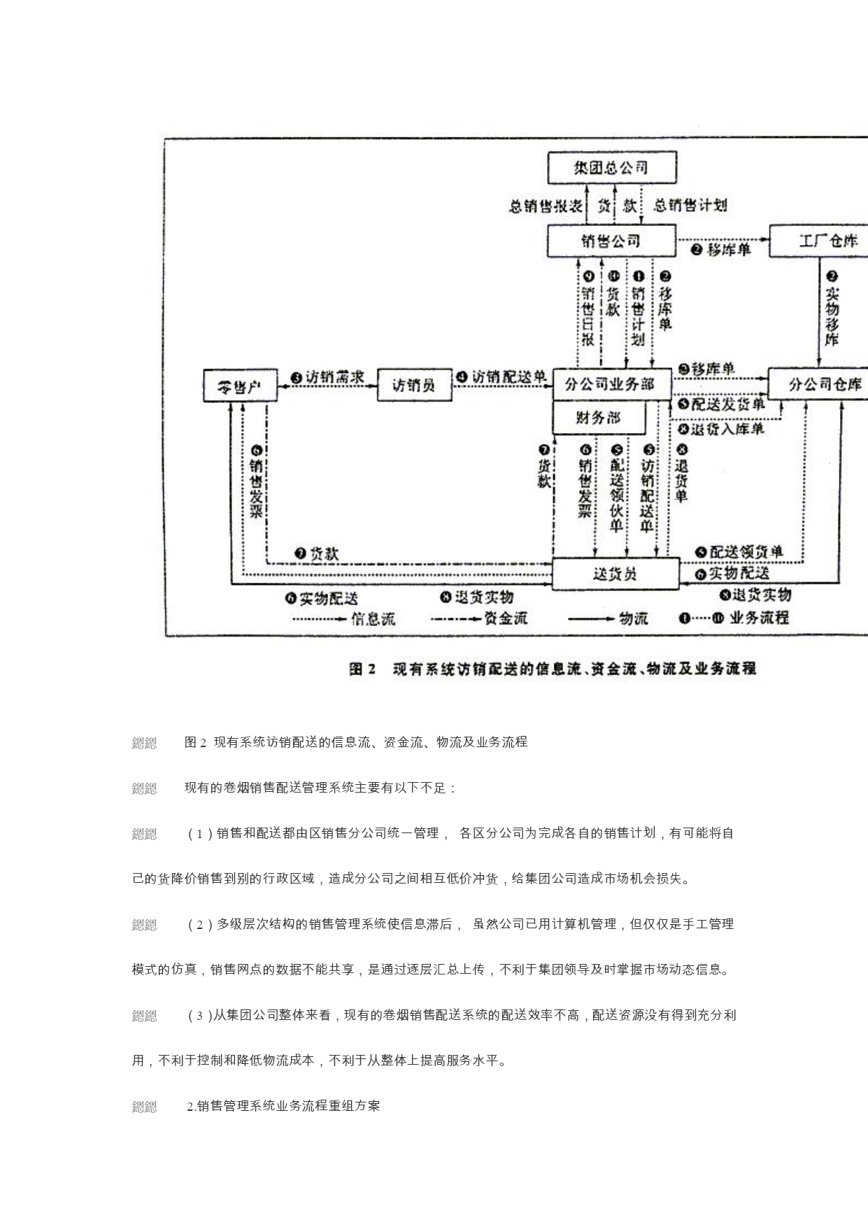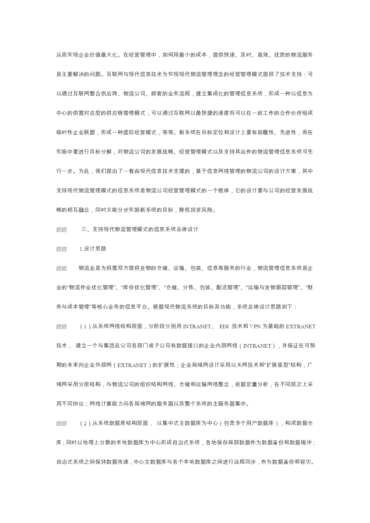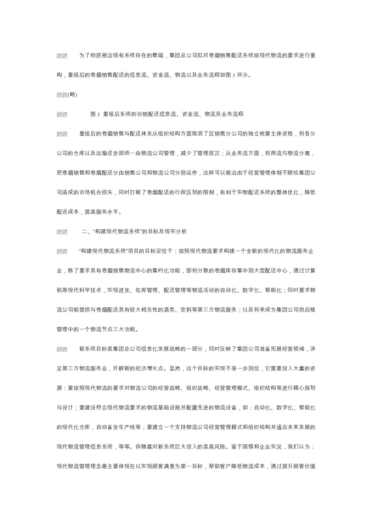 支持现代物流管理模式的信息系统设计方案(2003-6-30文章级别:0点击:133次)电子商务的发展以及中国加入WTO后,发展现代物流已成为环境创新的要件,国内不少生产型企业开始改革落后的物流管理模式,重组业务流程,革新或重建物流管理信息系统。本文涉及的“构建现代物流系统”项目就是在这个背景下提出的。希望本文提出的支持现代物流管理模式的信息系统设计方案能给正在探求信息系统革新方案的企业起抛砖引玉之用。一、一个生产型企业的销售管理系统的业务流程重组1.现有销售管理系统的组织结构及业务流程分析“构建现代物流系统”是由一个烟草集团总公司提出的针对销售物流管理系统进行的重构项目。企业原有的卷烟销售管理系统是一种面向终端零售户的多级层次结构,如图1所示。附图图1卷烟销售管理层次结构图中的销售公司是一个管理机构,区销售分公司是按市行政区域划分的有相对独立经营权的会计核算主体。卷烟销售以区分公司为实体,实行全面访销、按计划定额全面配送的经营管理模式。对于大型商场这类零售户,由分公司直接定期配送;对于持证的卷烟零售户,由访销员直接上门访销,获得访销配送的需求,再由送货员送货。卷烟销售配送的信息流、资金流、物流以及业务流程如图2所示。其中实物流用双向箭头,表示有退货物流。附图图2现有系统访销配送的信息流、资金流、物流及业务流程现有的卷烟销售配送管理系统主要有以下不足:(1)销售和配送都由区销售分公司统一管理,各区分公司为完成各自的销售计划,有可能将自己的货降价销售到别的行政区域,造成分公司之间相互低价冲货,给集团公司造成市场机会损失。(2)多级层次结构的销售管理系统使信息滞后,虽然公司已用计算机管理,但仅仅是手工管理模式的仿真,销售网点的数据不能共享,是通过逐层汇总上传,不利于集团领导及时掌握市场动态信息。(3)从集团公司整体来看,现有的卷烟销售配送系统的配送效率不高,配送资源没有得到充分利用,不利于控制和降低物流成本,不利于从整体上提高服务水平。2.销售管理系统业务流程重组方案为了彻底根治现有系统存在的弊端,集团总公司拟对卷烟销售配送系统按现代物流的要求进行重构,重组后的卷烟销售配送的信息流、资金流、物流以及业务流程如图3所示。(略)图3重组后系统的访销配送信息流、资金流、物流及业务流程重组后的卷烟销售与配送体系从组织结构方面取消了区销售分公司的独立核算主体资格,将各分公司的仓库以及运输送货部统一由物流公司管理,减少了管理层次;从业务流方面,将商流与物流分离,把卷烟销售和卷烟配送分由销售公司和物流公司分别运作,这样可以根治由于经营管理体制不顺给集团公司造成的市场机会损失,同时打破了卷烟配送的行政区划的限制,有利于实物配送系统的整体优化,降低配送成本,提高服务水平。二、“构建现代物流系统”的目标及现实分析“构建现代物流系统”项目的目标定位于:按照现代物流要求构建一个全新的现代化的物流服务企业,除了要求具有卷烟销售物流中心的集约化功能,即将分散的卷烟库存集中到大型配送中心,通过计算机等现代科学技术,实现进货、在库管理、配送管理等物流活动的自动化、数字化、智能化;同时要求物流公司能提供与卷烟配送具有较大相关性的酒类、饮料等第三方物流服务;以及将来成为集团公司供应链管理中的一个物流节点三大功能。新系统目标是集团总公司信息化发展战略的一部分,同时反映了集团公司准备拓展经营领域,涉足第三方物流服务业,开辟新的经济增长点。显然,这个目标的实现不易一步到位,它需要投入大量的资源:要按照现代物流的要求对物流公司的经营战略、组织战略、经营管理模式、组织结构等进行精心规划与设计;要建设符合现代物流要求的物流基础设施并配置先进的物流设备,如:自动化、数字化、智能化的现代化仓库,自动备货生产线等;要建立一个支持物流公司经营管理模式和组织结构并适应未来发展的现代物流管理信息系统,等等。伴随着对新系统巨大投入的是高风险。鉴于国情和企业实况,我们认为:现代物流管理理念最主要体现在以实现顾客满意为第一目标,帮助客户降低物流成本,通过提升顾客价值从而实现企业价值最大化。在经营管理中,如何用最小的成本,提供快速、及时、高效、优质的物流服务是主要解决的问题。互联网与现代信息技术为实现现代物流管理理念的经营管理模式提供了技术支持:可以通过互联网整合供应商、物流公司、顾客的业务流程,建立集成化的管理信息系统,形成一种以信息为中心的供需对应型的供应链管理模式;可以通过互联网以最快捷的速度将可以在一起工作的合作伙伴组成临时性企业联盟,形成一种虚拟经营模式,等等。新系统在目标定位和设计上要有前瞻性、先进性,而在实施中要进行目标分解,对物流公司的发展战略、经营管理模式以及支持其运作的物流管理信息系统可先