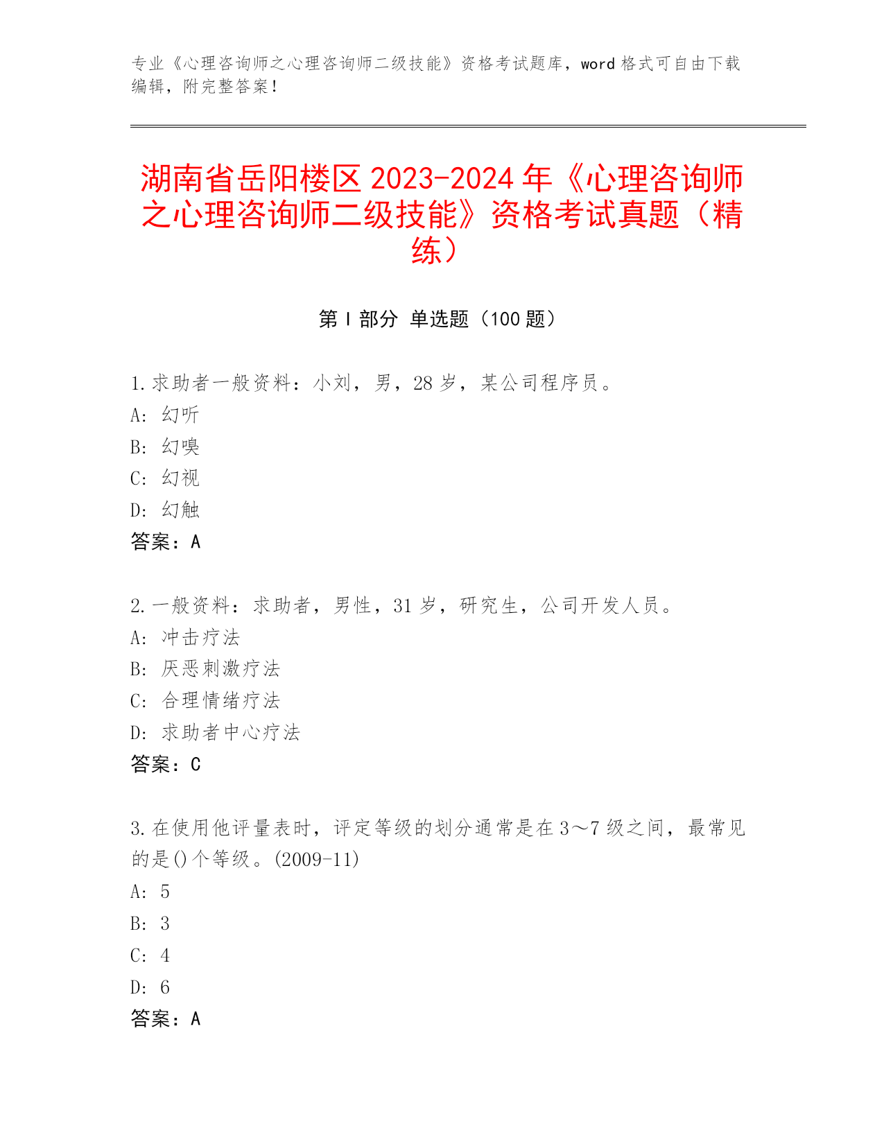 湖南省岳阳楼区2023-2024年《心理咨询师之心理咨询师二级技能》资格考试真题(精练)