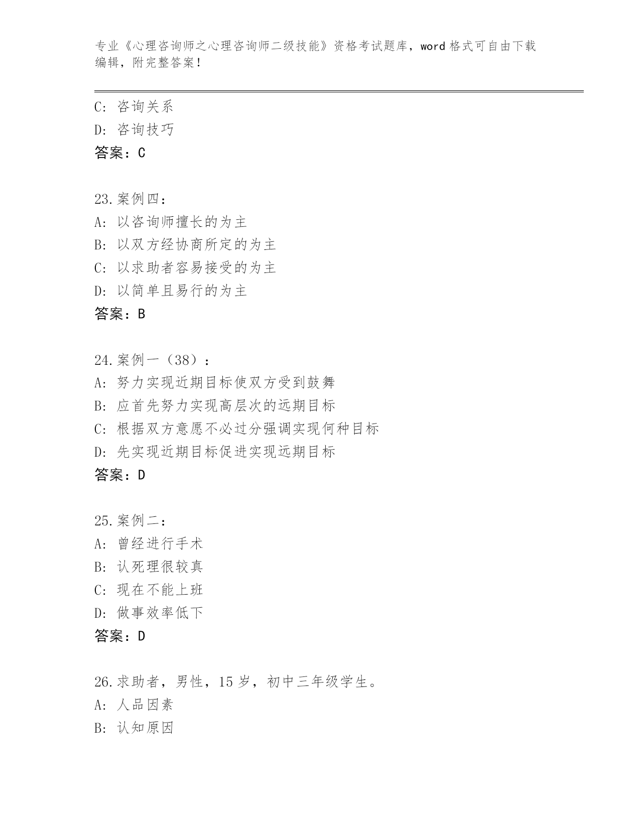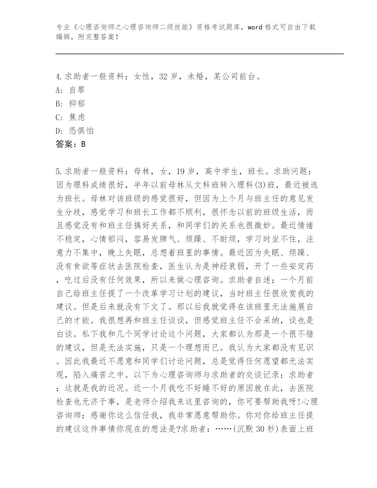湖南省2024年《心理咨询师之心理咨询师二级技能》资格考试真题题库及答案(各地真题)