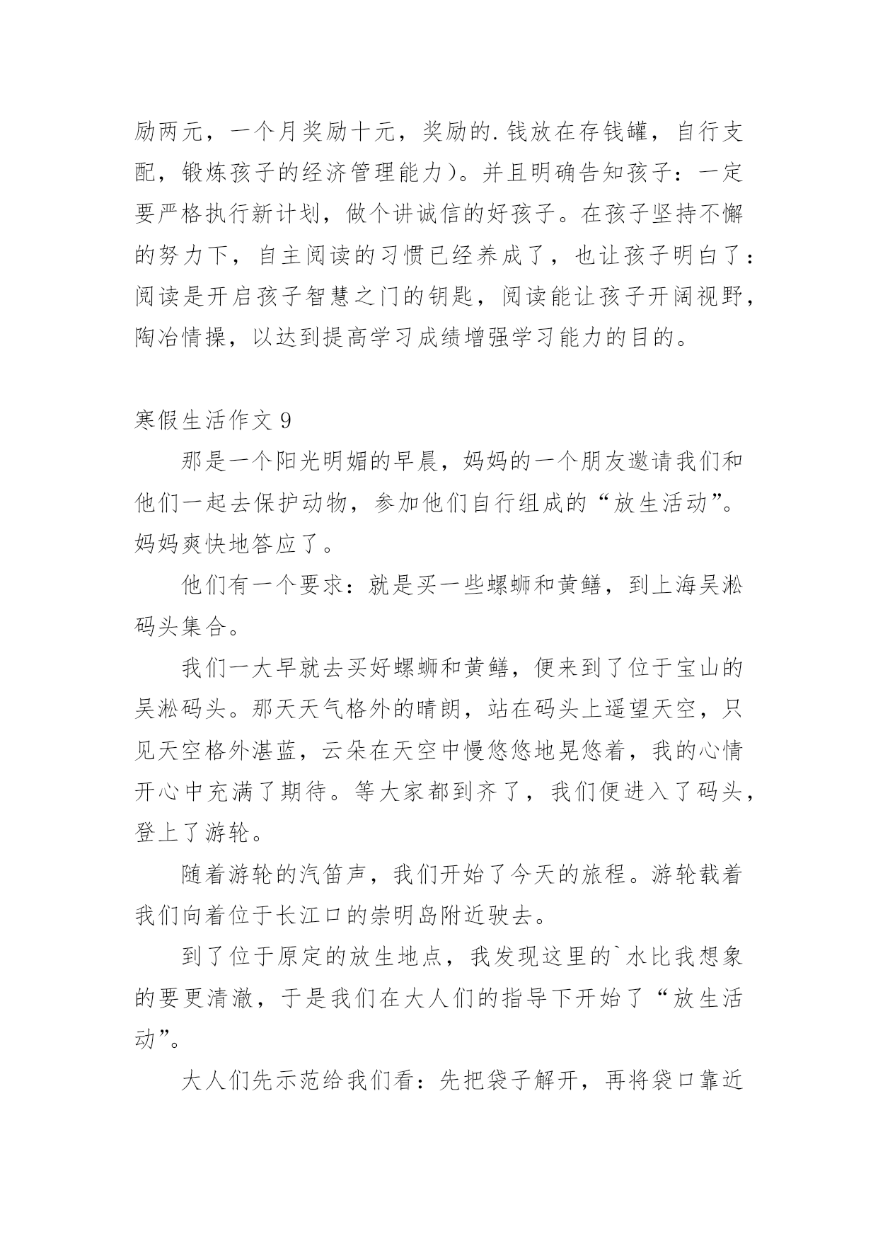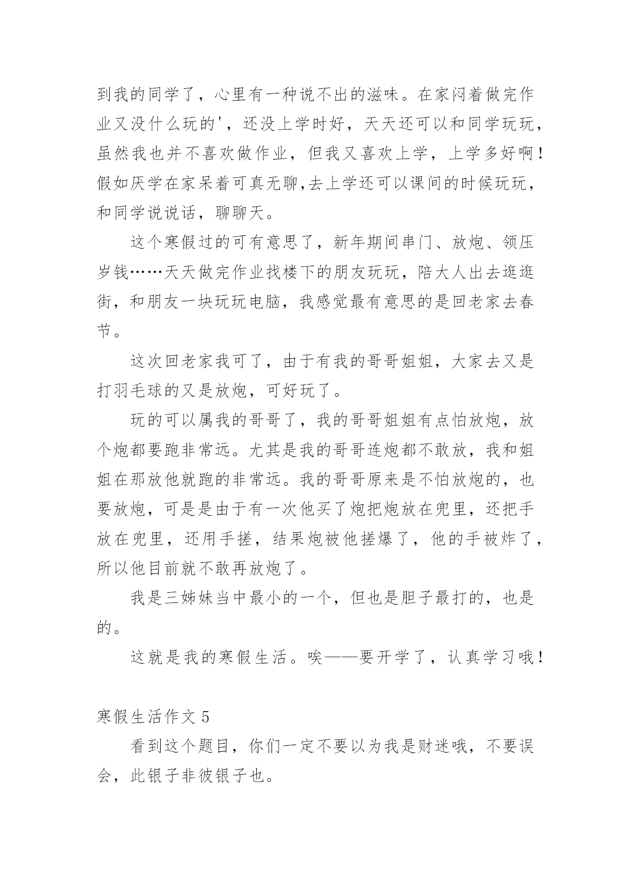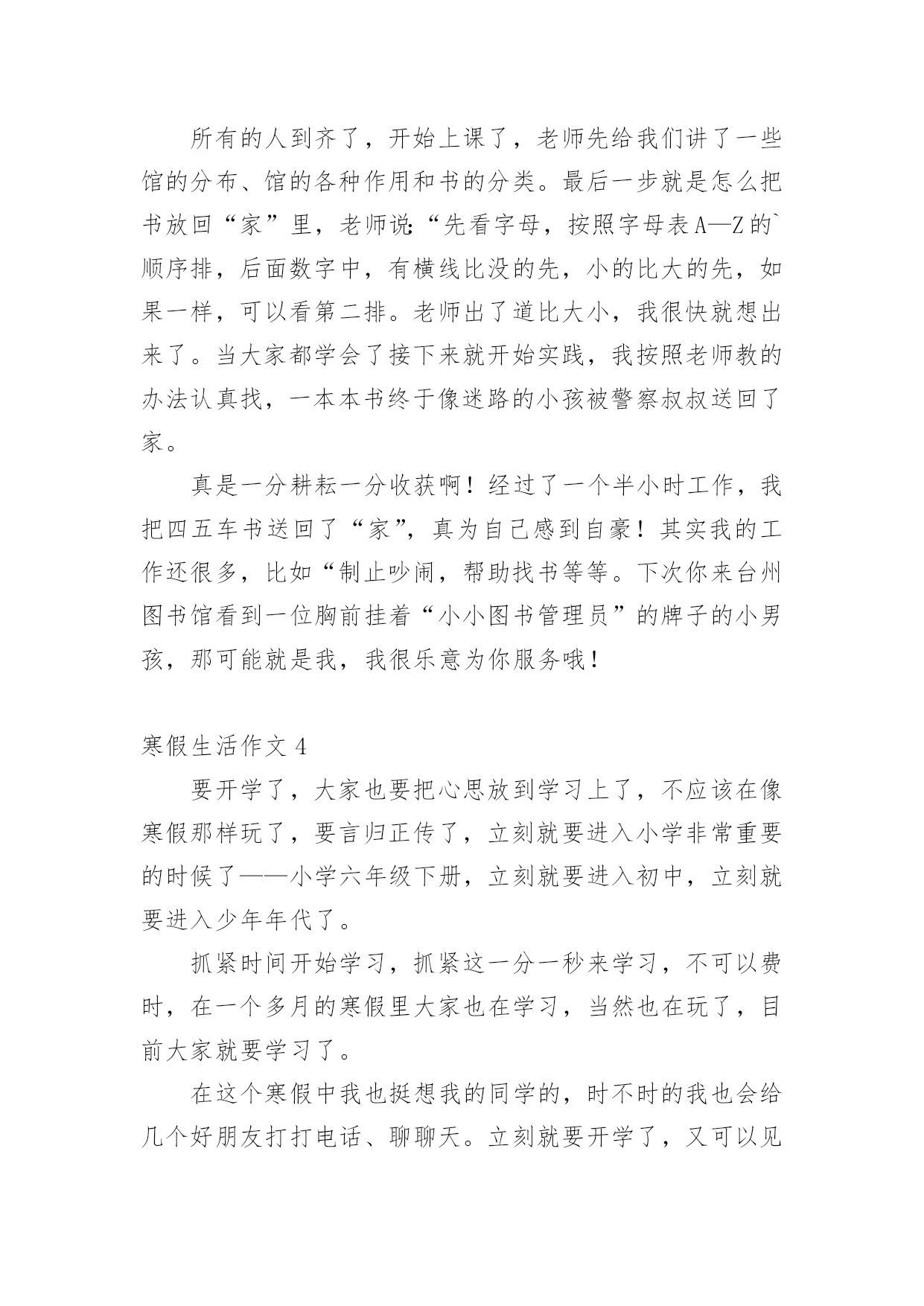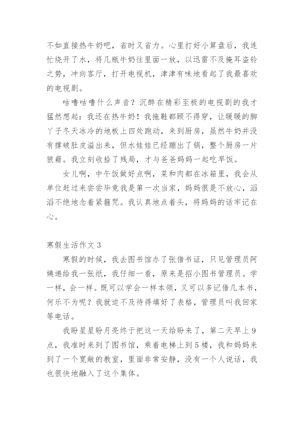 寒假生活作文寒假生活作文共15篇在我们平凡的日常里,大家都有写作文的经历,对作文很是熟悉吧,作文可分为小学作文、中学作文、大学作文(论文)。作文的注意事项有许多,你确定会写吗?下面是小编收集整理的寒假生活作文,供大家参考借鉴,希望可以帮助到有需要的朋友。寒假生活作文1我就读于阳光小学,目前六年级,虽然学校是没有指定寒假作业,我记得以前有寒暑假作业时,其实也没有很多,但各处室的作业都很有趣。现在,老师常用寒假自主学习单来让我们自己安排,等于是自己出作业给自己完成。在班级上有很多人都善用3C产品,利用PPT来呈现自己的寒假生活,有少数几人会和我一样利用书面报告,把参观展览的票根、表演的节目册、劳作作品等等都放进资料夹,纪录着整个寒假的历程,也写下心得纪录。不管如何呈现,寒假作业都是代表成长的纪录,也有同学认为假期中原本就会安排各种自己喜欢的学习活动或是想做的事,寒假作业只是一种要刻意呈现给别人看的记录,像纪璇同学就表示:“我认为学习是自己的事,学了什么,学到哪里,有时未必需要让别人知道,所以学校若是能安排寒假学习经验交流的活动,让大家可以用不同的'方式去呈现自己的学习成果。”因此老师会用课余的时间来让大家轮流报告,也给同学评分表,并要写出从同学的报告中学习到的东西,虽然有些人上台会结巴,但可以知道大家有趣的寒假生活,班上如果有27人,就会有27份收获呢!同学们都很满意自己的寒假生活,既可有充足的睡眠,也能自己安排学习或休闲活动,还能轻鬆地和家人出去玩,每个人都过得十分充实,因为认真用心的小孩最美丽。寒假生活作文2光阴似箭,岁月如梭。一转眼间,我的的寒假就这样过去了,生活也要走入正轨了。不过,回望这个寒假?发现还是有好多事情值得回味的。这其中,最让人记忆犹新的事情,自然是那大年三十。也就是除夕了。那天,我可是经历了好多事情呢,待我娓娓道来今天愚人节吗?妈妈仿佛在听我讲述天方夜谭,疑惑不已你这种衣来伸手,饭来张口的小皇帝也能当家?我可以的!我望着妈妈不屑一顾的眼神,胸有成竹,我向您保证,明天我一定可以将整个家整理得井井有条,让全家人大饱口福!在我的软磨硬泡和甜言蜜语之下,妈妈终于同意了让我当一天家的请求。第二天,闹钟的响声打断了我和周公的幽会,我使劲睁开千金重似的眼皮,一骨碌爬起了床,拖着两条无力的'腿,昏昏沉沉地走向厨房准备全家人的早饭。早饭吃什么好呢?不如直接热牛奶吧,省时又省力。心里打好小算盘后,我连忙烧开了水,将几瓶牛奶往里面一放,以迅雷不及掩耳盗铃之势,冲向客厅,打开电视机,津津有味地看起了我最喜欢的电视剧。咕噜咕噜什么声音?沉醉在精彩至极的电视剧的我才猛然想起:我还在热牛奶!我拖鞋都顾不得穿,让暖暖的脚丫子冬天冰冷的地板上四处跑动,来到厨房,虽然牛奶并没有撑破肚皮溢出来,但水娃娃已经蹦出了锅,整个厨房一片狼藉。我立刻收拾了残局,才与爸爸妈妈一起吃早饭。女儿啊,中午饭做好点啊,菜和肉都在冰箱里,我会从单位赶过来尝尝毕竟我是第一次当家,妈妈很是不放心,滔滔不绝地念着紧箍咒。我认真地点着头,将妈妈的话牢记在心。寒假生活作文3寒假的时候,我去图书馆办了张借书证,只见管理员阿姨递给我一张纸,我仔细一看,原来是招小图书管理员。学一样,会一样。既可以学会一样本领,又可以多记借几本书,何乐不为呢?我就迫不及待得填好了表格,管理员叫我回家等电话。我盼星星盼月亮终于把这一天给盼来了,第二天早上9点,我准时来到了图书馆,乘着电梯上到5楼,我和妈妈来到了一个宽敞的教室,里面非常安静,没有一个人说话,我也很快地融入了这个集体。所有的人到齐了,开始上课了,老师先给我们讲了一些馆的分布、馆的各种作用和书的分类。最后一步就是怎么把书放回“家”里,老师说:“先看字母,按照字母表A—Z的`顺序排,后面数字中,有横线比没的先,小的比大的先,如果一样,可以看第二排。老师出了道比大小,我很快就想出来了。当大家都学会了接下来就开始实践,我按照老师教的办法认真找,一本本书终于像迷路的小孩被警察叔叔送回了家。真是一分耕耘一分收获啊!经过了一个半小时工作,我把四五车书送回了“家”,真为自己感到自豪!其实我的工作还很多,比如“制止吵闹,帮助找书等等。下次你来台州图书馆看到一位胸前挂着“小小图书管理员”的牌子的小男孩,那可能就是我,我很乐意为你服务哦!寒假生活作文4要开学了,大家也要把心思放到学习上了,不应该在像寒假那样玩了,要言归正传了,立刻就要进入小学非常重要的时候了——小学六年级下册,立刻就要进入初中,立刻就要进入少年年代了。抓紧时间开始学习,抓紧这一分一秒来学习,不可以费时,在一个多月的寒假里大家也在学习,当然也在玩了,目前大家就要学习了。在这个寒假中我也挺想我的同学的,时不时的我也会给几个好朋友打打电话、聊聊天。立刻就要开学了,又可以见到我的同学了,心里有一种说