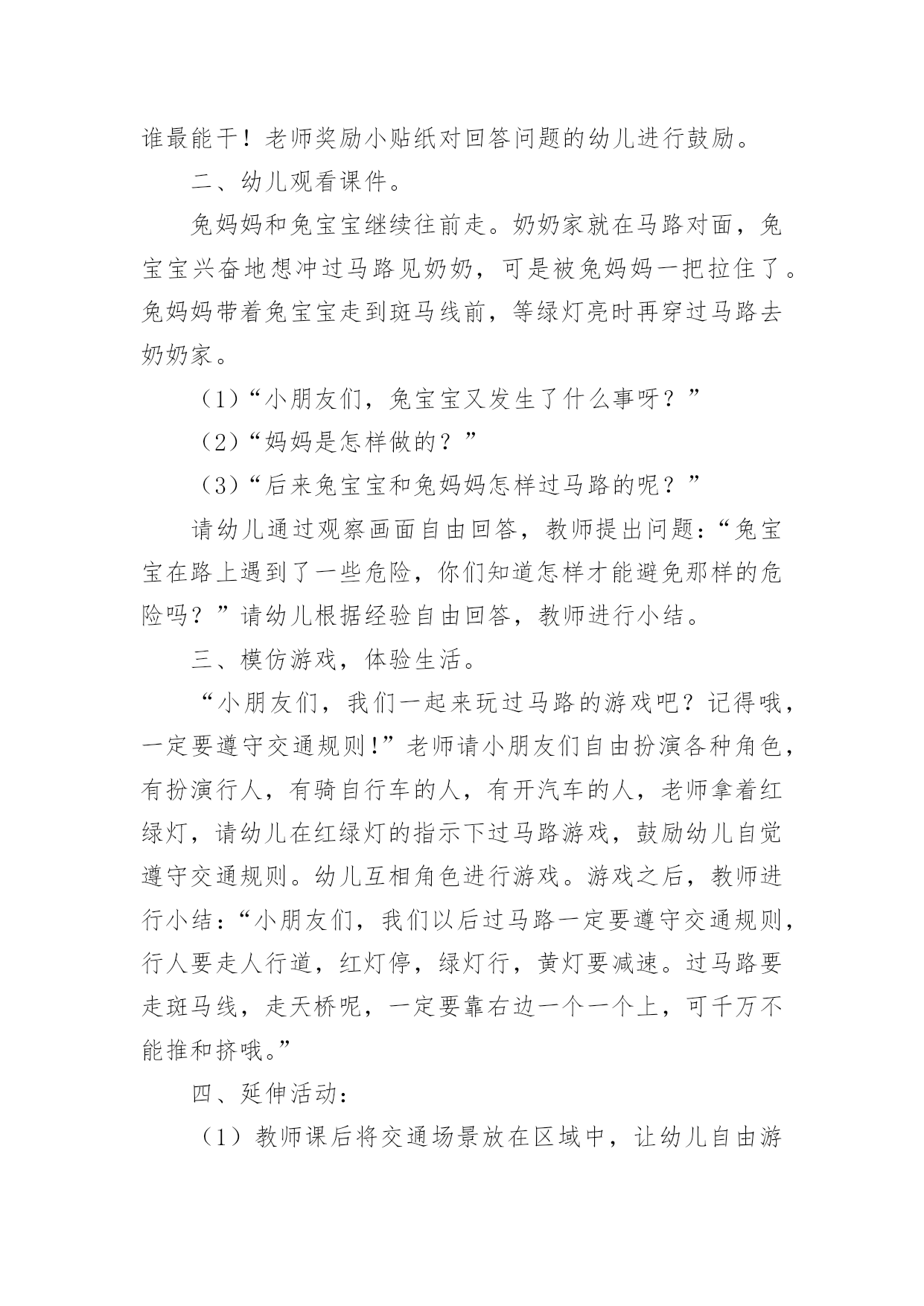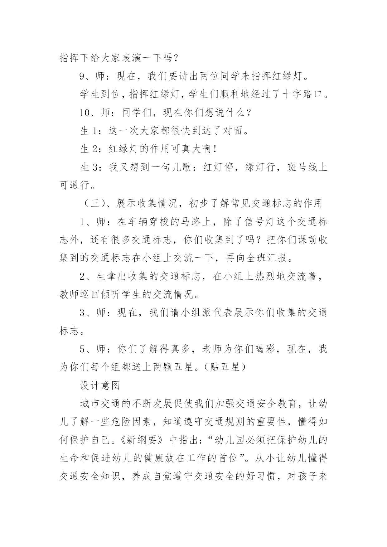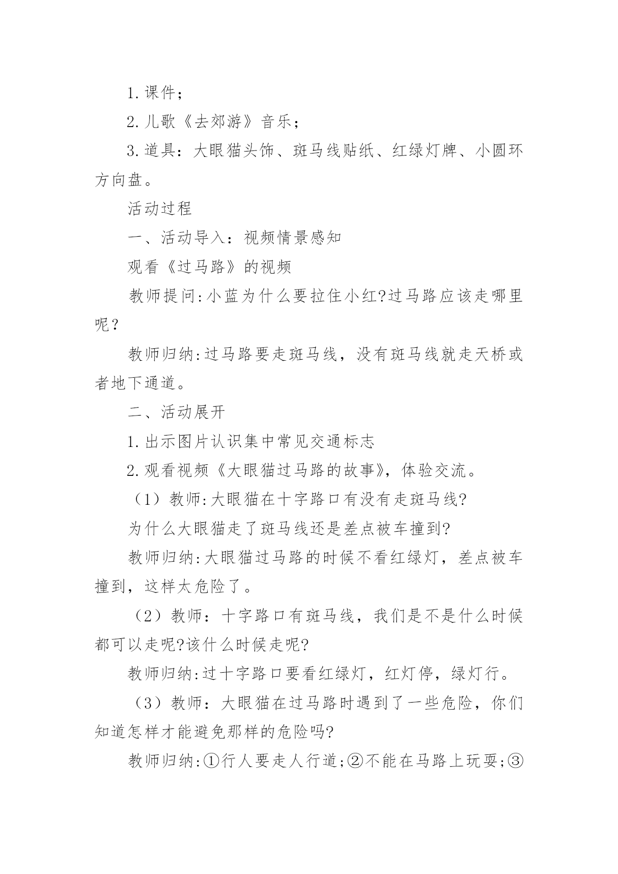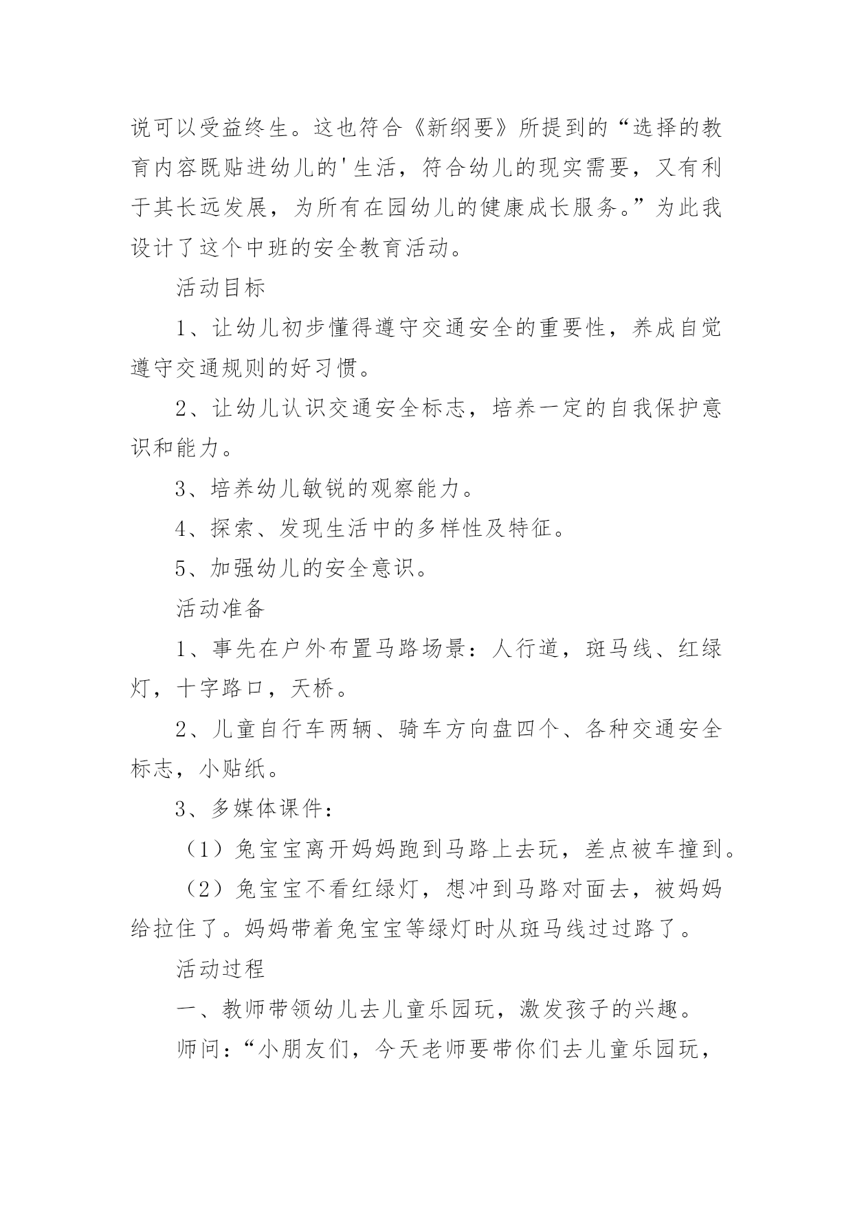 中班安全交通安全教案作为一名辛苦耕耘的教育工作者,通常需要准备好一份教案,编写教案有利于我们科学、合理地支配课堂时间。如何把教案做到重点突出呢?下面是小编帮大家整理的中班安全交通安全教案,欢迎大家借鉴与参考,希望对大家有所帮助。中班安全交通安全教案11、活动目标:1、让学生在交流活动中认识一些常见的交通标志。2、让学生在游戏活动中体验交通规则的重要性,从而自觉地遵守交通规则。2、活动准备:1、学生准备游戏活动所需的各种玩具车辆(自行车、汽车)。2、学生收集各种交通标志(照片或图片)。3、活动过程:(一)展开联想,揭示活动主题1、师:同学们,今天我们要开展一次有意思的活动。我们将全班分为2个组进行比赛,你们有信心吗?2、在活动之前,请同学先看大屏幕。课件出现:各种车辆的喧闹声,接着是紧急刹车的声音,然后是人们的尖叫声,屏幕由黑色逐渐变成鲜红色。3、师:刚才你们看到了什么?听到了什么?想到了什么?生1:我听到了汽车的嗽叭声,还听到了刹车的声音。生2:我还听见了一个人的尖叫声,我看见了血流出来了。生3:我好像看到了一场车祸,人被压死在汽车下面。4、师:是啊!多么可怕的车祸,为了不让这样的事情再发生,我们一定要注意交通安(二)、游戏活动,在活动中体会交通规则的重要性1、师:孩子们,看看我们坐的队形像什么?生:我们坐的队形像十字路口。2、师:十字路口的学问可多了,现在我们就在十字路口做个游戏。老师们要请出两个司机,两个骑车的以及三个行人。参加游戏活动的孩子听到老师说完“开始”之后,立即向自己的对面出发。其他同学仔细观察,看看会发生什么事情?(学生开始活动,车辆和行人任意穿梭)3、师:同学们,刚才你们看到了什么?你们想说什么?生1:我看见走路的人和自行车撞在了一起。生2:我看见自行车撞到了汽车,我想一定把他们碰疼了。生3:我看见车子和行人挤在一起,谁也走不了,那样一定很耽误时间。4、师:是啊!如果生活中也是这样可不行啊!为什么会发生这种情况呢?生1:我觉得是他们不懂规矩。生2:我认为是因为没有人指挥他们,如果有人指挥他们怎么走,一定不会发生赌车的事情。师:对啊!要是有人指挥就好了!生:老师,我认为可以做一个标志来指挥人们什么时候可以走,什么时候不能走?师:你们建议真棒!你真是个爱动脑筋的孩子!生:老师,我知道这种标志,就是红绿灯。红灯亮了,车辆和行人就得停下来,绿灯亮了,人们就可以走了。5、教师拿出信号灯标志:是这个吗?教师用儿歌来说说信号灯的作用。(将标志贴在黑板上)红灯停,绿灯行,黄灯请你等一等。红灯停,黄灯等,绿灯才能向前行。6、师:认识了红绿灯,我们还要知道自己应该走哪条路,这就要知道每条路的名称。同学们,看看这个十字路口,你认识这些道路吗?生:我知道画了斑马线的是人行道,是行人走的地方。生:我知道马路两边是自行车、三轮车道。7、师:骑自行车的同学知道了吗?这才是你们的道路,我们称为非机动车道。生:我还知道中间的是汽车道。8、师:各位司机朋友,各位行人,还有骑车勇士们,现在你们知道自己应该走的位置了吗?你们能在信号灯的指挥下给大家表演一下吗?9、师:现在,我们要请出两位同学来指挥红绿灯。学生到位,指挥红绿灯,学生们顺利地经过了十字路口。10、师:同学们,现在你们想说什么?生1:这一次大家都很快到达了对面。生2:红绿灯的作用可真大啊!生3:我又想到一句儿歌:红灯停,绿灯行,斑马线上可通行。(三)、展示收集情况,初步了解常见交通标志的作用1、师:在车辆穿梭的马路上,除了信号灯这个交通标志外,还有很多交通标志,你们收集到了吗?把你们课前收集到的交通标志在小组上交流一下,再向全班汇报。2、生拿出收集的交通标志,在小组上热烈地交流着,教师巡回倾听学生的交流情况。3、师:现在,我们请小组派代表展示你们收集的交通标志。5、师:你们了解得真多,老师为你们喝彩,现在,我为你们每个组都送上两颗五星。(贴五星)设计意图城市交通的不断发展促使我们加强交通安全教育,让幼儿了解一些危险因素,知道遵守交通规则的重要性,懂得如何保护自己。《新纲要》中指出:“幼儿园必须把保护幼儿的生命和促进幼儿的健康放在工作的首位”。从小让幼儿懂得交通安全知识,养成自觉遵守交通安全的好习惯,对孩子来说可以受益终生。这也符合《新纲要》所提到的“选择的教育内容既贴进幼儿的'生活,符合幼儿的现实需要,又有利于其长远发展,为所有在园幼儿的健康成长服务。”为此我设计了这个中班的安全教育活动。活动目标1、让幼儿初步懂得遵守交通安全的重要性,养成自觉遵守交通规则的好习惯。2、让幼儿认识交通安全标志,培养一定的自我保护意识和能力。3、培养幼儿敏锐的观察能力。4、探索、发现生活中的多样性及特征。5、加强幼儿的安全意识。活动准备1、事先在户外布置马路场景:人行道,斑马线、红绿灯,十字路口,天桥。