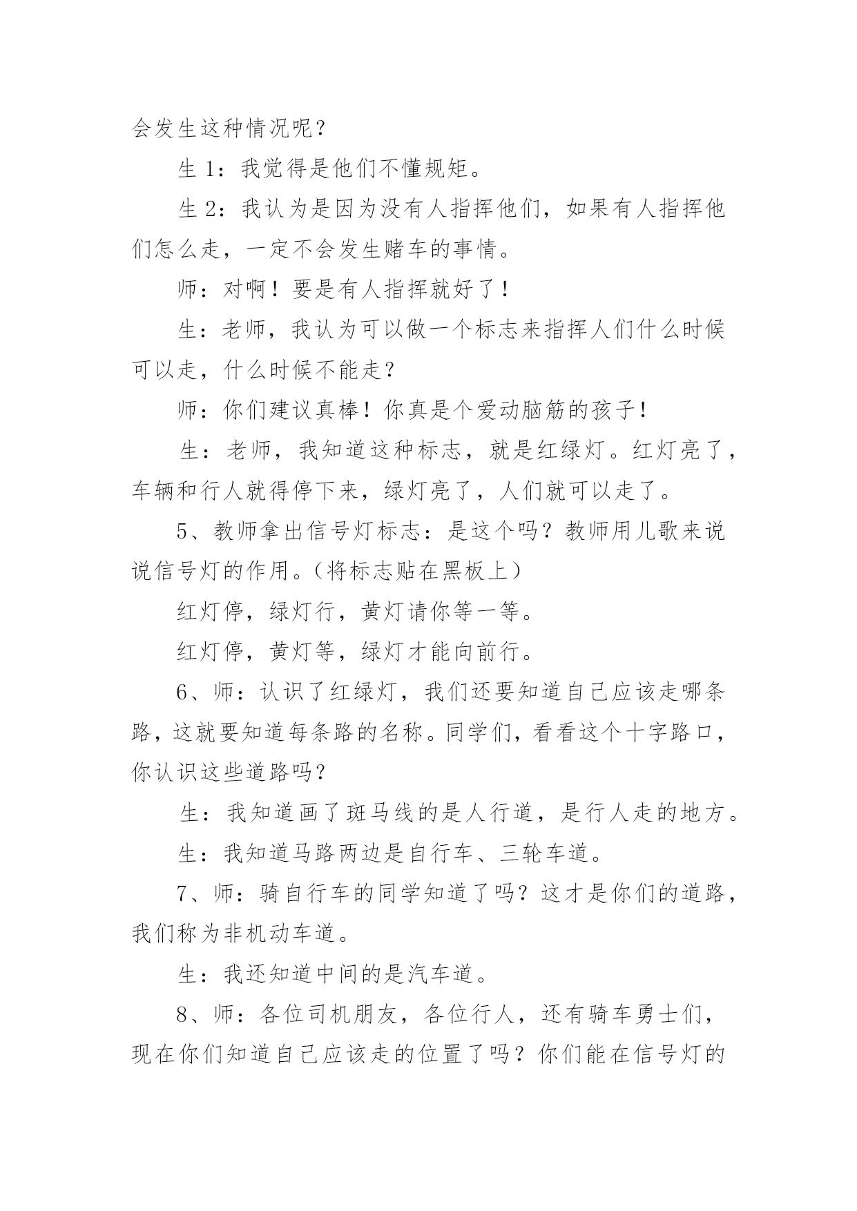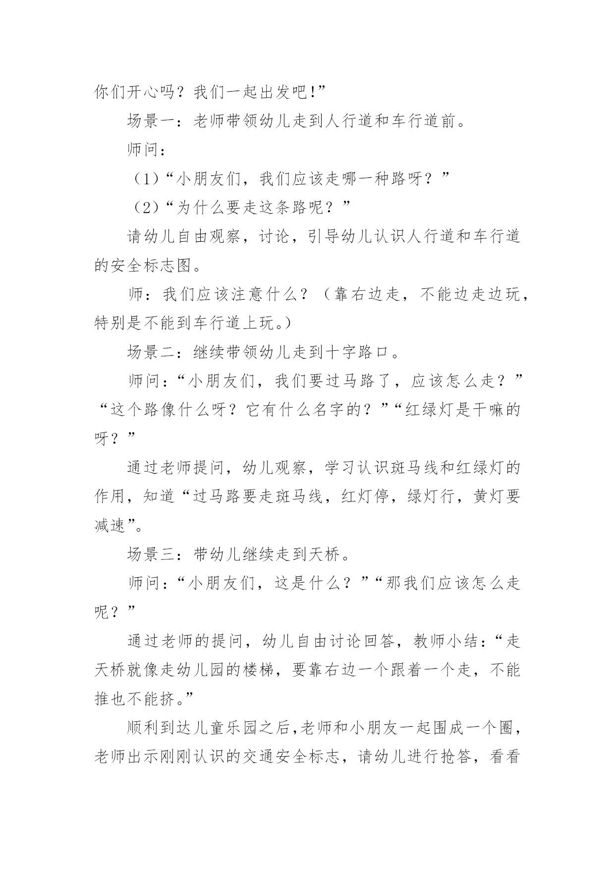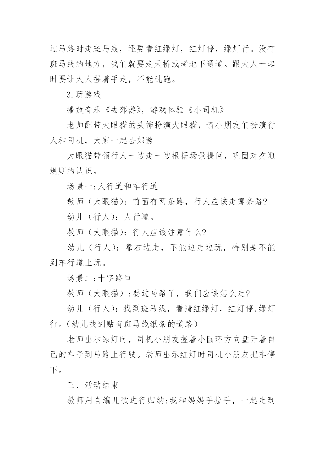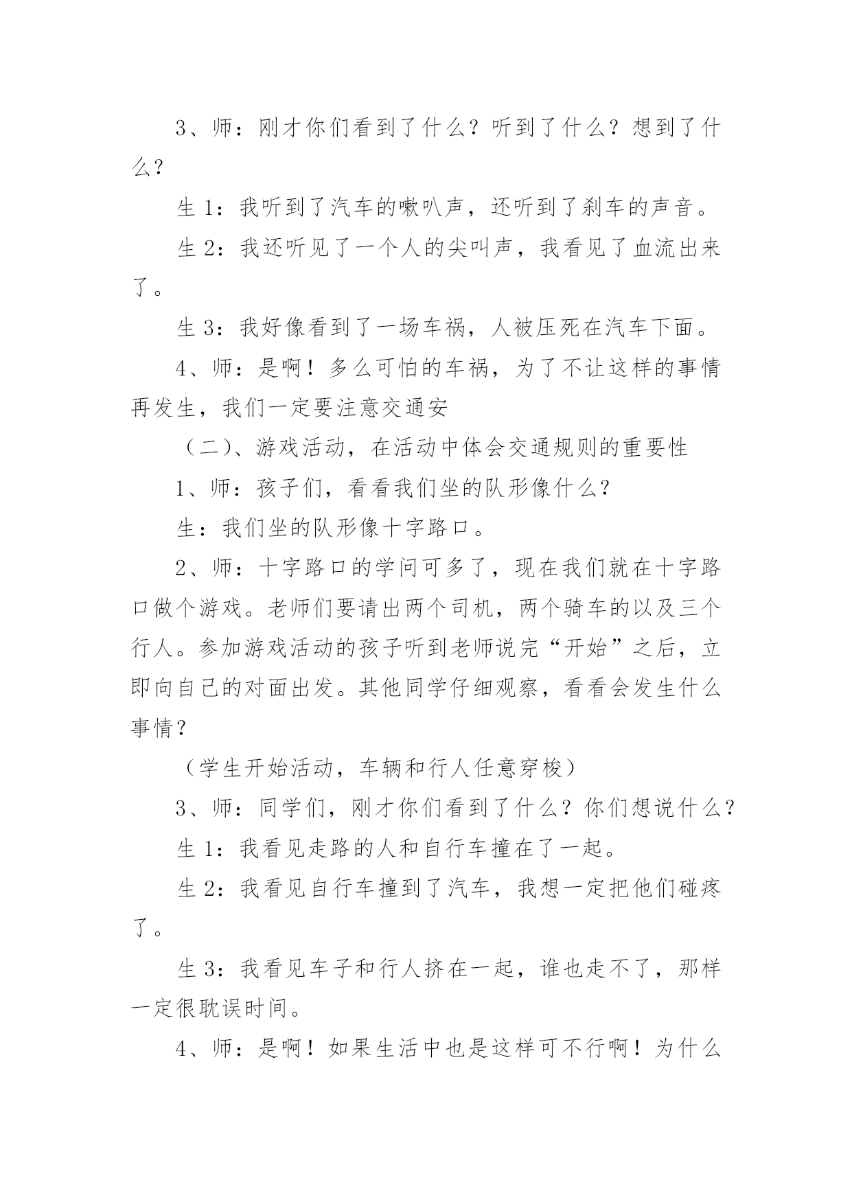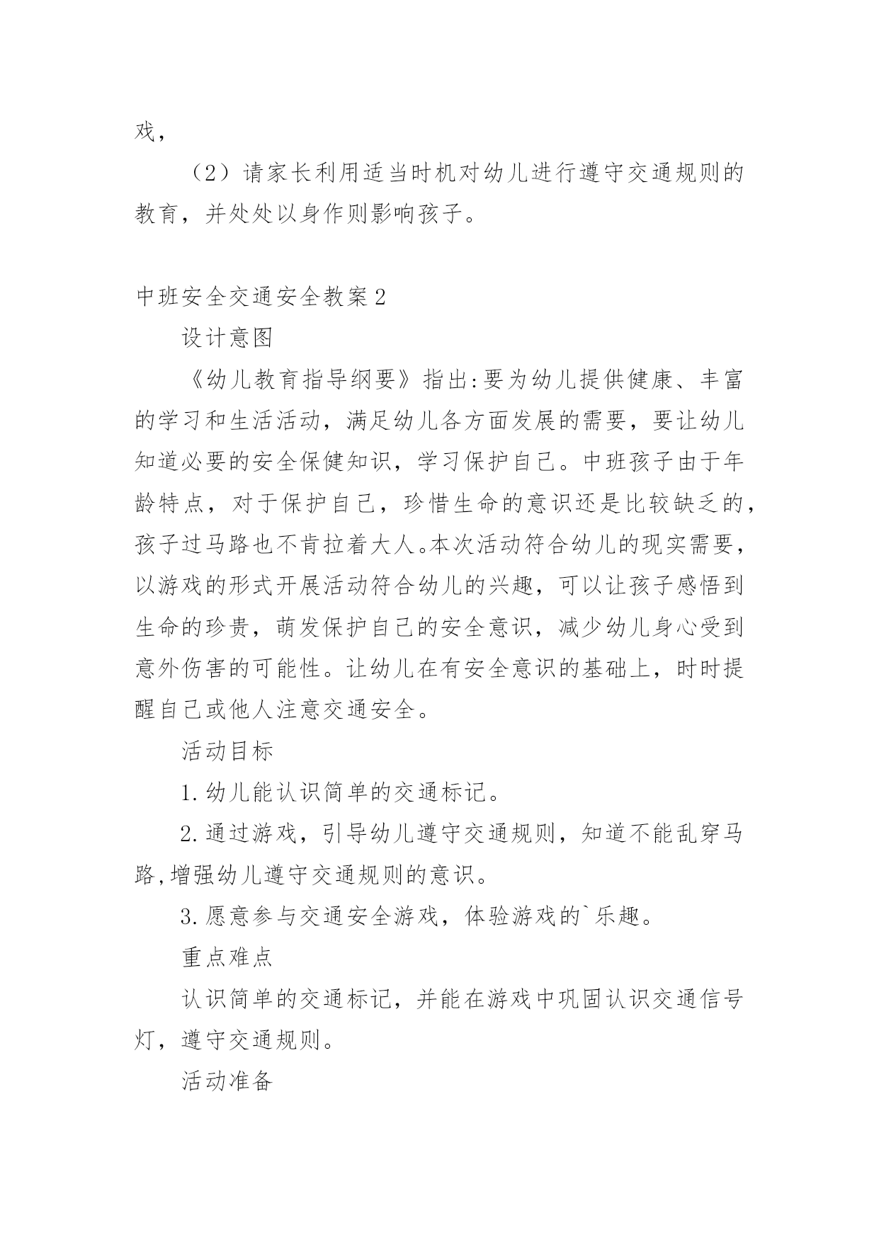 中班安全交通安全教案作为一名辛苦耕耘的教育工作者,通常需要准备好一份教案,编写教案有利于我们科学、合理地支配课堂时间。如何把教案做到重点突出呢?下面是小编帮大家整理的中班安全交通安全教案,欢迎大家借鉴与参考,希望对大家有所帮助。中班安全交通安全教案11、活动目标:1、让学生在交流活动中认识一些常见的交通标志。2、让学生在游戏活动中体验交通规则的重要性,从而自觉地遵守交通规则。2、活动准备:1、学生准备游戏活动所需的各种玩具车辆(自行车、汽车)。2、学生收集各种交通标志(照片或图片)。3、活动过程:(一)展开联想,揭示活动主题1、师:同学们,今天我们要开展一次有意思的活动。我们将全班分为2个组进行比赛,你们有信心吗?2、在活动之前,请同学先看大屏幕。课件出现:各种车辆的喧闹声,接着是紧急刹车的声音,然后是人们的尖叫声,屏幕由黑色逐渐变成鲜红色。3、师:刚才你们看到了什么?听到了什么?想到了什么?生1:我听到了汽车的嗽叭声,还听到了刹车的声音。生2:我还听见了一个人的尖叫声,我看见了血流出来了。生3:我好像看到了一场车祸,人被压死在汽车下面。4、师:是啊!多么可怕的车祸,为了不让这样的事情再发生,我们一定要注意交通安(二)、游戏活动,在活动中体会交通规则的重要性1、师:孩子们,看看我们坐的队形像什么?生:我们坐的队形像十字路口。2、师:十字路口的学问可多了,现在我们就在十字路口做个游戏。老师们要请出两个司机,两个骑车的以及三个行人。参加游戏活动的孩子听到老师说完“开始”之后,立即向自己的对面出发。其他同学仔细观察,看看会发生什么事情?(学生开始活动,车辆和行人任意穿梭)3、师:同学们,刚才你们看到了什么?你们想说什么?生1:我看见走路的人和自行车撞在了一起。生2:我看见自行车撞到了汽车,我想一定把他们碰疼了。生3:我看见车子和行人挤在一起,谁也走不了,那样一定很耽误时间。4、师:是啊!如果生活中也是这样可不行啊!为什么会发生这种情况呢?生1:我觉得是他们不懂规矩。生2:我认为是因为没有人指挥他们,如果有人指挥他们怎么走,一定不会发生赌车的事情。师:对啊!要是有人指挥就好了!生:老师,我认为可以做一个标志来指挥人们什么时候可以走,什么时候不能走?师:你们建议真棒!你真是个爱动脑筋的孩子!生:老师,我知道这种标志,就是红绿灯。红灯亮了,车辆和行人就得停下来,绿灯亮了,人们就可以走了。5、教师拿出信号灯标志:是这个吗?教师用儿歌来说说信号灯的作用。(将标志贴在黑板上)红灯停,绿灯行,黄灯请你等一等。红灯停,黄灯等,绿灯才能向前行。6、师:认识了红绿灯,我们还要知道自己应该走哪条路,这就要知道每条路的名称。同学们,看看这个十字路口,你认识这些道路吗?生:我知道画了斑马线的是人行道,是行人走的地方。生:我知道马路两边是自行车、三轮车道。7、师:骑自行车的同学知道了吗?这才是你们的道路,我们称为非机动车道。生:我还知道中间的是汽车道。8、师:各位司机朋友,各位行人,还有骑车勇士们,现在你们知道自己应该走的位置了吗?你们能在信号灯的指挥下给大家表演一下吗?9、师:现在,我们要请出两位同学来指挥红绿灯。学生到位,指挥红绿灯,学生们顺利地经过了十字路口。10、师:同学们,现在你们想说什么?生1:这一次大家都很快到达了对面。生2:红绿灯的作用可真大啊!生3:我又想到一句儿歌:红灯停,绿灯行,斑马线上可通行。(三)、展示收集情况,初步了解常见交通标志的作用1、师:在车辆穿梭的马路上,除了信号灯这个交通标志外,还有很多交通标志,你们收集到了吗?把你们课前收集到的交通标志在小组上交流一下,再向全班汇报。2、生拿出收集的交通标志,在小组上热烈地交流着,教师巡回倾听学生的交流情况。3、师:现在,我们请小组派代表展示你们收集的交通标志。5、师:你们了解得真多,老师为你们喝彩,现在,我为你们每个组都送上两颗五星。(贴五星)设计意图城市交通的不断发展促使我们加强交通安全教育,让幼儿了解一些危险因素,知道遵守交通规则的重要性,懂得如何保护自己。《新纲要》中指出:“幼儿园必须把保护幼儿的生命和促进幼儿的健康放在工作的首位”。从小让幼儿懂得交通安全知识,养成自觉遵守交通安全的好习惯,对孩子来说可以受益终生。这也符合《新纲要》所提到的“选择的教育内容既贴进幼儿的'生活,符合幼儿的现实需要,又有利于其长远发展,为所有在园幼儿的健康成长服务。”为此我设计了这个中班的安全教育活动。活动目标1、让幼儿初步懂得遵守交通安全的重要性,养成自觉遵守交通规则的好习惯。2、让幼儿认识交通安全标志,培养一定的自我保护意识和能力。3、培养幼儿敏锐的观察能力。4、探索、发现生活中的多样性及特征。5、加强幼儿的安全意识。活动准备1、事先在户外布置马路场景:人行道,斑马线、红绿灯,十字路口,天桥。