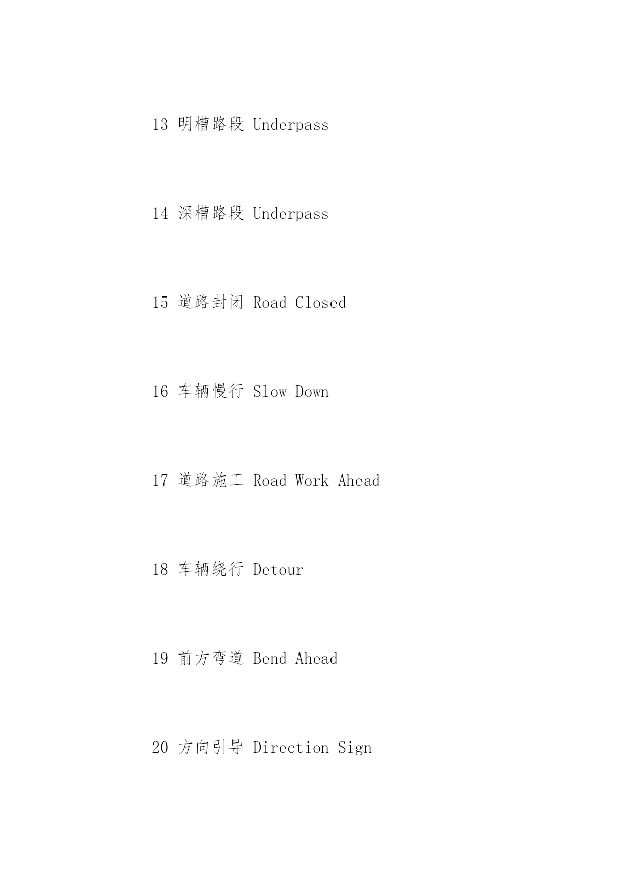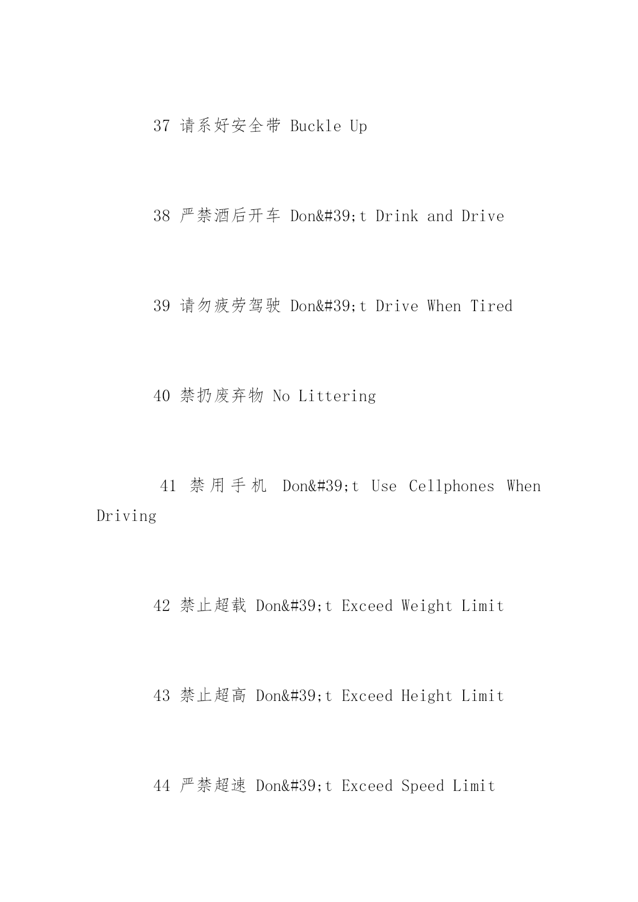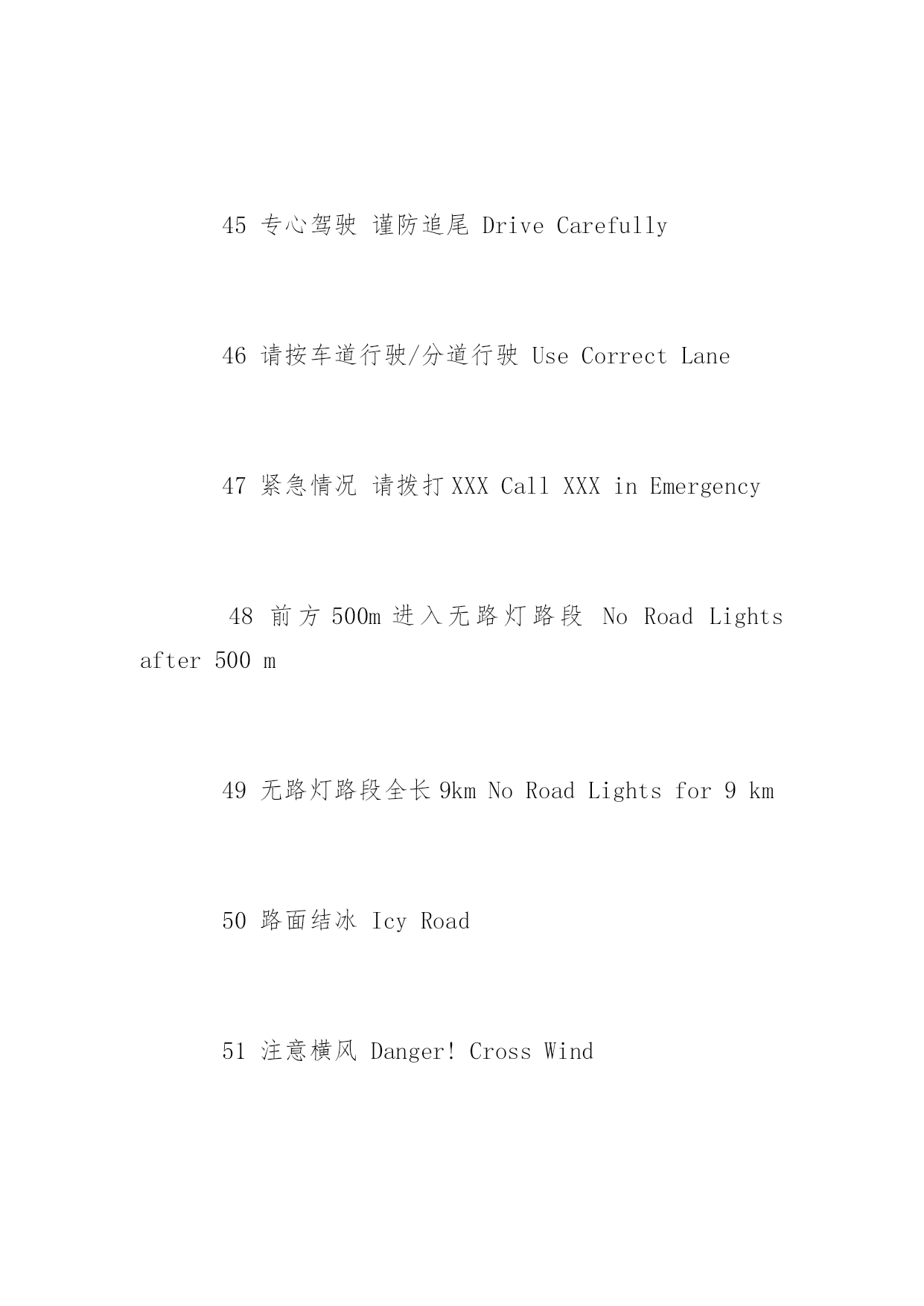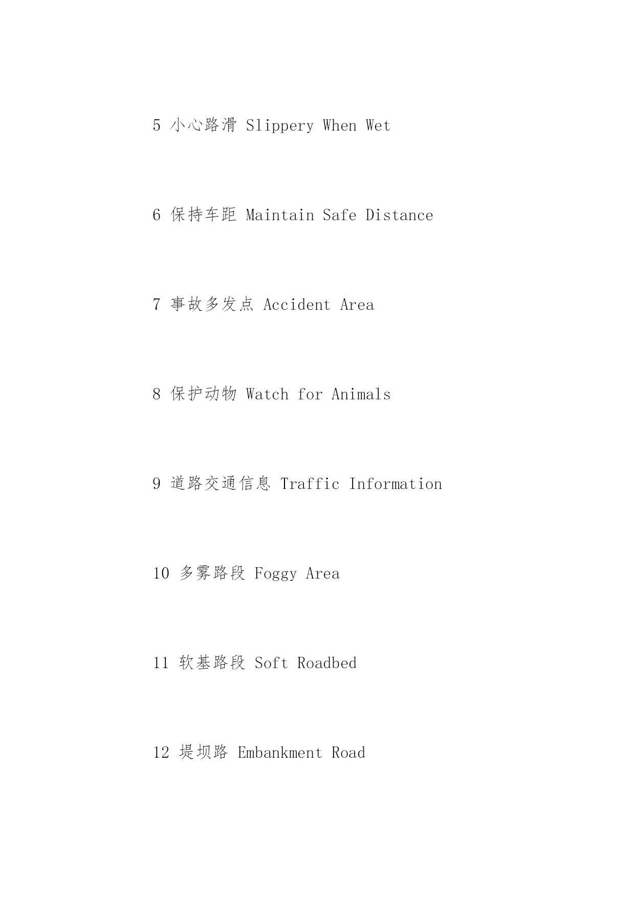 交通道路常见英文标识交通道路常见英文标识导语:交通道路是指公路、城市道路和虽在单位管辖范围但允许社会机动车通行的地方,包括广场、公共停车场等用于公众通行的场所。下面是YJBYS小编收集整理的交通道路常见英文标识,希望对你有帮助!一1爬坡车道SteepGrade2长下坡慢行SteepSlope-SlowDown3陡坡减速SteepIncline-SlowDown4追尾危险Don'tFollowTooClosely5小心路滑SlipperyWhenWet6保持车距MaintainSafeDistance7事故多发点AccidentArea8保护动物WatchforAnimals9道路交通信息TrafficInformation10多雾路段FoggyArea11软基路段SoftRoadbed12堤坝路EmbankmentRoad13明槽路段Underpass14深槽路段Underpass15道路封闭RoadClosed16车辆慢行SlowDown17道路施工RoadWorkAhead18车辆绕行Detour19前方弯道BendAhead20方向引导DirectionSign21落石FallingRocks22双向交通Two-WayTraffic23单行交通One-WayTraffic24禁止驶入/严禁通行/禁止入洞NoEntry25禁止超越线NoPassing26此路不通DeadEnd35大型车靠右LargeVehiclesKeepRight36公共汽车优先BusPriority37请系好安全带BuckleUp38严禁酒后开车Don'tDrinkandDrive39请勿疲劳驾驶Don'tDriveWhenTired40禁扔废弃物NoLittering41禁用手机Don'tUseCellphonesWhenDriving42禁止超载Don'tExceedWeightLimit43禁止超高Don'tExceedHeightLimit44严禁超速Don'tExceedSpeedLimit45专心驾驶谨防追尾DriveCarefully46请按车道行驶/分道行驶UseCorrectLane47紧急情况请拨打XXXCallXXXinEmergency48前方500m进入无路灯路段NoRoadLightsafter500m49无路灯路段全长9kmNoRoadLightsfor9km50路面结冰IcyRoad51注意横风Danger!CrossWind52车道封闭LaneClosed53其他危险OtherDangers54前方学校SchoolZone55让Yield56停Stop57警告标志WarningSign58禁令标志ProhibitionSign59指示标志MandatorySign60指路标志GuideSign61旅游标志TouristSign62禁止摆卖VendorsProhibited/NoVendors63禁止跳下StayClearfromTracks64暂停售票TemporarilyClosed65禁止翻越NoCrossing66请勿挤靠KeepClearoftheDoor67请勿登踏Don’tStepOn68注意安全,请勿靠近KeepAwayforSafety69服务区域ServiceArea70办公区域AdministrativeArea71当心夹手WatchYourHand72贵重物品,随身携带PleaseDon’tLeaveValuablesUnattended73电梯故障停运正在维修,请原谅Escalatorunderrepair.Sorryfortheinconvenience.74施工(检修)给您带来不便请原谅Underconstruction(repair).Sorryfortheinconvenience.75正在检修,请绕行Detour.MaintenanceinProgress.76正在检修,请您稍候Wait.MaintenanceinProgress.77电梯维修,暂停使用EscalatorOutofService78靠右站立、左侧疾行StandonRight.PassonLeft.79紧急时击碎玻璃BreakGlassinEmergency80请勿手扶Don’tTouch81请勿挤靠车门,以免发生危险Foryoursafety,pleasekeepclearofthedoor.82为了行车安全,请勿打扰司机Don’tDistracttheDrive