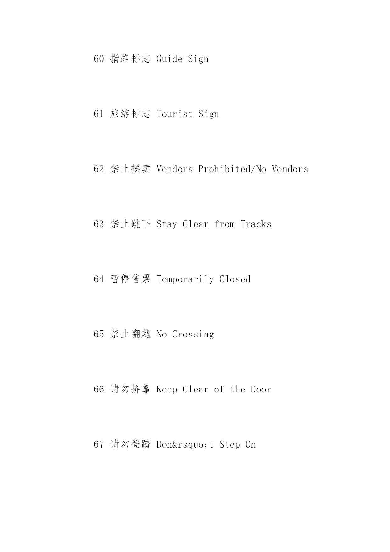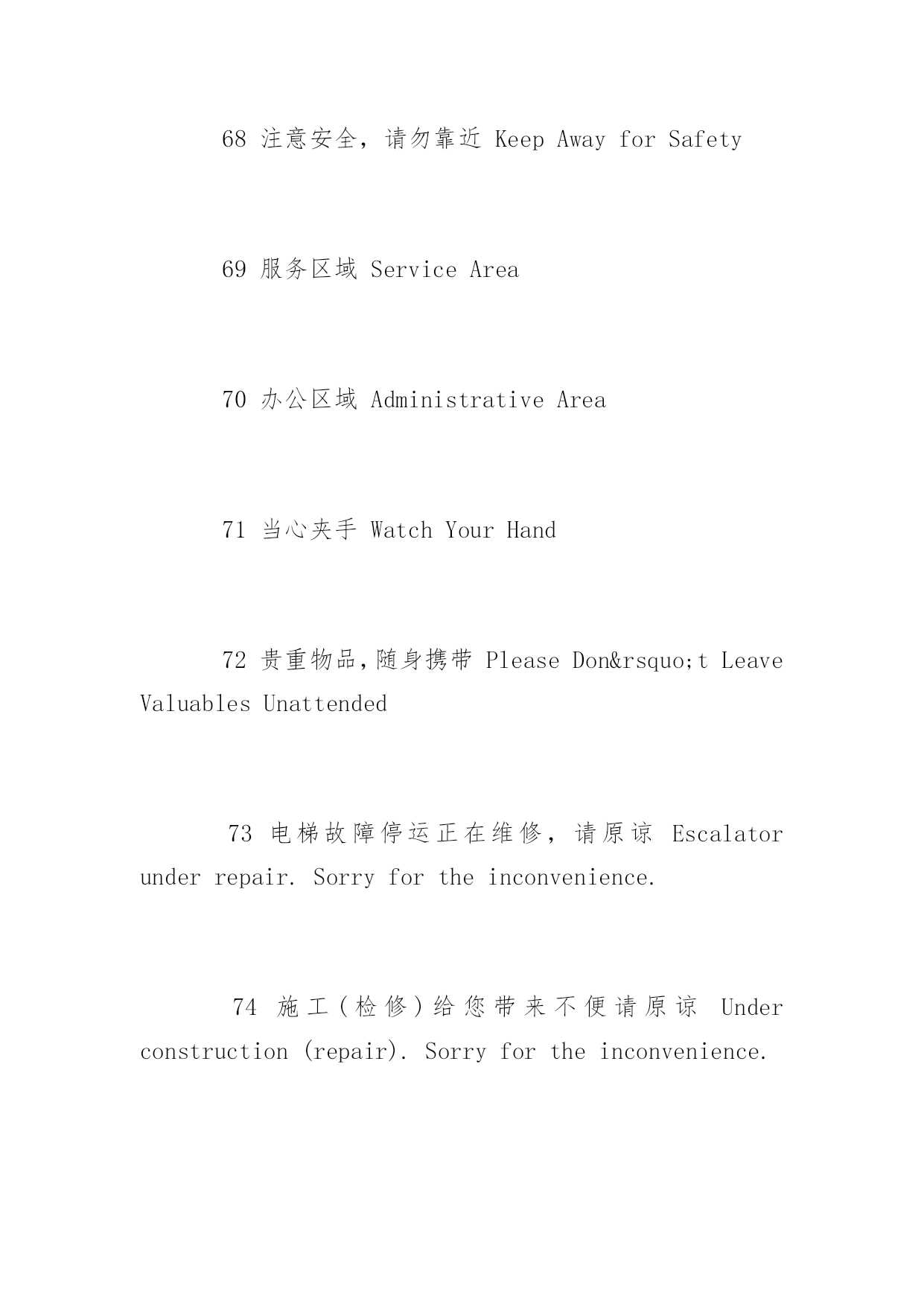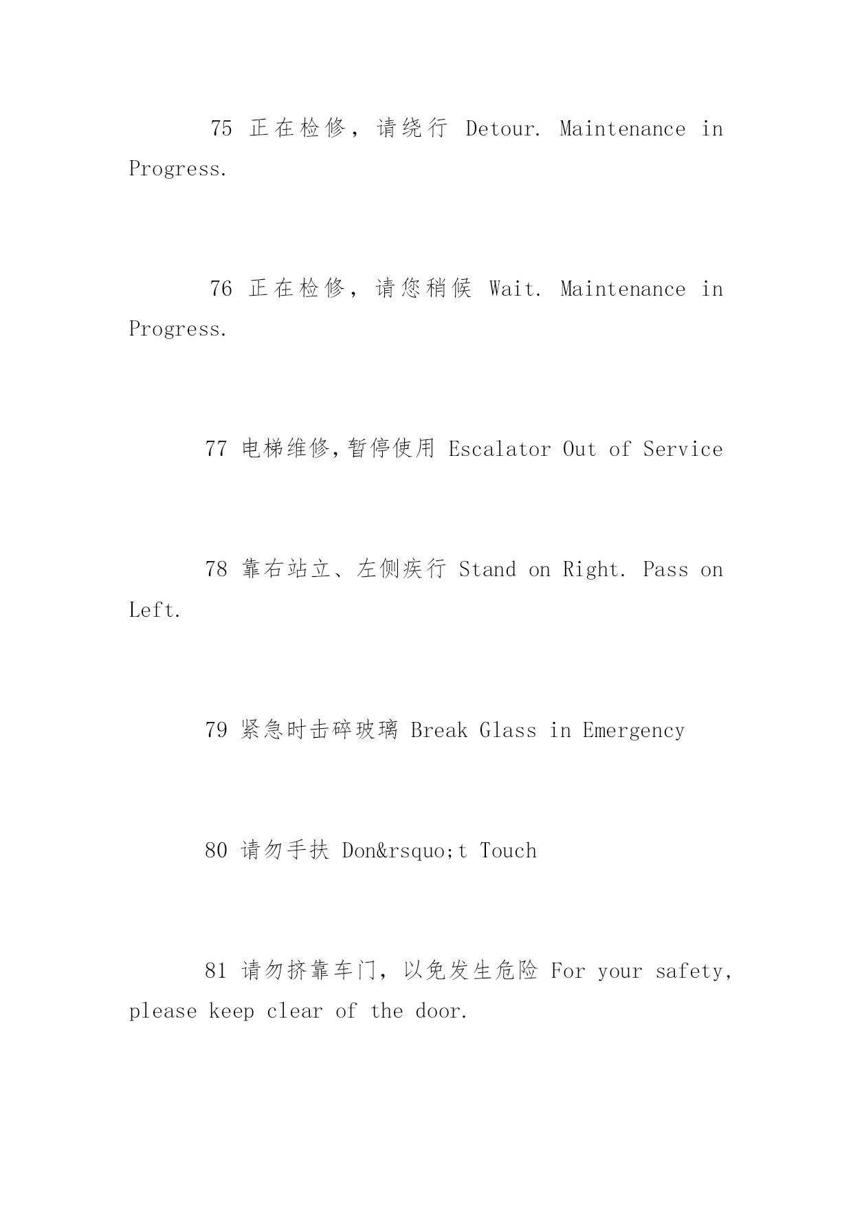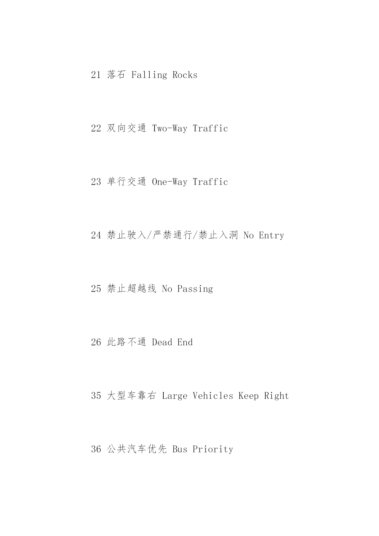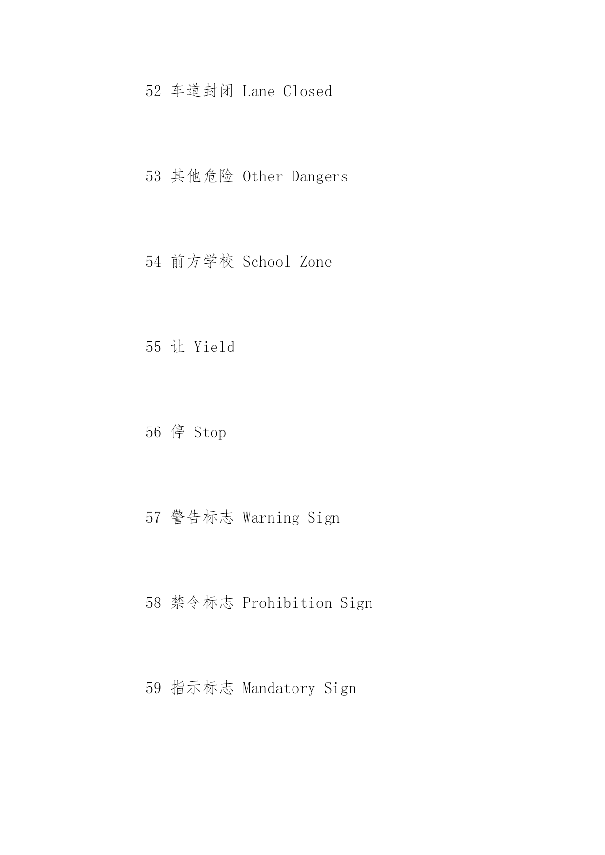 交通道路常见英文标识交通道路常见英文标识导语:交通道路是指公路、城市道路和虽在单位管辖范围但允许社会机动车通行的地方,包括广场、公共停车场等用于公众通行的场所。下面是YJBYS小编收集整理的交通道路常见英文标识,希望对你有帮助!一1爬坡车道SteepGrade2长下坡慢行SteepSlope-SlowDown3陡坡减速SteepIncline-SlowDown4追尾危险Don'tFollowTooClosely5小心路滑SlipperyWhenWet6保持车距MaintainSafeDistance7事故多发点AccidentArea8保护动物WatchforAnimals9道路交通信息TrafficInformation10多雾路段FoggyArea11软基路段SoftRoadbed12堤坝路EmbankmentRoad13明槽路段Underpass14深槽路段Underpass15道路封闭RoadClosed16车辆慢行SlowDown17道路施工RoadWorkAhead18车辆绕行Detour19前方弯道BendAhead20方向引导DirectionSign21落石FallingRocks22双向交通Two-WayTraffic23单行交通One-WayTraffic24禁止驶入/严禁通行/禁止入洞NoEntry25禁止超越线NoPassing26此路不通DeadEnd35大型车靠右LargeVehiclesKeepRight36公共汽车优先BusPriority37请系好安全带BuckleUp38严禁酒后开车Don'tDrinkandDrive39请勿疲劳驾驶Don'tDriveWhenTired40禁扔废弃物NoLittering41禁用手机Don'tUseCellphonesWhenDriving42禁止超载Don'tExceedWeightLimit43禁止超高Don'tExceedHeightLimit44严禁超速Don'tExceedSpeedLimit45专心驾驶谨防追尾DriveCarefully46请按车道行驶/分道行驶UseCorrectLane47紧急情况请拨打XXXCallXXXinEmergency48前方500m进入无路灯路段NoRoadLightsafter500m49无路灯路段全长9kmNoRoadLightsfor9km50路面结冰IcyRoad51注意横风Danger!CrossWind52车道封闭LaneClosed53其他危险OtherDangers54前方学校SchoolZone55让Yield56停Stop57警告标志WarningSign58禁令标志ProhibitionSign59指示标志MandatorySign60指路标志GuideSign61旅游标志TouristSign62禁止摆卖VendorsProhibited/NoVendors63禁止跳下StayClearfromTracks64暂停售票TemporarilyClosed65禁止翻越NoCrossing66请勿挤靠KeepClearoftheDoor67请勿登踏Don’tStepOn68注意安全,请勿靠近KeepAwayforSafety69服务区域ServiceArea70办公区域AdministrativeArea71当心夹手WatchYourHand72贵重物品,随身携带PleaseDon’tLeaveValuablesUnattended73电梯故障停运正在维修,请原谅Escalatorunderrepair.Sorryfortheinconvenience.74施工(检修)给您带来不便请原谅Underconstruction(repair).Sorryfortheinconvenience.75正在检修,请绕行Detour.MaintenanceinProgress.76正在检修,请您稍候Wait.MaintenanceinProgress.77电梯维修,暂停使用EscalatorOutofService78靠右站立、左侧疾行StandonRight.PassonLeft.79紧急时击碎玻璃BreakGlassinEmergency80请勿手扶Don’tTouch81请勿挤靠车门,以免发生危险Foryoursafety,pleasekeepclearofthedoor.82为了行车安全,请勿打扰司机Don’tDistracttheDrive
