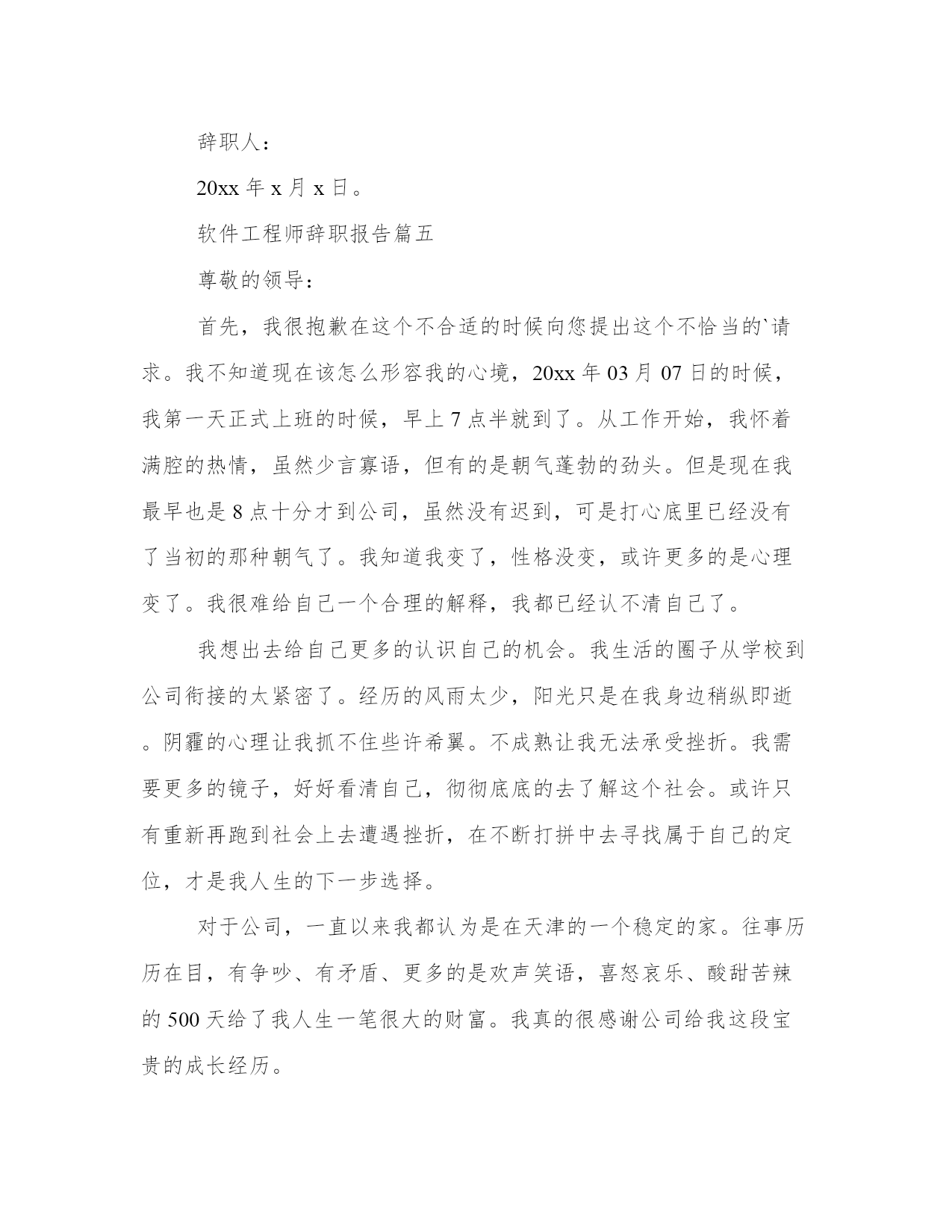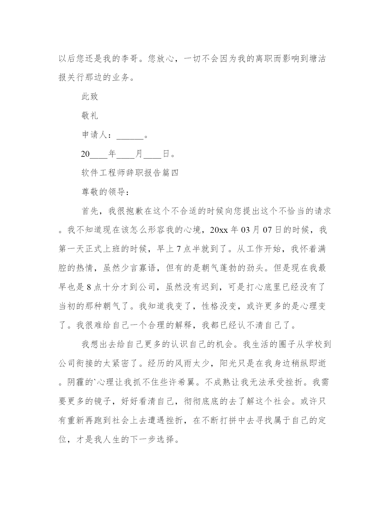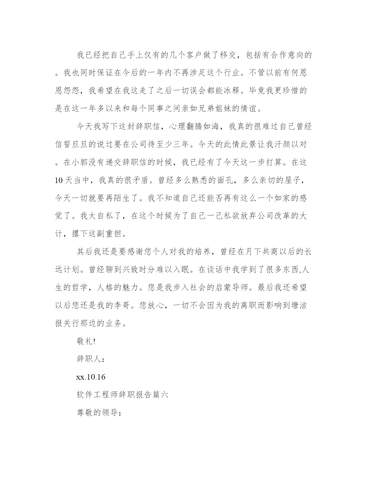 软件工程师辞职报告(实用8篇)报告的撰写需要经过反复修改和完善,确保内容的完整性和流畅性。报告的格式应该符合学术或机构的要求,包括字体、字号和引用格式等。报告写作需要耐心和细心,不仅要注意内容的充实和准确,还要注重形式的规范和美观。软件工程师辞职报告篇一尊敬的经理:您好!我是研发部程序员李涛,今天很遗憾向您提出辞职申请,对于我的辞职实属无奈之举。下面是我的辞职报告内容:我是从电子科大毕业就过来公司,三年的编程进历,虽然使我在各方面都提高了不少,然而离我实际的目标还是有很大的差距,这个跟公司和我自已都有关系,我觉得在公司里短期内不能让我自己满意。从目前的情况来看,在公司再待下去也不会有太大的改观。第一点、自我感觉职业生涯发展碰到了瓶颈;三年前是个程序员,现在也仍是程序员,虽然希望自己向技术管理方面发展,但是也没有这样的机会。从目前情况来看在公司继续发展也看不到下步该如何走,可能仍是一个程序员。第二点、技术上没有太大的提高;三年来做了不少产品,但感觉技术提高仍没有如自己所愿。三年前独立做出了____软件,现在仍是吃老本,只是稍熟练点而己。三年来我也在一直不断地学习,为公司的需要和自身的发展作着准备。从公司目前的产品发展方向来看,下一步能在技术上有大的突破的机会也多。第三点、薪资待遇未能如我愿;三年薪资虽然上涨了一些,到现在也可以说跟市场持平。但持平不是我想要的,到了这个阶段应该有一个大的提高了,我更希望有一个质变了。在公司再发展下去也不一定能见涨多少。从公司现在的发展来看,现在需要的可能是经验和薪资要求都适中的程序员。总之,辞职是有多方面的原因,最主要还是我自已的原因,现在我申请辞职,希望领导能够批准,我将尽最大努力做好交接工作。此致敬礼!辞职人:20____年____月____日。软件工程师辞职报告篇二尊敬的领导:首先,我很抱歉在这个不合适的时候向您提出这个不恰当的请求。我不知道现在该怎么形容我的心境,____年03月07日的时候,我第一天正式上班的时候,早上7点半就到了。从工作开始,我怀着满腔的热情,虽然少言寡语,但有的是朝气蓬勃的劲头。但是现在我最早也是8点十分才到公司,虽然没有迟到,可是打心底里已经没有了当初的那种朝气了。我知道我变了,性格没变,或许更多的是心理变了。我很难给自己一个合理的解释,我都已经认不清自己了。我想出去给自己更多的认识自己的机会。我生活的圈子从学校到公司衔接的太紧密了。经历的.风雨太少,阳光只是在我身边稍纵即逝。阴霾的心理让我抓不住些许希翼。不成熟让我无法承受挫折。我需要更多的镜子,好好看清自己,彻彻底底的去了解这个社会。或许只有重新再跑到社会上去遭遇挫折,在不断打拼中去寻找属于自己的定位,才是我人生的下一步选择。对于公司,一直以来我都认为是在天津的一个稳定的家。往事历历在目,有争吵、有矛盾、更多的是欢声笑语,喜怒哀乐、酸甜苦辣的500天给了我人生一笔很大的财富。我真的很感谢公司给我这段宝贵的成长经历。我已经把自己手上仅有的几个客户做了移交,包括有合作意向的。我也同时保证在今后的一年内不再涉足这个行业。不管以前有何恩恩怨怨,我希望在我这走了之后一切误会都能冰释。毕竟我更珍惜的是在这一年多以来和每个同事之间亲如兄弟姐妹的情谊。今天我写下这封辞职信,心理翻腾如海,我真的很难过自己曾经信誓旦旦的说过要在公司待至少三年。今天的此情此景让我汗颜以对。在小郭没有递交辞职信的时候,我已经有了今天这一步打算。在这10天当中,我真的很矛盾。曾经多么熟悉的面孔,多么亲切的屋子,今天一切就要再陌生了。我不知道自己还能否再有这么一个如家的感觉了。我太自私了,在这个时候为了自己一己私欲放弃公司改革的大计,撂下这副重担。其后我还是要感谢您个人对我的培养,曾经在月下共商以后的长远计划。曾经聊到兴致时分难以入眠。在谈话中我学到了很多东西,人生的哲学,人格的魅力。您是我步入社会的启蒙导师。最后我还希望以后您还是我的李哥。您放心,一切不会因为我的离职而影响到塘沽报关行那边的业务。辞职人:____。软件工程师辞职报告篇三尊敬的领导:首先,我很抱歉在这个不合适的时候向您提出这个不恰当的请求。我不知道现在该怎么形容我的心境,____年03月07日的时候,我第一天正式上班的时候,早上7点半就到了。从工作开始,我怀着满腔的热情,虽然少言寡语,但有的是朝气蓬勃的劲头。但是现在我最早也是8点十分才到公司,虽然没有迟到,可是打心底里已经没有了当初的那种朝气了。我知道我变了,性格没变,或许更多的是心理变了。我很难给自己一个合理的解释,我都已经认不清自己了。我想出去给自己更多的认识自己的机会。我生活的圈子从学校到公司衔接的太紧密了。经历的风雨太少,阳光只是在我身边稍纵即逝。阴霾的心理让我抓不住些许希翼。
