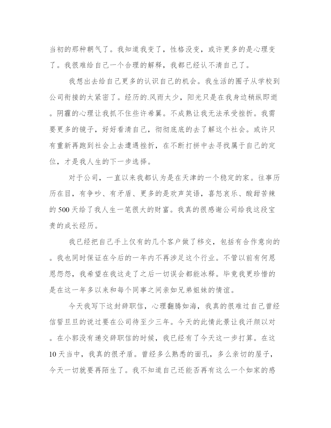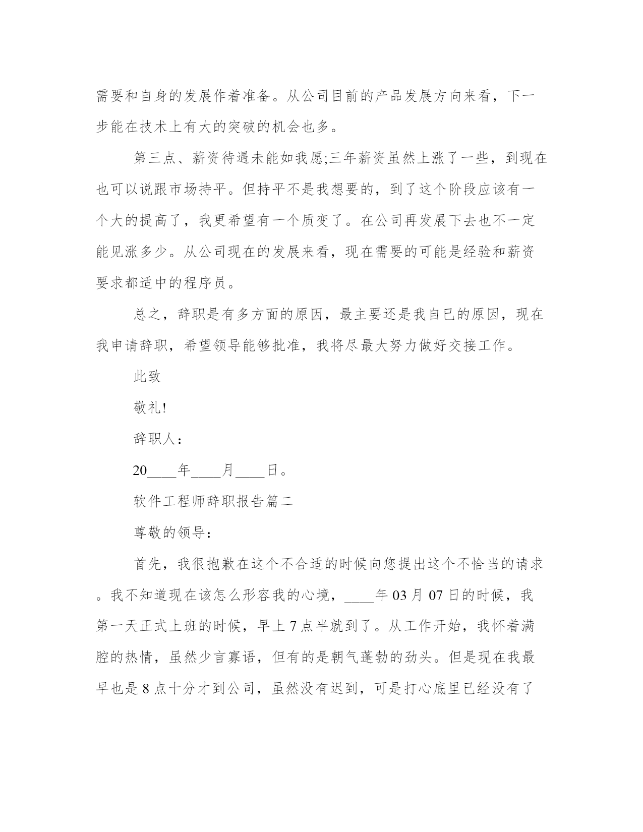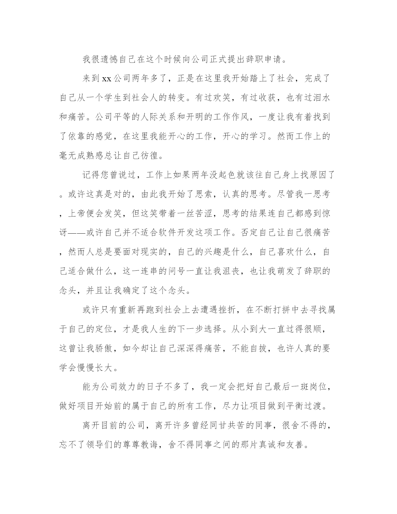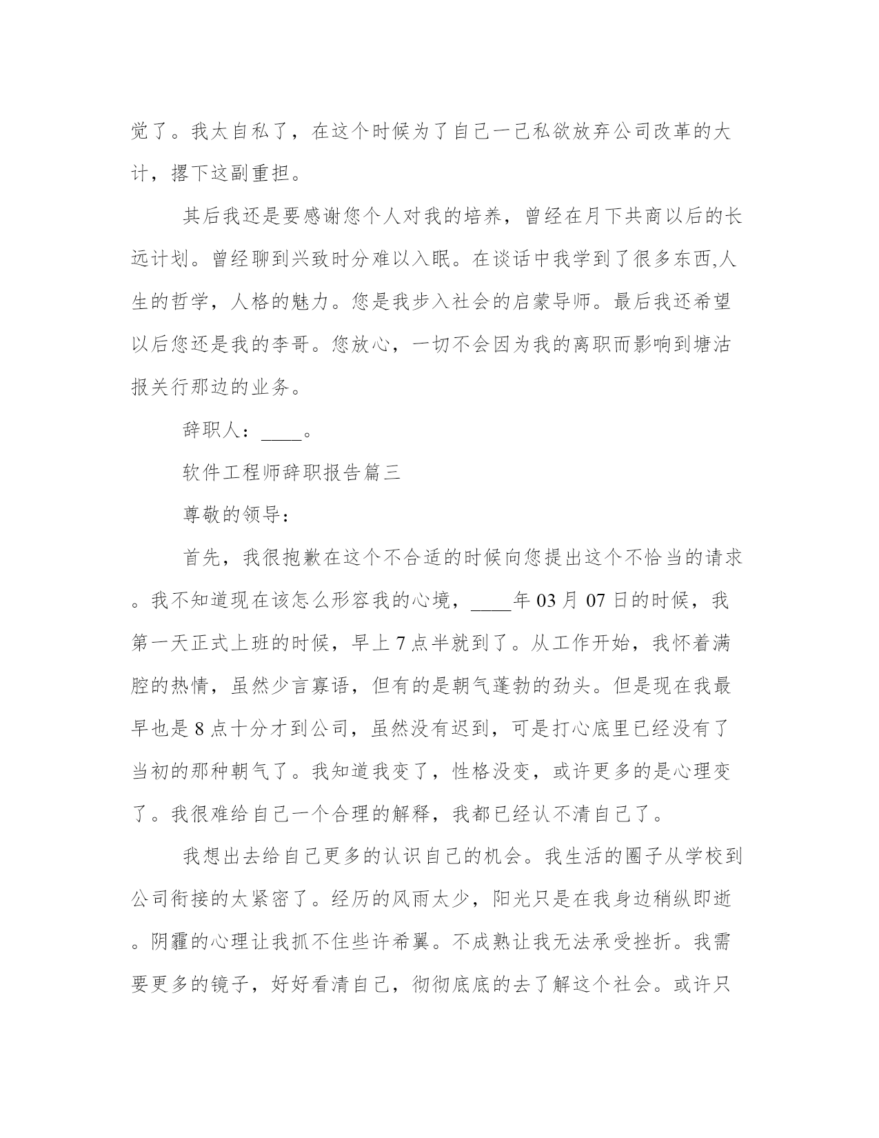 软件工程师辞职报告(实用8篇)报告的撰写需要经过反复修改和完善,确保内容的完整性和流畅性。报告的格式应该符合学术或机构的要求,包括字体、字号和引用格式等。报告写作需要耐心和细心,不仅要注意内容的充实和准确,还要注重形式的规范和美观。软件工程师辞职报告篇一尊敬的经理:您好!我是研发部程序员李涛,今天很遗憾向您提出辞职申请,对于我的辞职实属无奈之举。下面是我的辞职报告内容:我是从电子科大毕业就过来公司,三年的编程进历,虽然使我在各方面都提高了不少,然而离我实际的目标还是有很大的差距,这个跟公司和我自已都有关系,我觉得在公司里短期内不能让我自己满意。从目前的情况来看,在公司再待下去也不会有太大的改观。第一点、自我感觉职业生涯发展碰到了瓶颈;三年前是个程序员,现在也仍是程序员,虽然希望自己向技术管理方面发展,但是也没有这样的机会。从目前情况来看在公司继续发展也看不到下步该如何走,可能仍是一个程序员。第二点、技术上没有太大的提高;三年来做了不少产品,但感觉技术提高仍没有如自己所愿。三年前独立做出了____软件,现在仍是吃老本,只是稍熟练点而己。三年来我也在一直不断地学习,为公司的需要和自身的发展作着准备。从公司目前的产品发展方向来看,下一步能在技术上有大的突破的机会也多。第三点、薪资待遇未能如我愿;三年薪资虽然上涨了一些,到现在也可以说跟市场持平。但持平不是我想要的,到了这个阶段应该有一个大的提高了,我更希望有一个质变了。在公司再发展下去也不一定能见涨多少。从公司现在的发展来看,现在需要的可能是经验和薪资要求都适中的程序员。总之,辞职是有多方面的原因,最主要还是我自已的原因,现在我申请辞职,希望领导能够批准,我将尽最大努力做好交接工作。此致敬礼!辞职人:20____年____月____日。软件工程师辞职报告篇二尊敬的领导:首先,我很抱歉在这个不合适的时候向您提出这个不恰当的请求。我不知道现在该怎么形容我的心境,____年03月07日的时候,我第一天正式上班的时候,早上7点半就到了。从工作开始,我怀着满腔的热情,虽然少言寡语,但有的是朝气蓬勃的劲头。但是现在我最早也是8点十分才到公司,虽然没有迟到,可是打心底里已经没有了当初的那种朝气了。我知道我变了,性格没变,或许更多的是心理变了。我很难给自己一个合理的解释,我都已经认不清自己了。我想出去给自己更多的认识自己的机会。我生活的圈子从学校到公司衔接的太紧密了。经历的.风雨太少,阳光只是在我身边稍纵即逝。阴霾的心理让我抓不住些许希翼。不成熟让我无法承受挫折。我需要更多的镜子,好好看清自己,彻彻底底的去了解这个社会。或许只有重新再跑到社会上去遭遇挫折,在不断打拼中去寻找属于自己的定位,才是我人生的下一步选择。对于公司,一直以来我都认为是在天津的一个稳定的家。往事历历在目,有争吵、有矛盾、更多的是欢声笑语,喜怒哀乐、酸甜苦辣的500天给了我人生一笔很大的财富。我真的很感谢公司给我这段宝贵的成长经历。我已经把自己手上仅有的几个客户做了移交,包括有合作意向的。我也同时保证在今后的一年内不再涉足这个行业。不管以前有何恩恩怨怨,我希望在我这走了之后一切误会都能冰释。毕竟我更珍惜的是在这一年多以来和每个同事之间亲如兄弟姐妹的情谊。今天我写下这封辞职信,心理翻腾如海,我真的很难过自己曾经信誓旦旦的说过要在公司待至少三年。今天的此情此景让我汗颜以对。在小郭没有递交辞职信的时候,我已经有了今天这一步打算。在这10天当中,我真的很矛盾。曾经多么熟悉的面孔,多么亲切的屋子,今天一切就要再陌生了。我不知道自己还能否再有这么一个如家的感觉了。我太自私了,在这个时候为了自己一己私欲放弃公司改革的大计,撂下这副重担。其后我还是要感谢您个人对我的培养,曾经在月下共商以后的长远计划。曾经聊到兴致时分难以入眠。在谈话中我学到了很多东西,人生的哲学,人格的魅力。您是我步入社会的启蒙导师。最后我还希望以后您还是我的李哥。您放心,一切不会因为我的离职而影响到塘沽报关行那边的业务。辞职人:____。软件工程师辞职报告篇三尊敬的领导:首先,我很抱歉在这个不合适的时候向您提出这个不恰当的请求。我不知道现在该怎么形容我的心境,____年03月07日的时候,我第一天正式上班的时候,早上7点半就到了。从工作开始,我怀着满腔的热情,虽然少言寡语,但有的是朝气蓬勃的劲头。但是现在我最早也是8点十分才到公司,虽然没有迟到,可是打心底里已经没有了当初的那种朝气了。我知道我变了,性格没变,或许更多的是心理变了。我很难给自己一个合理的解释,我都已经认不清自己了。我想出去给自己更多的认识自己的机会。我生活的圈子从学校到公司衔接的太紧密了。经历的风雨太少,阳光只是在我身边稍纵即逝。阴霾的心理让我抓不住些许希翼。