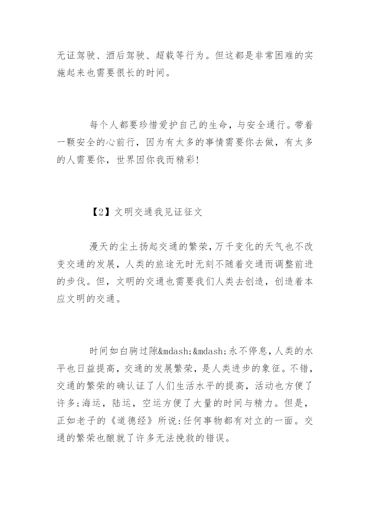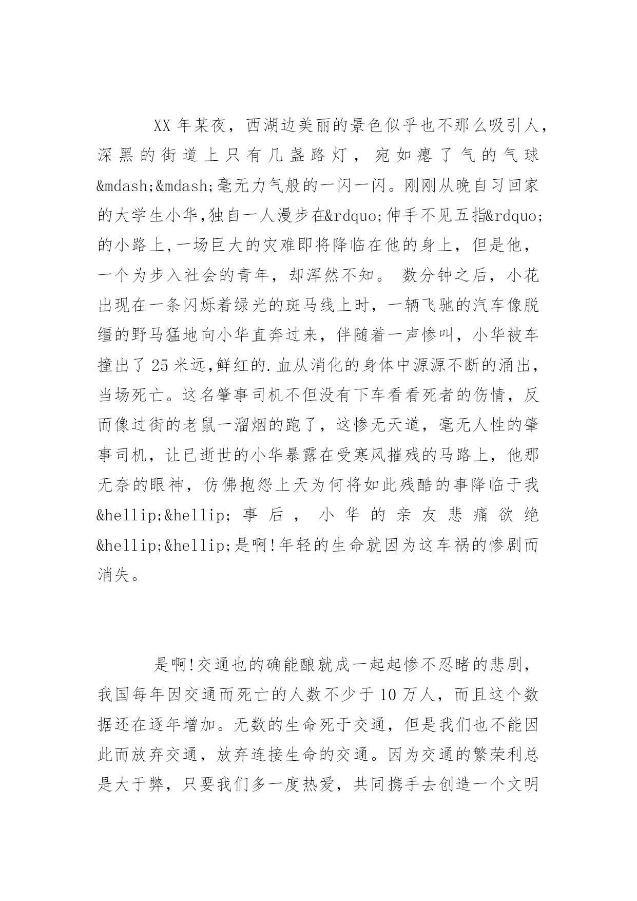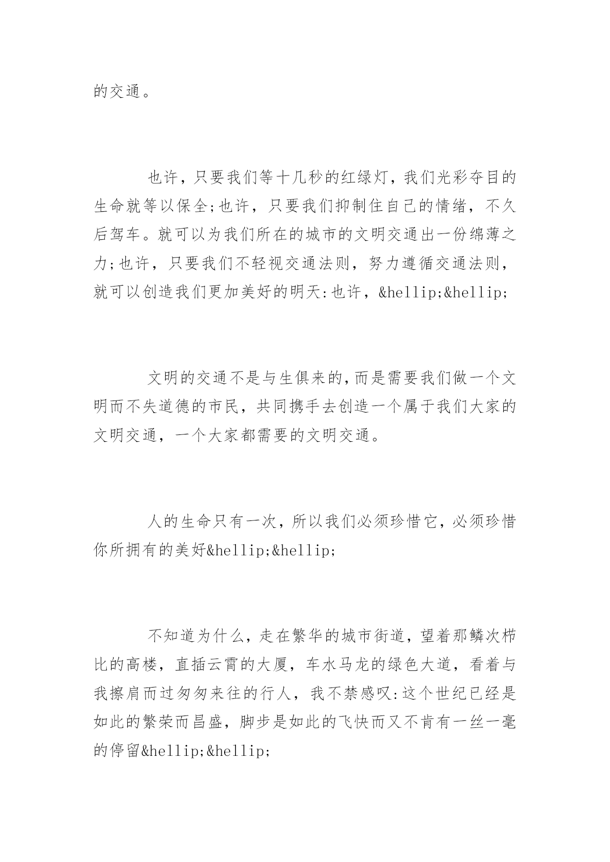 文明交通我见证征文优秀篇文明交通我见证征文优秀篇文明交通在心中,人人讲安全,户户重家教,让我们同心协力以身作则,从身边小事做起,开慢车,遵循各种交通指示标志,学习《交通法》,安全出行,平安路上。下面是小编整理的关于文明交通我见证征文,欢迎大家参考!【1】文明交通我见证征文生命是宝贵的,每个人的生命只有一次。但生命又是渺小脆弱的。据调查,每年有许多的人都死于车祸,有许多的人因车祸倾家荡产,一生在病床上度过。车祸,这个不起眼却又可怕的字眼,给无数的人带来灾难。现在,经济水平高,科技发达,人们的生活水平也有很大的提高,很多人都有自己的小汽车,在高速公路上疾驰,像箭一样快速的穿越,在人们的目光中瞬间闪过。这种高科技虽给人们带来方便,但也给人们带来很多灾难,在全国各地,每时每刻都会发生交通事故。请听以下几个故事:年以40的杨某原本有着美好的前程。2003年他因工作出色被某市物资局推荐借调到某旅游开发公司旅游部工作。年富力强的他准备雄心勃勃地大干一场,然而悲剧却在一瞬间发生了。2003年7月的一天,由于发生了车祸,杨某当场受了重伤,从此,他成了一名整天瘫在床上的残疾人。消息传来,年过六旬的老父和年轻的妻子都昏厥了过去……2009年暑假,我姐夫带着姐姐在回家的路上,与一辆打车相撞,姐姐的腿骨断了,姐夫也昏迷不醒,姐姐哭着给大姨打电话,大姨接到电话后,大脑一片空白,不知所措,他告诉大姨夫,马上去了医院。姐姐在手术室待了6个小时,出来后腿不能动,当然是无比疼痛,看她那痛苦的样子,听到她那揪心的痛哭声,我的心里也很难受。我痛恨车祸,他带走了人们宝贵的生命,带给人们身体和心理上的伤害和痛苦。每当听到哪里出了车祸,哪个人因车祸住院,我的心里都刀割般的难受。如果每个人都遵守交通规则,在路上相互谦让,或许就不会发生交通事故。执法部门应加大执法力度,严厉惩处违反交通规则的行为。如无证驾驶、酒后驾驶、超载等行为。但这都是非常困难的实施起来也需要很长的时间。每个人都要珍惜爱护自己的生命,与安全通行。带着一颗安全的心前行,因为有太多的事情需要你去做,有太多的人需要你,世界因你我而精彩!【2】文明交通我见证征文漫天的尘土扬起交通的繁荣,万千变化的天气也不改变交通的发展,人类的旅途无时无刻不随着交通而调整前进的步伐。但,文明的交通也需要我们人类去创造,创造着本应文明的交通。时间如白驹过隙——永不停息,人类的水平也日益提高,交通的发展繁荣,是人类进步的象征。不错,交通的繁荣的确认证了人们生活水平的提高,活动也方便了许多;海运,陆运,空运方便了大量的时间与精力。但是,正如老子的《道德经》所说:任何事物都有对立的一面。交通的繁荣也酿就了许多无法挽救的错误。XX年某夜,西湖边美丽的景色似乎也不那么吸引人,深黑的街道上只有几盏路灯,宛如瘪了气的气球——毫无力气般的一闪一闪。刚刚从晚自习回家的大学生小华,独自一人漫步在”伸手不见五指”的小路上,一场巨大的灾难即将降临在他的身上,但是他,一个为步入社会的青年,却浑然不知。数分钟之后,小花出现在一条闪烁着绿光的斑马线上时,一辆飞驰的汽车像脱缰的野马猛地向小华直奔过来,伴随着一声惨叫,小华被车撞出了25米远,鲜红的.血从消化的身体中源源不断的涌出,当场死亡。这名肇事司机不但没有下车看看死者的伤情,反而像过街的老鼠一溜烟的跑了,这惨无天道,毫无人性的肇事司机,让已逝世的小华暴露在受寒风摧残的马路上,他那无奈的眼神,仿佛抱怨上天为何将如此残酷的事降临于我……事后,小华的亲友悲痛欲绝……是啊!年轻的生命就因为这车祸的惨剧而消失。是啊!交通也的确能酿就成一起起惨不忍睹的悲剧,我国每年因交通而死亡的人数不少于10万人,而且这个数据还在逐年增加。无数的生命死于交通,但是我们也不能因此而放弃交通,放弃连接生命的交通。因为交通的繁荣利总是大于弊,只要我们多一度热爱,共同携手去创造一个文明的交通。也许,只要我们等十几秒的红绿灯,我们光彩夺目的生命就等以保全;也许,只要我们抑制住自己的情绪,不久后驾车。就可以为我们所在的城市的文明交通出一份绵薄之力;也许,只要我们不轻视交通法则,努力遵循交通法则,就可以创造我们更加美好的明天:也许,……文明的交通不是与生俱来的,而是需要我们做一个文明而不失道德的市民,共同携手去创造一个属于我们大家的文明交通,一个大家都需要的文明交通。人的生命只有一次,所以我们必须珍惜它,必须珍惜你所拥有的美好……不知道为什么,走在繁华的城市街道,望着那鳞次栉比的高楼,直插云霄的大厦,车水马龙