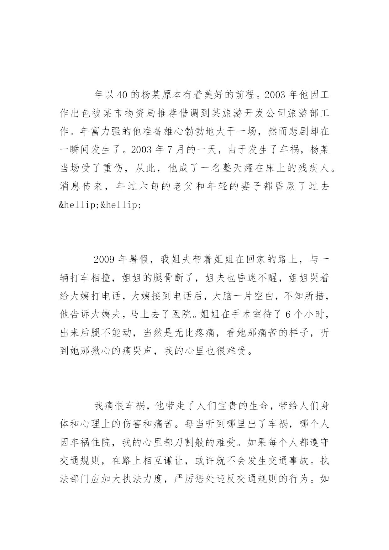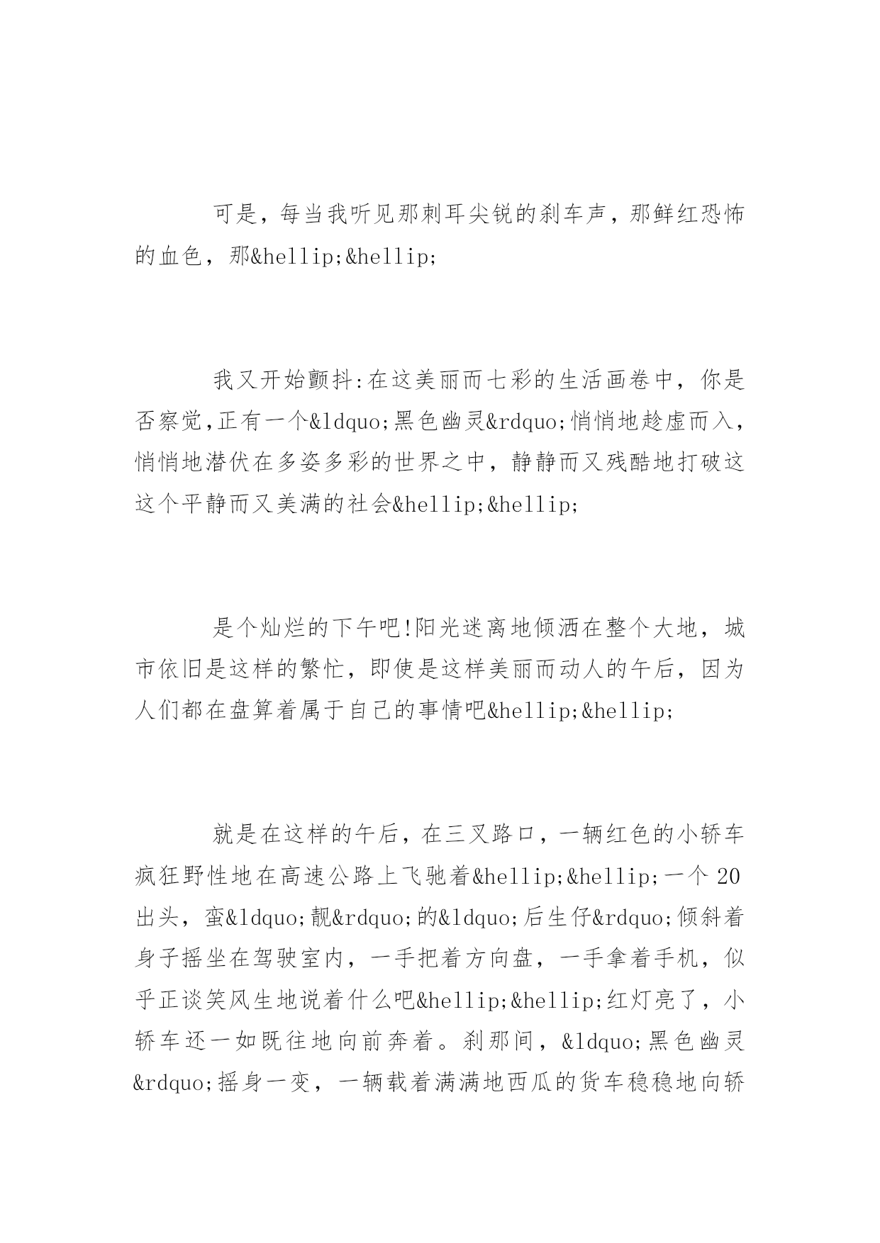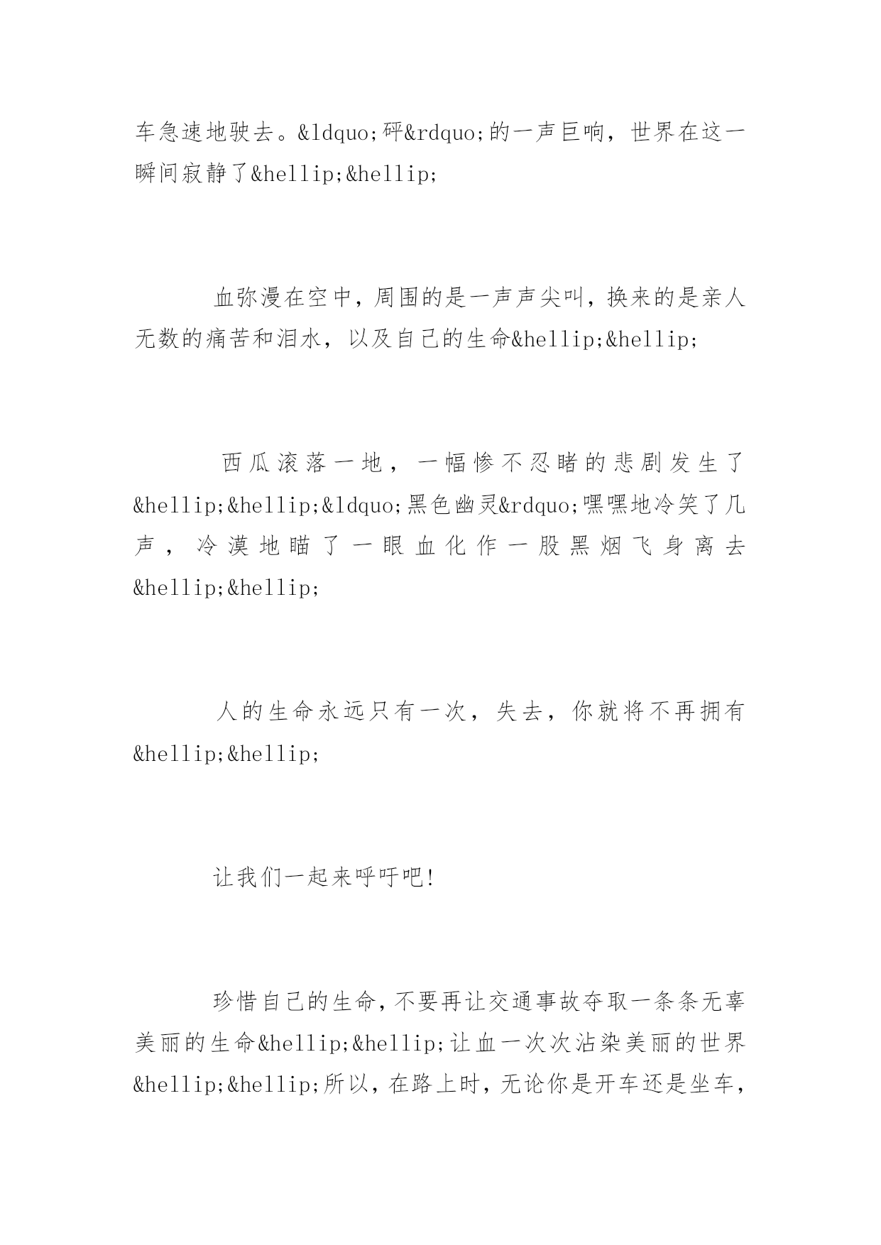 文明交通我见证征文优秀篇文明交通我见证征文优秀篇文明交通在心中,人人讲安全,户户重家教,让我们同心协力以身作则,从身边小事做起,开慢车,遵循各种交通指示标志,学习《交通法》,安全出行,平安路上。下面是小编整理的关于文明交通我见证征文,欢迎大家参考!【1】文明交通我见证征文生命是宝贵的,每个人的生命只有一次。但生命又是渺小脆弱的。据调查,每年有许多的人都死于车祸,有许多的人因车祸倾家荡产,一生在病床上度过。车祸,这个不起眼却又可怕的字眼,给无数的人带来灾难。现在,经济水平高,科技发达,人们的生活水平也有很大的提高,很多人都有自己的小汽车,在高速公路上疾驰,像箭一样快速的穿越,在人们的目光中瞬间闪过。这种高科技虽给人们带来方便,但也给人们带来很多灾难,在全国各地,每时每刻都会发生交通事故。请听以下几个故事:年以40的杨某原本有着美好的前程。2003年他因工作出色被某市物资局推荐借调到某旅游开发公司旅游部工作。年富力强的他准备雄心勃勃地大干一场,然而悲剧却在一瞬间发生了。2003年7月的一天,由于发生了车祸,杨某当场受了重伤,从此,他成了一名整天瘫在床上的残疾人。消息传来,年过六旬的老父和年轻的妻子都昏厥了过去……2009年暑假,我姐夫带着姐姐在回家的路上,与一辆打车相撞,姐姐的腿骨断了,姐夫也昏迷不醒,姐姐哭着给大姨打电话,大姨接到电话后,大脑一片空白,不知所措,他告诉大姨夫,马上去了医院。姐姐在手术室待了6个小时,出来后腿不能动,当然是无比疼痛,看她那痛苦的样子,听到她那揪心的痛哭声,我的心里也很难受。我痛恨车祸,他带走了人们宝贵的生命,带给人们身体和心理上的伤害和痛苦。每当听到哪里出了车祸,哪个人因车祸住院,我的心里都刀割般的难受。如果每个人都遵守交通规则,在路上相互谦让,或许就不会发生交通事故。执法部门应加大执法力度,严厉惩处违反交通规则的行为。如无证驾驶、酒后驾驶、超载等行为。但这都是非常困难的实施起来也需要很长的时间。每个人都要珍惜爱护自己的生命,与安全通行。带着一颗安全的心前行,因为有太多的事情需要你去做,有太多的人需要你,世界因你我而精彩!【2】文明交通我见证征文漫天的尘土扬起交通的繁荣,万千变化的天气也不改变交通的发展,人类的旅途无时无刻不随着交通而调整前进的步伐。但,文明的交通也需要我们人类去创造,创造着本应文明的交通。时间如白驹过隙——永不停息,人类的水平也日益提高,交通的发展繁荣,是人类进步的象征。不错,交通的繁荣的确认证了人们生活水平的提高,活动也方便了许多;海运,陆运,空运方便了大量的时间与精力。但是,正如老子的《道德经》所说:任何事物都有对立的一面。交通的繁荣也酿就了许多无法挽救的错误。XX年某夜,西湖边美丽的景色似乎也不那么吸引人,深黑的街道上只有几盏路灯,宛如瘪了气的气球——毫无力气般的一闪一闪。刚刚从晚自习回家的大学生小华,独自一人漫步在”伸手不见五指”的小路上,一场巨大的灾难即将降临在他的身上,但是他,一个为步入社会的青年,却浑然不知。数分钟之后,小花出现在一条闪烁着绿光的斑马线上时,一辆飞驰的汽车像脱缰的野马猛地向小华直奔过来,伴随着一声惨叫,小华被车撞出了25米远,鲜红的.血从消化的身体中源源不断的涌出,当场死亡。这名肇事司机不但没有下车看看死者的伤情,反而像过街的老鼠一溜烟的跑了,这惨无天道,毫无人性的肇事司机,让已逝世的小华暴露在受寒风摧残的马路上,他那无奈的眼神,仿佛抱怨上天为何将如此残酷的事降临于我……事后,小华的亲友悲痛欲绝……是啊!年轻的生命就因为这车祸的惨剧而消失。是啊!交通也的确能酿就成一起起惨不忍睹的悲剧,我国每年因交通而死亡的人数不少于10万人,而且这个数据还在逐年增加。无数的生命死于交通,但是我们也不能因此而放弃交通,放弃连接生命的交通。因为交通的繁荣利总是大于弊,只要我们多一度热爱,共同携手去创造一个文明的交通。也许,只要我们等十几秒的红绿灯,我们光彩夺目的生命就等以保全;也许,只要我们抑制住自己的情绪,不久后驾车。就可以为我们所在的城市的文明交通出一份绵薄之力;也许,只要我们不轻视交通法则,努力遵循交通法则,就可以创造我们更加美好的明天:也许,……文明的交通不是与生俱来的,而是需要我们做一个文明而不失道德的市民,共同携手去创造一个属于我们大家的文明交通,一个大家都需要的文明交通。人的生命只有一次,所以我们必须珍惜它,必须珍惜你所拥有的美好……不知道为什么,走在繁华的城市街道,望着那鳞次栉比的高楼,直插云霄的大厦,车水马龙