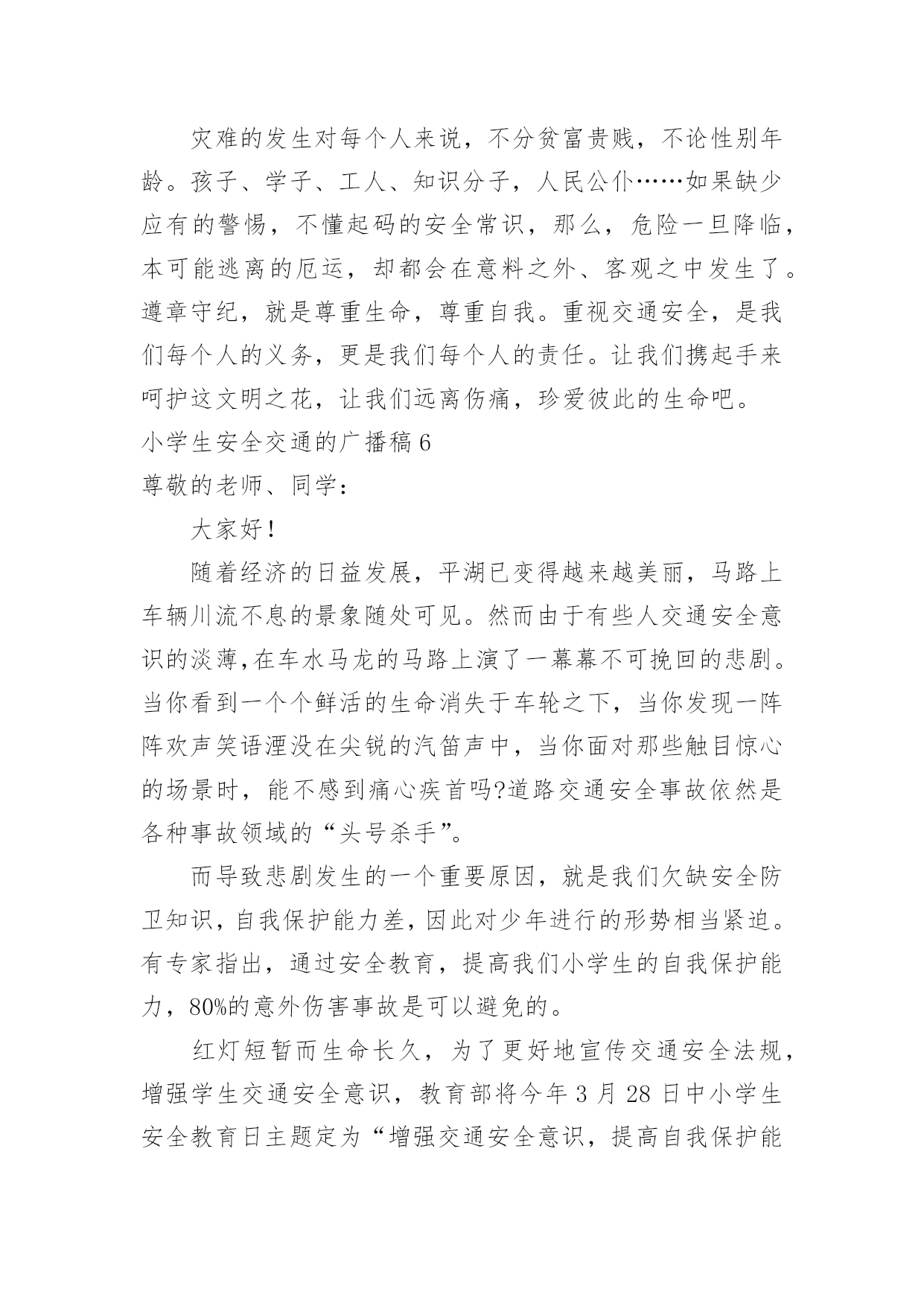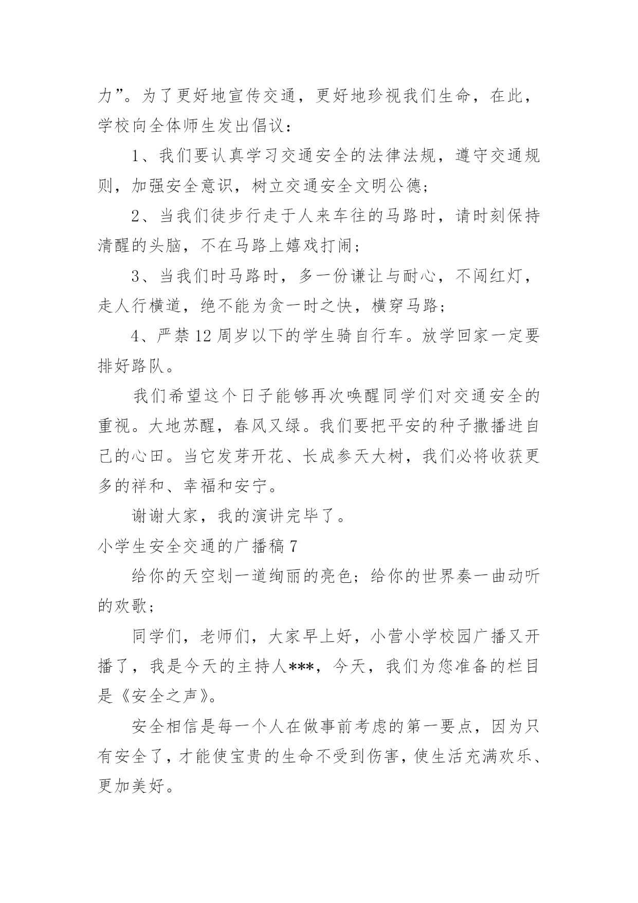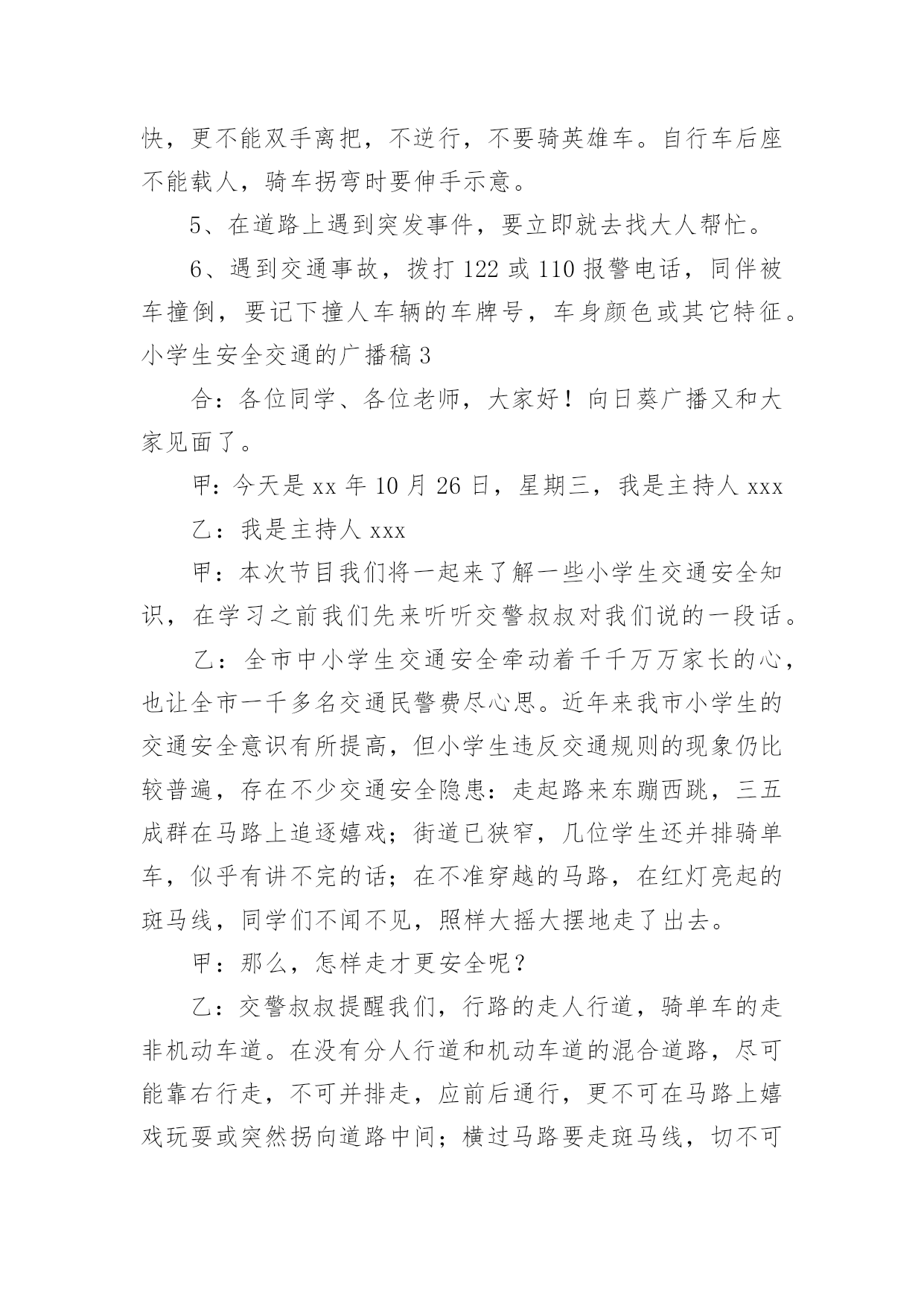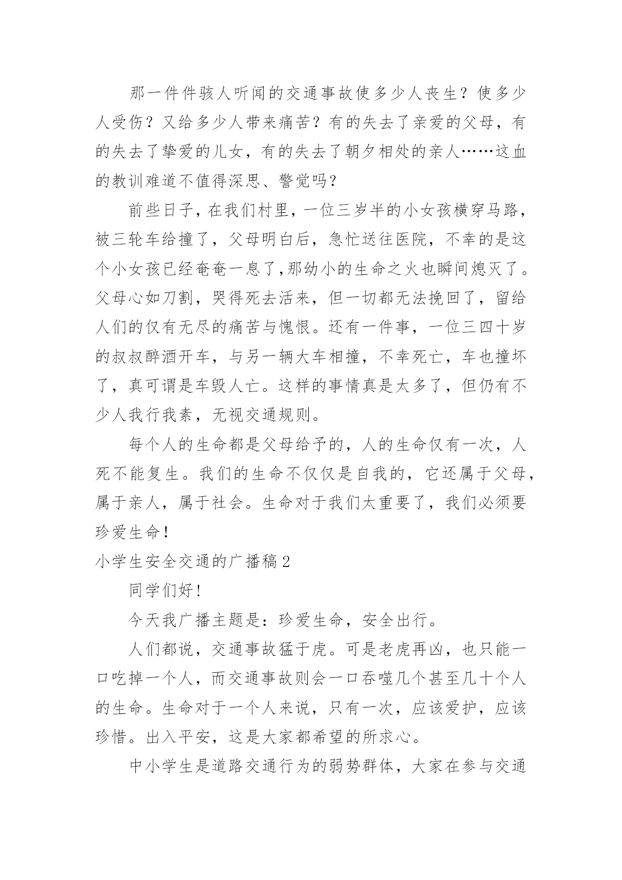 小学生安全交通的广播稿小学生安全交通的广播稿有在学校广播站锻炼的学生都知道,大家广播前都会预先做好广播稿,好的广播稿会带来更好的节目效果,那么问题来了,广播稿应该怎么写?下面是小编为大家收集的小学生安全交通的广播稿,仅供参考,大家一起来看看吧。小学生安全交通的广播稿1尊敬的教师,亲爱的同学:大家好!生命安全犹如泰山,我们必须要珍爱生命,远离危险。每年的交通事故不断发生,所以有许多人在交通事故上丢了自我的生命,这是让人多么痛哀的事情。当然,人们最不愿看到的是自我的亲人因为不注意,在那一瞬间闭上了双眼,从此离开人世!那么,今日让我来讲一讲如何珍爱生命吧!同学们,请你们想一想,当你在马路上嬉戏玩耍、追捉打闹时,你有没有想到过他的后果是什么?我们作为小学生,必须要学习交通规则,遵守交通规则。过马路上必须要看交通指示灯。红灯停,绿灯行,黄灯亮了等一等必须要熟记心头,照做执行。上学和下学之间是最重要的,不要在路上拥挤,这样最容易发生交通事故。不仅仅我们小学生要遵守交通规则,接送我们大人也要遵守。那一件件骇人听闻的交通事故使多少人丧生?使多少人受伤?又给多少人带来痛苦?有的失去了亲爱的父母,有的失去了挚爱的儿女,有的失去了朝夕相处的亲人……这血的教训难道不值得深思、警觉吗?前些日子,在我们村里,一位三岁半的小女孩横穿马路,被三轮车给撞了,父母明白后,急忙送往医院,不幸的是这个小女孩已经奄奄一息了,那幼小的生命之火也瞬间熄灭了。父母心如刀割,哭得死去活来,但一切都无法挽回了,留给人们的仅有无尽的痛苦与愧恨。还有一件事,一位三四十岁的叔叔醉酒开车,与另一辆大车相撞,不幸死亡,车也撞坏了,真可谓是车毁人亡。这样的事情真是太多了,但仍有不少人我行我素,无视交通规则。每个人的生命都是父母给予的,人的生命仅有一次,人死不能复生。我们的生命不仅仅是自我的,它还属于父母,属于亲人,属于社会。生命对于我们太重要了,我们必须要珍爱生命!小学生安全交通的广播稿2同学们好!今天我广播主题是:珍爱生命,安全出行。人们都说,交通事故猛于虎。可是老虎再凶,也只能一口吃掉一个人,而交通事故则会一口吞噬几个甚至几十个人的生命。生命对于一个人来说,只有一次,应该爱护,应该珍惜。出入平安,这是大家都希望的所求心。中小学生是道路交通行为的弱势群体,大家在参与交通的过程中,怎样保障自己的人身安全呢?首先,我们都来反省一下我们自己或身边同学的交通行为,是否曾经有过不遵守交通规则的行为,是否曾因自己不安全的交通行为而给自己带来过一些伤害。想想看,当你们走在马路上时,是不是有同学追追打打?是不是有同学边走边看书?是不是有同学随意横穿公路?是不是还有同学骑自行车时喜欢显示自己的本领,故意双手离把或单手骑车?当你们在马路上追打嘻闹或随意横穿公路时,你们是否意识到灾难会随时降临呢?我们平常骑车或走路、总免不了要横过马路,但在横过马路时,一定要看看左右来往的车辆,要确认安全之后再横过,在有人行横道或过街天桥或地下通道的地方,一定要走人行横道或过街设施。千万不能因抢时间,抢速度而随意横穿。现在,我教大家学习三大本领:一会走路、二会骑车、三会乘车1、走路时,要走人行道或在路边行走,过马路时,左右看,红灯停、绿灯行,不乱跑、不随意横穿,不在马路上追逐打闹、不攀爬栏杆,遵规矩、保生命。2、乘车时,等车停稳先下后上;坐车时不要把身体的任何部分伸出窗外,也不要向车外乱扔东西。3、不要搭乘超载车,如摩托、拐的等。更不要坐农用车,尤其是人货混装车。4、12岁以下不要骑车。骑车时要靠右走,车速不能过快,更不能双手离把,不逆行,不要骑英雄车。自行车后座不能载人,骑车拐弯时要伸手示意。5、在道路上遇到突发事件,要立即就去找大人帮忙。6、遇到交通事故,拨打122或110报警电话,同伴被车撞倒,要记下撞人车辆的车牌号,车身颜色或其它特征。小学生安全交通的广播稿3合:各位同学、各位老师,大家好!向日葵广播又和大家见面了。甲:今天是xx年10月26日,星期三,我是主持人xxx乙:我是主持人xxx甲:本次节目我们将一起来了解一些小学生交通安全知识,在学习之前我们先来听听交警叔叔对我们说的一段话。乙:全市中小学生交通安全牵动着千千万万家长的心,也让全市一千多名交通民警费尽心思。近年来我市小学生的交通安全意识有所提高,但小学生违反交通规则的现象仍比较普遍,存在不少交通安全隐患:走起路来东蹦西跳,三五成群在马路上追逐嬉戏;街道已狭窄,几位学生还并排骑单车,似乎有讲不完的话;在不准穿越的马路,在红灯亮起的斑马线,同学们不闻不见,照样大摇大摆地走了出去。甲:那么,怎样走才更安全呢?乙:交警叔叔提醒我们,行路的走人行道,骑单车的走非机动车道。在没有分人行道和机动车道的混合道路,尽可能靠右行走,不可并排走,应前后通行,更不可在马路上嬉戏