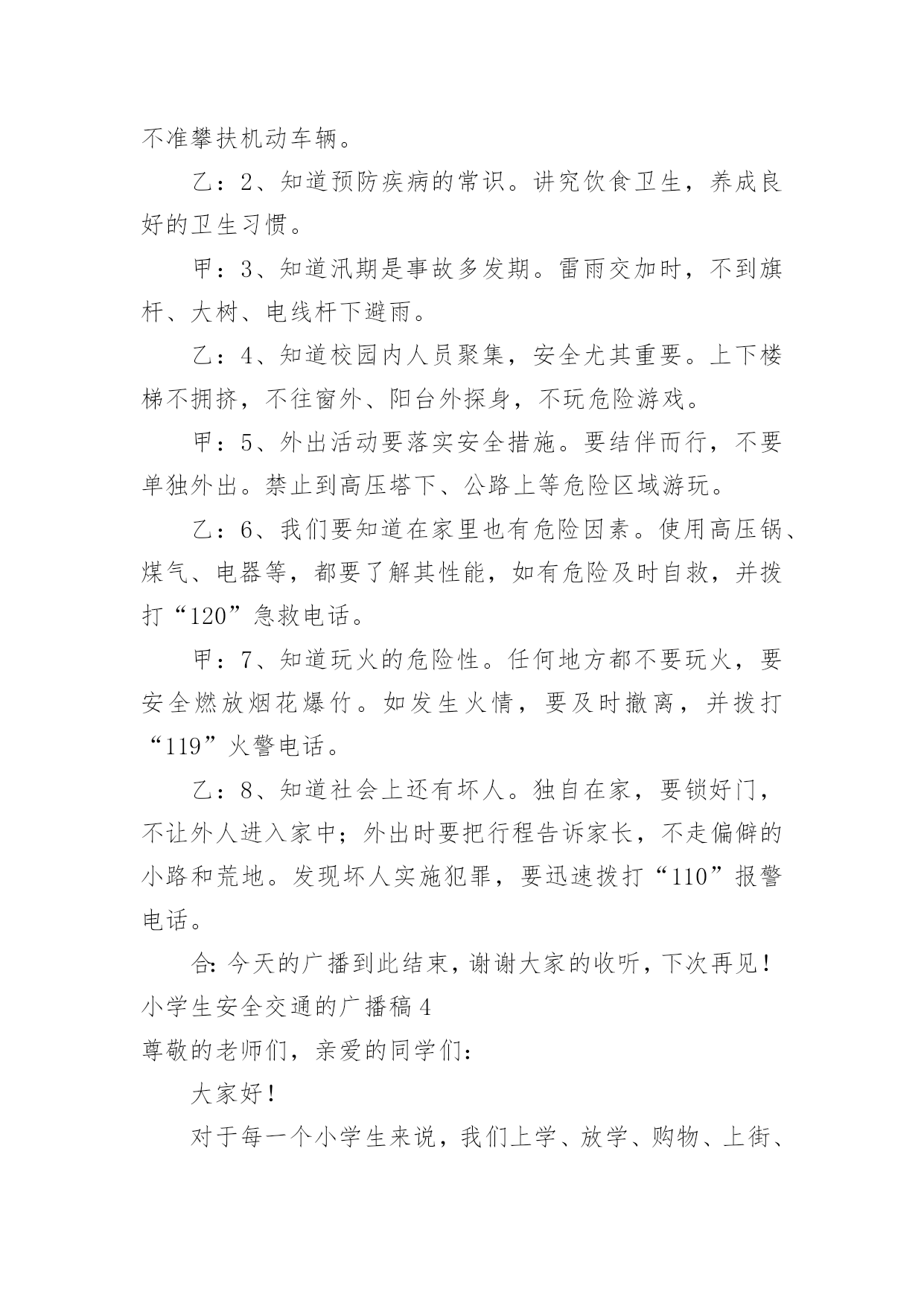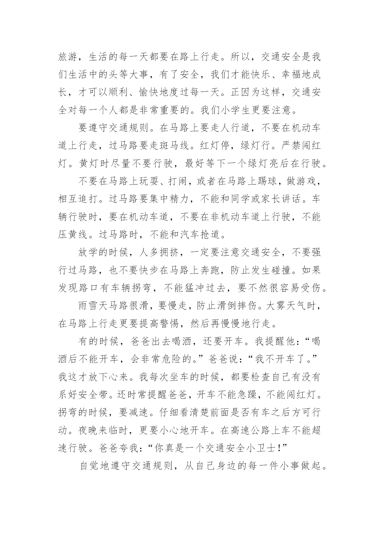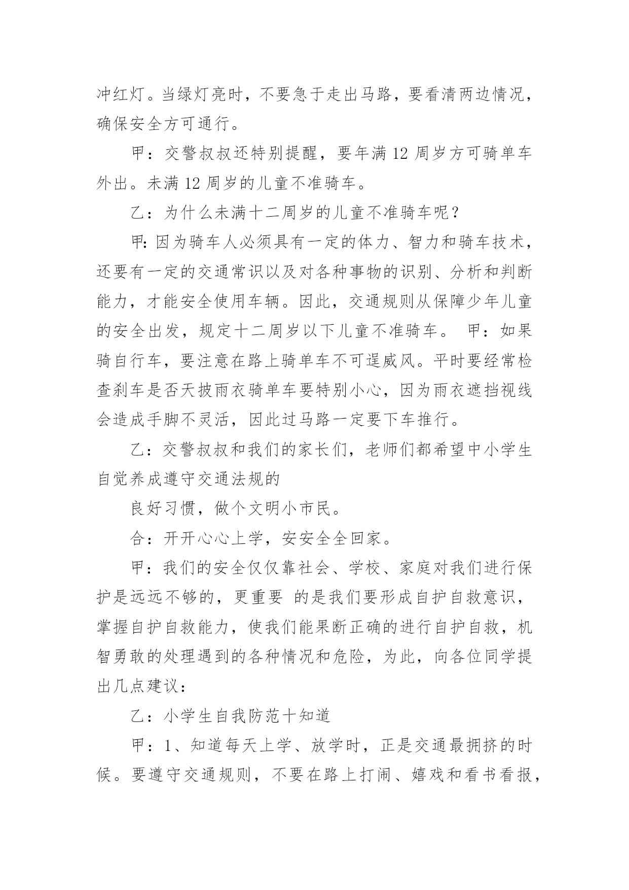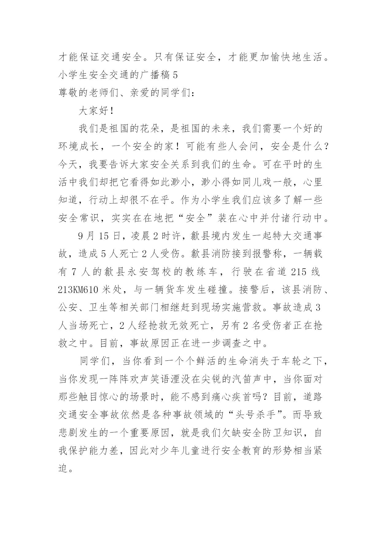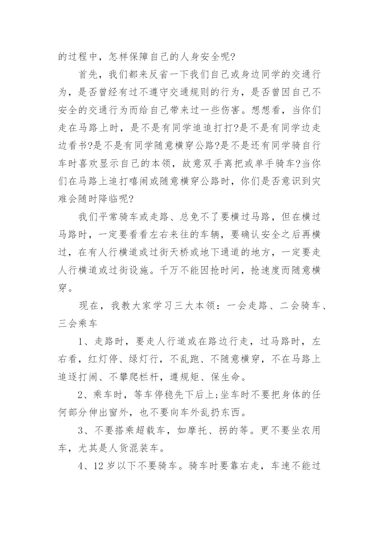 小学生安全交通的广播稿小学生安全交通的广播稿有在学校广播站锻炼的学生都知道,大家广播前都会预先做好广播稿,好的广播稿会带来更好的节目效果,那么问题来了,广播稿应该怎么写?下面是小编为大家收集的小学生安全交通的广播稿,仅供参考,大家一起来看看吧。小学生安全交通的广播稿1尊敬的教师,亲爱的同学:大家好!生命安全犹如泰山,我们必须要珍爱生命,远离危险。每年的交通事故不断发生,所以有许多人在交通事故上丢了自我的生命,这是让人多么痛哀的事情。当然,人们最不愿看到的是自我的亲人因为不注意,在那一瞬间闭上了双眼,从此离开人世!那么,今日让我来讲一讲如何珍爱生命吧!同学们,请你们想一想,当你在马路上嬉戏玩耍、追捉打闹时,你有没有想到过他的后果是什么?我们作为小学生,必须要学习交通规则,遵守交通规则。过马路上必须要看交通指示灯。红灯停,绿灯行,黄灯亮了等一等必须要熟记心头,照做执行。上学和下学之间是最重要的,不要在路上拥挤,这样最容易发生交通事故。不仅仅我们小学生要遵守交通规则,接送我们大人也要遵守。那一件件骇人听闻的交通事故使多少人丧生?使多少人受伤?又给多少人带来痛苦?有的失去了亲爱的父母,有的失去了挚爱的儿女,有的失去了朝夕相处的亲人……这血的教训难道不值得深思、警觉吗?前些日子,在我们村里,一位三岁半的小女孩横穿马路,被三轮车给撞了,父母明白后,急忙送往医院,不幸的是这个小女孩已经奄奄一息了,那幼小的生命之火也瞬间熄灭了。父母心如刀割,哭得死去活来,但一切都无法挽回了,留给人们的仅有无尽的痛苦与愧恨。还有一件事,一位三四十岁的叔叔醉酒开车,与另一辆大车相撞,不幸死亡,车也撞坏了,真可谓是车毁人亡。这样的事情真是太多了,但仍有不少人我行我素,无视交通规则。每个人的生命都是父母给予的,人的生命仅有一次,人死不能复生。我们的生命不仅仅是自我的,它还属于父母,属于亲人,属于社会。生命对于我们太重要了,我们必须要珍爱生命!小学生安全交通的广播稿2同学们好!今天我广播主题是:珍爱生命,安全出行。人们都说,交通事故猛于虎。可是老虎再凶,也只能一口吃掉一个人,而交通事故则会一口吞噬几个甚至几十个人的生命。生命对于一个人来说,只有一次,应该爱护,应该珍惜。出入平安,这是大家都希望的所求心。中小学生是道路交通行为的弱势群体,大家在参与交通的过程中,怎样保障自己的人身安全呢?首先,我们都来反省一下我们自己或身边同学的交通行为,是否曾经有过不遵守交通规则的行为,是否曾因自己不安全的交通行为而给自己带来过一些伤害。想想看,当你们走在马路上时,是不是有同学追追打打?是不是有同学边走边看书?是不是有同学随意横穿公路?是不是还有同学骑自行车时喜欢显示自己的本领,故意双手离把或单手骑车?当你们在马路上追打嘻闹或随意横穿公路时,你们是否意识到灾难会随时降临呢?我们平常骑车或走路、总免不了要横过马路,但在横过马路时,一定要看看左右来往的车辆,要确认安全之后再横过,在有人行横道或过街天桥或地下通道的地方,一定要走人行横道或过街设施。千万不能因抢时间,抢速度而随意横穿。现在,我教大家学习三大本领:一会走路、二会骑车、三会乘车1、走路时,要走人行道或在路边行走,过马路时,左右看,红灯停、绿灯行,不乱跑、不随意横穿,不在马路上追逐打闹、不攀爬栏杆,遵规矩、保生命。2、乘车时,等车停稳先下后上;坐车时不要把身体的任何部分伸出窗外,也不要向车外乱扔东西。3、不要搭乘超载车,如摩托、拐的等。更不要坐农用车,尤其是人货混装车。4、12岁以下不要骑车。骑车时要靠右走,车速不能过快,更不能双手离把,不逆行,不要骑英雄车。自行车后座不能载人,骑车拐弯时要伸手示意。5、在道路上遇到突发事件,要立即就去找大人帮忙。6、遇到交通事故,拨打122或110报警电话,同伴被车撞倒,要记下撞人车辆的车牌号,车身颜色或其它特征。小学生安全交通的广播稿3合:各位同学、各位老师,大家好!向日葵广播又和大家见面了。甲:今天是xx年10月26日,星期三,我是主持人xxx乙:我是主持人xxx甲:本次节目我们将一起来了解一些小学生交通安全知识,在学习之前我们先来听听交警叔叔对我们说的一段话。乙:全市中小学生交通安全牵动着千千万万家长的心,也让全市一千多名交通民警费尽心思。近年来我市小学生的交通安全意识有所提高,但小学生违反交通规则的现象仍比较普遍,存在不少交通安全隐患:走起路来东蹦西跳,三五成群在马路上追逐嬉戏;街道已狭窄,几位学生还并排骑单车,似乎有讲不完的话;在不准穿越的马路,在红灯亮起的斑马线,同学们不闻不见,照样大摇大摆地走了出去。甲:那么,怎样走才更安全呢?乙:交警叔叔提醒我们,行路的走人行道,骑单车的走非机动车道。在没有分人行道和机动车道的混合道路,尽可能靠右行走,不可并排走,应前后通行,更不可在马路上嬉戏