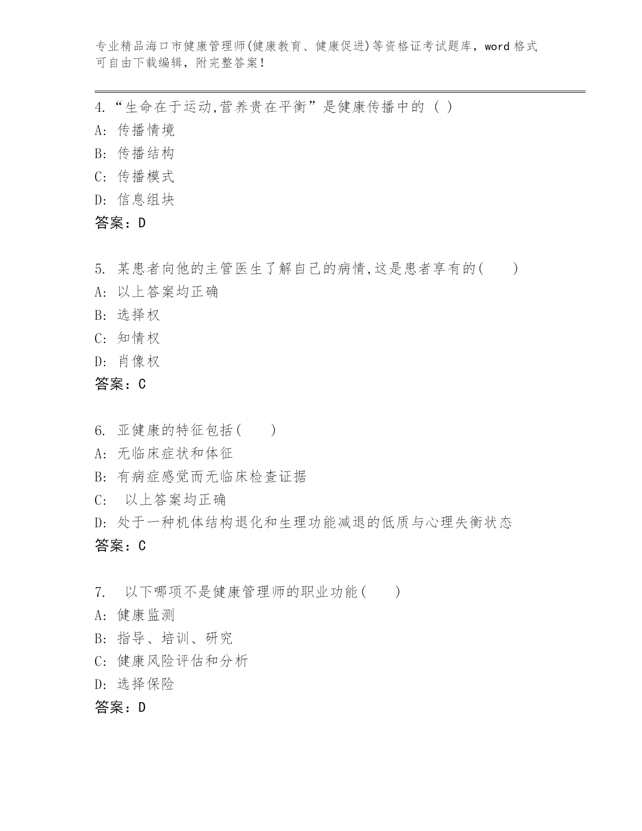 精心整理海口市健康管理师(健康教育、健康促进)等资格证考试内部题库(夺分金卷).docx