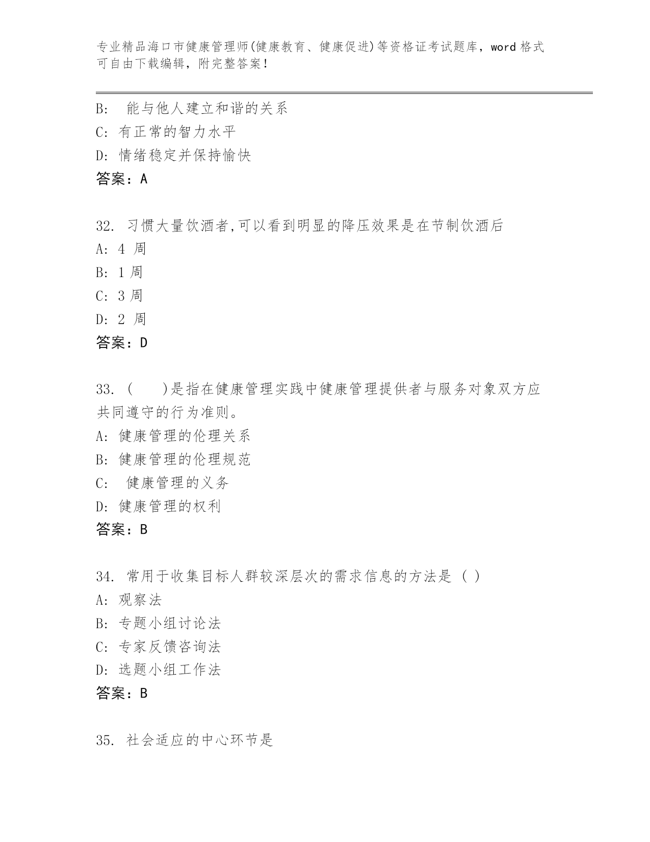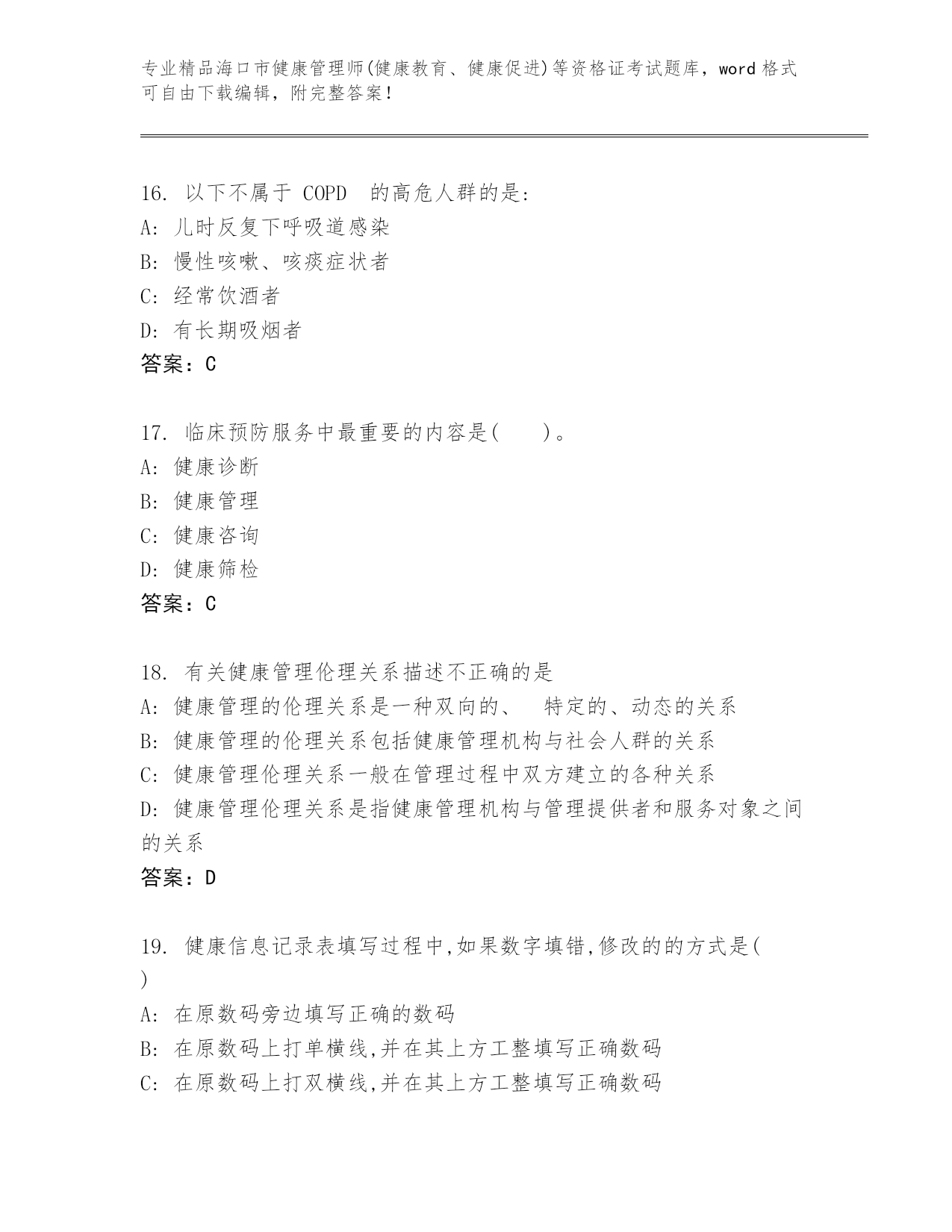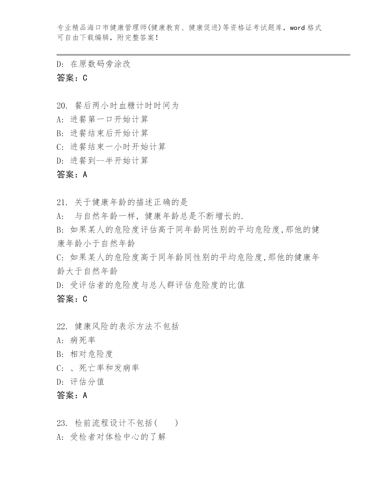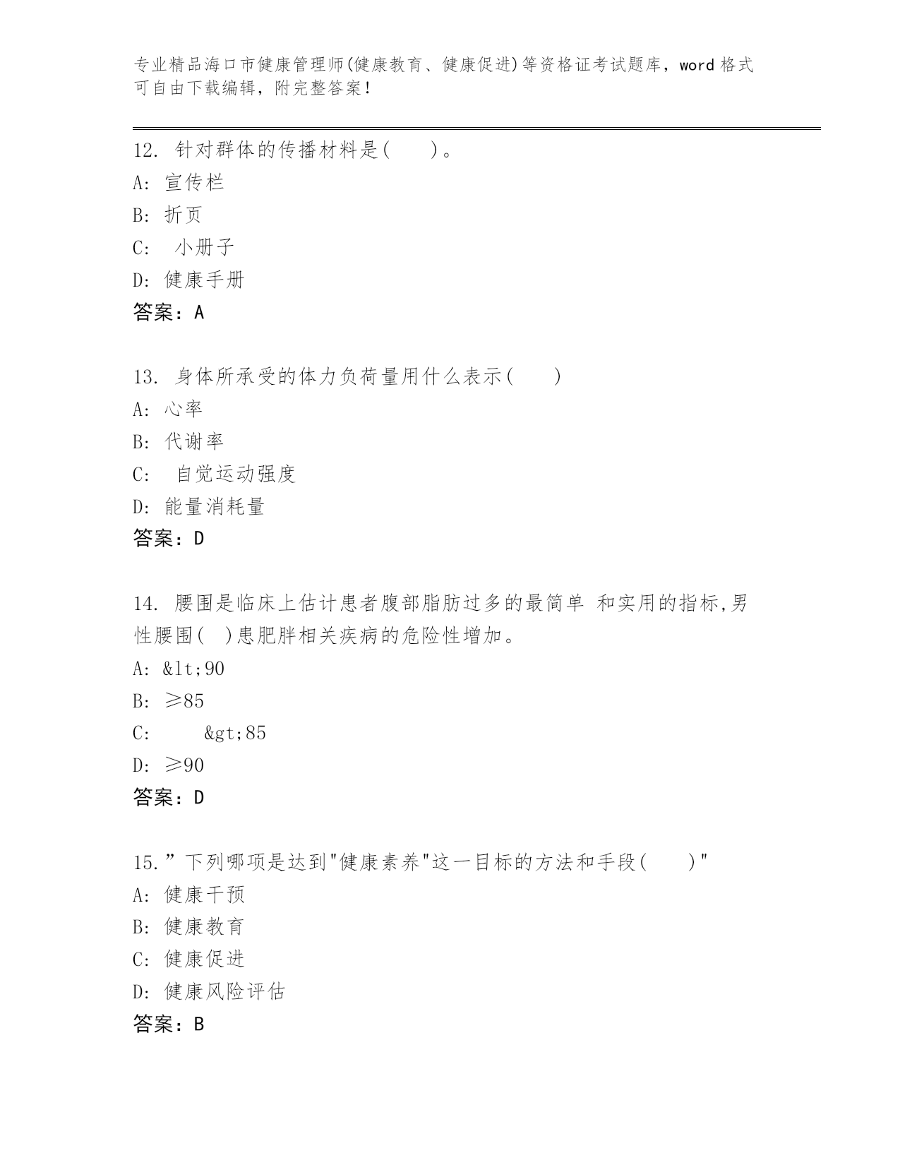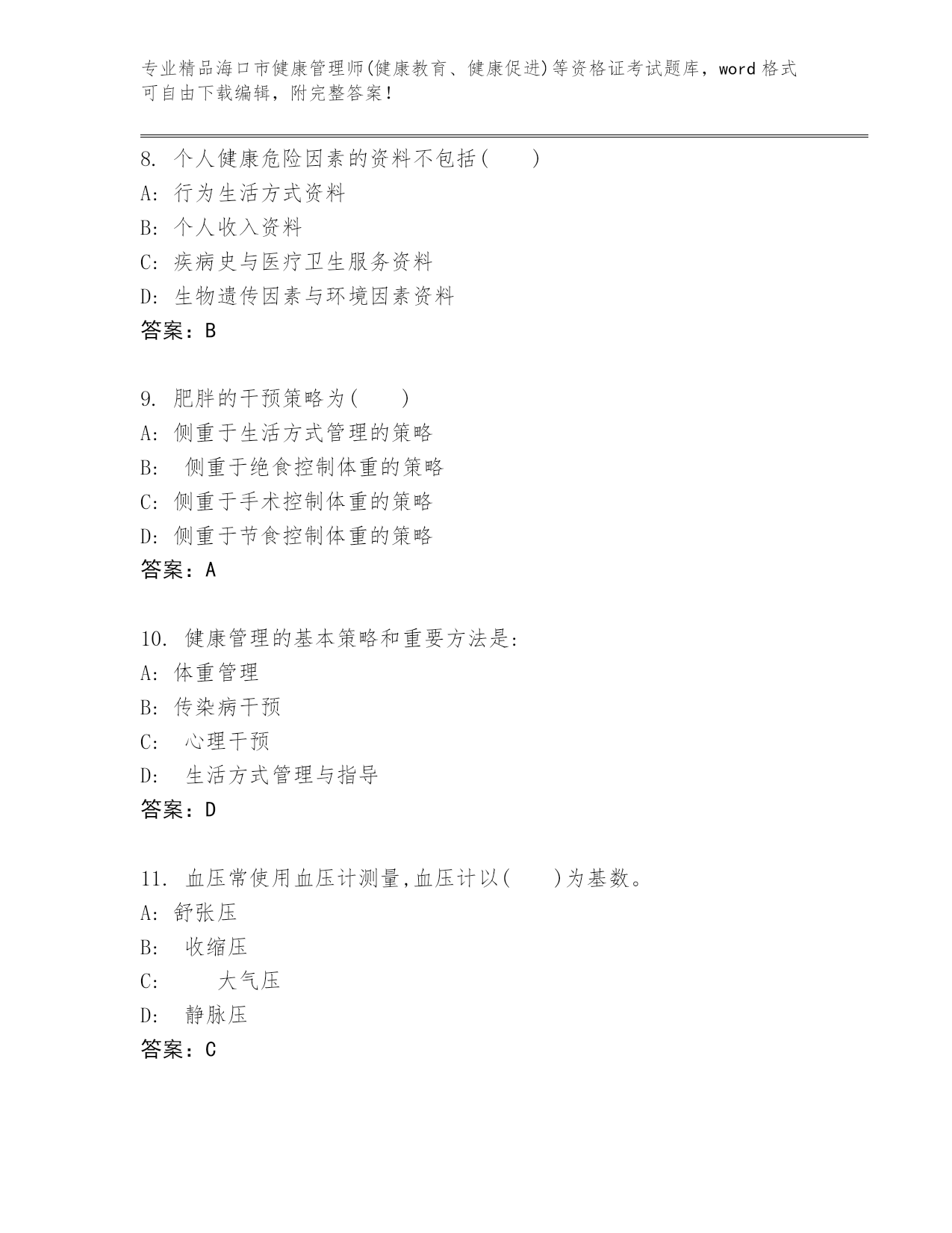 精心整理海口市健康管理师(健康教育、健康促进)等资格证考试内部题库(夺分金卷)